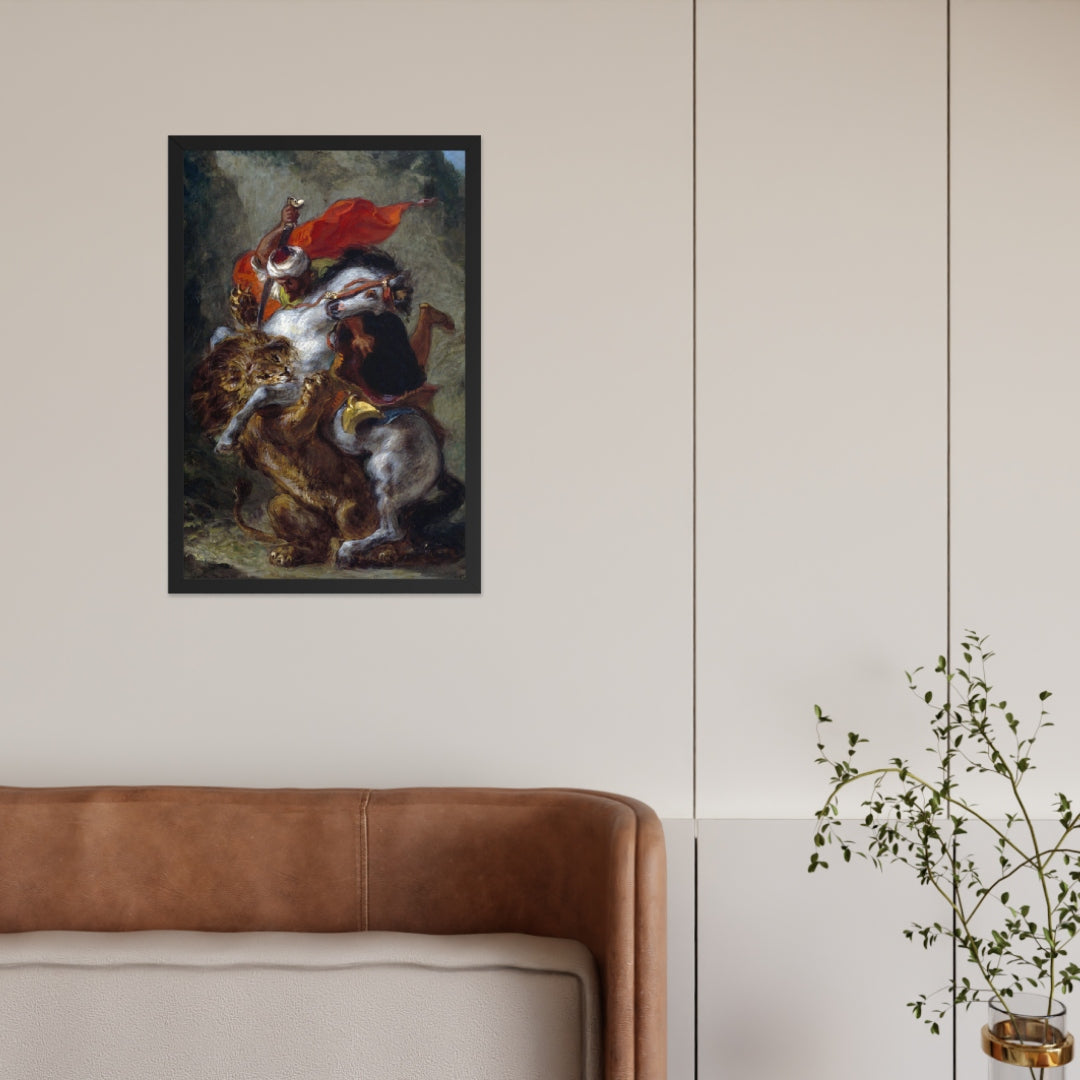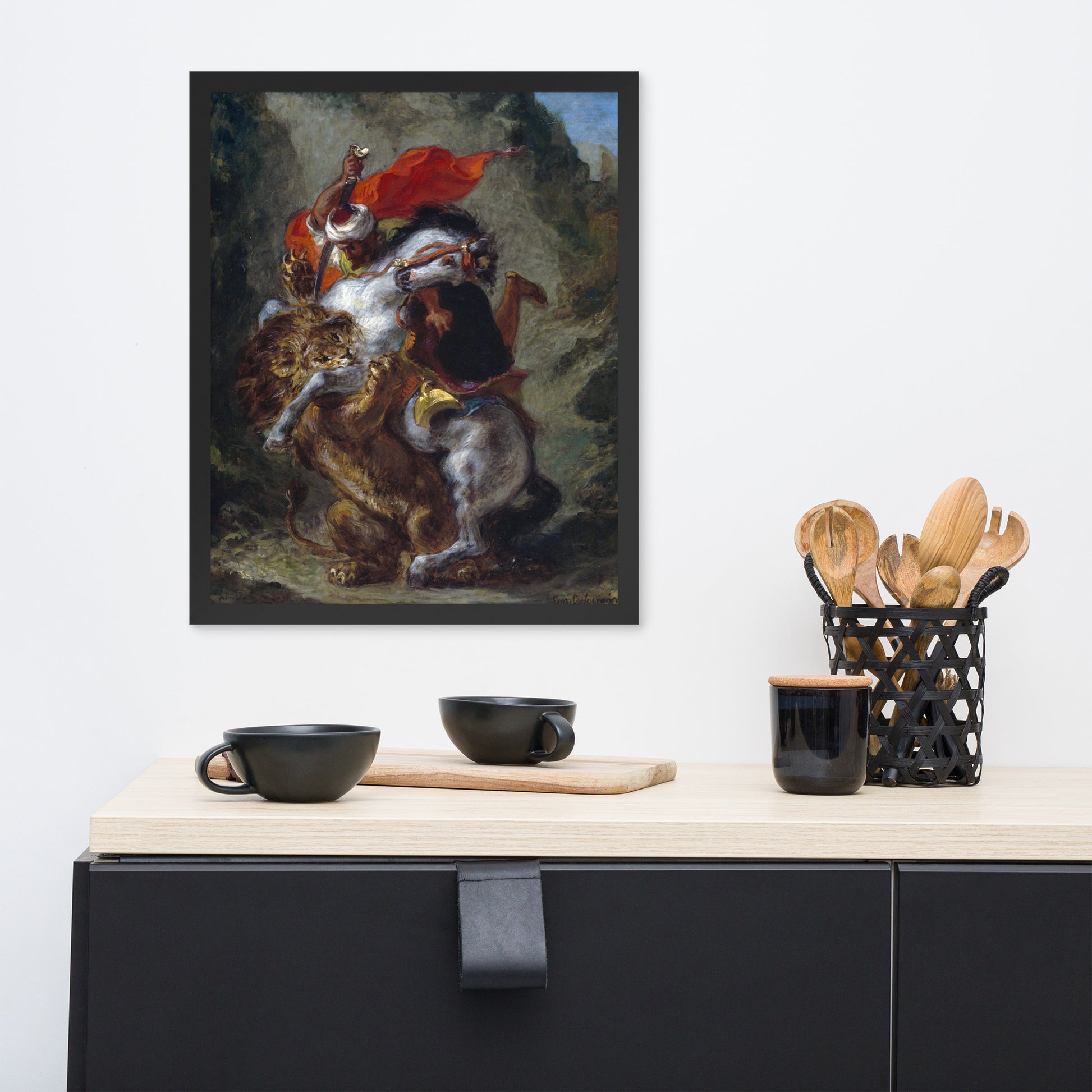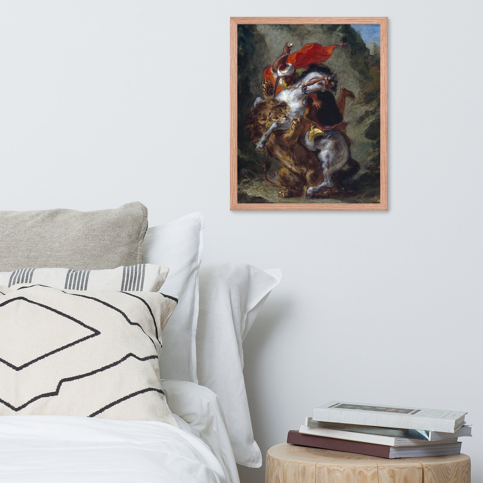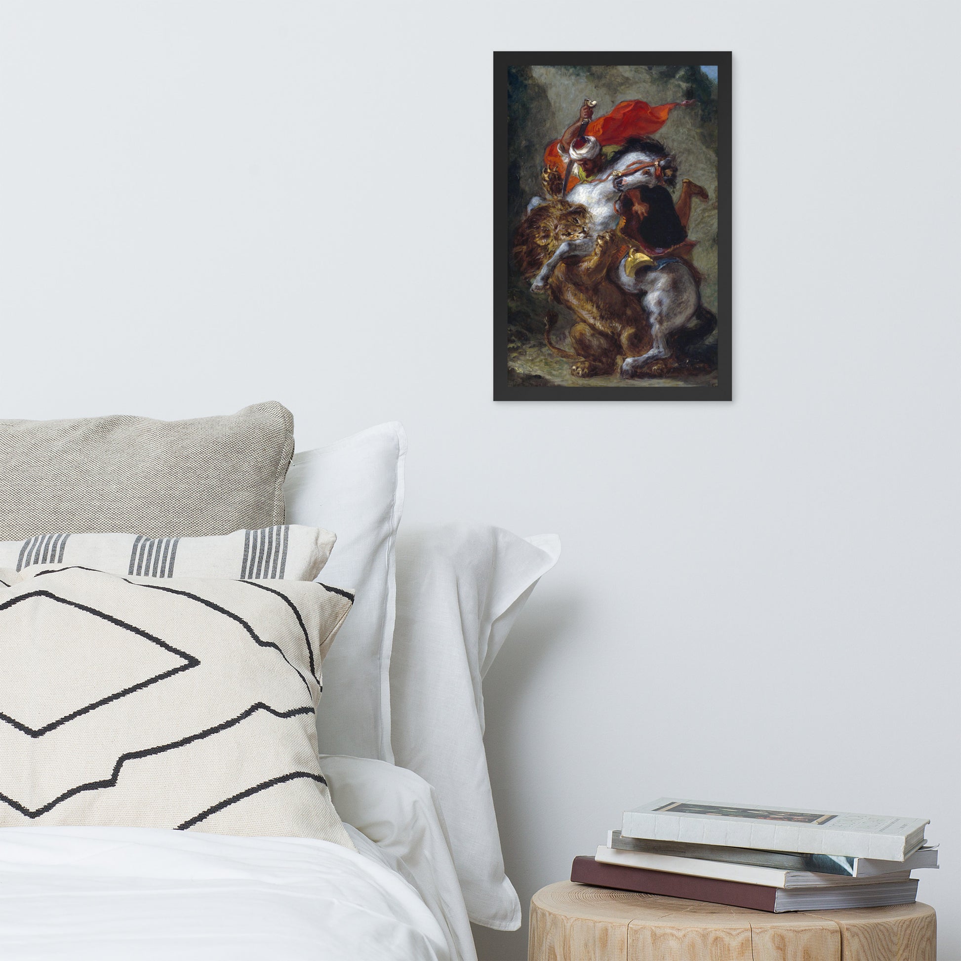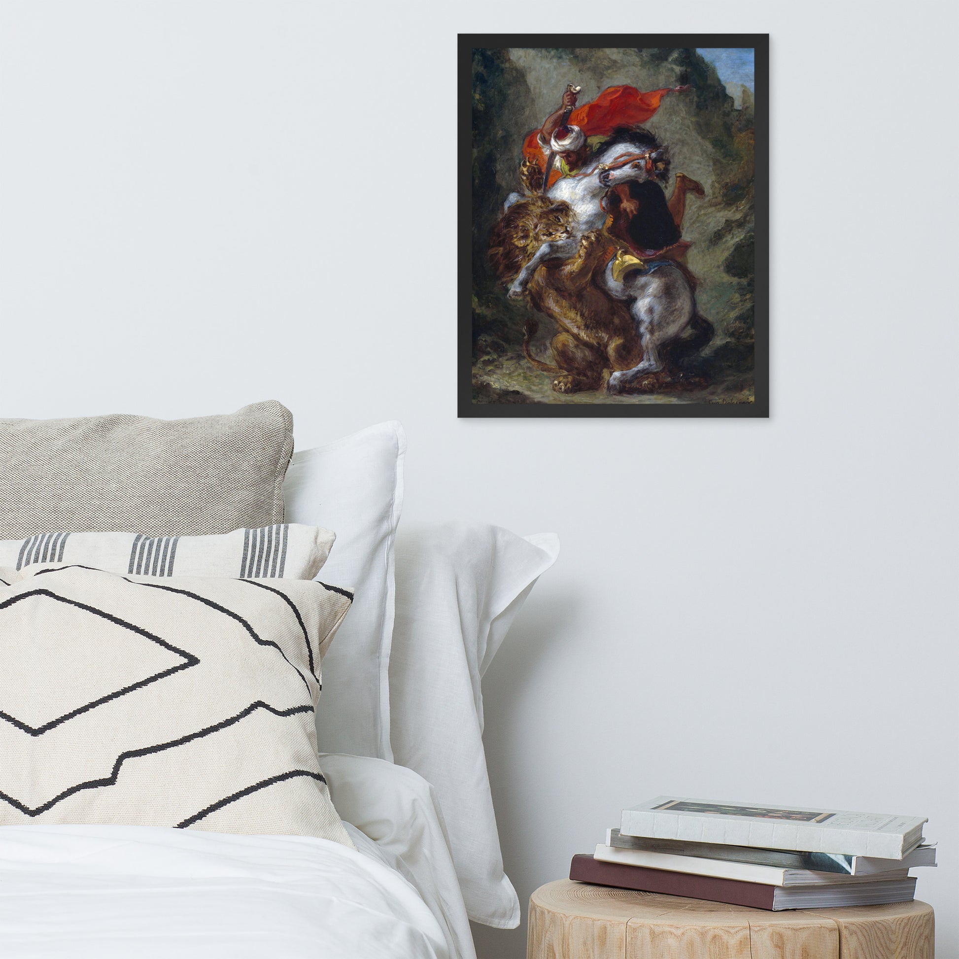 Unleash the drama and passion of Romanticism with Arab Horseman Attacked by a Lion by Eugène Delacroix—an electrifying masterpiece that captures raw emotion, heroic struggle, and the sublime power of nature. This framed wall print brings 19th-century intensity into modern interiors, featuring a vivid portrayal of a lion mid-attack, a rearing horse in distress, and a fearless rider defending with sword raised high. Delacroix’s dynamic brushwork and turbulent composition evoke themes of courage, chaos, and survival—ideal for collectors who crave storytelling in their space.