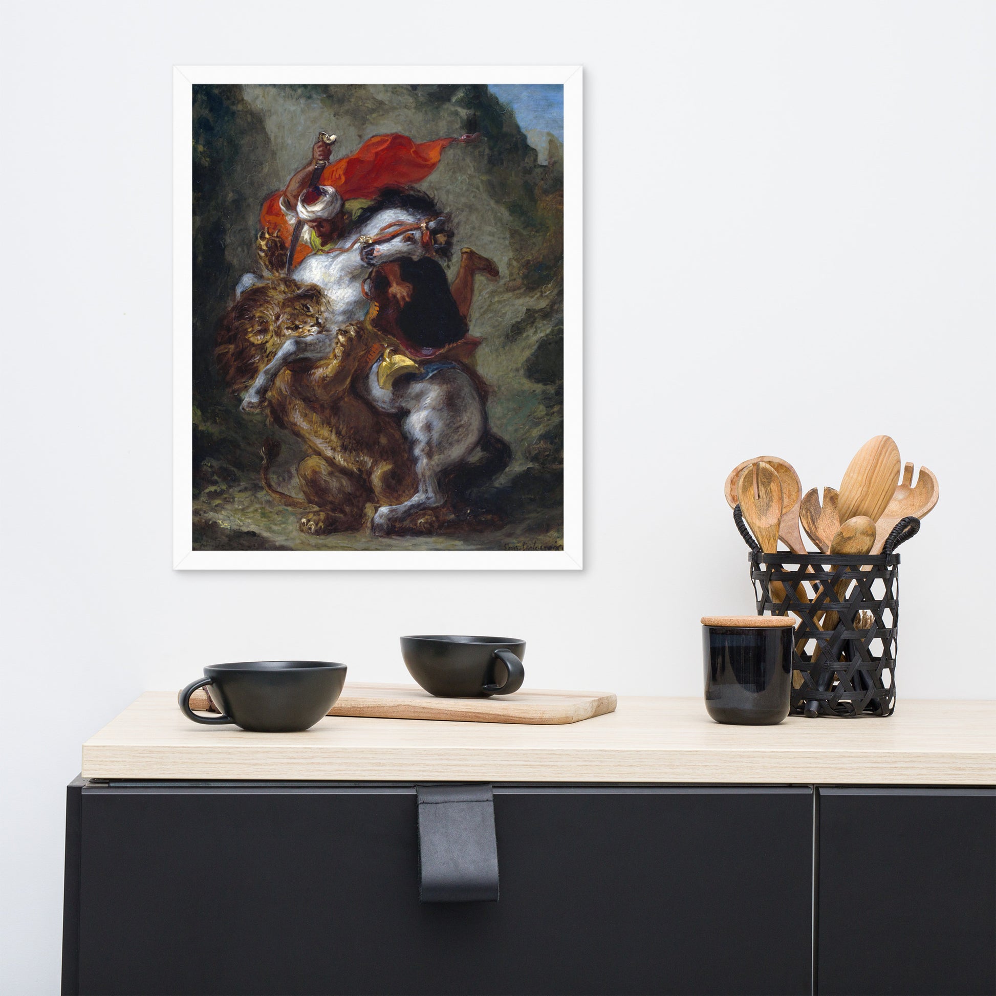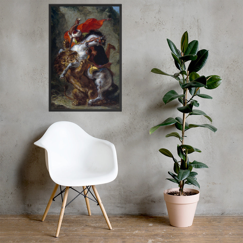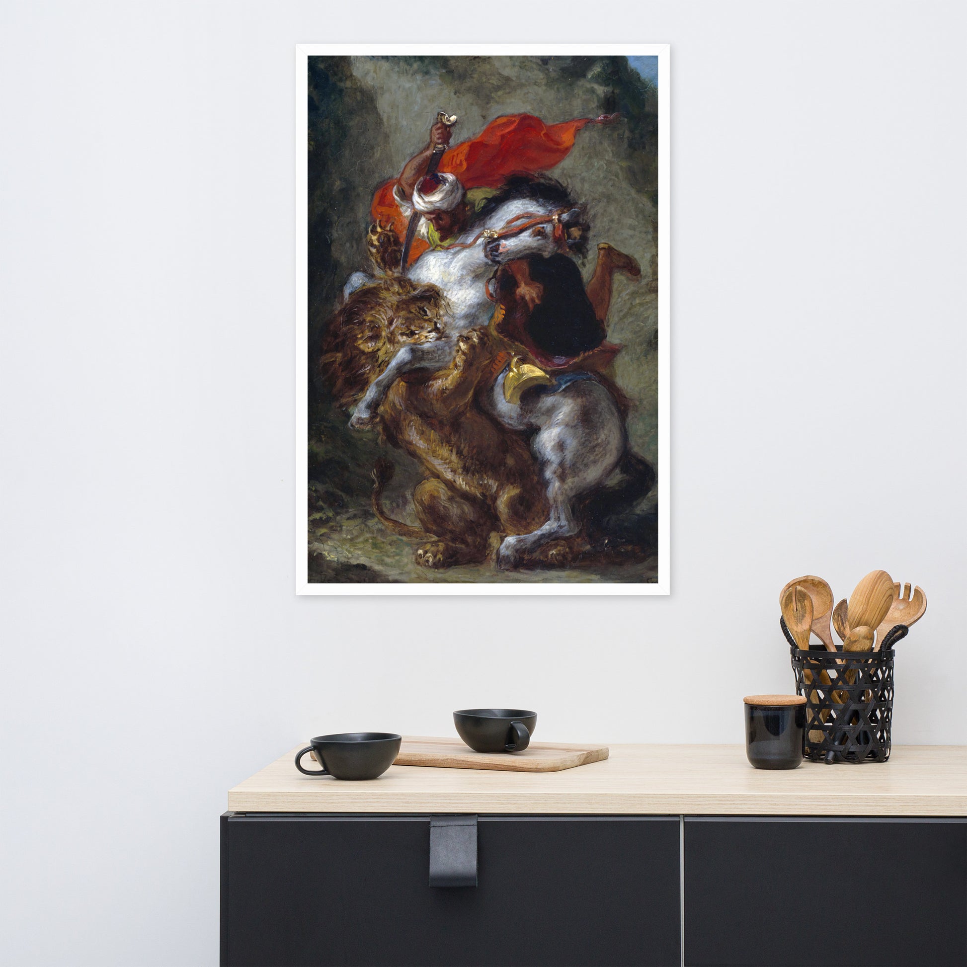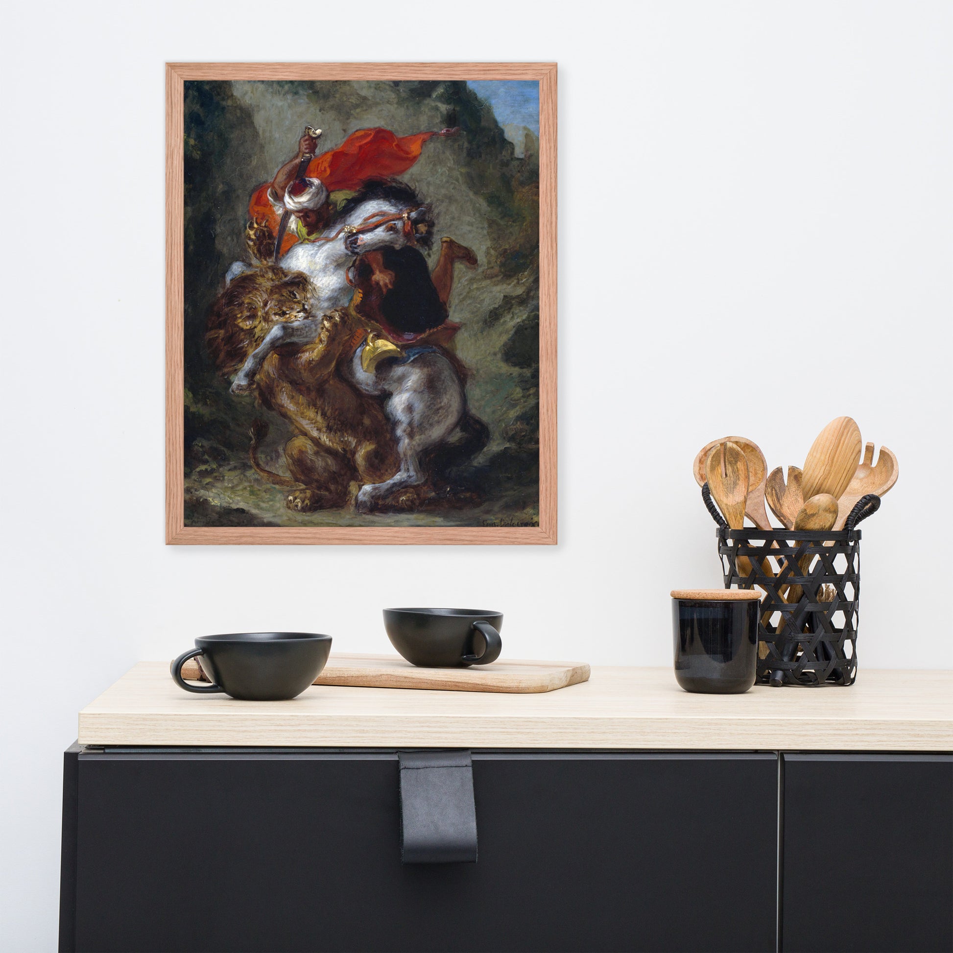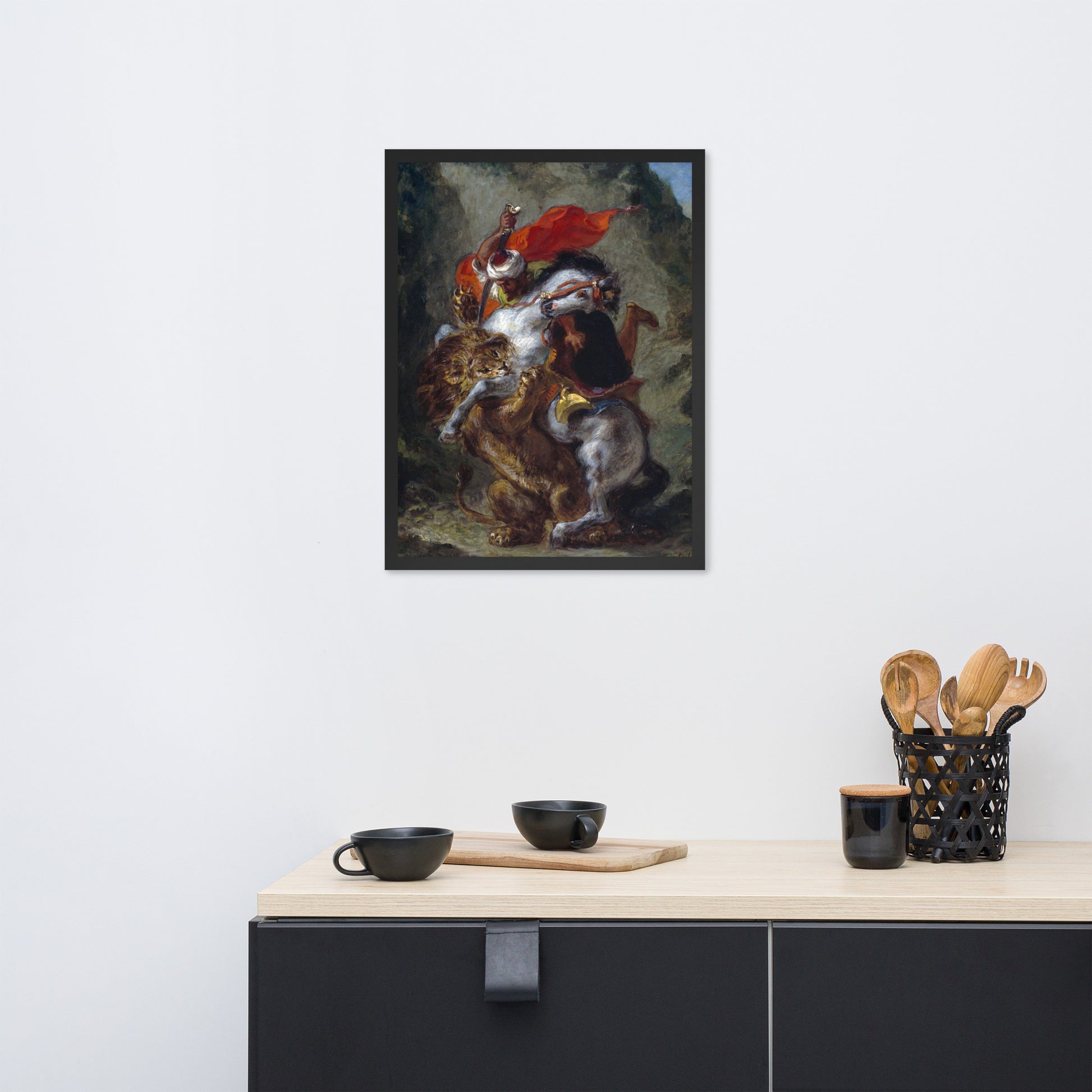 Unleash the drama and passion of Romanticism with Arab Horseman Attacked by a Lion by Eugène Delacroix—an electrifying masterpiece that captures raw emotion, heroic struggle, and the sublime power of nature. This framed wall print brings 19th-century intensity into modern interiors, featuring a vivid portrayal of a lion mid-attack, a rearing horse in distress, and a fearless rider defending with sword raised high. Delacroix’s dynamic brushwork and turbulent composition evoke themes of courage, chaos, and survival—ideal for collectors who crave storytelling in their space.