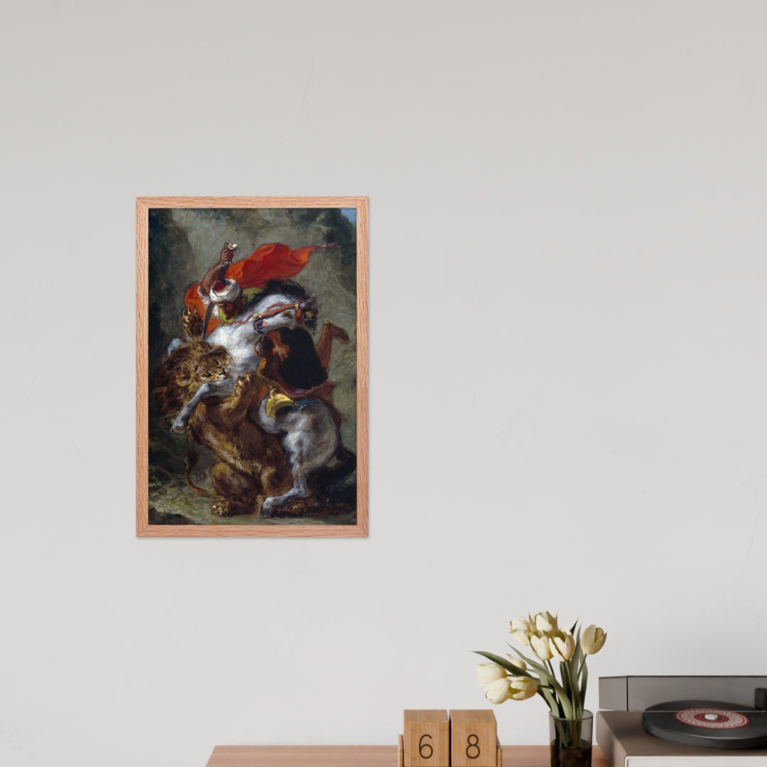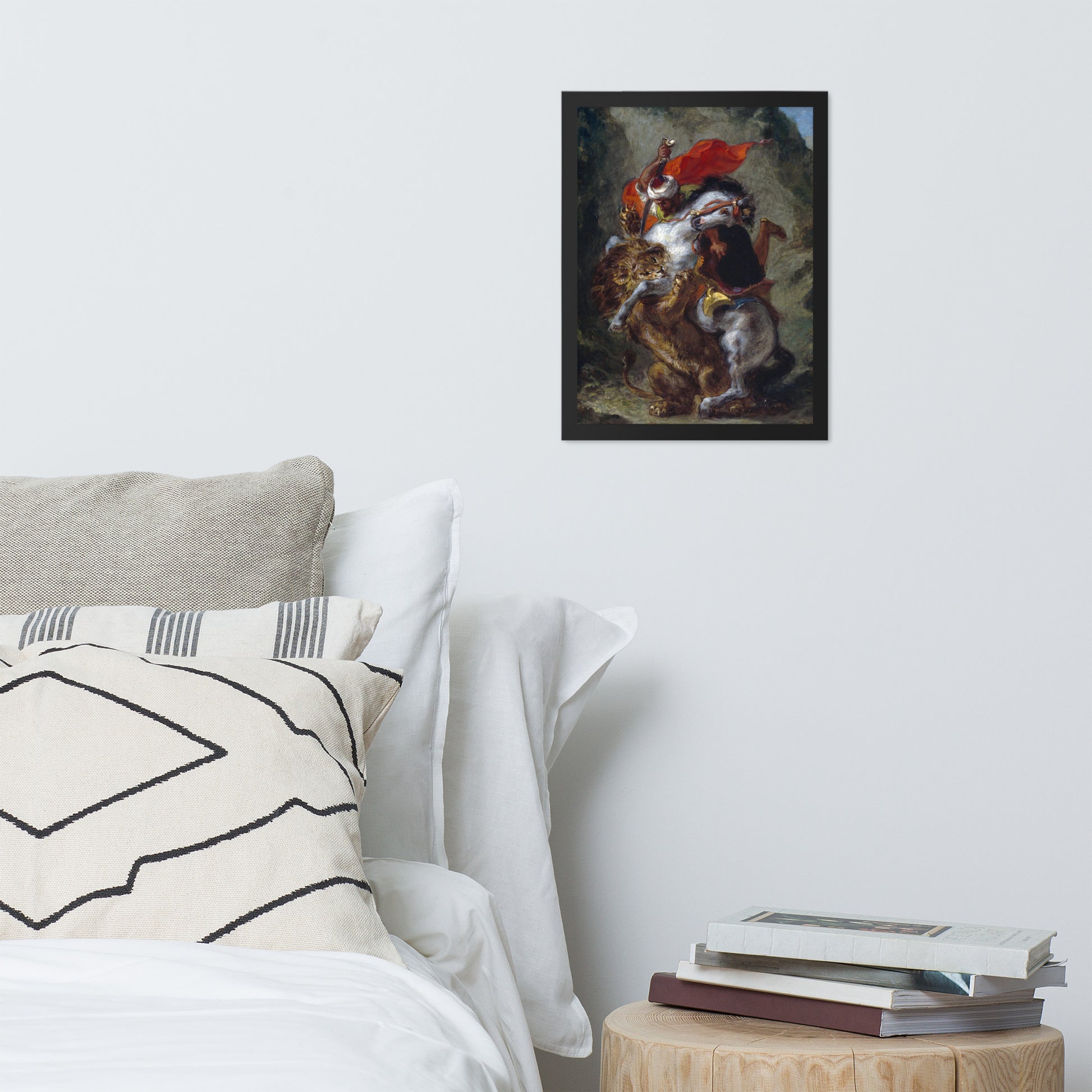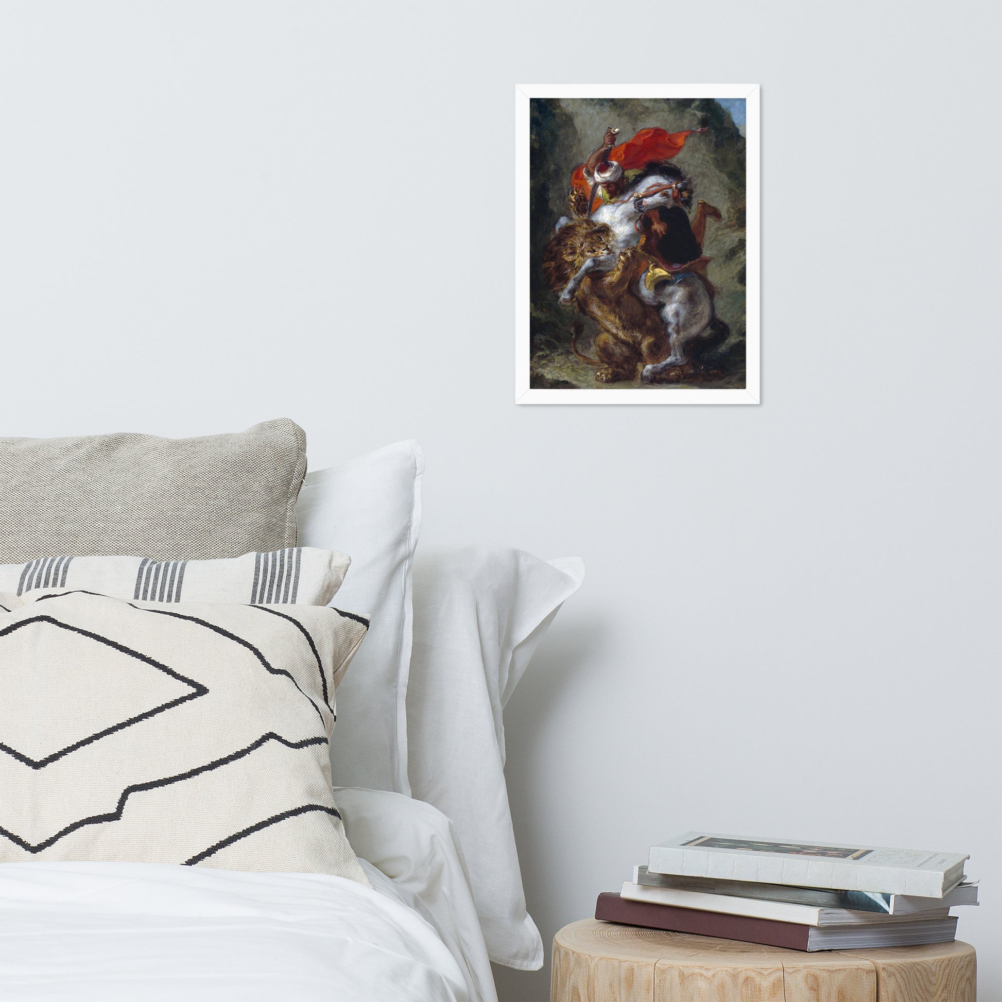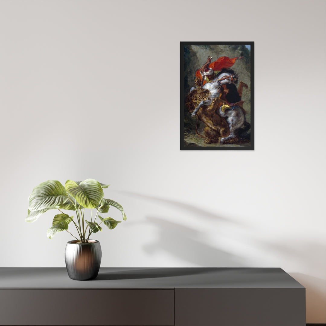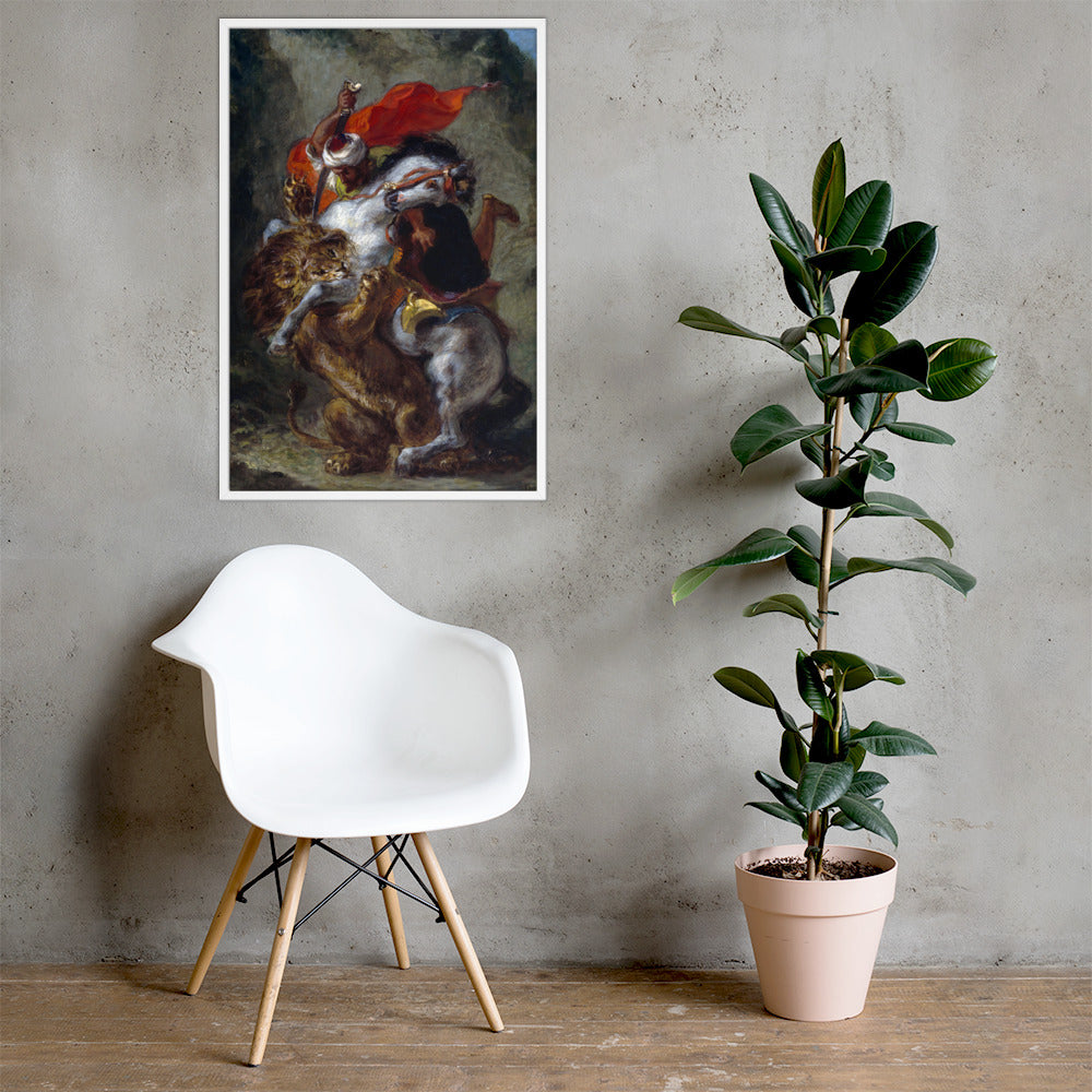 Unleash the drama and passion of Romanticism with Arab Horseman Attacked by a Lion by Eugène Delacroix—an electrifying masterpiece that captures raw emotion, heroic struggle, and the sublime power of nature. This framed wall print brings 19th-century intensity into modern interiors, featuring a vivid portrayal of a lion mid-attack, a rearing horse in distress, and a fearless rider defending with sword raised high. Delacroix’s dynamic brushwork and turbulent composition evoke themes of courage, chaos, and survival—ideal for collectors who crave storytelling in their space.