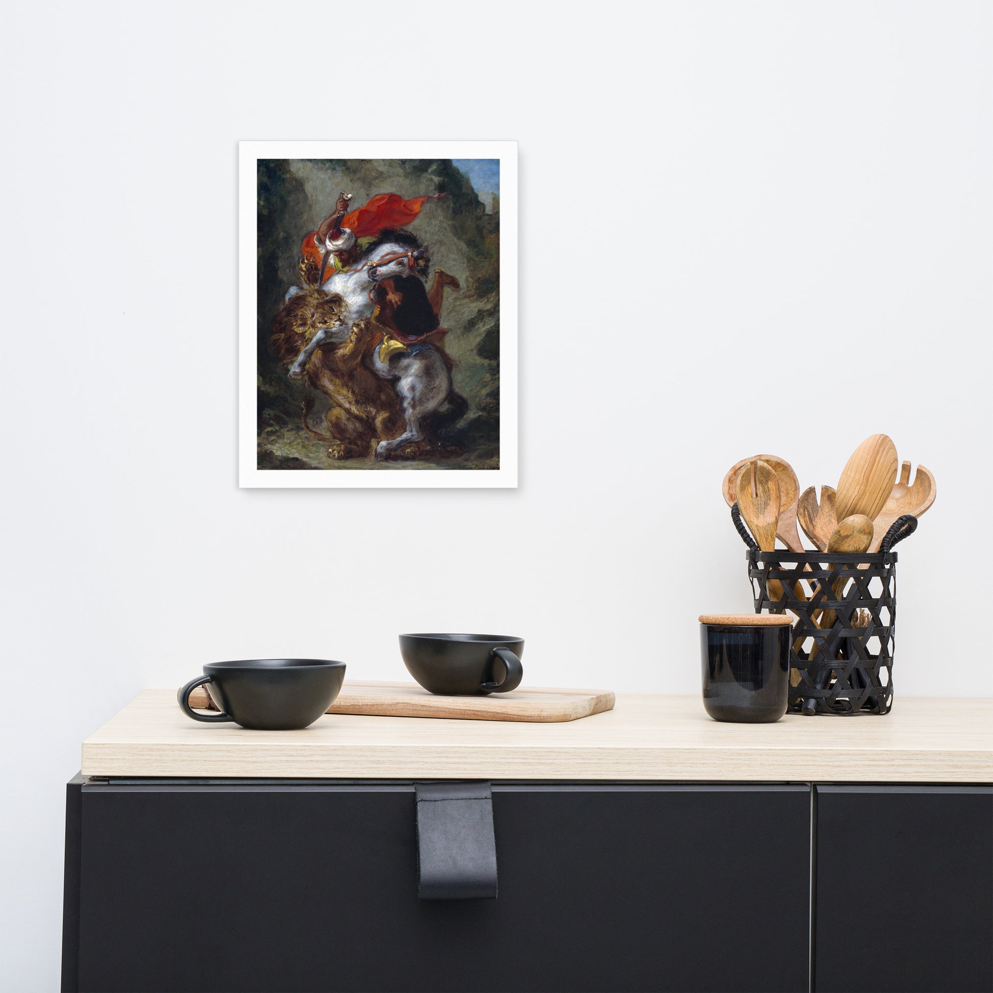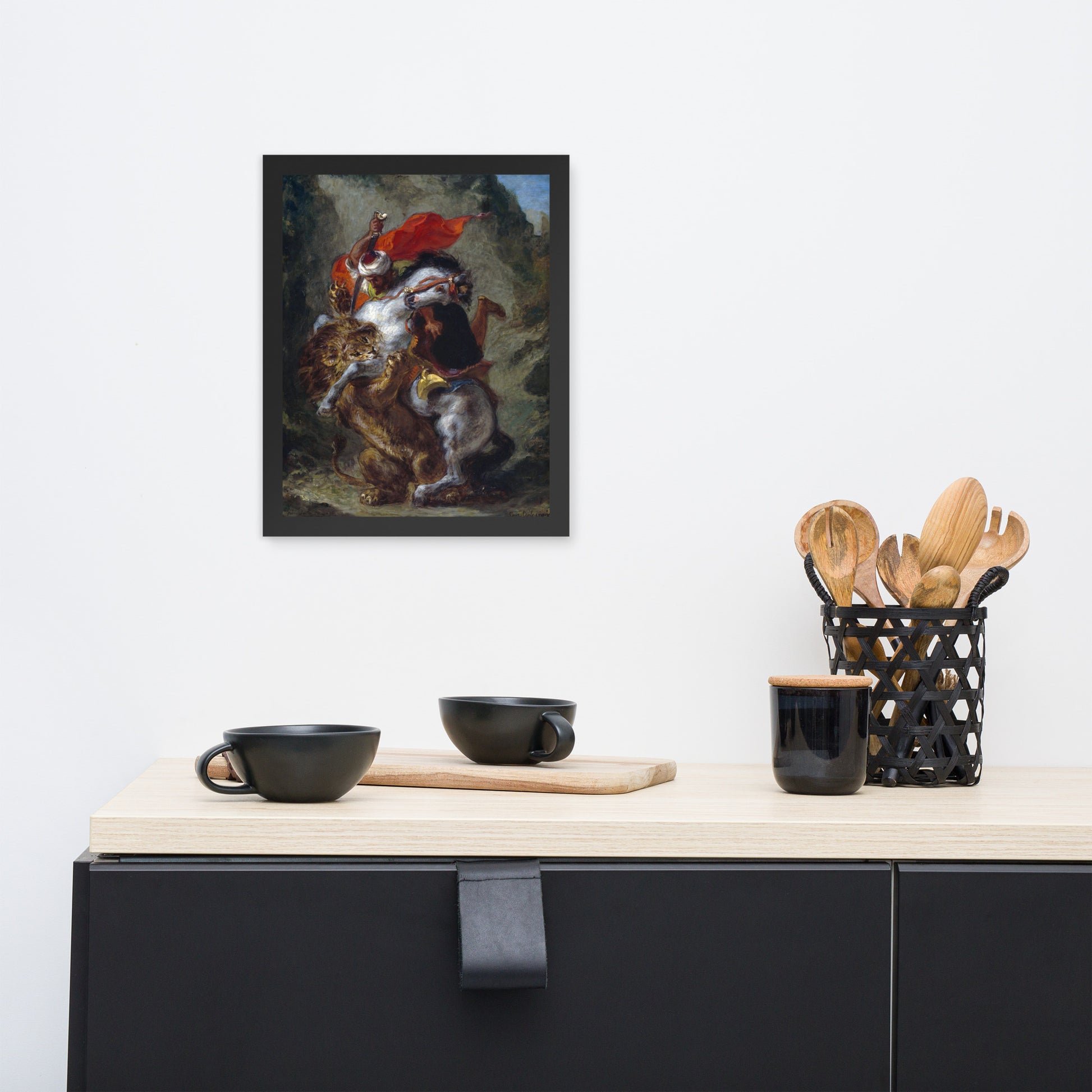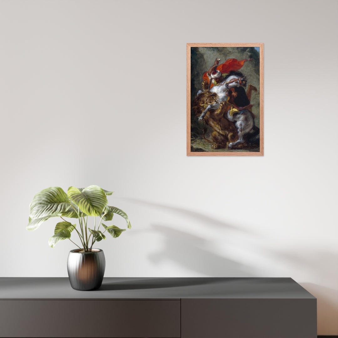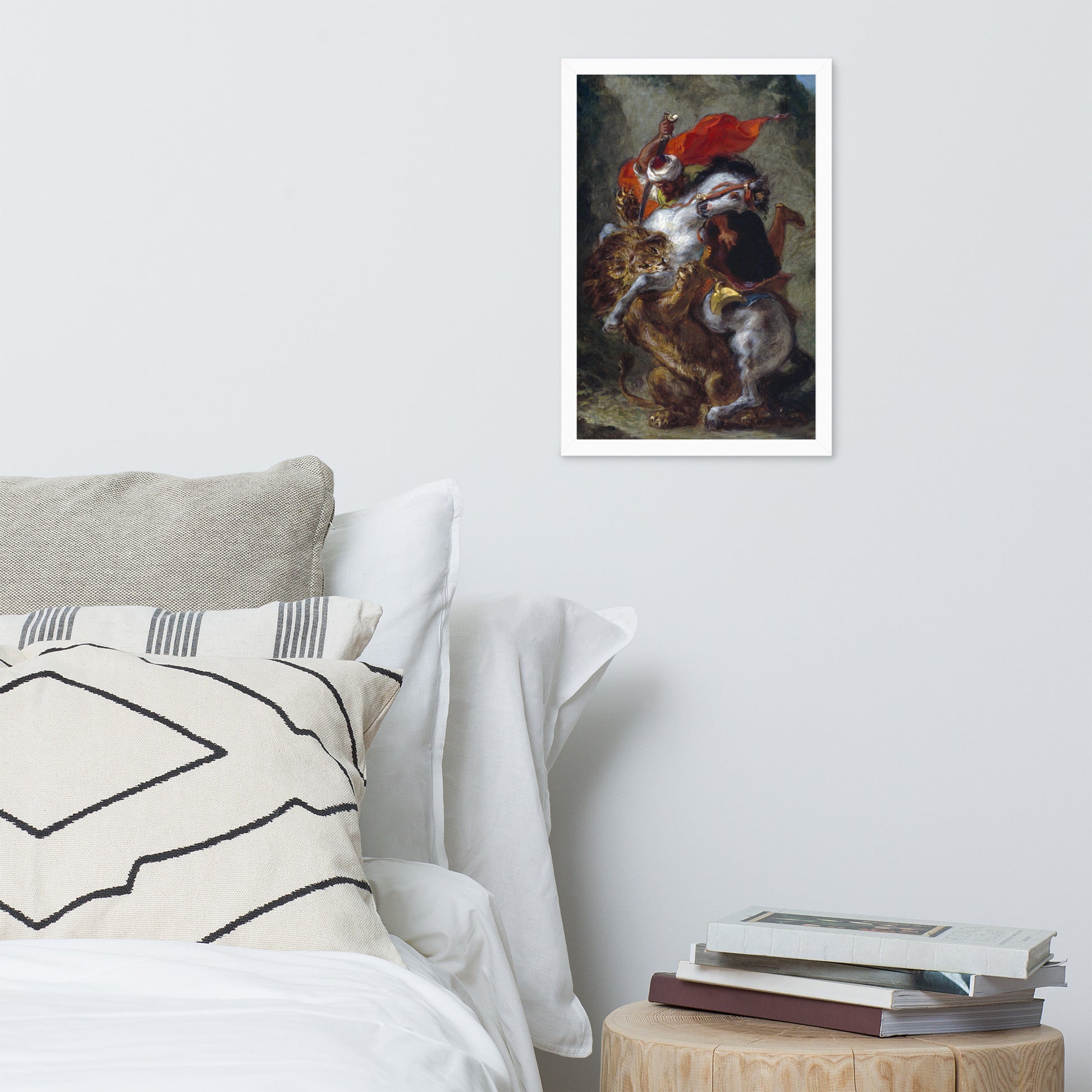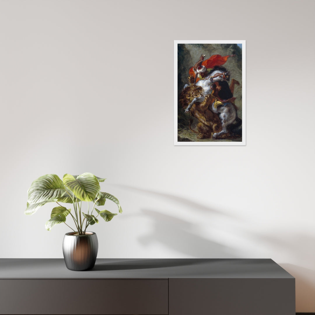 Unleash the drama and passion of Romanticism with Arab Horseman Attacked by a Lion by Eugène Delacroix—an electrifying masterpiece that captures raw emotion, heroic struggle, and the sublime power of nature. This framed wall print brings 19th-century intensity into modern interiors, featuring a vivid portrayal of a lion mid-attack, a rearing horse in distress, and a fearless rider defending with sword raised high. Delacroix’s dynamic brushwork and turbulent composition evoke themes of courage, chaos, and survival—ideal for collectors who crave storytelling in their space.