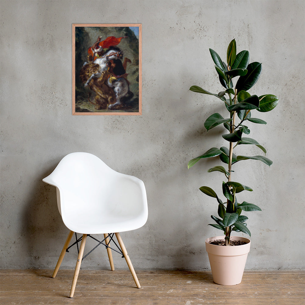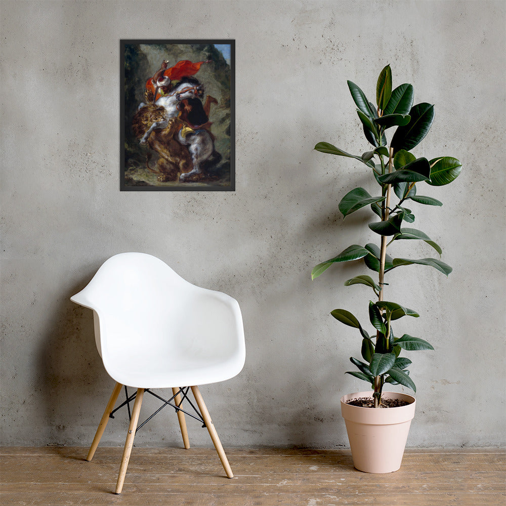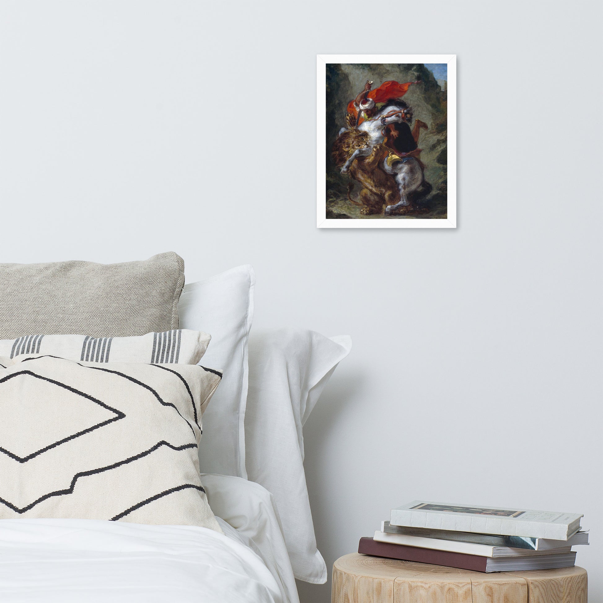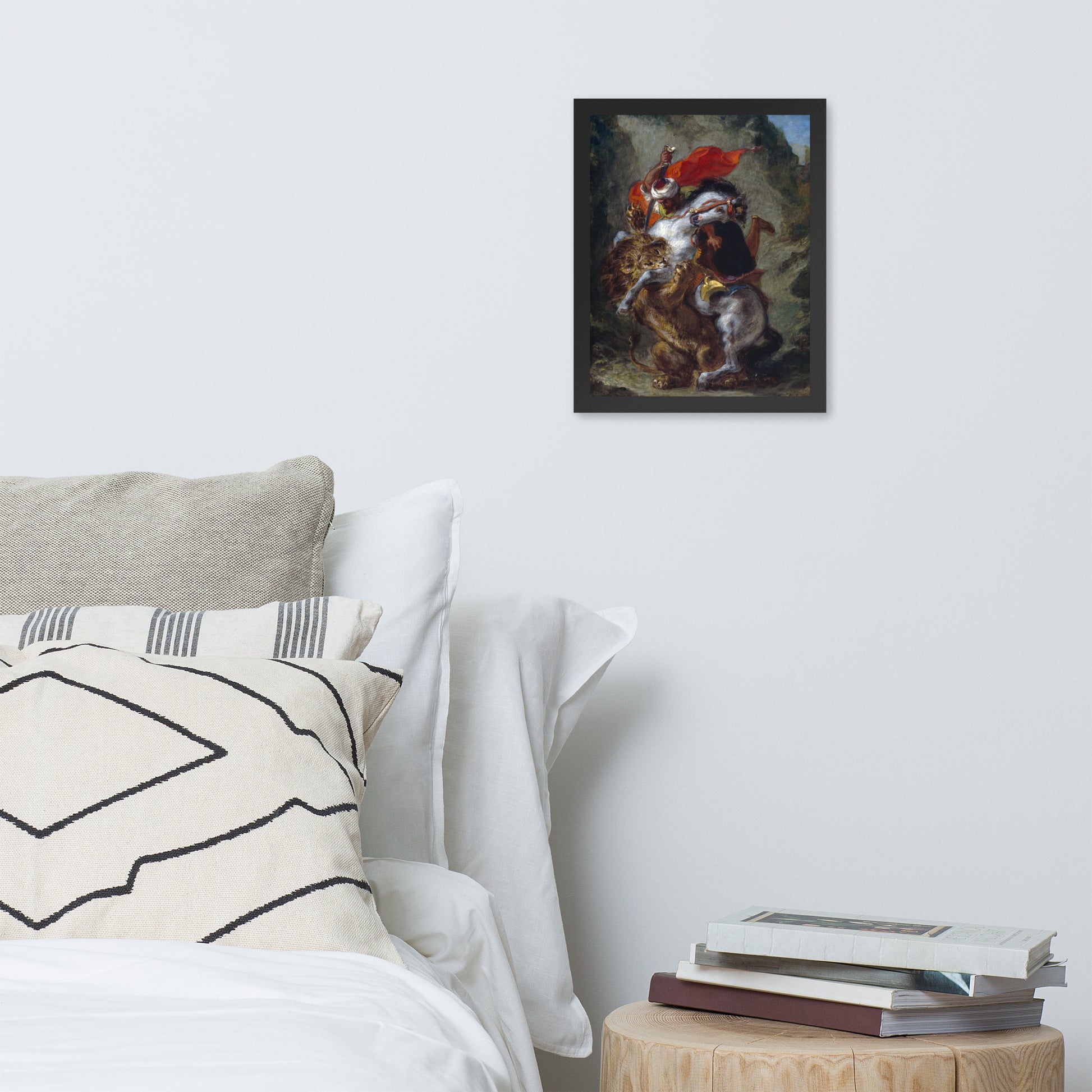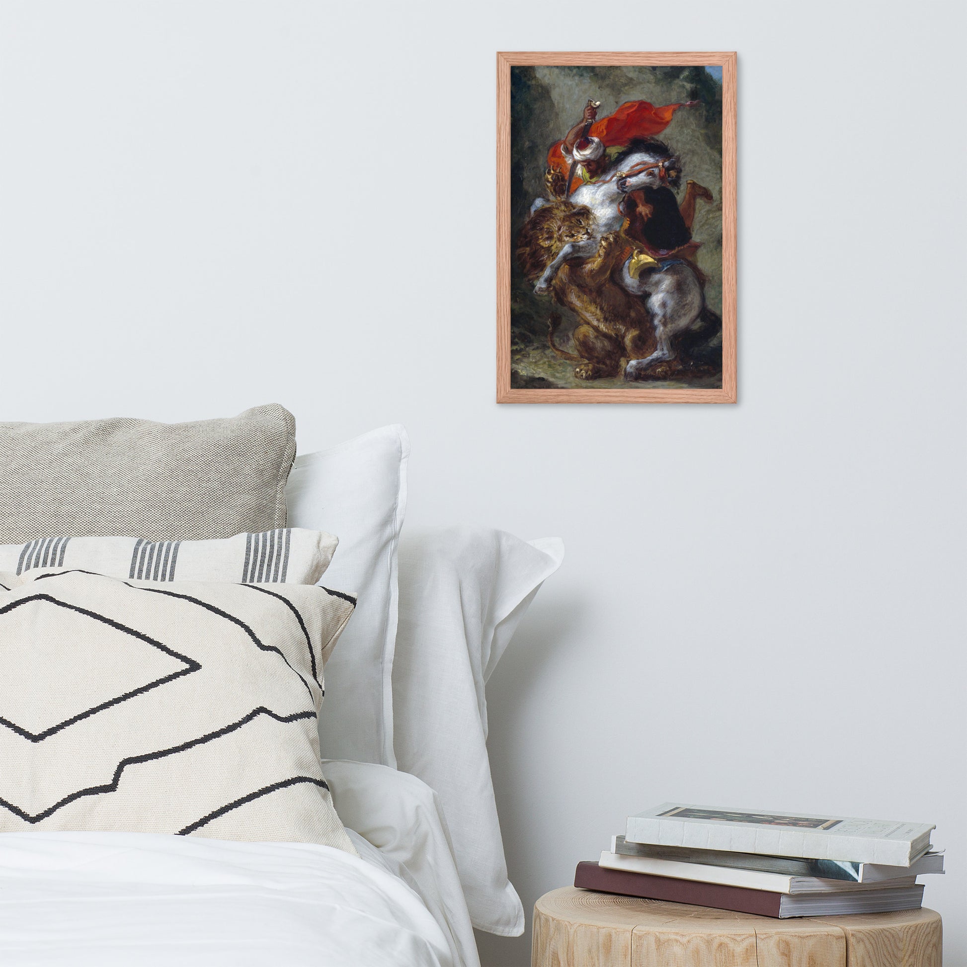 Unleash the drama and passion of Romanticism with Arab Horseman Attacked by a Lion by Eugène Delacroix—an electrifying masterpiece that captures raw emotion, heroic struggle, and the sublime power of nature. This framed wall print brings 19th-century intensity into modern interiors, featuring a vivid portrayal of a lion mid-attack, a rearing horse in distress, and a fearless rider defending with sword raised high. Delacroix’s dynamic brushwork and turbulent composition evoke themes of courage, chaos, and survival—ideal for collectors who crave storytelling in their space.