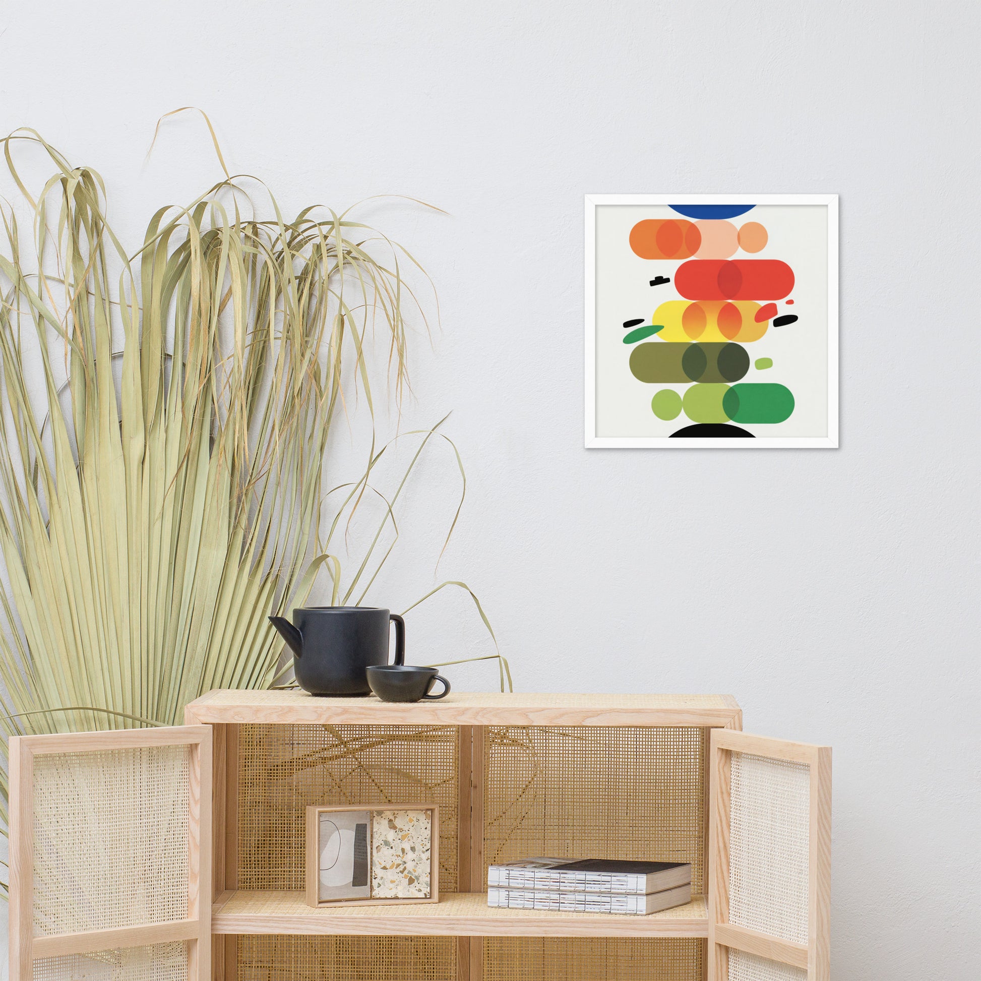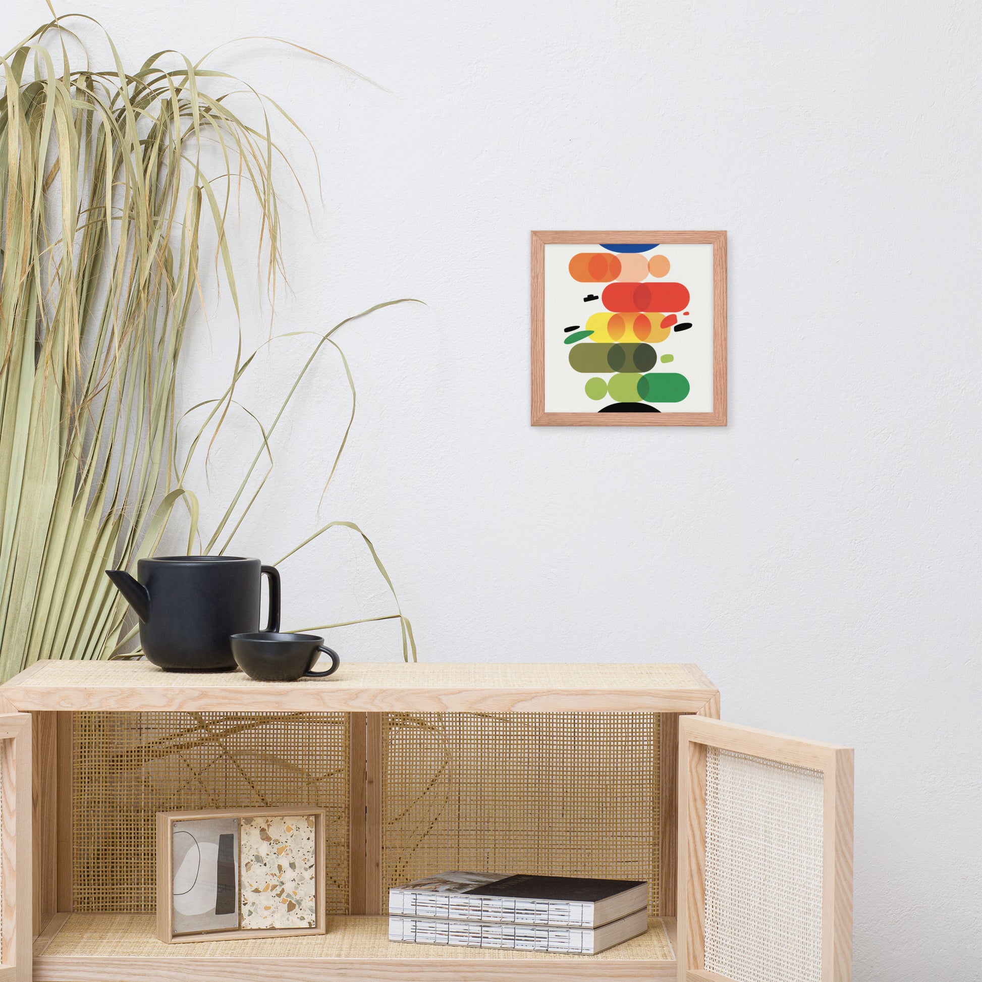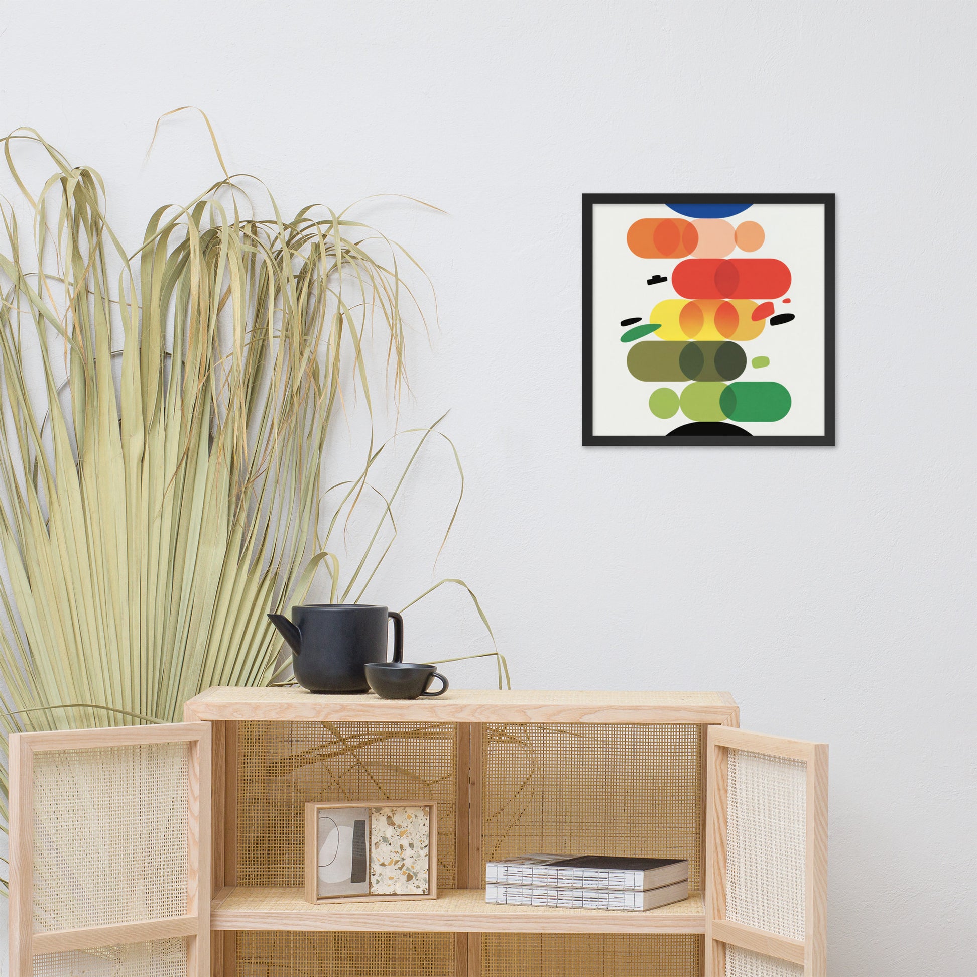 Elevate your space with Chromatic Harmony, a modern abstract art print featuring a mesmerizing cascade of geometric shapes in a rich vertical gradient. Rounded rectangles and circles overlap in warm tones of orange, red, and yellow, transitioning into earthy olive greens and deep blacks—creating a dynamic interplay of color, depth, and symmetry. This minimalist wall art is perfect for contemporary interiors, offering a bold yet balanced aesthetic that complements living rooms, studios, or office spaces. Printed on premium paper and framed for gallery-style presentation, it's a striking choice for lovers of modern design and color theory.