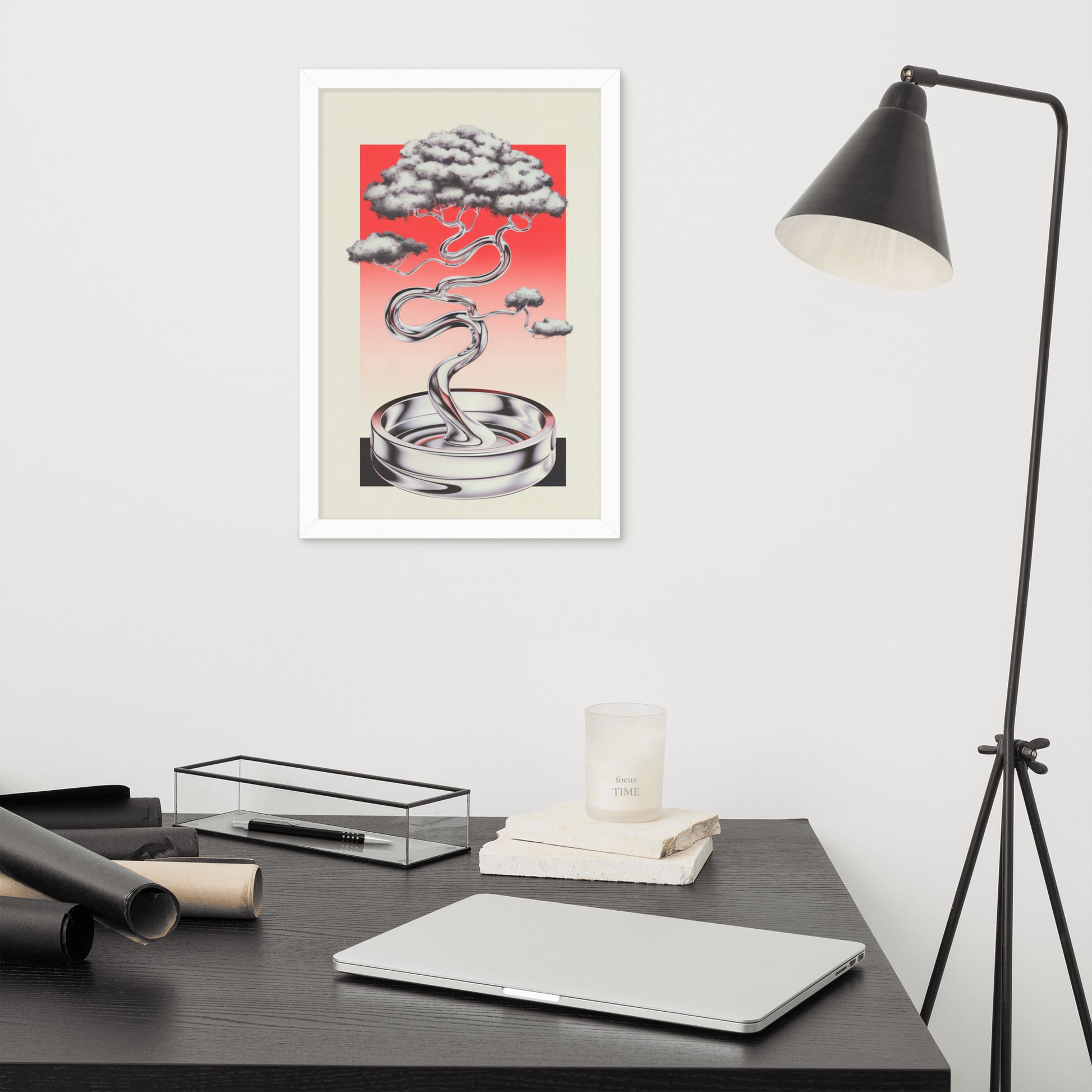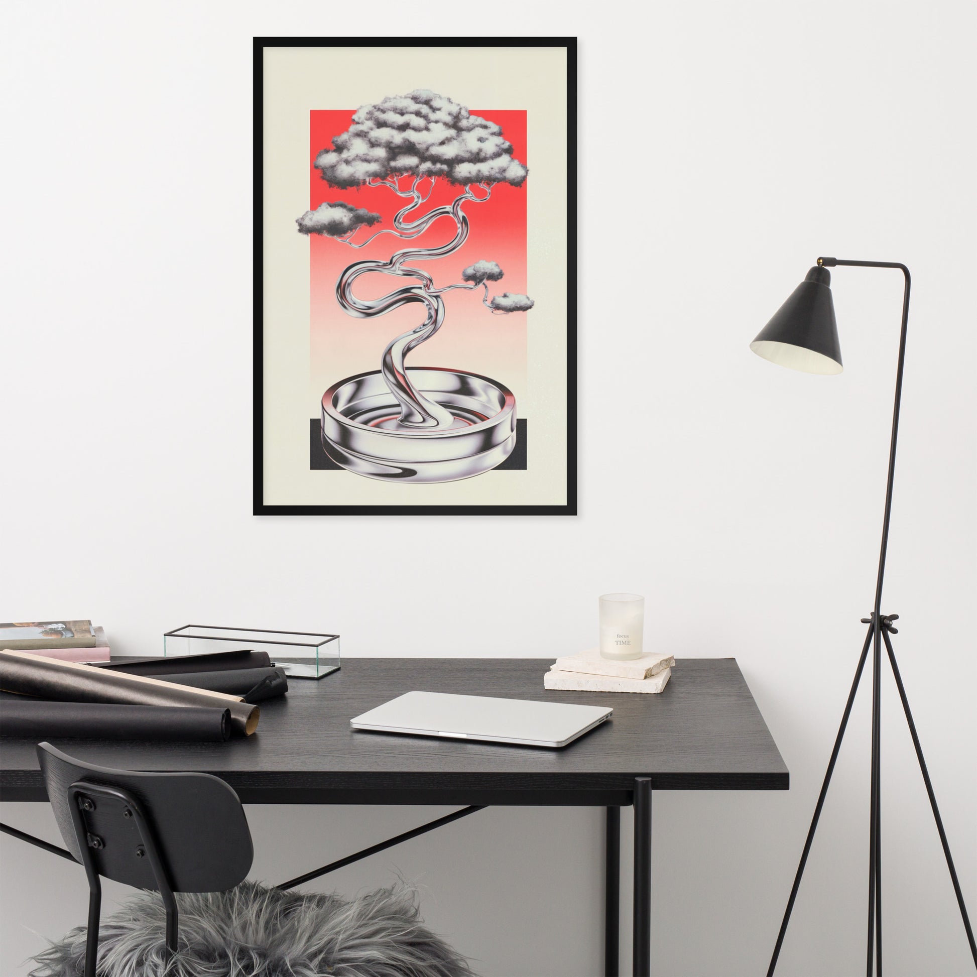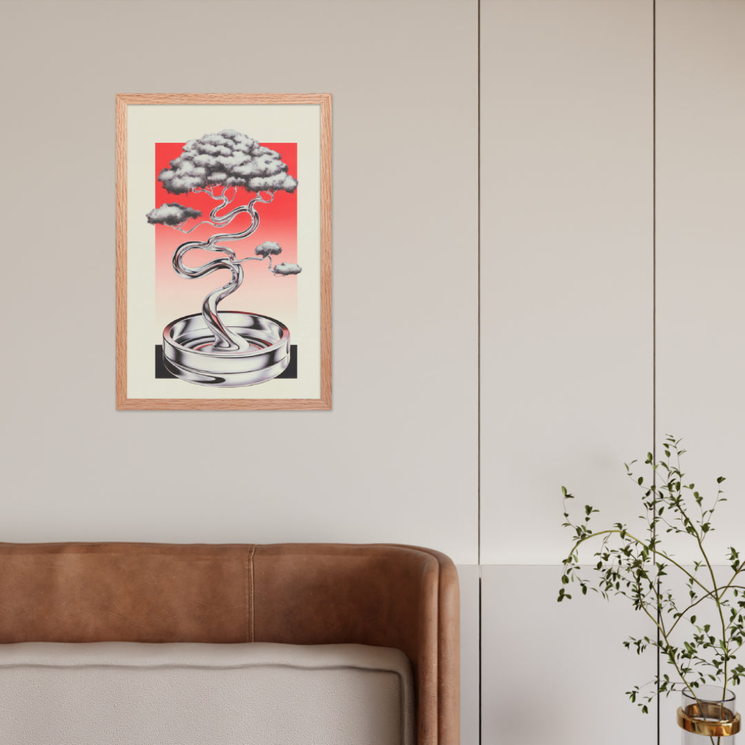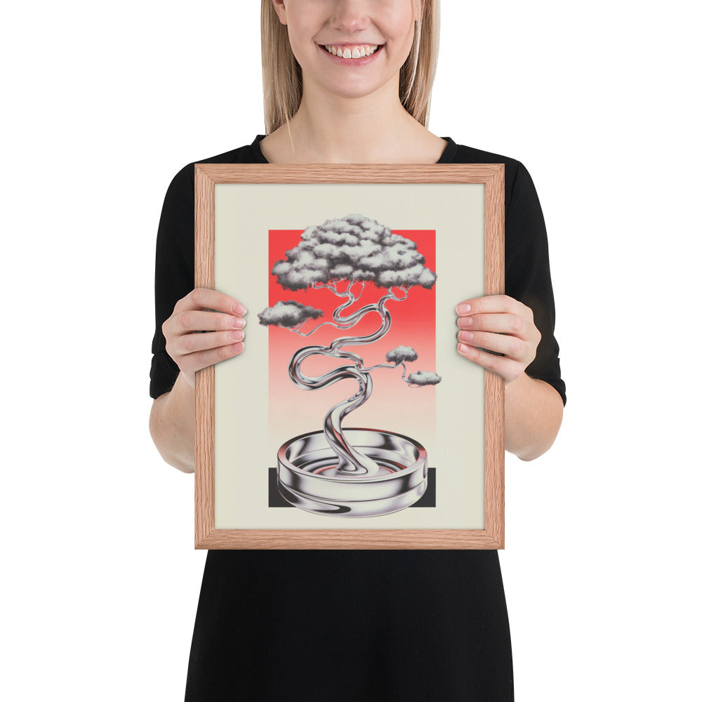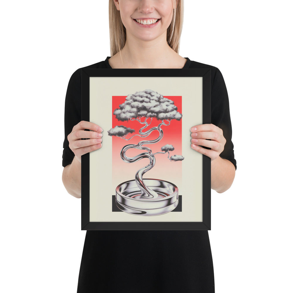 Chrome Bonsai is a surreal fusion of nature and machine—an abstract tree with fluid, metallic branches sprouting cloud-like foliage from a reflective chrome basin. Set against a dramatic gradient backdrop that shifts from deep crimson to pale cream, this artwork evokes themes of transformation, artificial growth, and organic elegance reimagined. The twisting trunk and vaporous canopy create a dreamlike silhouette that’s both futuristic and meditative. Printed on premium paper and framed for gallery-style impact, this piece is perfect for modern interiors, design-forward spaces, or collectors drawn to imaginative, boundary-blurring art.