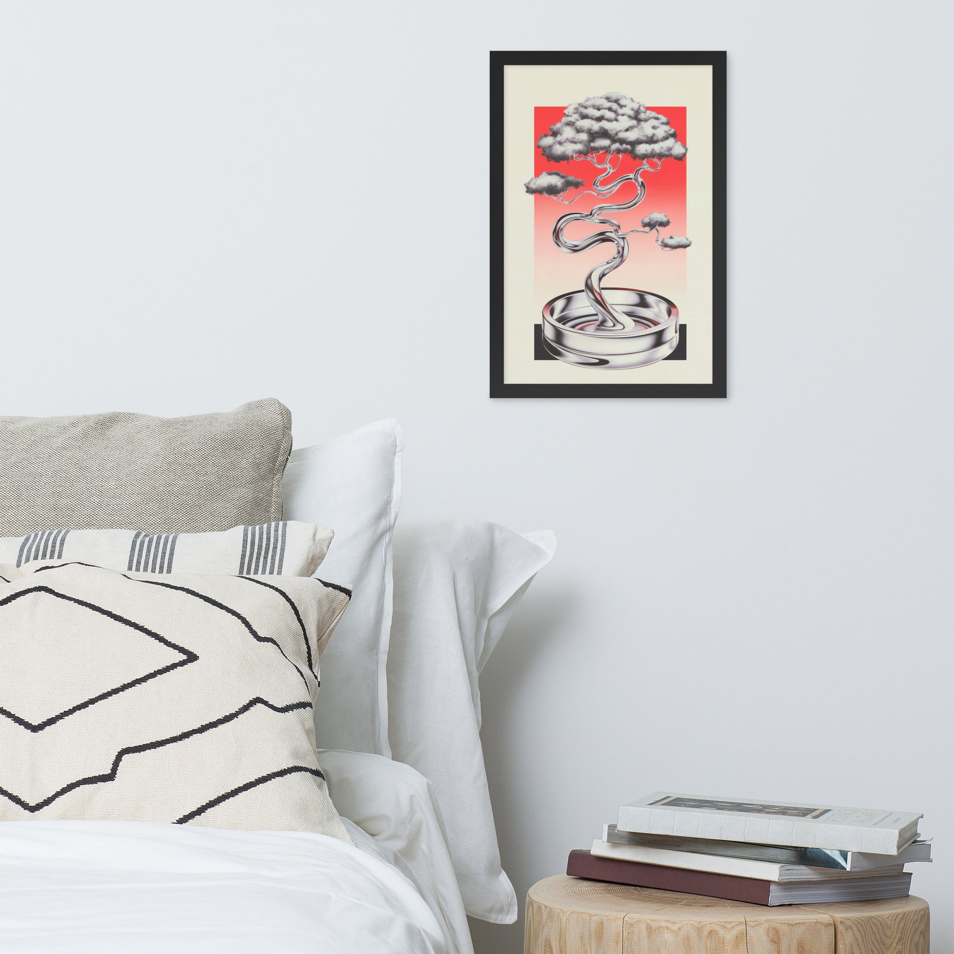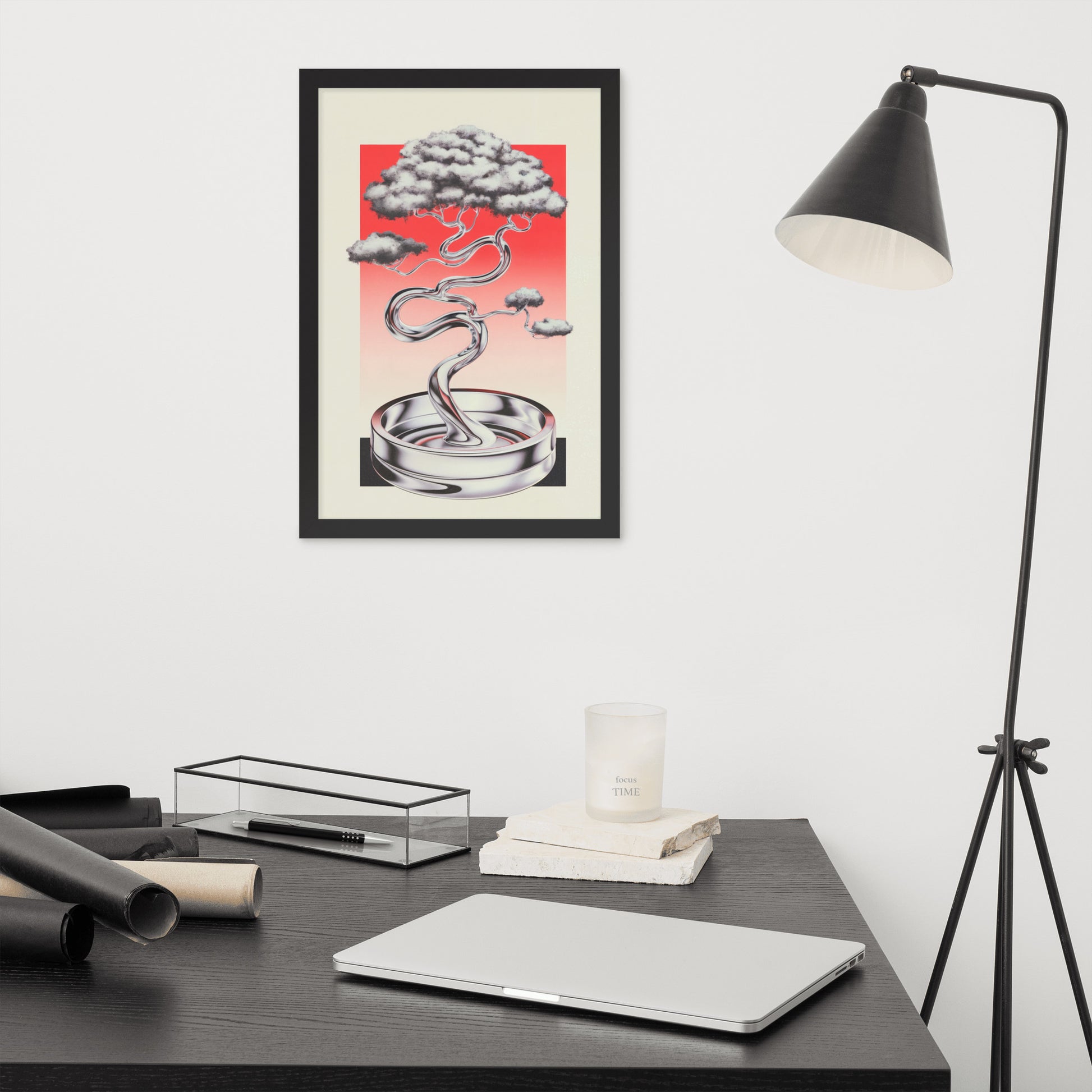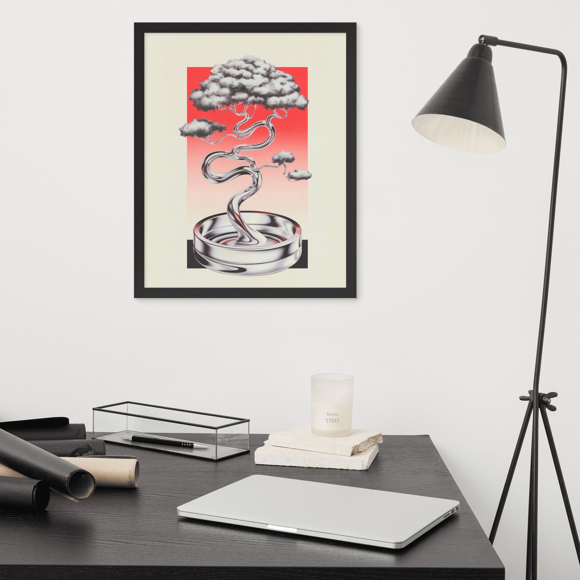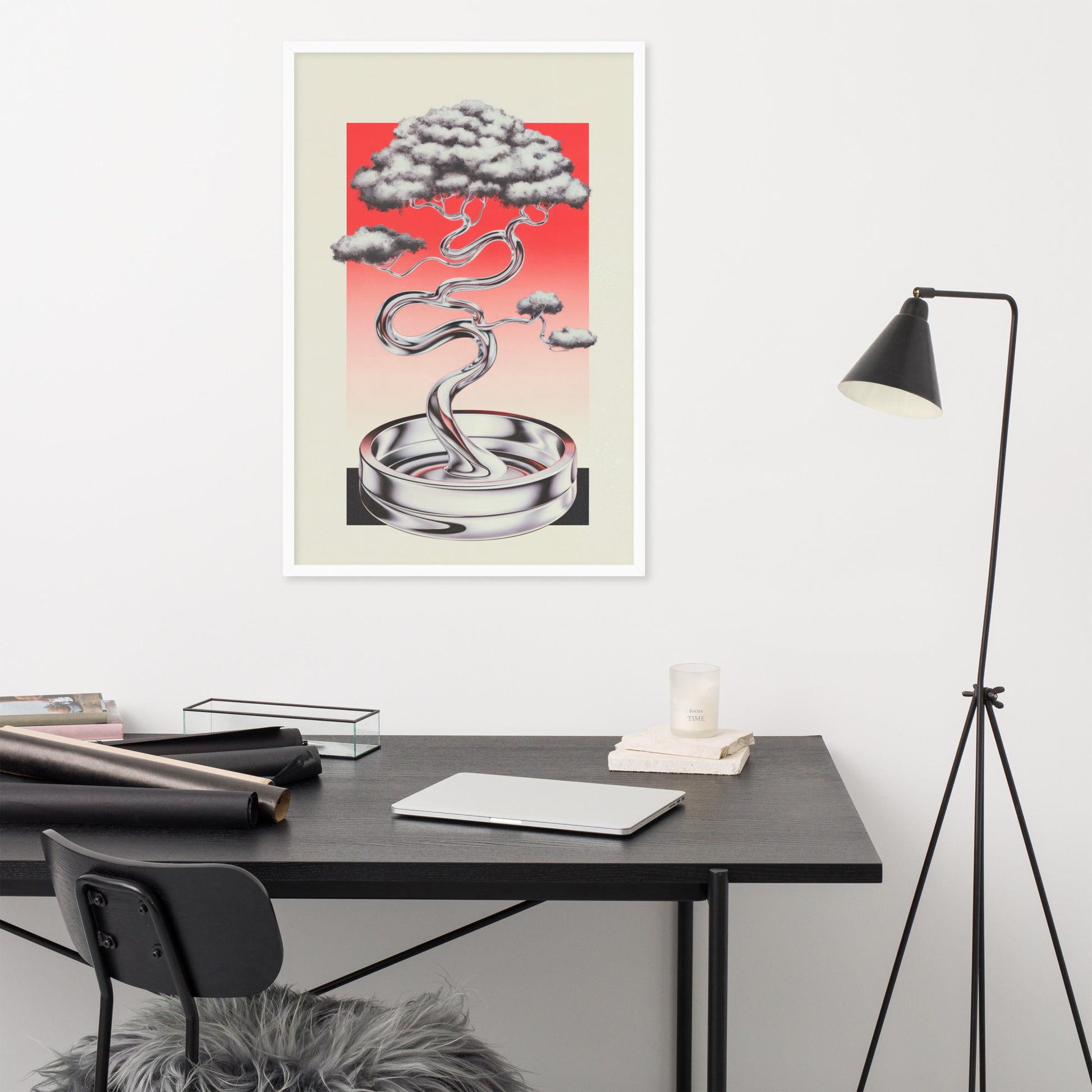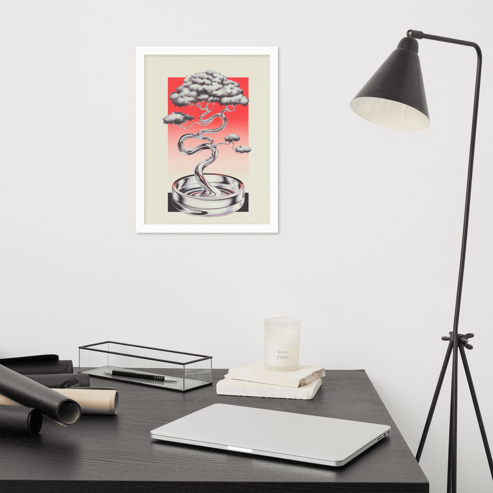 Chrome Bonsai is a surreal fusion of nature and machine—an abstract tree with fluid, metallic branches sprouting cloud-like foliage from a reflective chrome basin. Set against a dramatic gradient backdrop that shifts from deep crimson to pale cream, this artwork evokes themes of transformation, artificial growth, and organic elegance reimagined. The twisting trunk and vaporous canopy create a dreamlike silhouette that’s both futuristic and meditative. Printed on premium paper and framed for gallery-style impact, this piece is perfect for modern interiors, design-forward spaces, or collectors drawn to imaginative, boundary-blurring art.