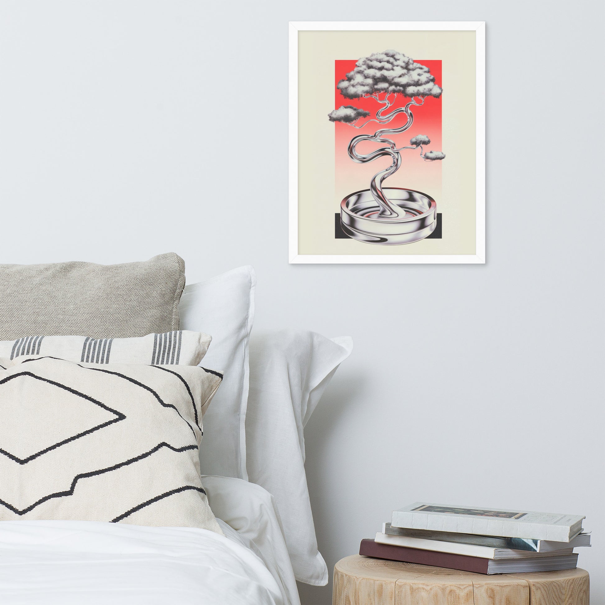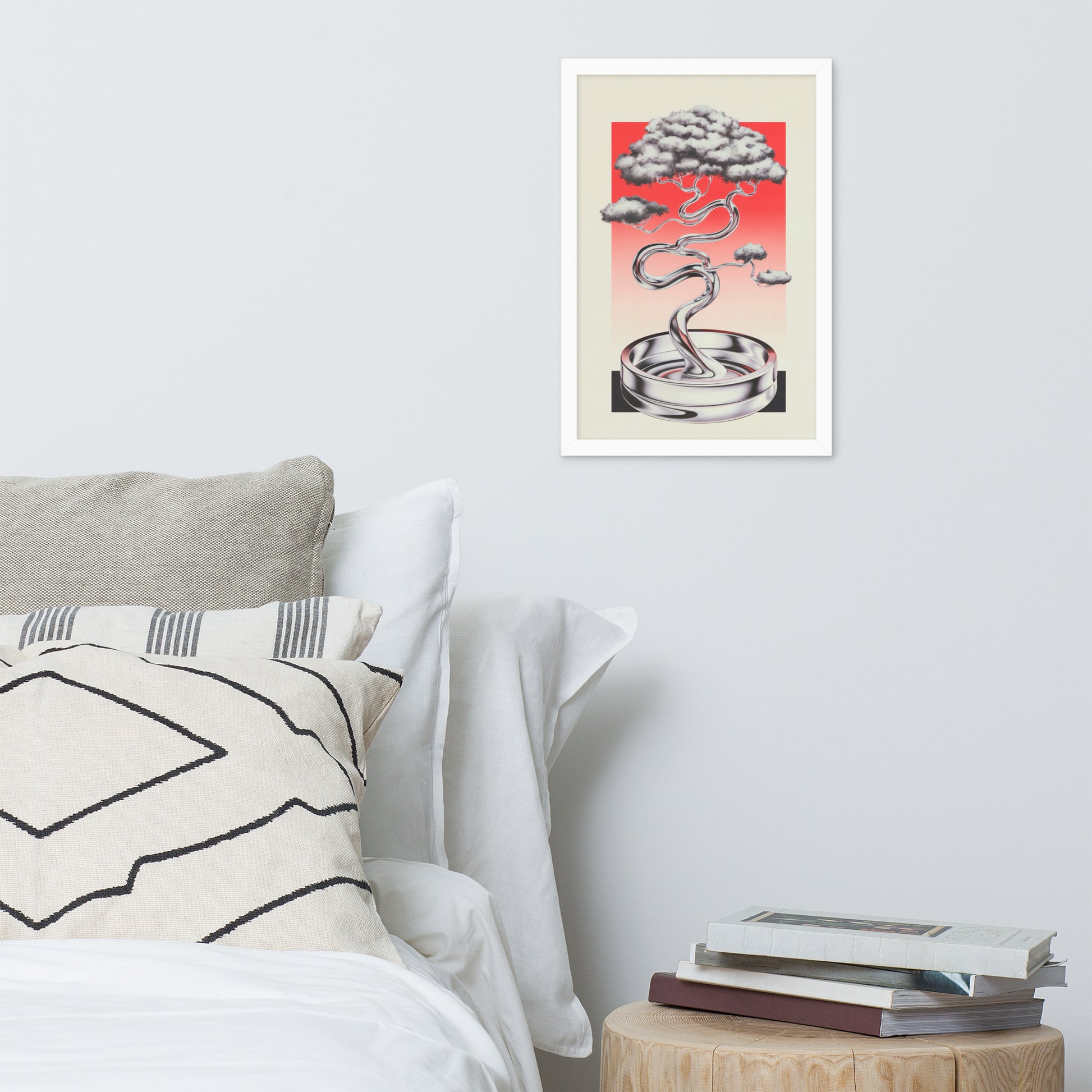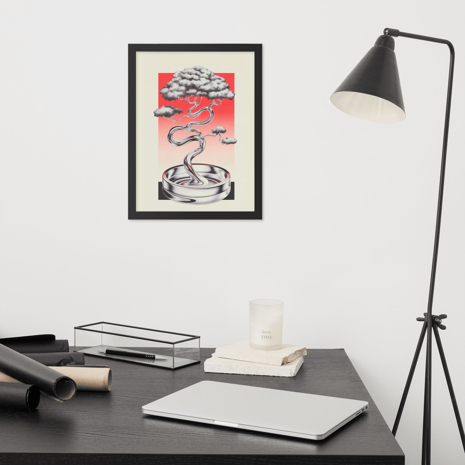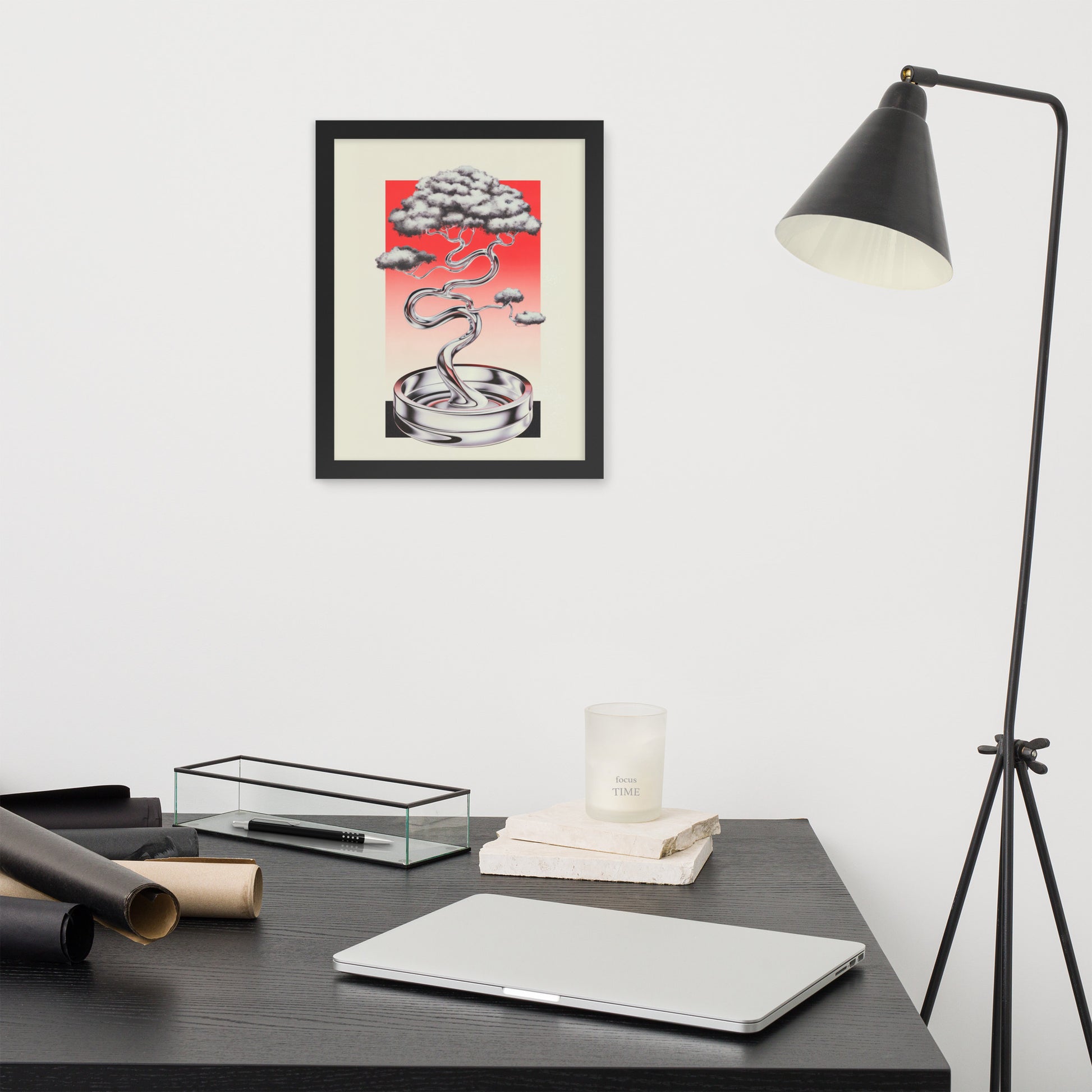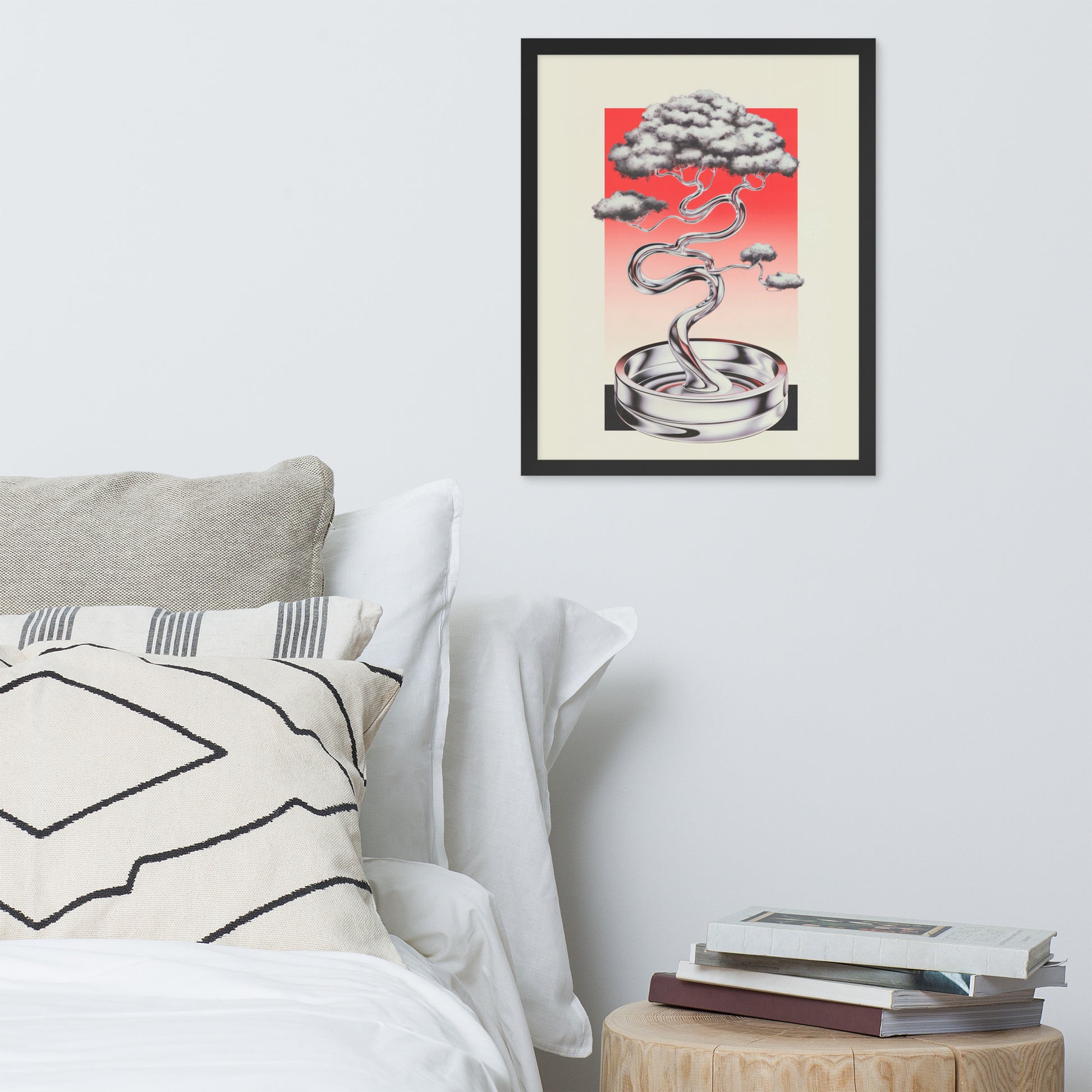 Chrome Bonsai is a surreal fusion of nature and machine—an abstract tree with fluid, metallic branches sprouting cloud-like foliage from a reflective chrome basin. Set against a dramatic gradient backdrop that shifts from deep crimson to pale cream, this artwork evokes themes of transformation, artificial growth, and organic elegance reimagined. The twisting trunk and vaporous canopy create a dreamlike silhouette that’s both futuristic and meditative. Printed on premium paper and framed for gallery-style impact, this piece is perfect for modern interiors, design-forward spaces, or collectors drawn to imaginative, boundary-blurring art.