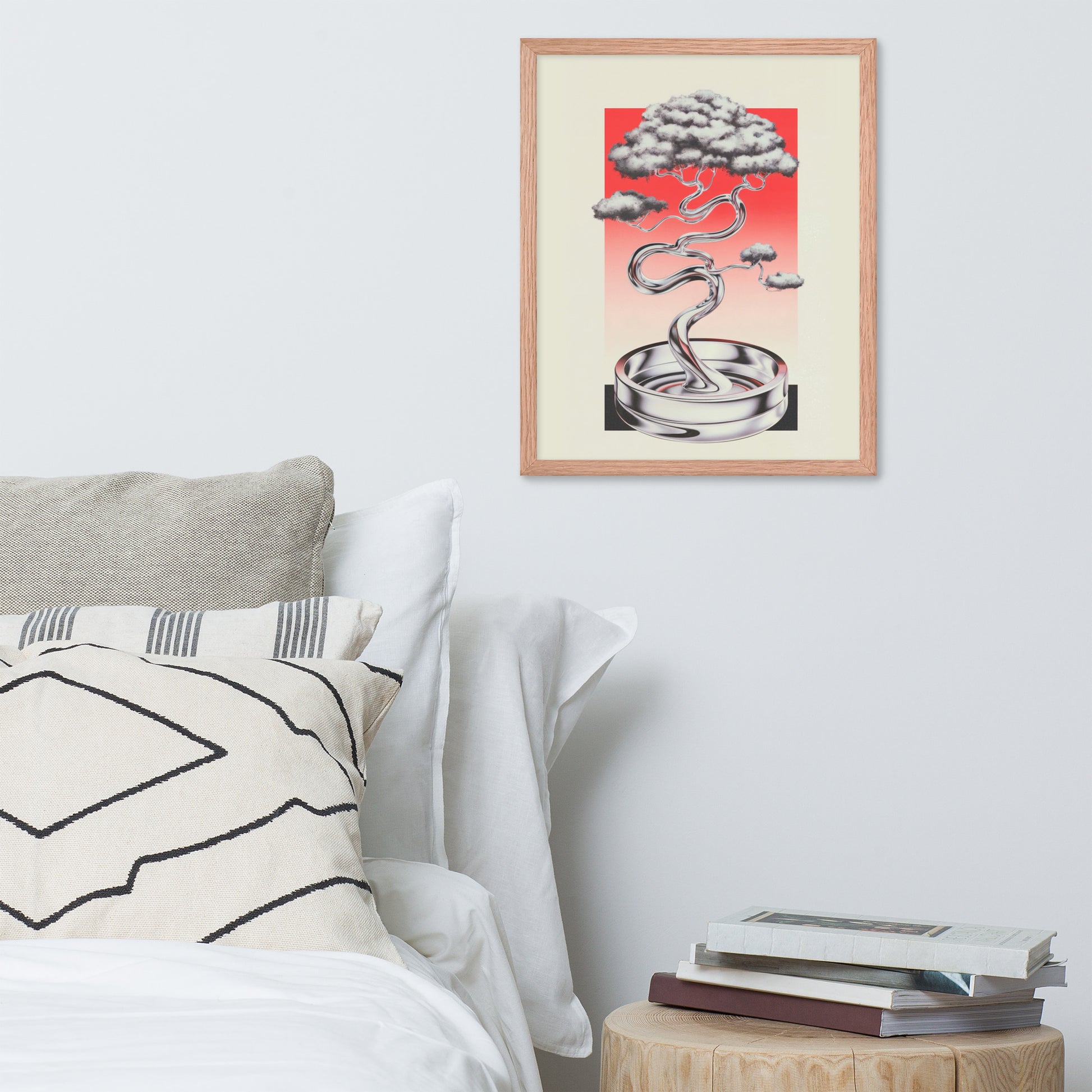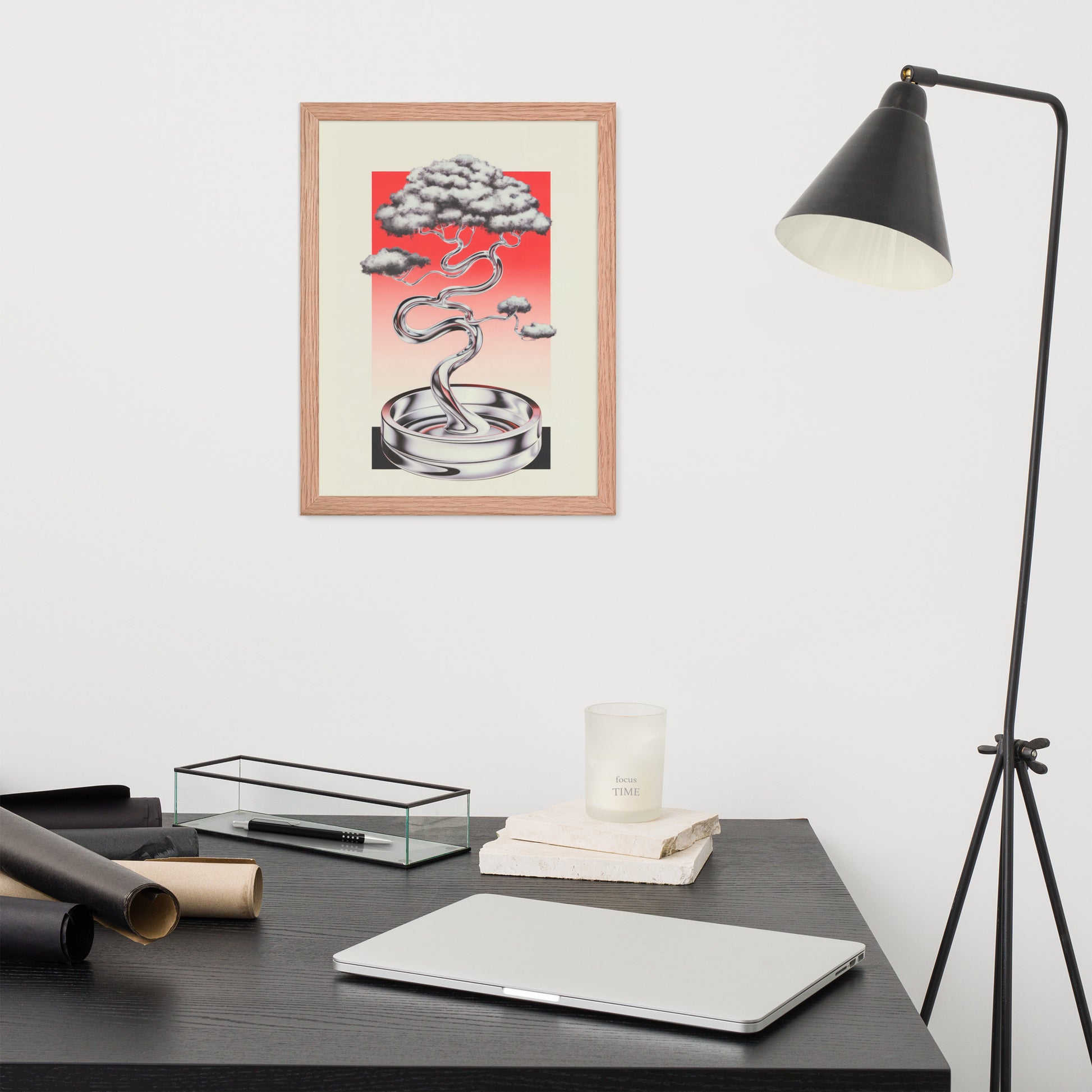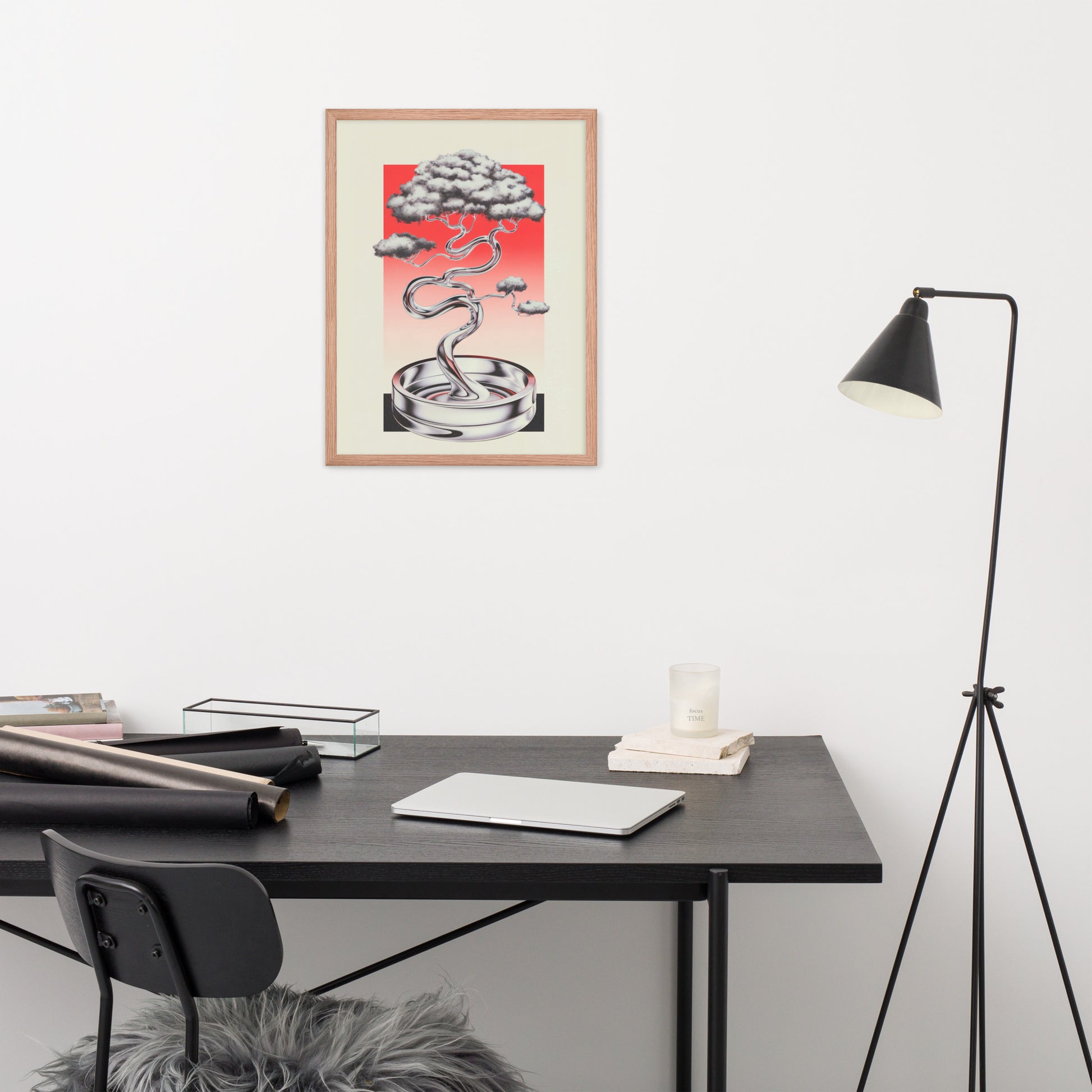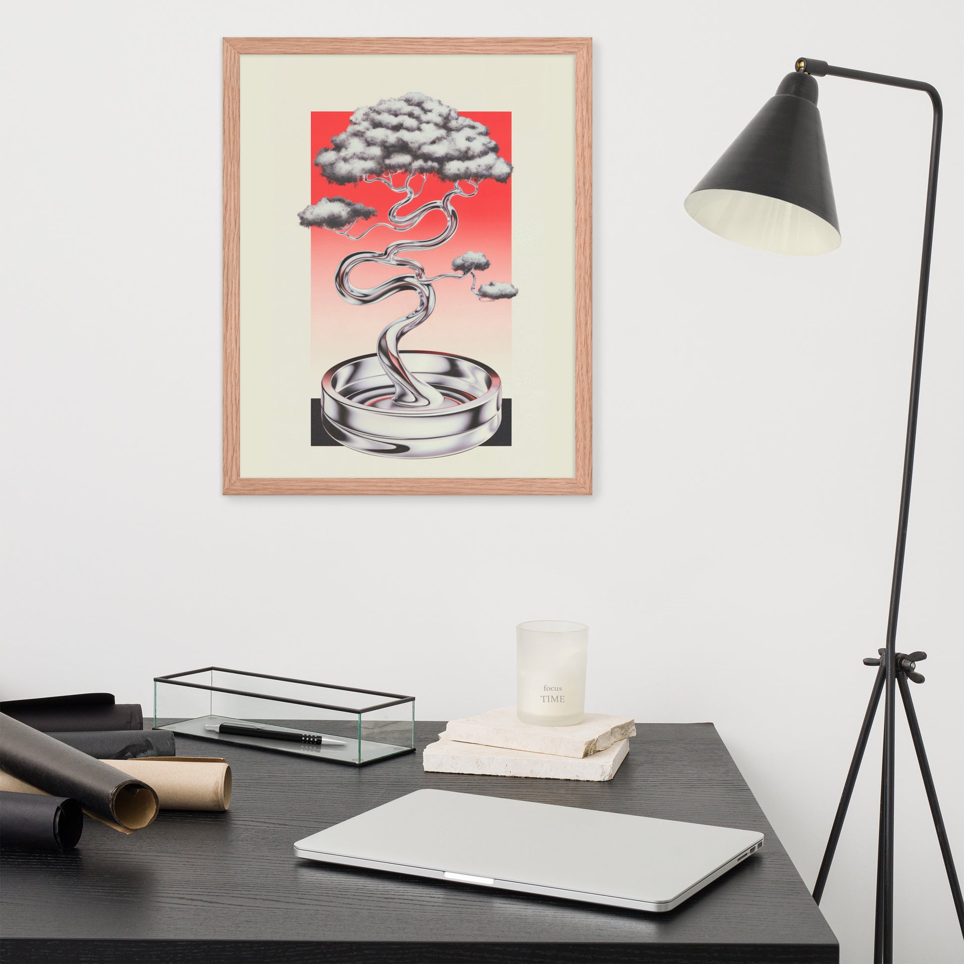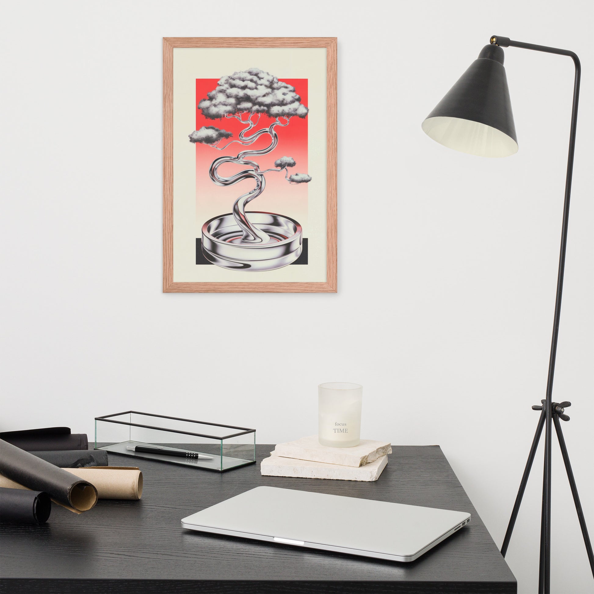 Chrome Bonsai is a surreal fusion of nature and machine—an abstract tree with fluid, metallic branches sprouting cloud-like foliage from a reflective chrome basin. Set against a dramatic gradient backdrop that shifts from deep crimson to pale cream, this artwork evokes themes of transformation, artificial growth, and organic elegance reimagined. The twisting trunk and vaporous canopy create a dreamlike silhouette that’s both futuristic and meditative. Printed on premium paper and framed for gallery-style impact, this piece is perfect for modern interiors, design-forward spaces, or collectors drawn to imaginative, boundary-blurring art.