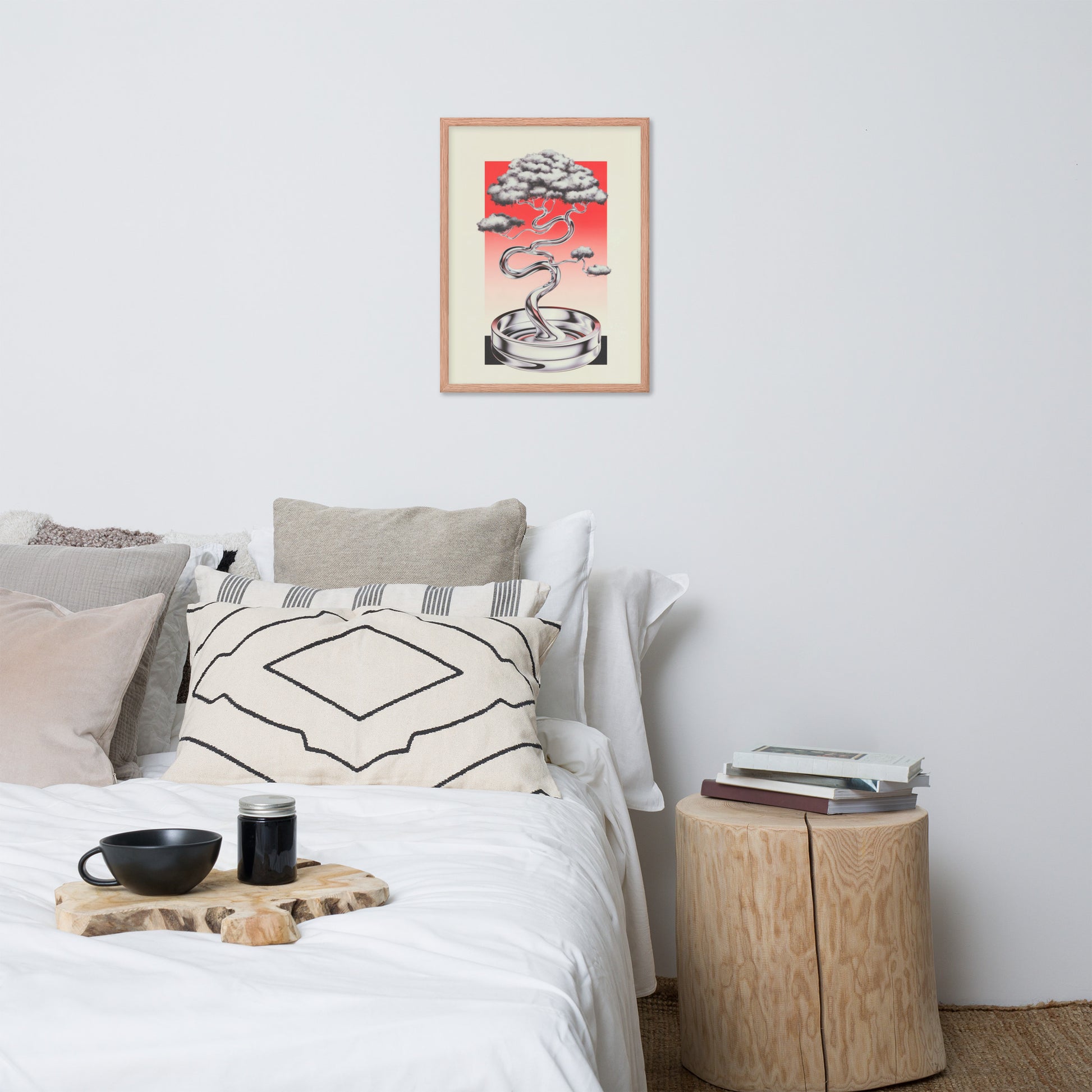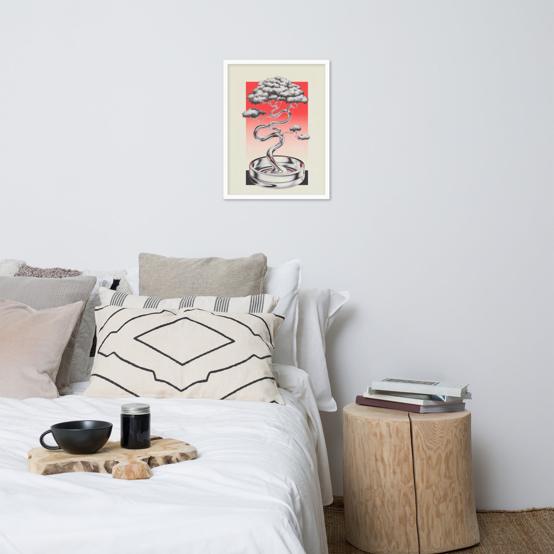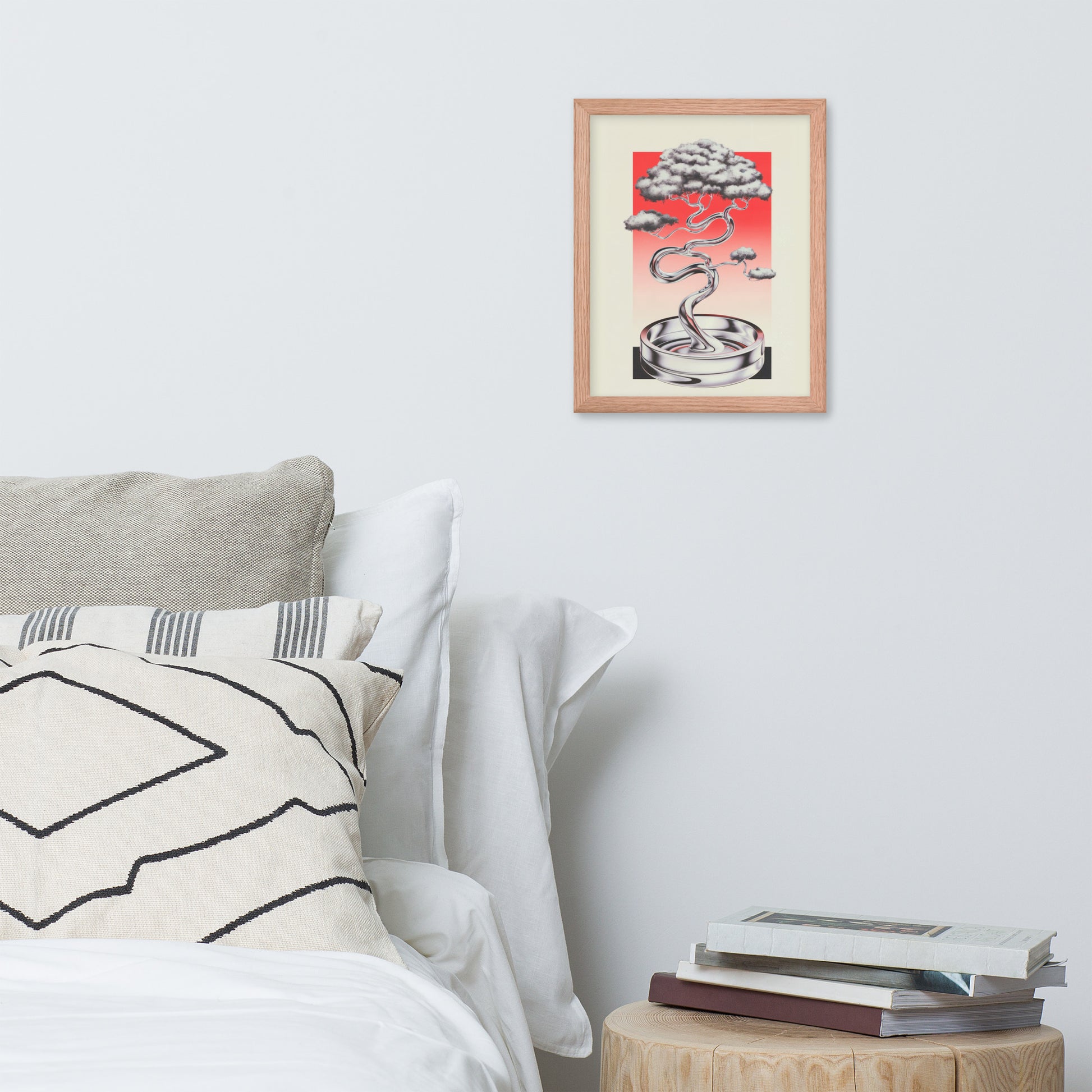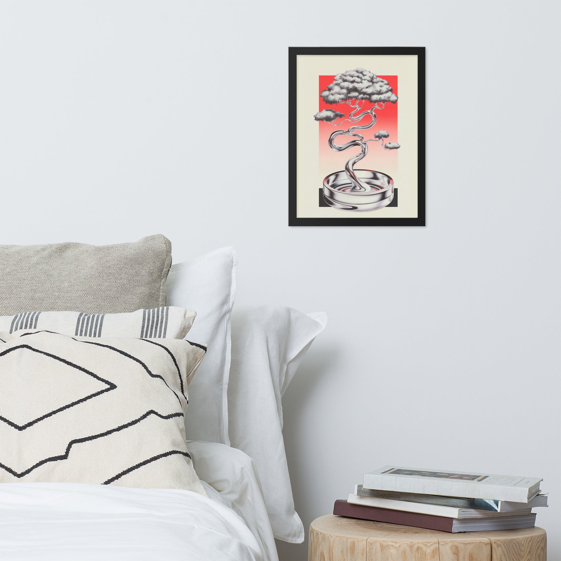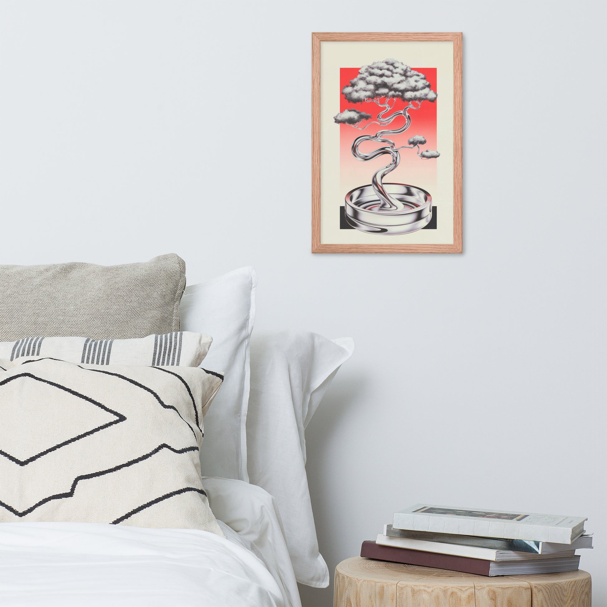 Chrome Bonsai is a surreal fusion of nature and machine—an abstract tree with fluid, metallic branches sprouting cloud-like foliage from a reflective chrome basin. Set against a dramatic gradient backdrop that shifts from deep crimson to pale cream, this artwork evokes themes of transformation, artificial growth, and organic elegance reimagined. The twisting trunk and vaporous canopy create a dreamlike silhouette that’s both futuristic and meditative. Printed on premium paper and framed for gallery-style impact, this piece is perfect for modern interiors, design-forward spaces, or collectors drawn to imaginative, boundary-blurring art.