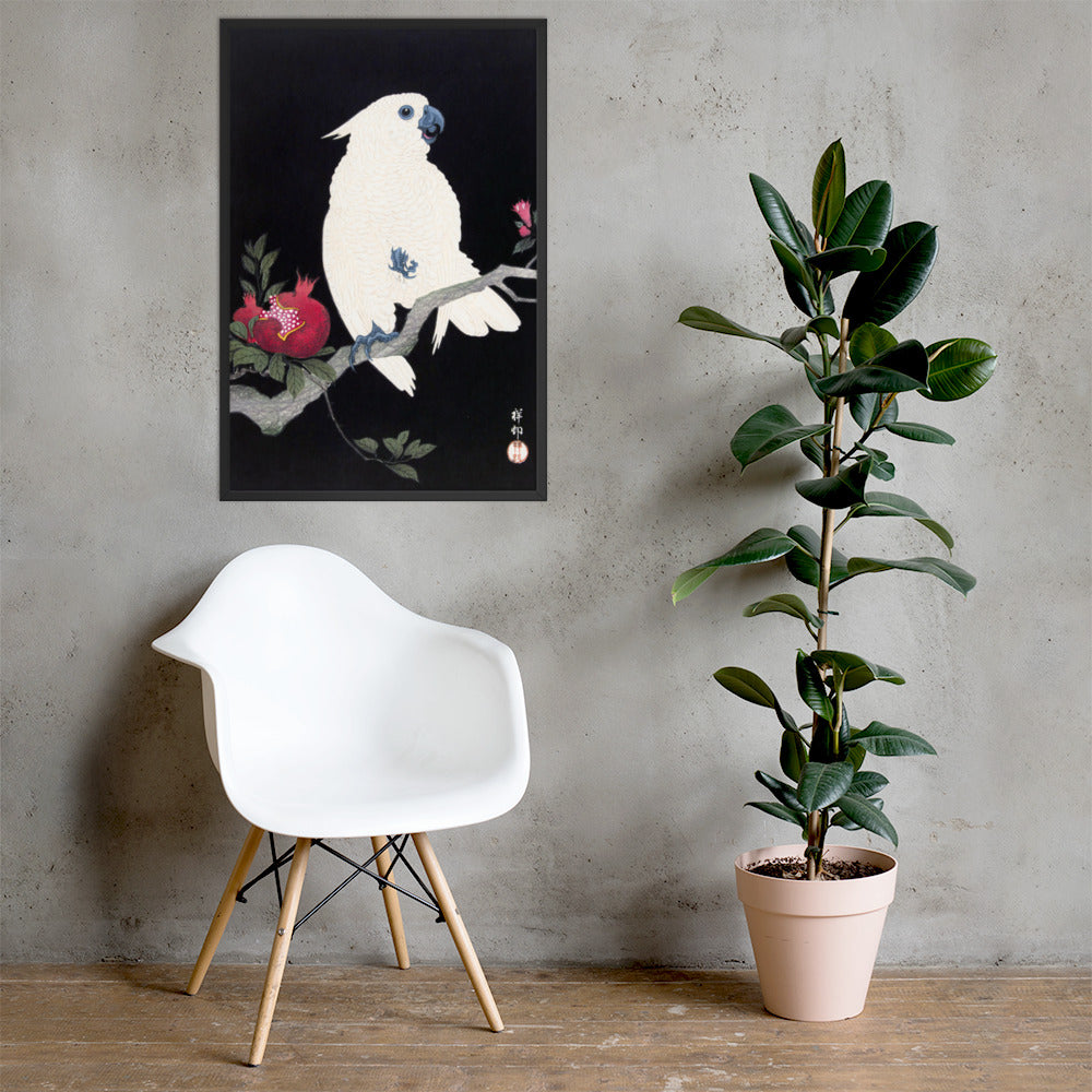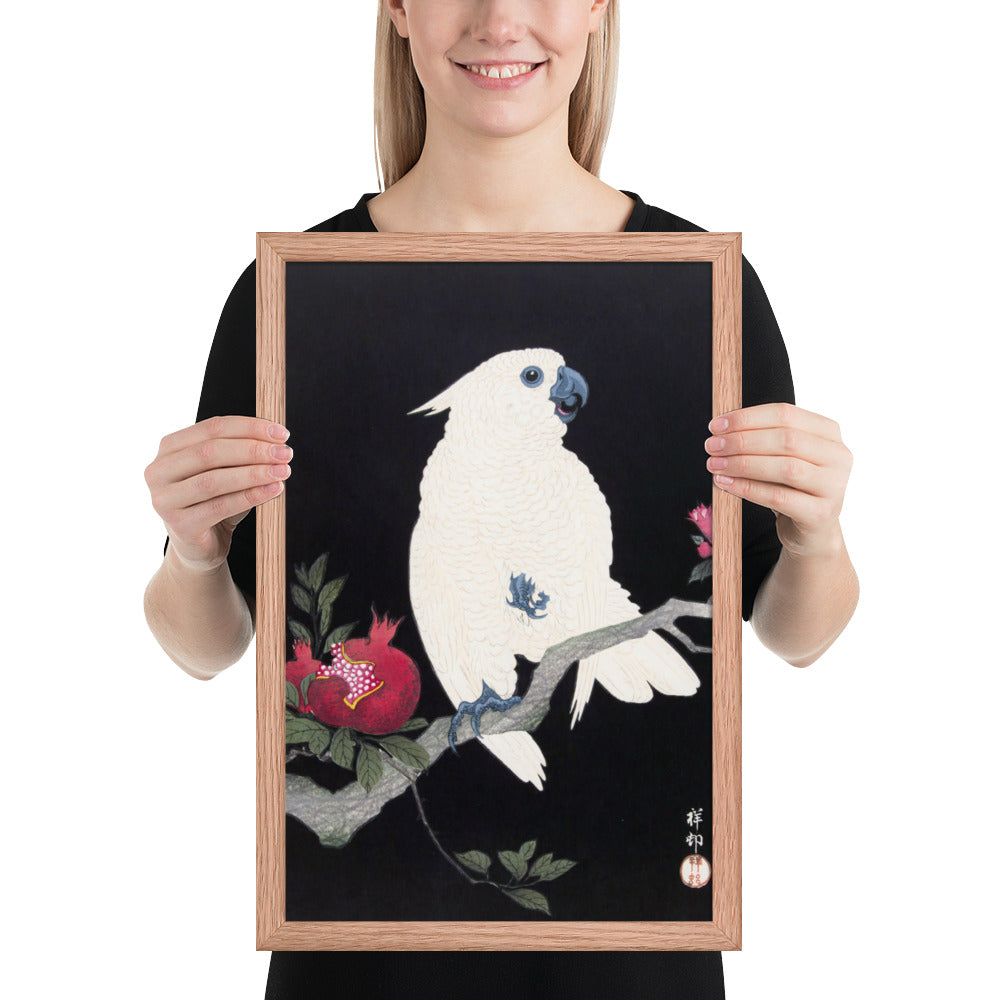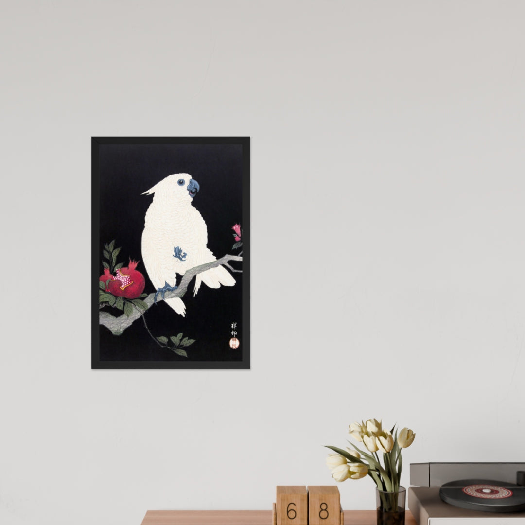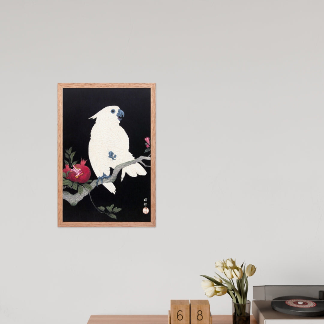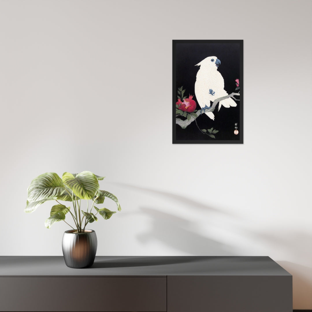 Bring bold elegance and natural symbolism into your space with Cockatoo and Pomegranate by Ohara Koson, a vivid composition from the tradition of Japanese Woodblock Prints (Ukiyo-e). This framed artwork features a white cockatoo perched gracefully on a flowering branch, its expressive crest and blue-tinted beak and feet rendered with delicate precision. A split-open pomegranate reveals its ruby seeds—an ancient symbol of abundance and vitality—while soft pink blossoms add a touch of seasonal charm.