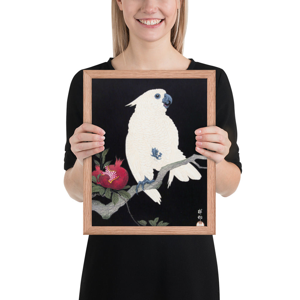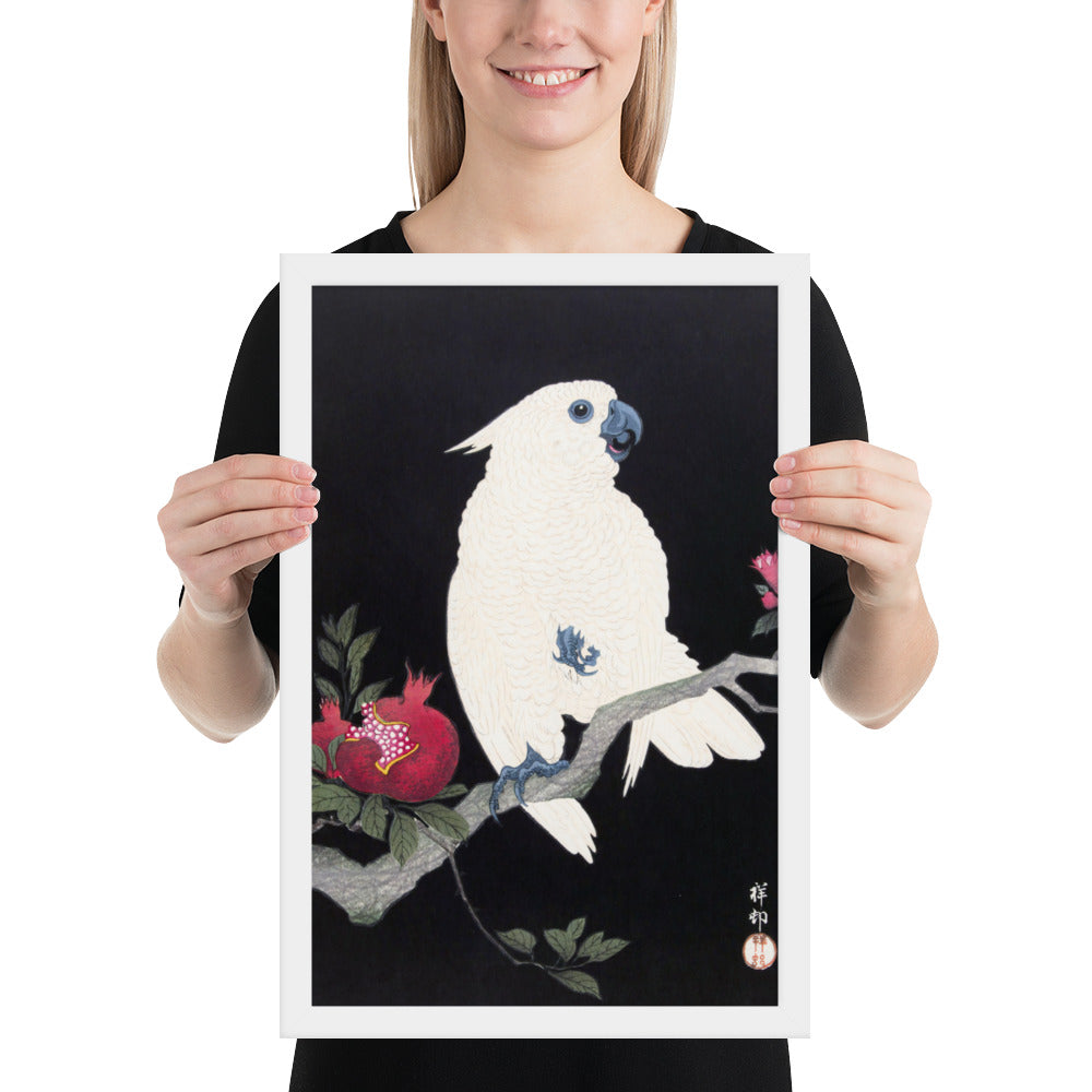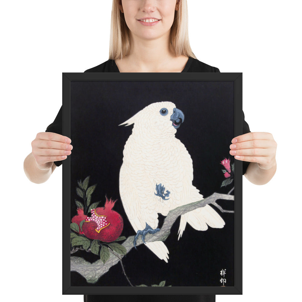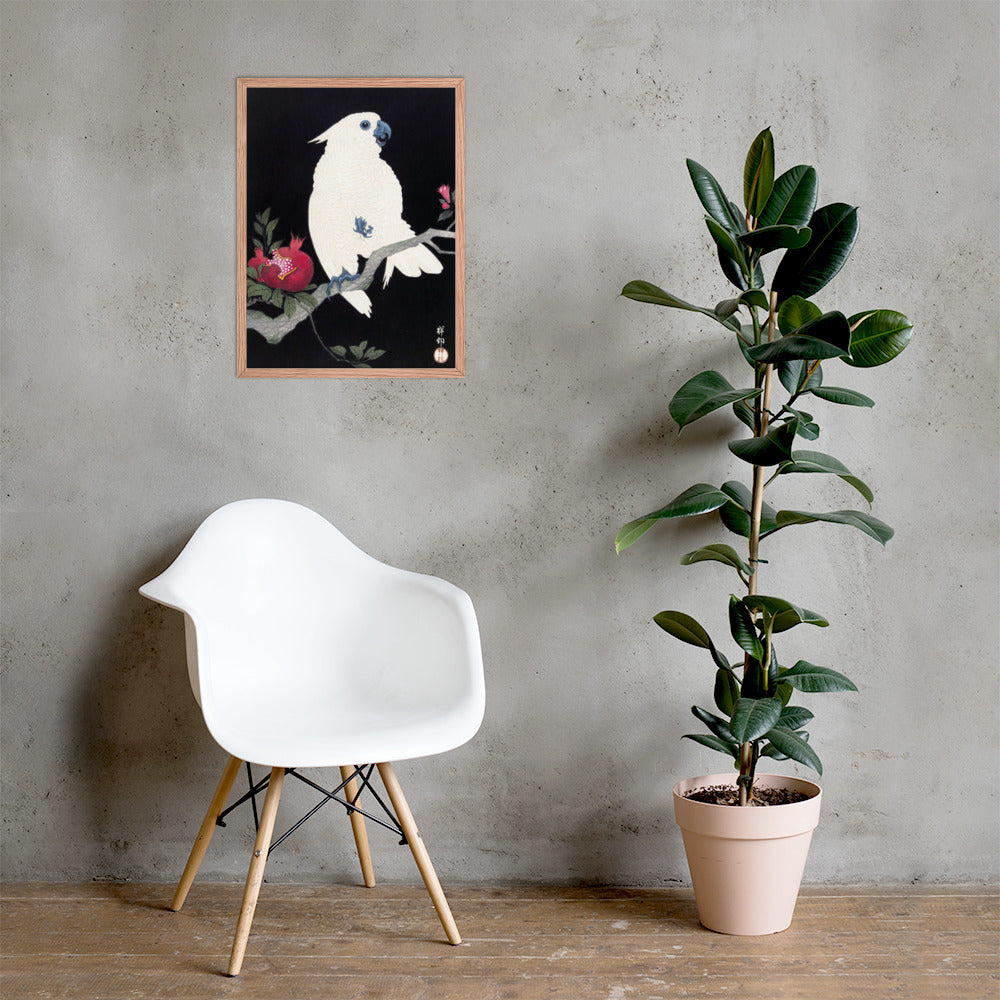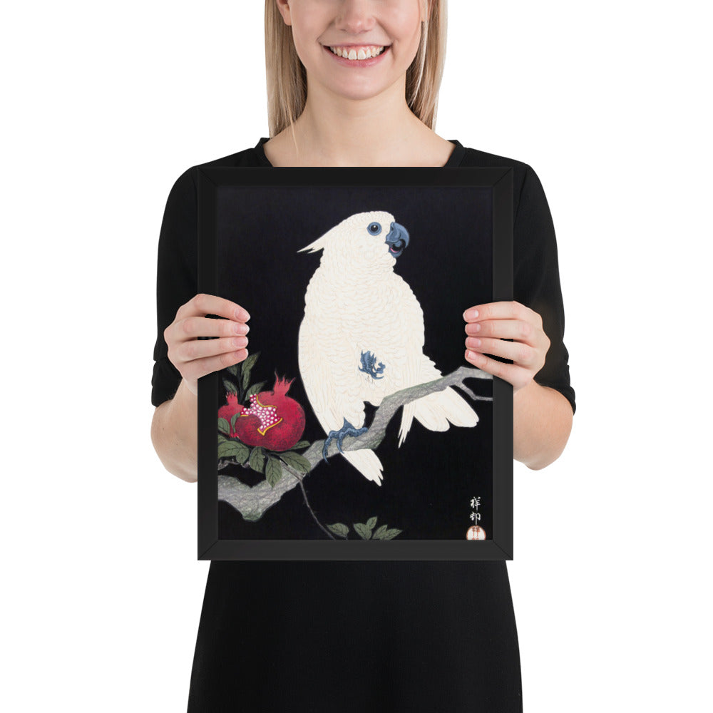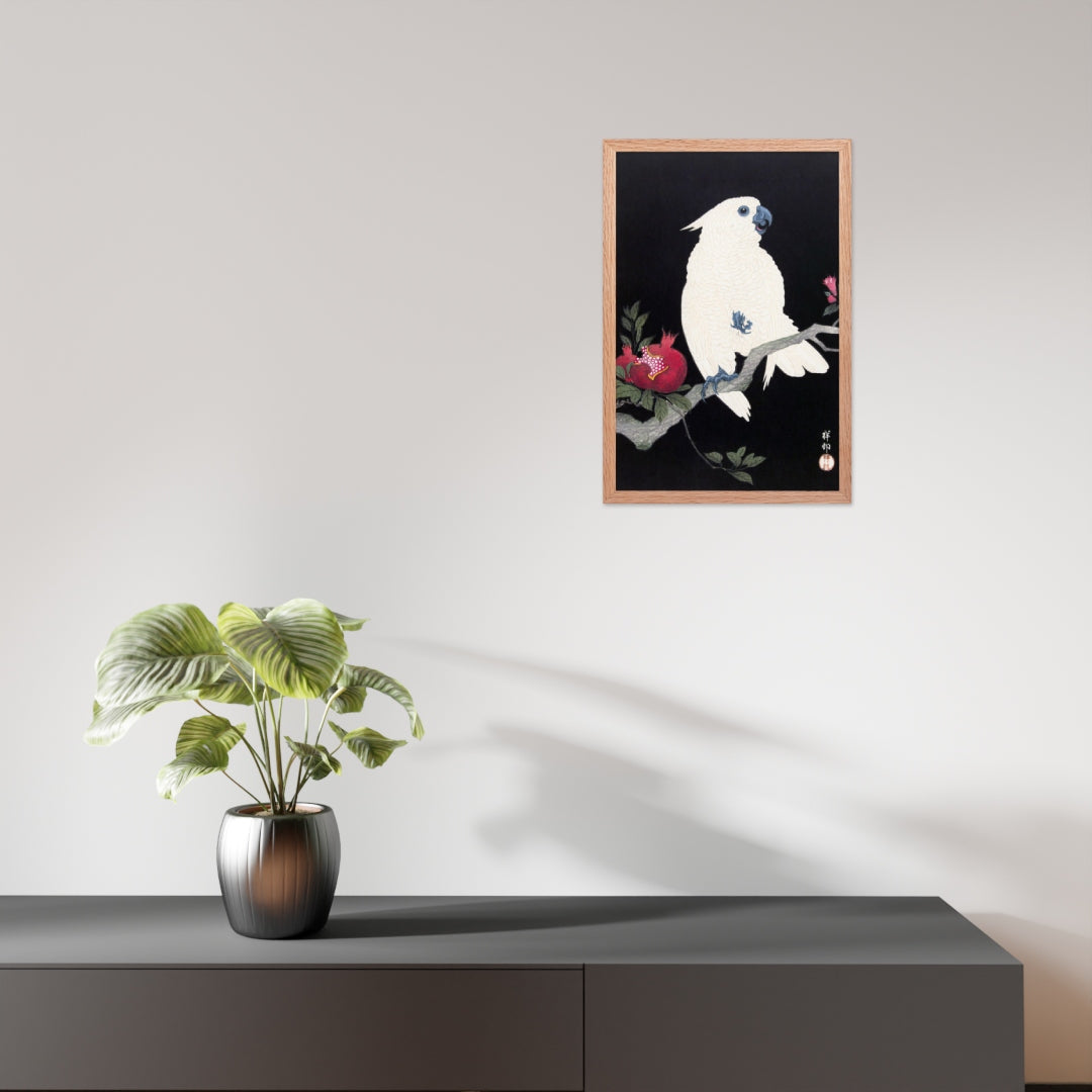 Bring bold elegance and natural symbolism into your space with Cockatoo and Pomegranate by Ohara Koson, a vivid composition from the tradition of Japanese Woodblock Prints (Ukiyo-e). This framed artwork features a white cockatoo perched gracefully on a flowering branch, its expressive crest and blue-tinted beak and feet rendered with delicate precision. A split-open pomegranate reveals its ruby seeds—an ancient symbol of abundance and vitality—while soft pink blossoms add a touch of seasonal charm.