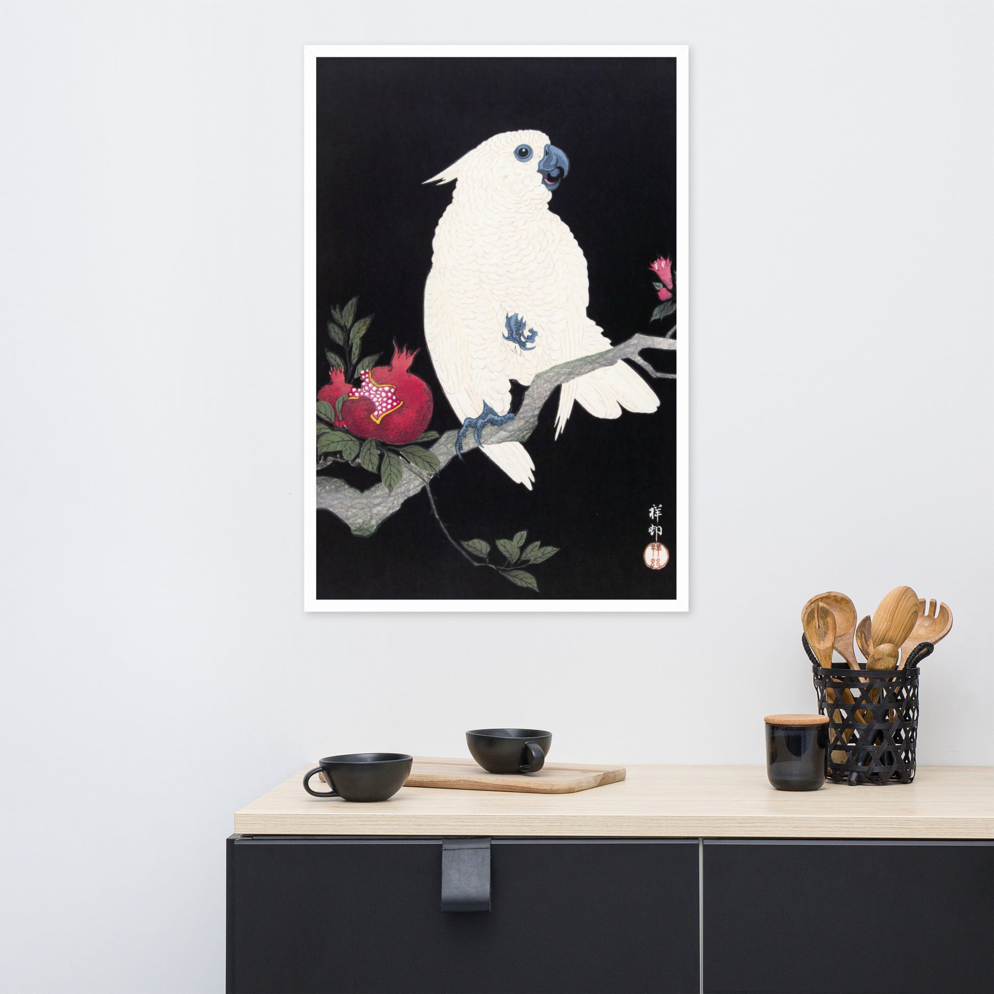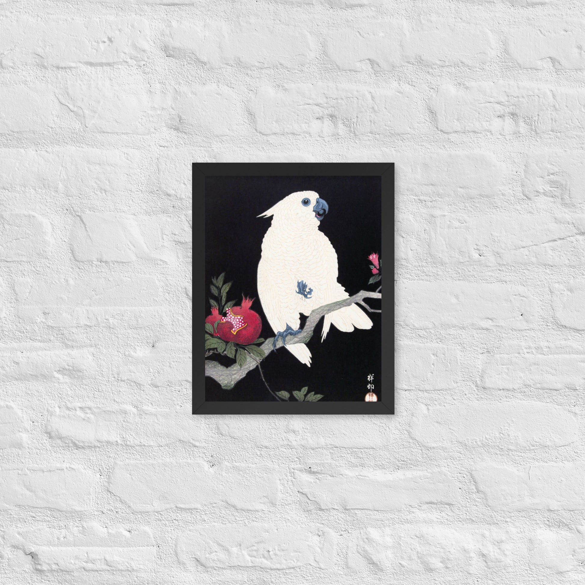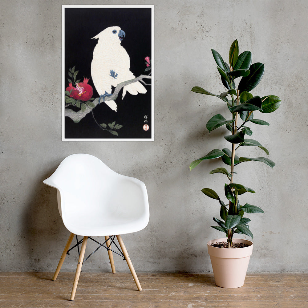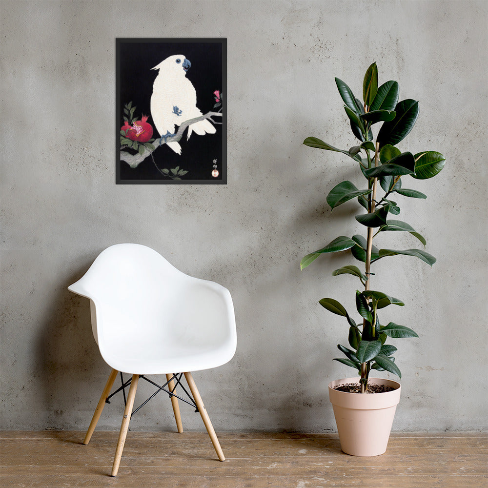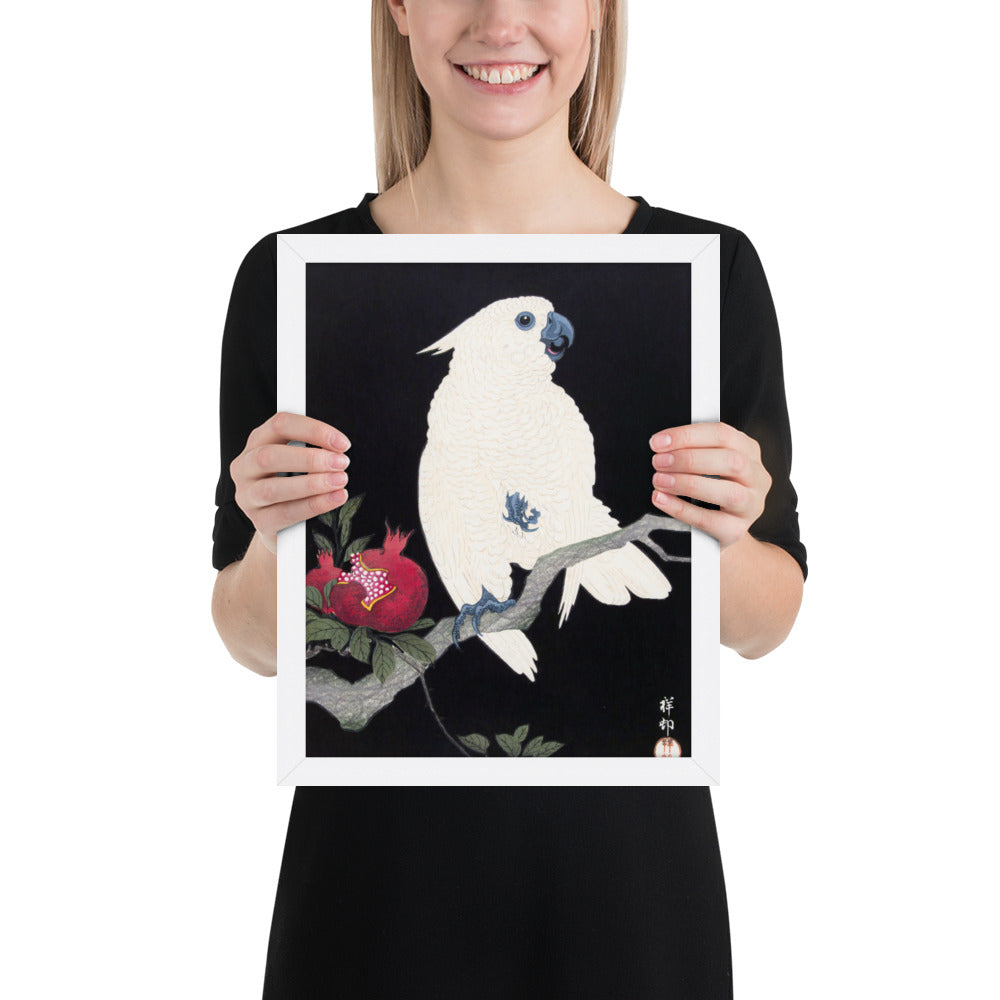 Bring bold elegance and natural symbolism into your space with Cockatoo and Pomegranate by Ohara Koson, a vivid composition from the tradition of Japanese Woodblock Prints (Ukiyo-e). This framed artwork features a white cockatoo perched gracefully on a flowering branch, its expressive crest and blue-tinted beak and feet rendered with delicate precision. A split-open pomegranate reveals its ruby seeds—an ancient symbol of abundance and vitality—while soft pink blossoms add a touch of seasonal charm.