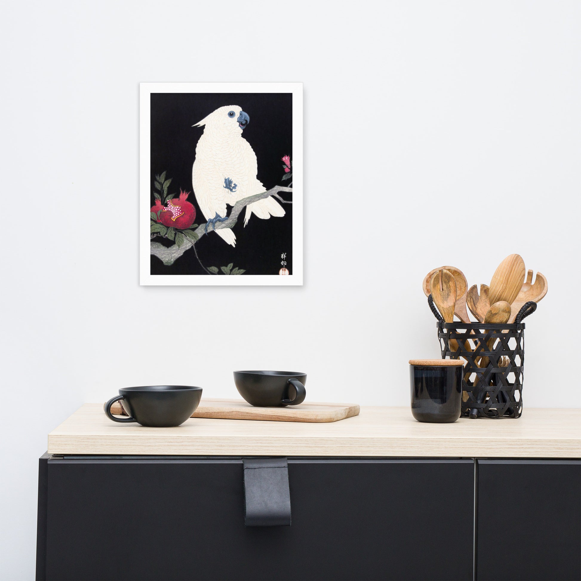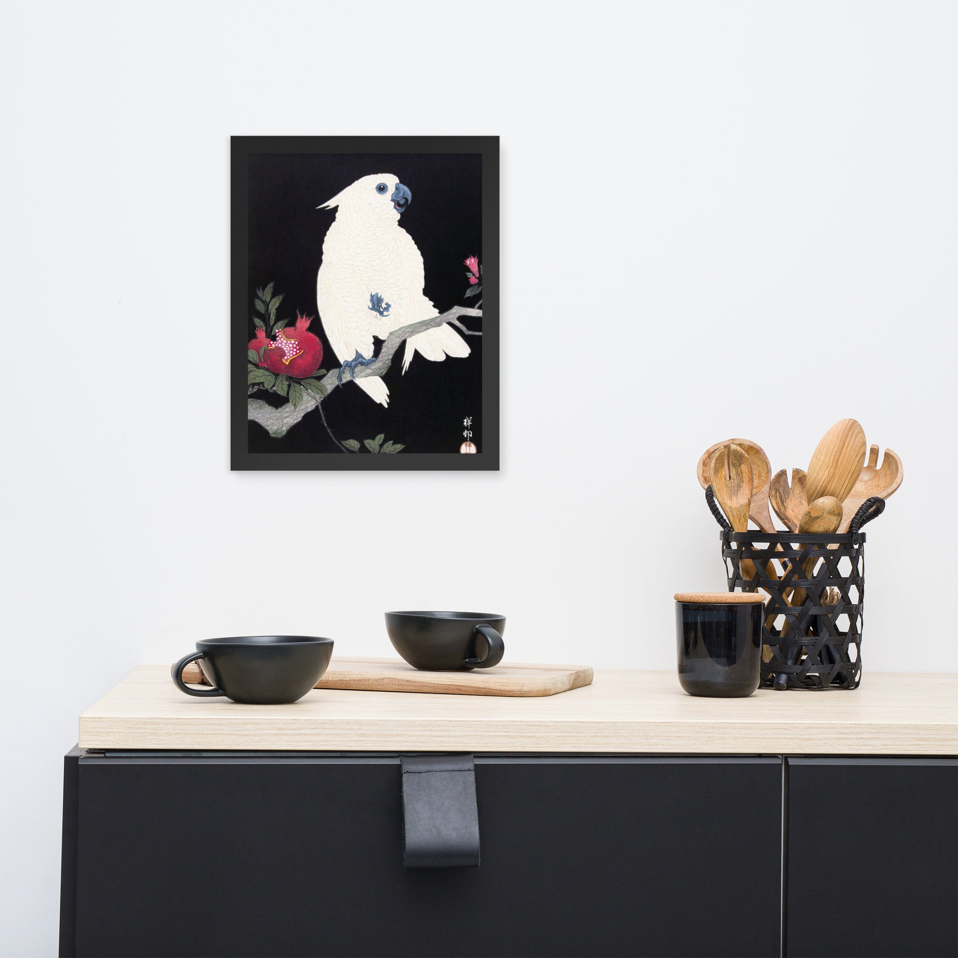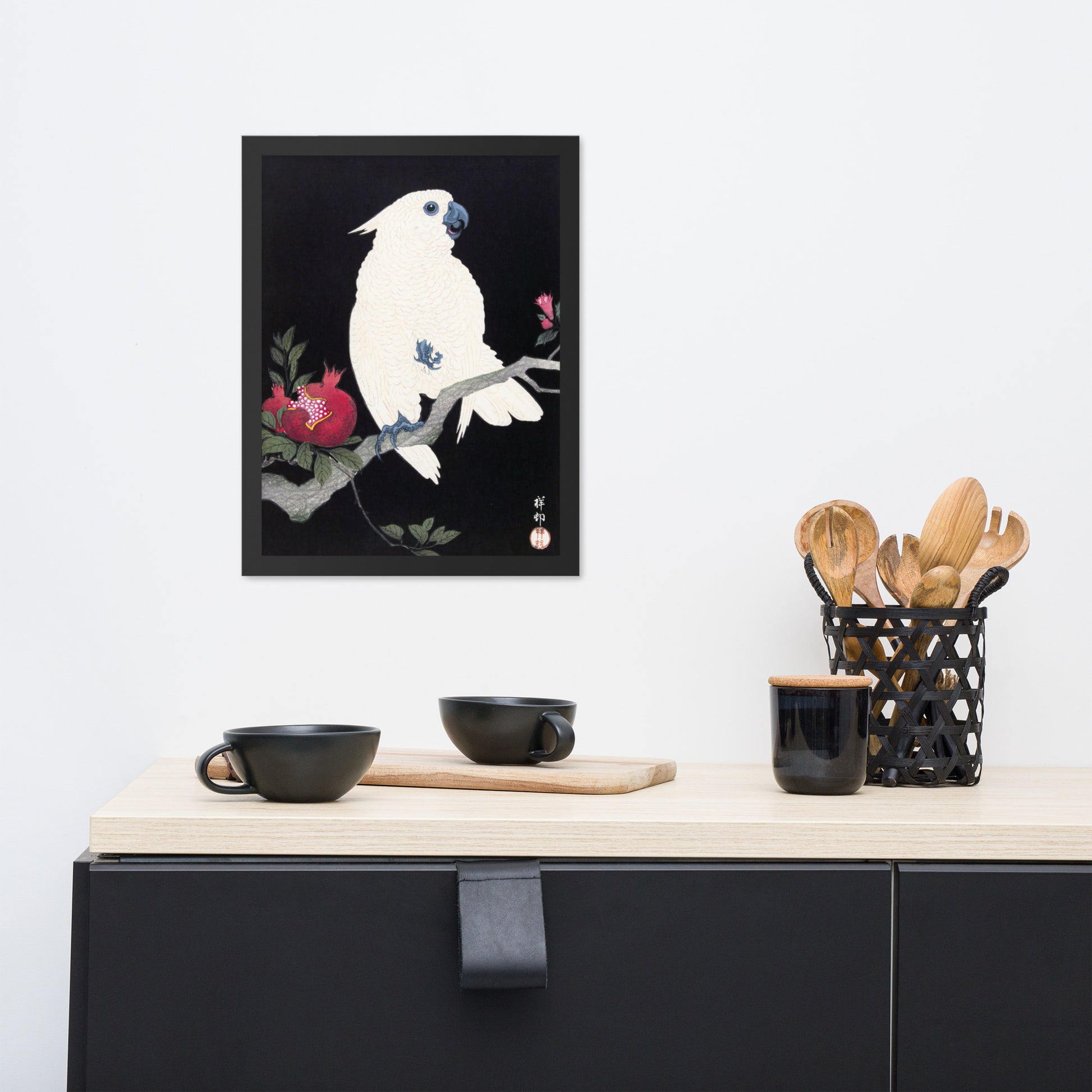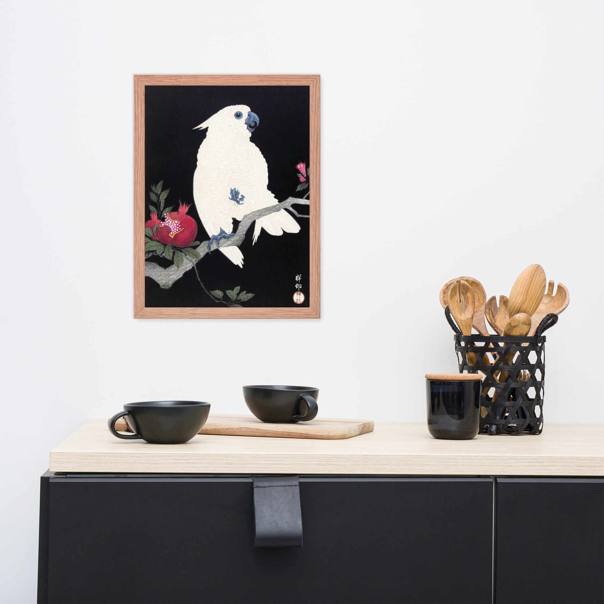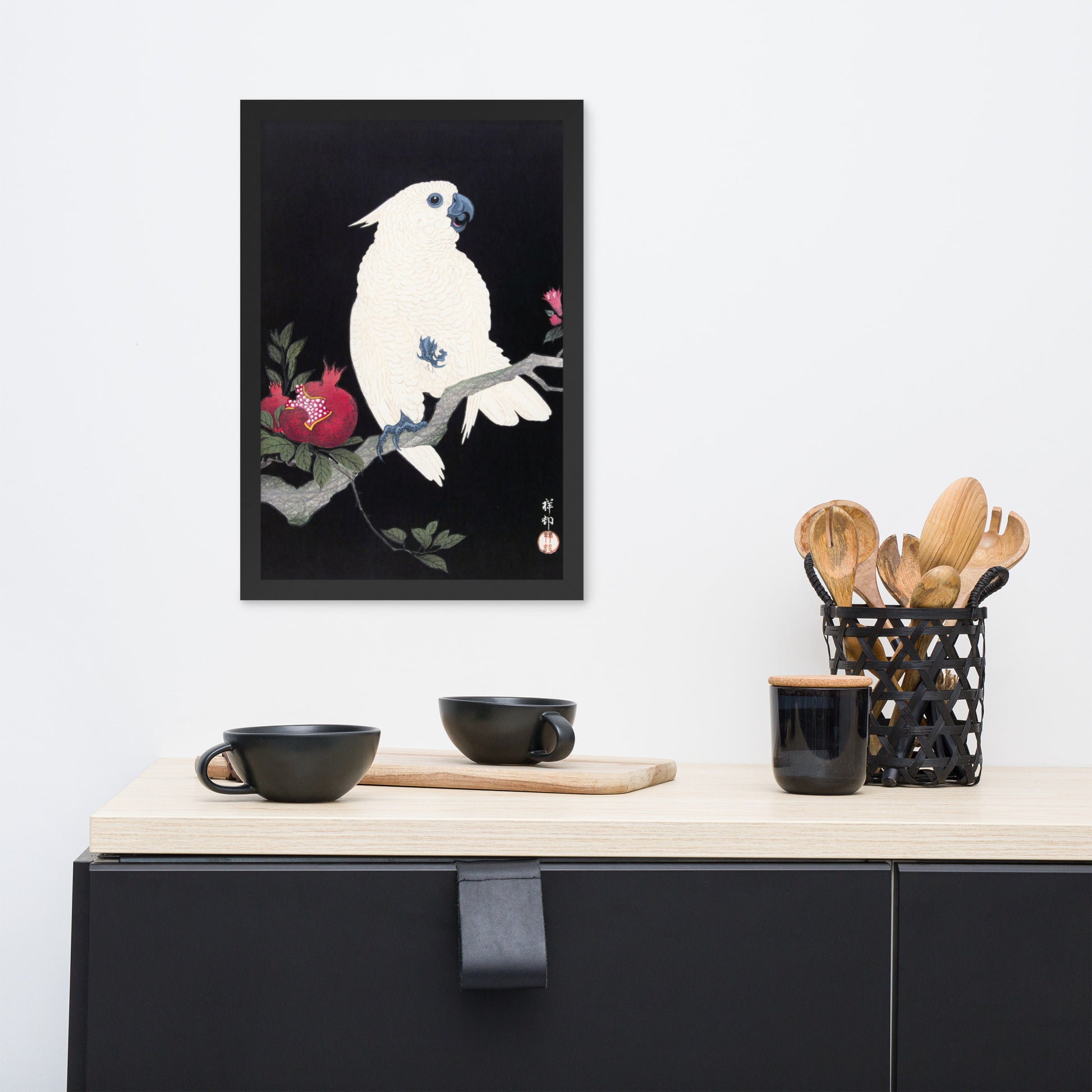 Bring bold elegance and natural symbolism into your space with Cockatoo and Pomegranate by Ohara Koson, a vivid composition from the tradition of Japanese Woodblock Prints (Ukiyo-e). This framed artwork features a white cockatoo perched gracefully on a flowering branch, its expressive crest and blue-tinted beak and feet rendered with delicate precision. A split-open pomegranate reveals its ruby seeds—an ancient symbol of abundance and vitality—while soft pink blossoms add a touch of seasonal charm.