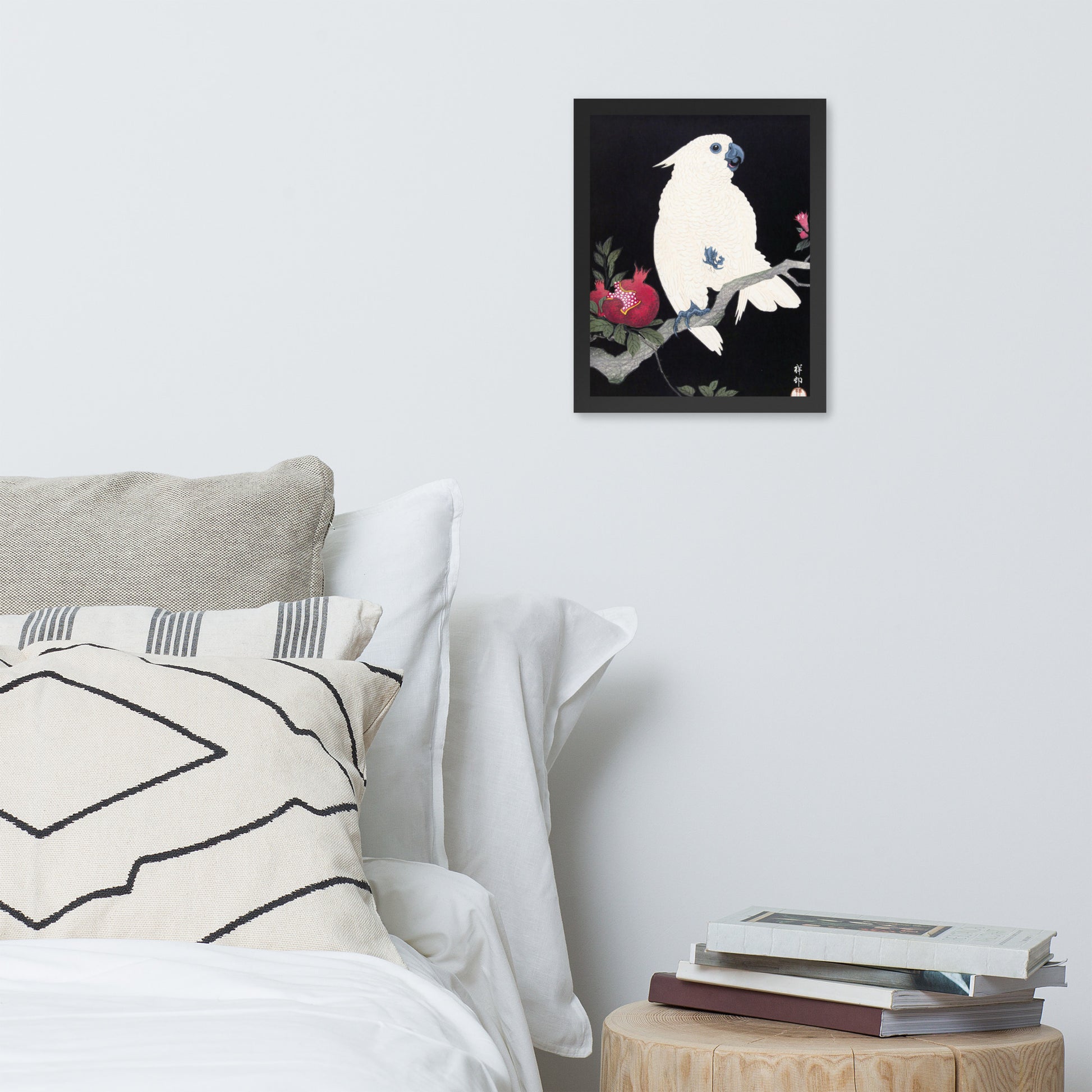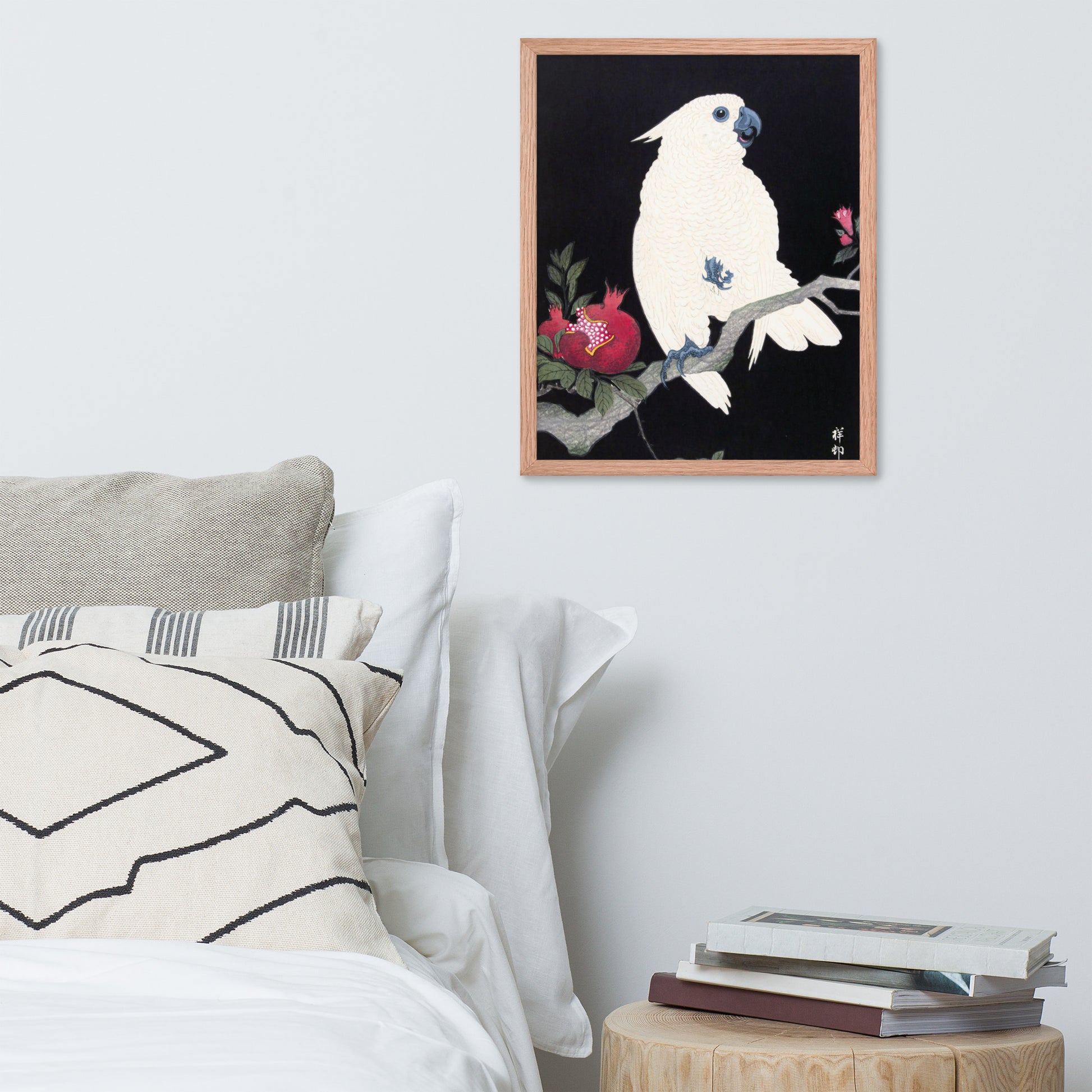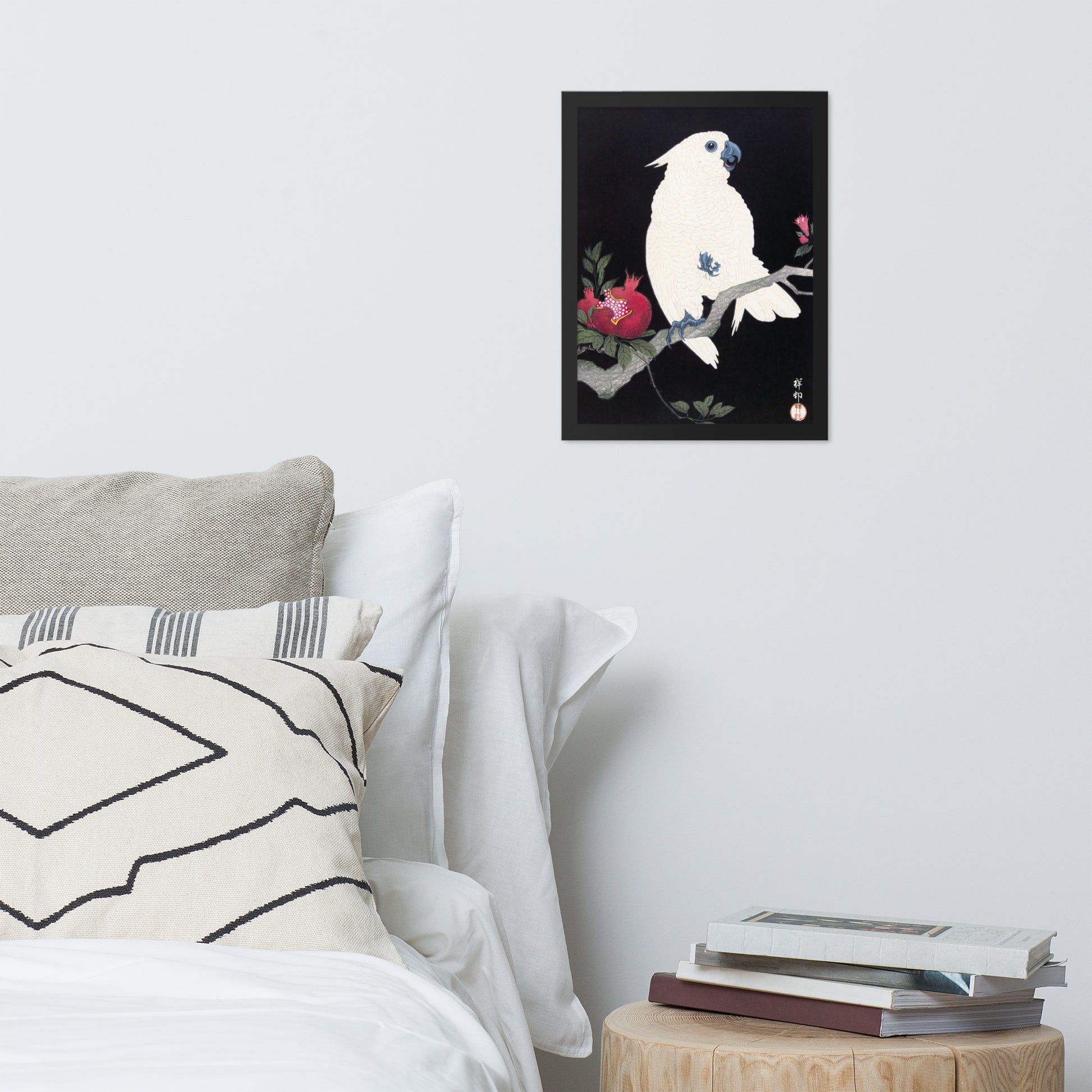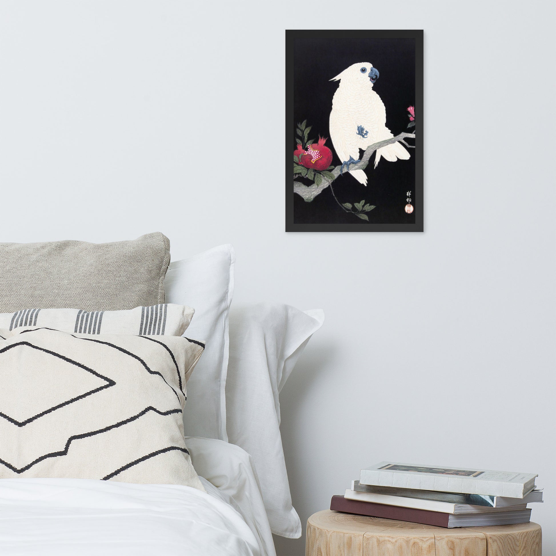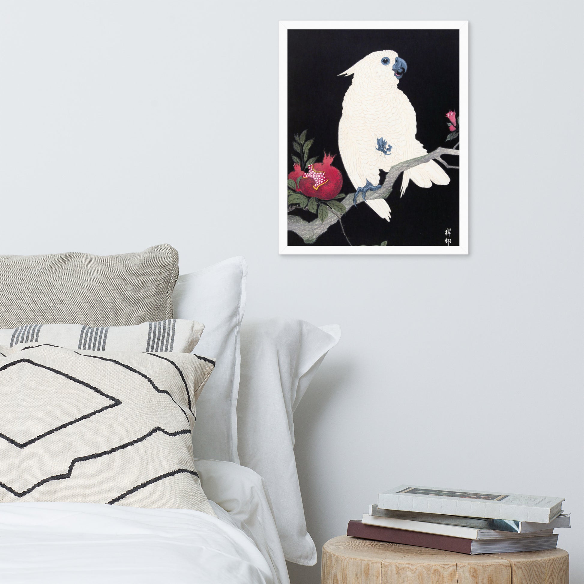Bring bold elegance and natural symbolism into your space with Cockatoo and Pomegranate by Ohara Koson, a vivid composition from the tradition of Japanese Woodblock Prints (Ukiyo-e). This framed artwork features a white cockatoo perched gracefully on a flowering branch, its expressive crest and blue-tinted beak and feet rendered with delicate precision. A split-open pomegranate reveals its ruby seeds—an ancient symbol of abundance and vitality—while soft pink blossoms add a touch of seasonal charm.