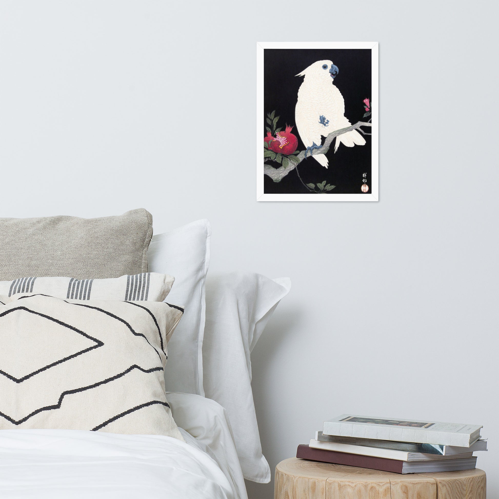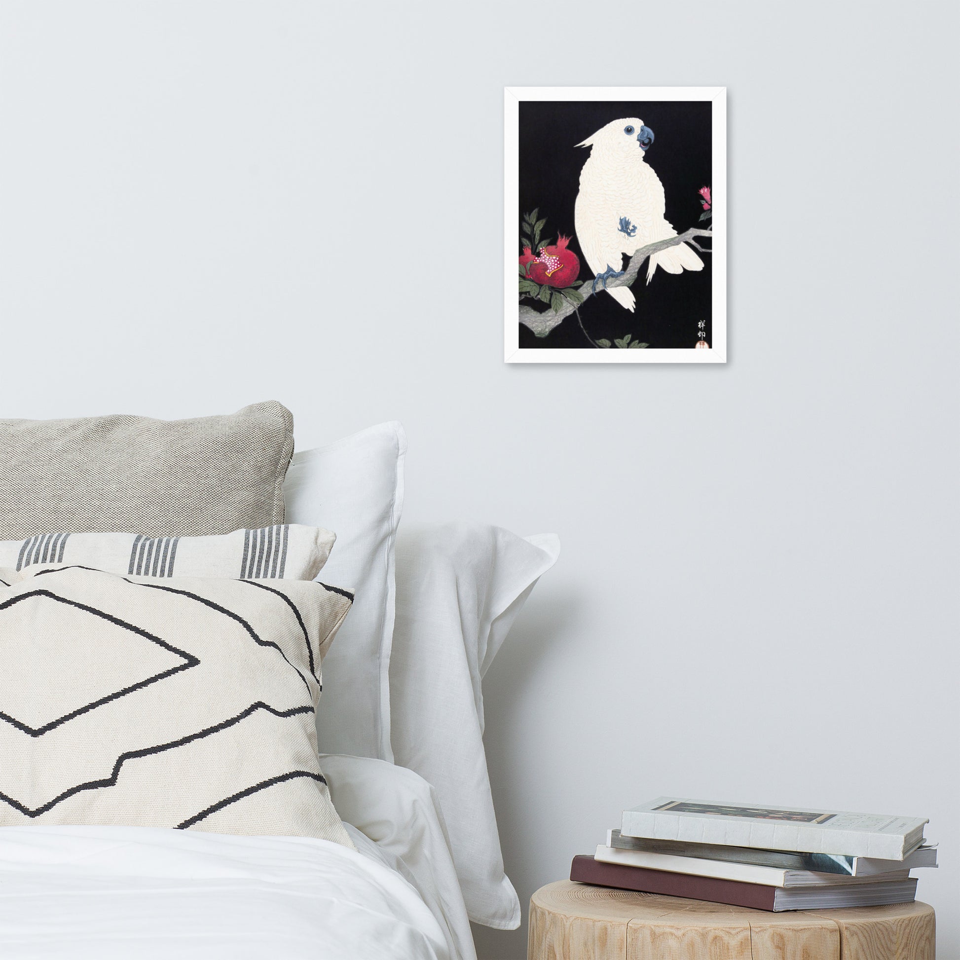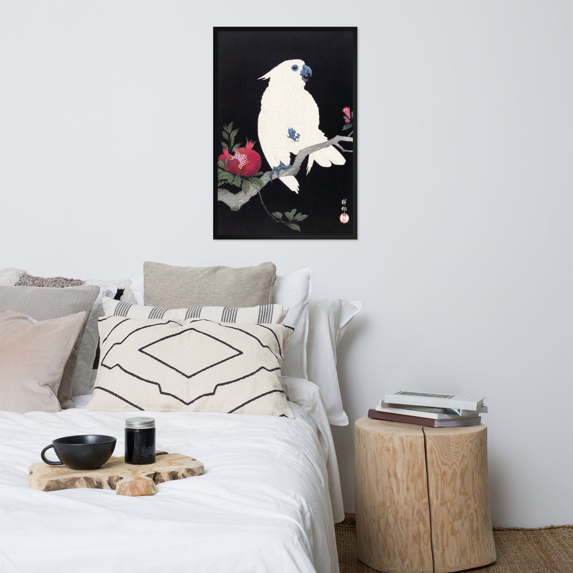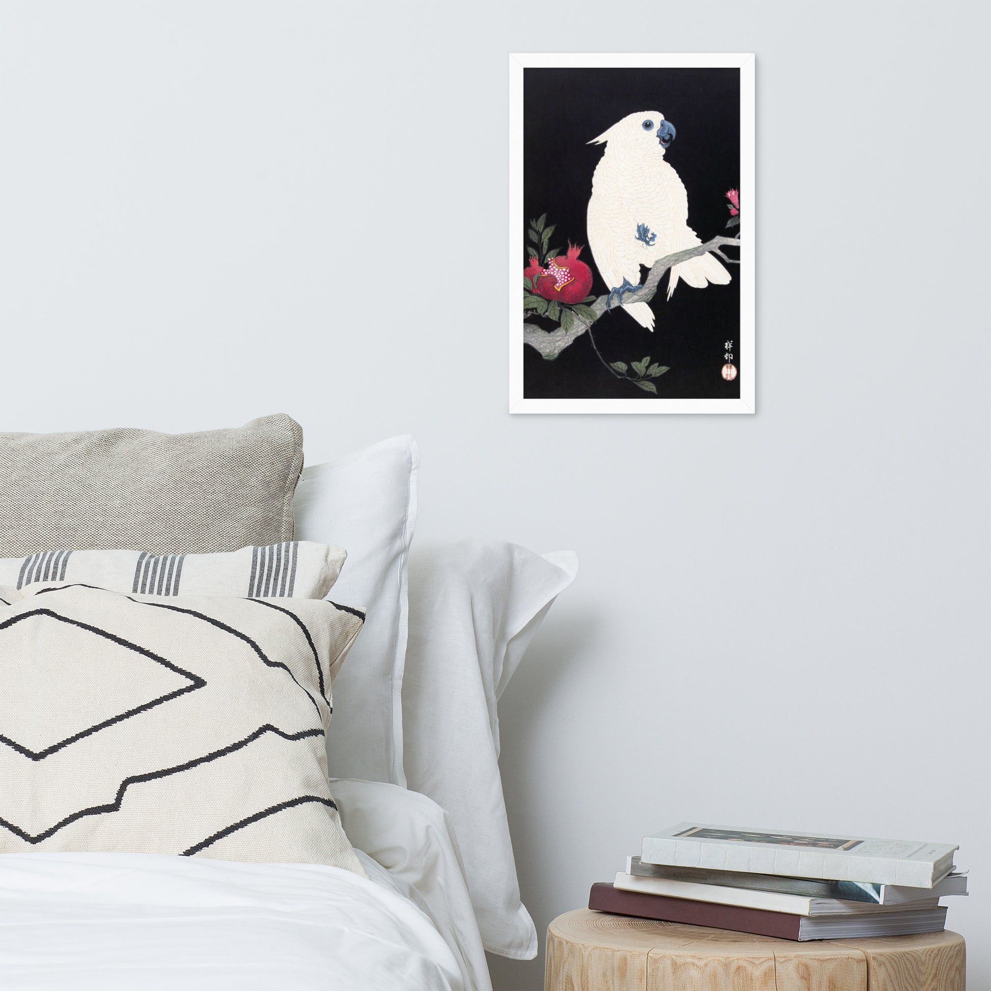 Bring bold elegance and natural symbolism into your space with Cockatoo and Pomegranate by Ohara Koson, a vivid composition from the tradition of Japanese Woodblock Prints (Ukiyo-e). This framed artwork features a white cockatoo perched gracefully on a flowering branch, its expressive crest and blue-tinted beak and feet rendered with delicate precision. A split-open pomegranate reveals its ruby seeds—an ancient symbol of abundance and vitality—while soft pink blossoms add a touch of seasonal charm.