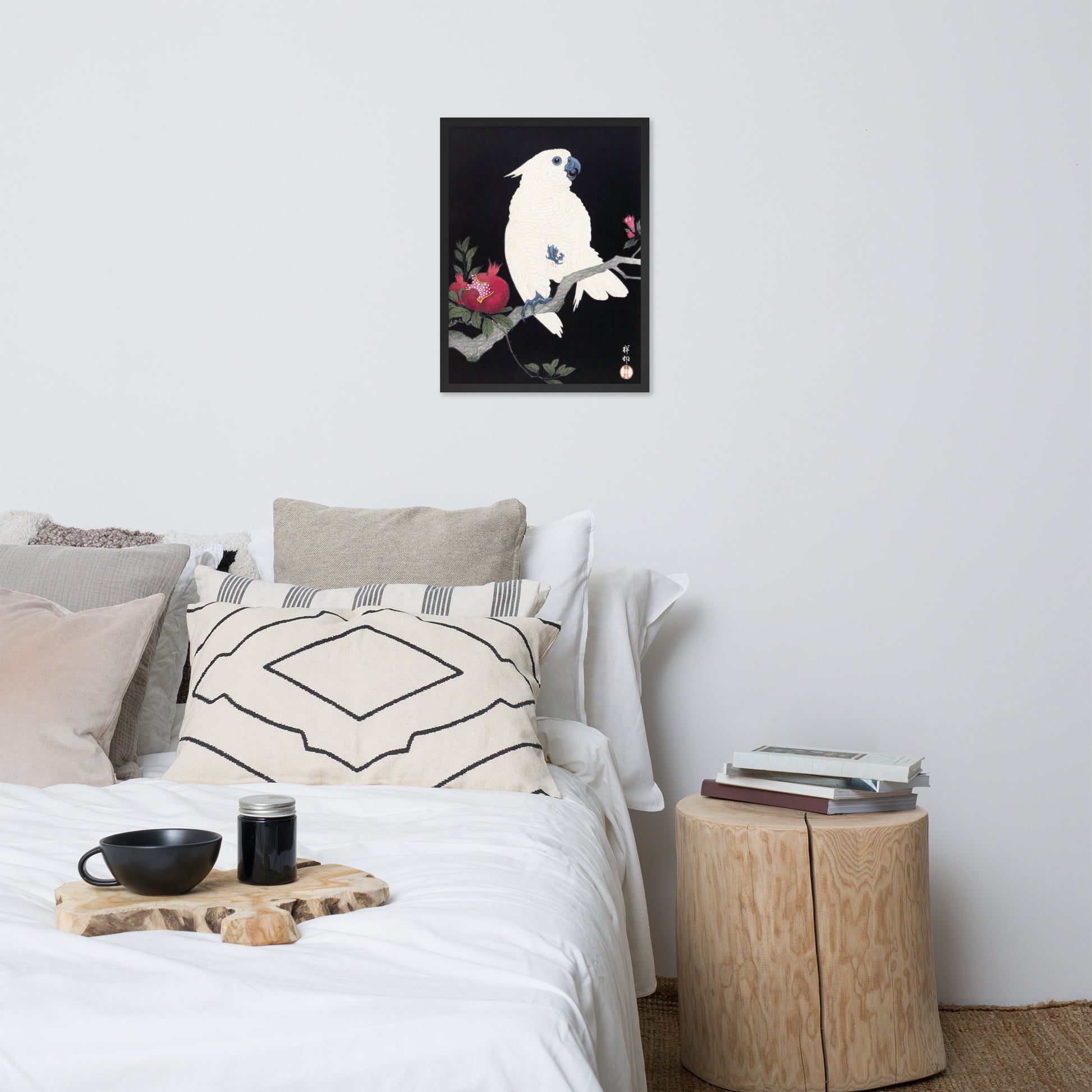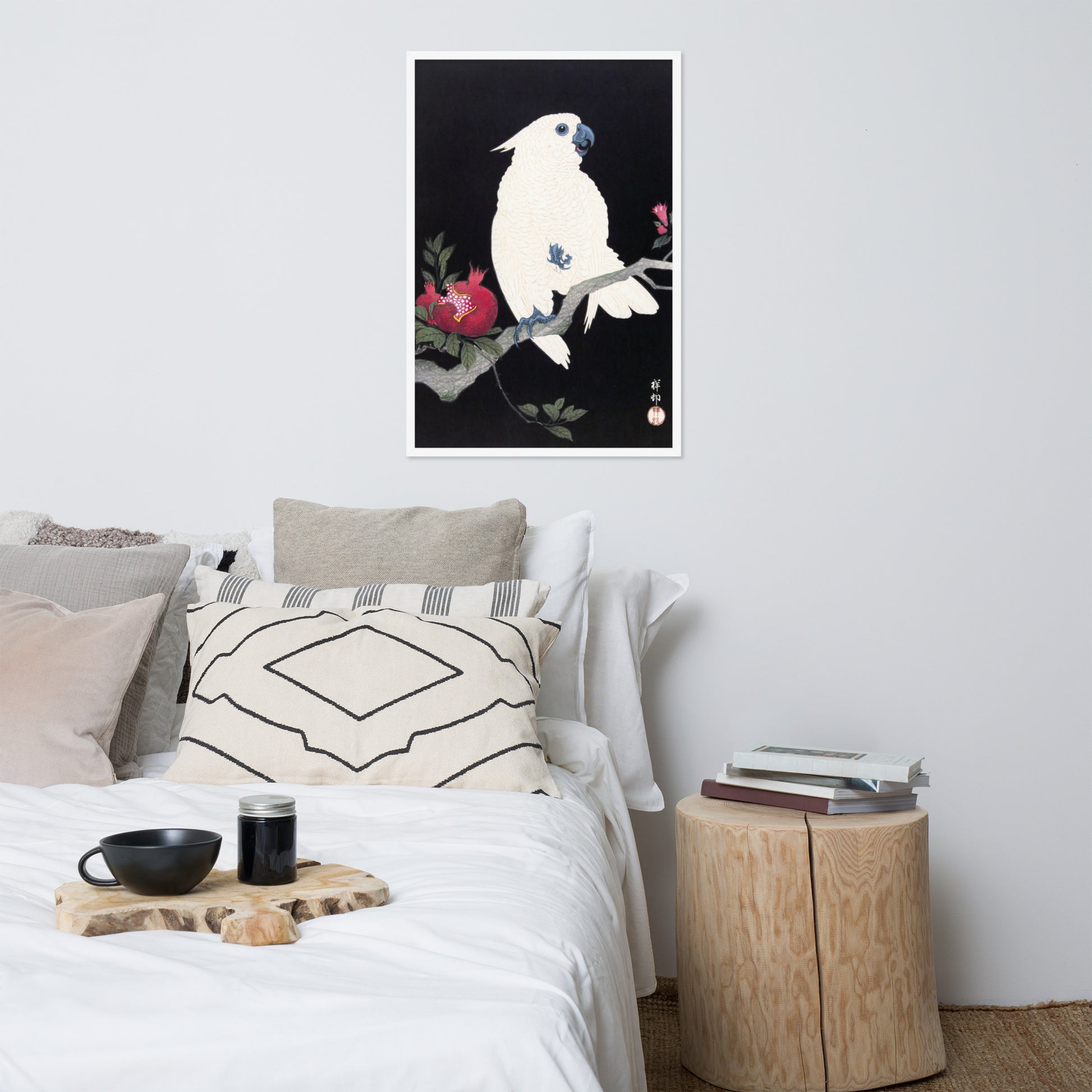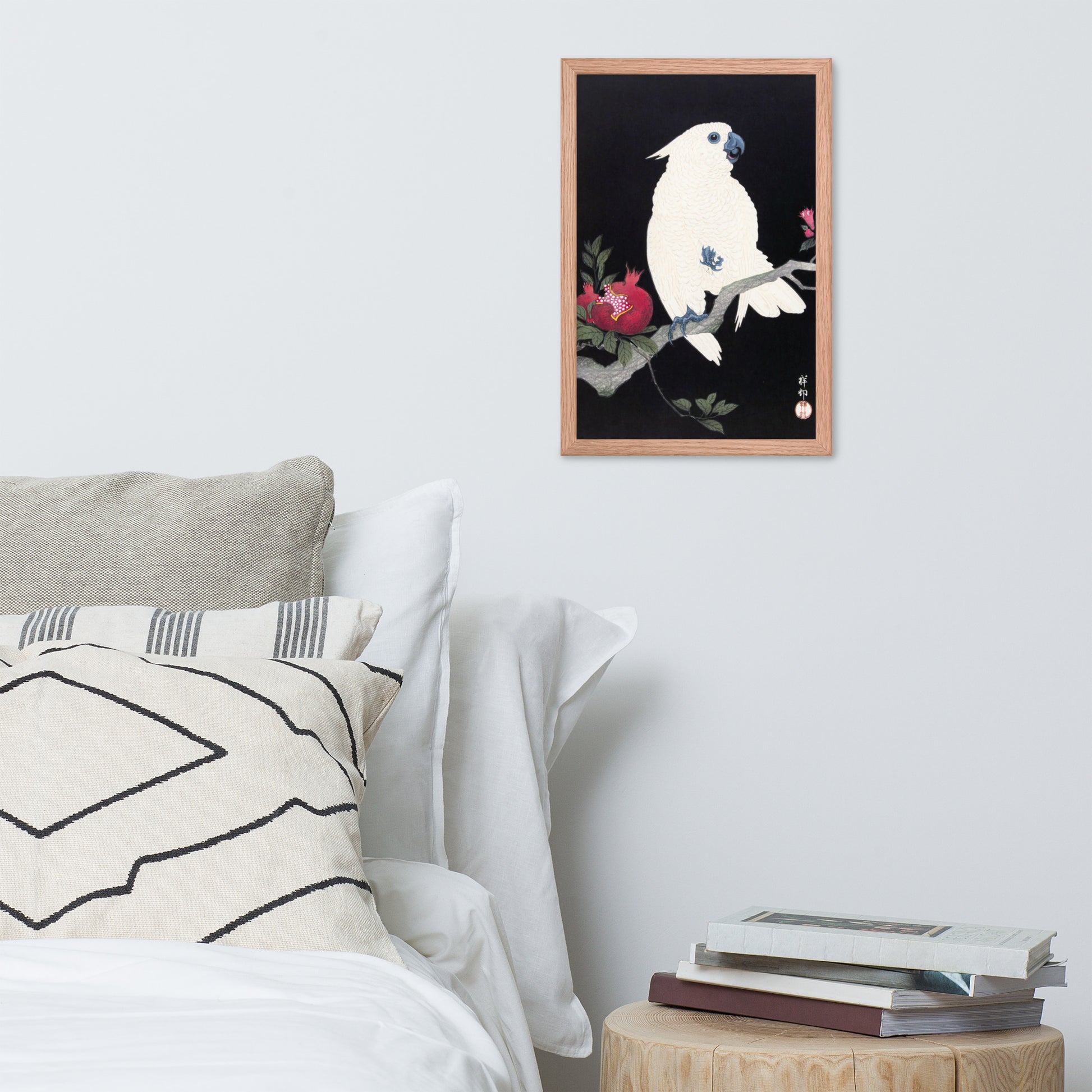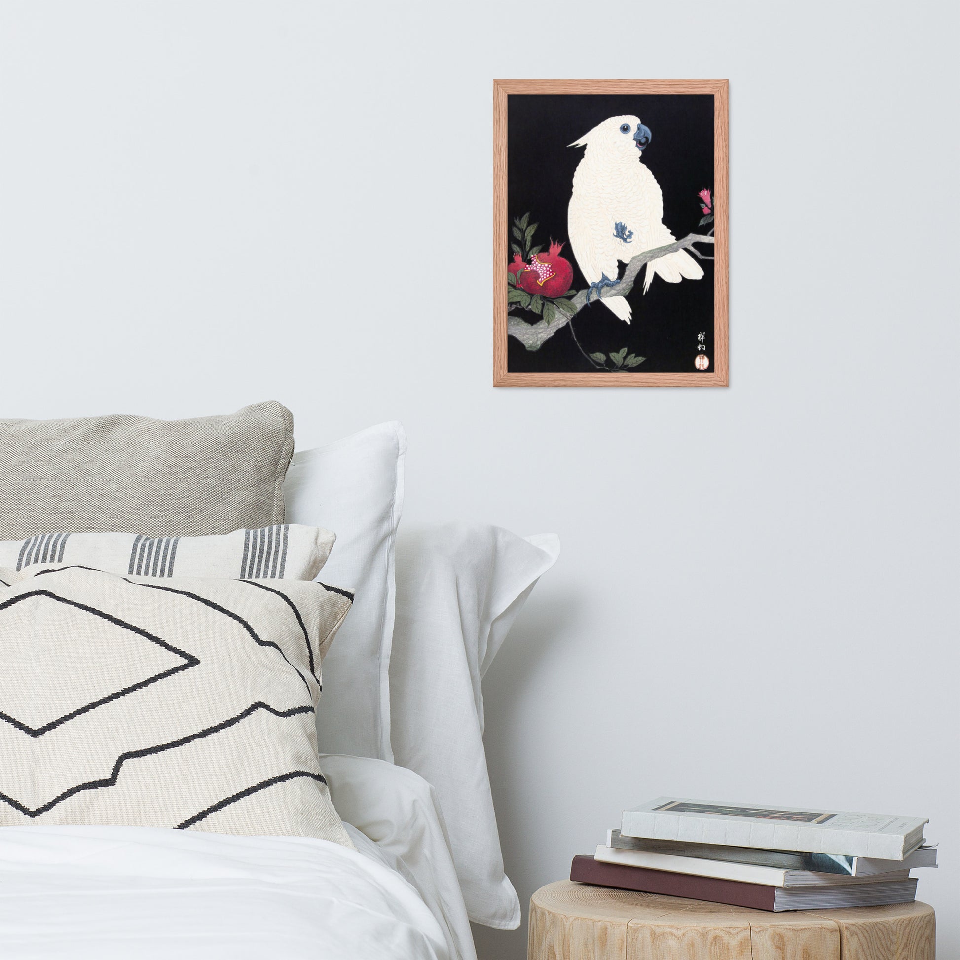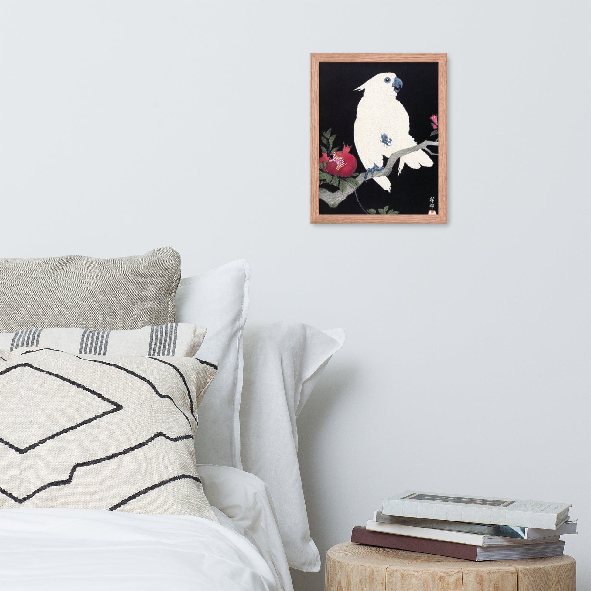 Bring bold elegance and natural symbolism into your space with Cockatoo and Pomegranate by Ohara Koson, a vivid composition from the tradition of Japanese Woodblock Prints (Ukiyo-e). This framed artwork features a white cockatoo perched gracefully on a flowering branch, its expressive crest and blue-tinted beak and feet rendered with delicate precision. A split-open pomegranate reveals its ruby seeds—an ancient symbol of abundance and vitality—while soft pink blossoms add a touch of seasonal charm.