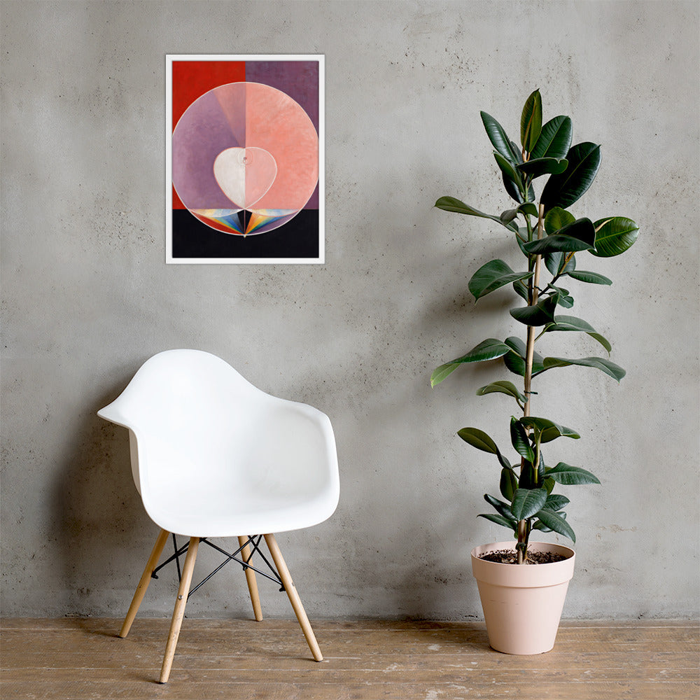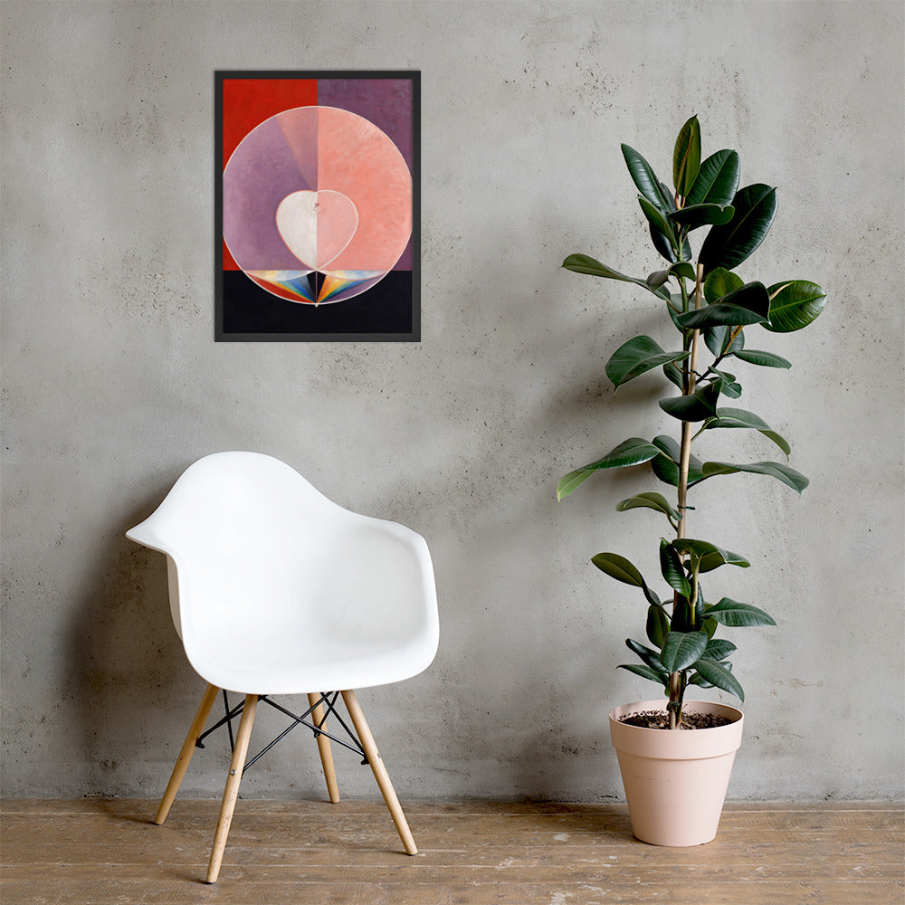 Bring home a striking piece of spiritual abstraction with Dove No. 2 by Hilma af Klint—an iconic work from one of the earliest pioneers of modern abstract art. This framed wall print features a bold geometric composition divided into vibrant quadrants of red, purple, and black, anchored by a radiant circular motif and a heart-like form at its center. Below, a symmetrical rainbow triangle adds a sense of harmony and transcendence.