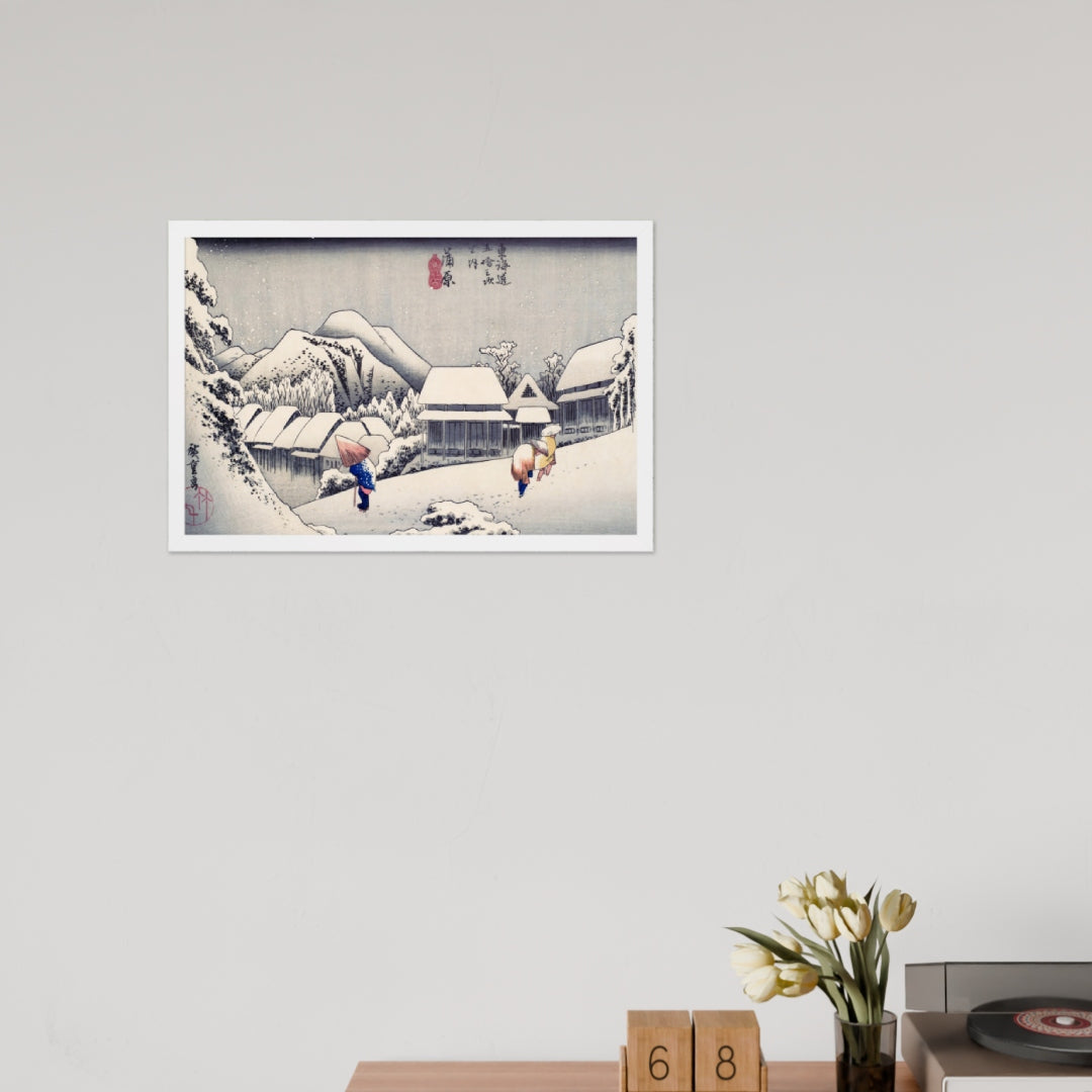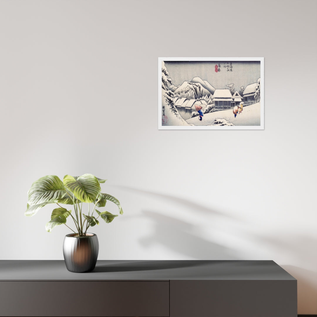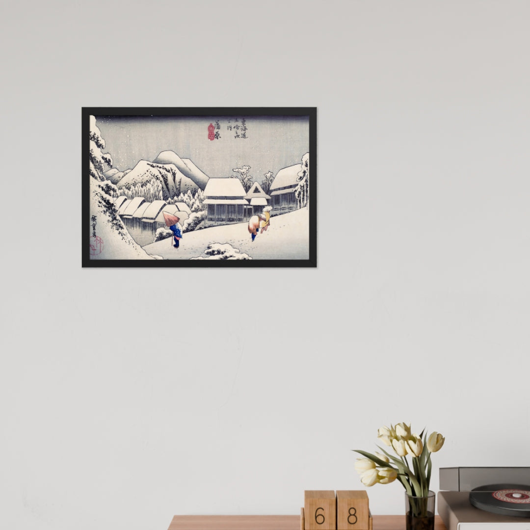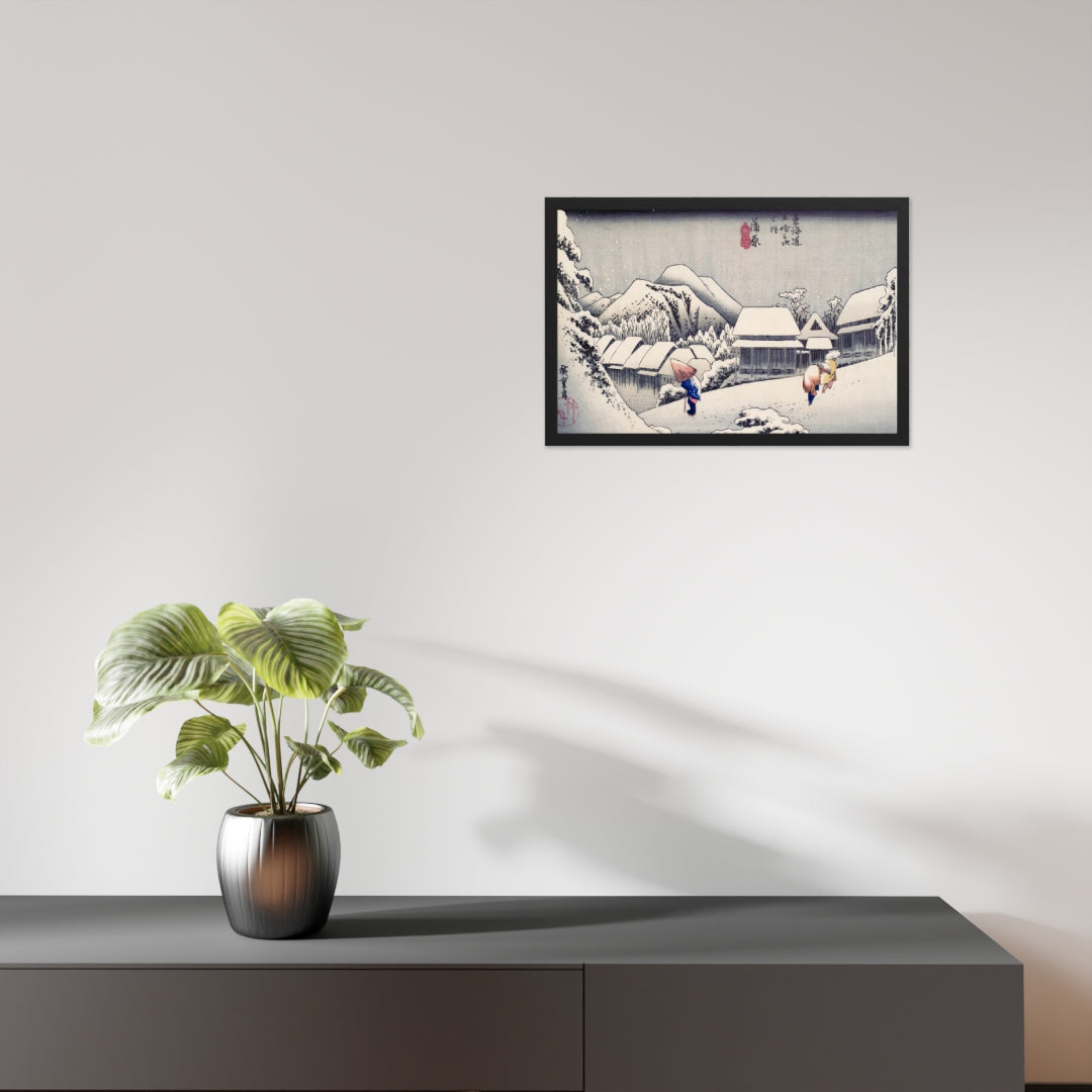 Experience the quiet poetry of winter through Evening Snow at Kanbara by Utagawa Hiroshige—an evocative piece from the celebrated tradition of Japanese Woodblock Prints (Ukiyo-e). This framed wall art captures a snow-laden village nestled in the mountains, where three figures walk solemnly beneath umbrellas, their footprints trailing through a soft blanket of snow. Hiroshige’s masterful use of negative space and gentle gradients conveys not just a landscape, but a mood: peaceful, introspective, and timeless.