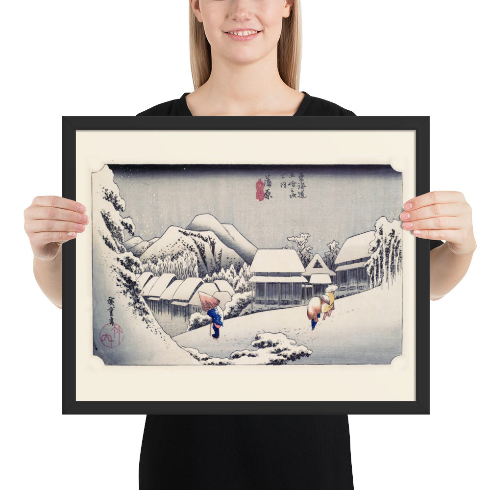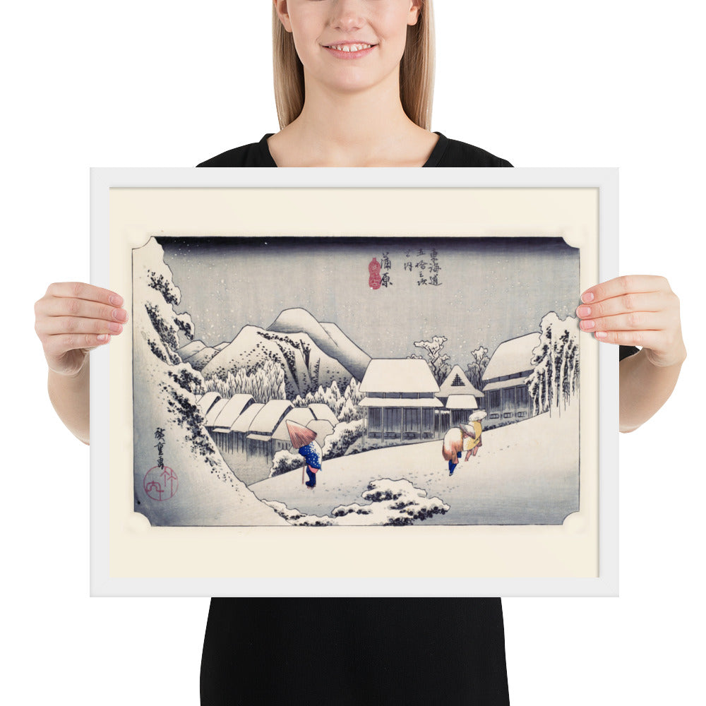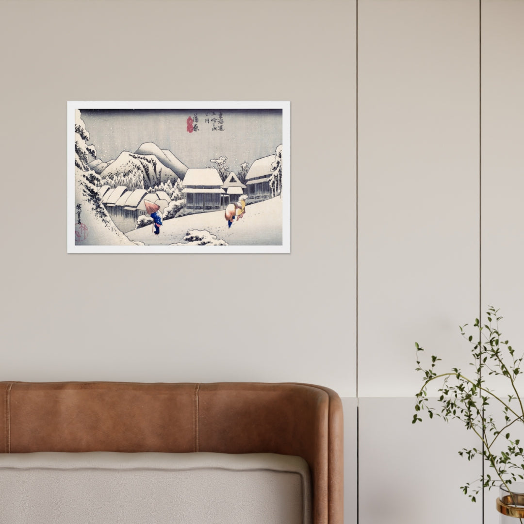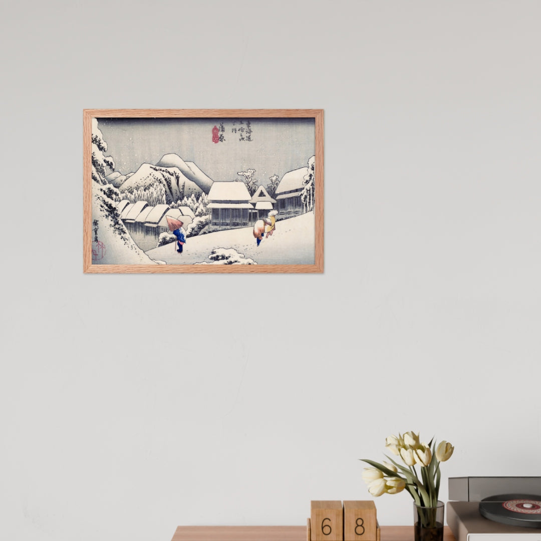 Experience the quiet poetry of winter through Evening Snow at Kanbara by Utagawa Hiroshige—an evocative piece from the celebrated tradition of Japanese Woodblock Prints (Ukiyo-e). This framed wall art captures a snow-laden village nestled in the mountains, where three figures walk solemnly beneath umbrellas, their footprints trailing through a soft blanket of snow. Hiroshige’s masterful use of negative space and gentle gradients conveys not just a landscape, but a mood: peaceful, introspective, and timeless.