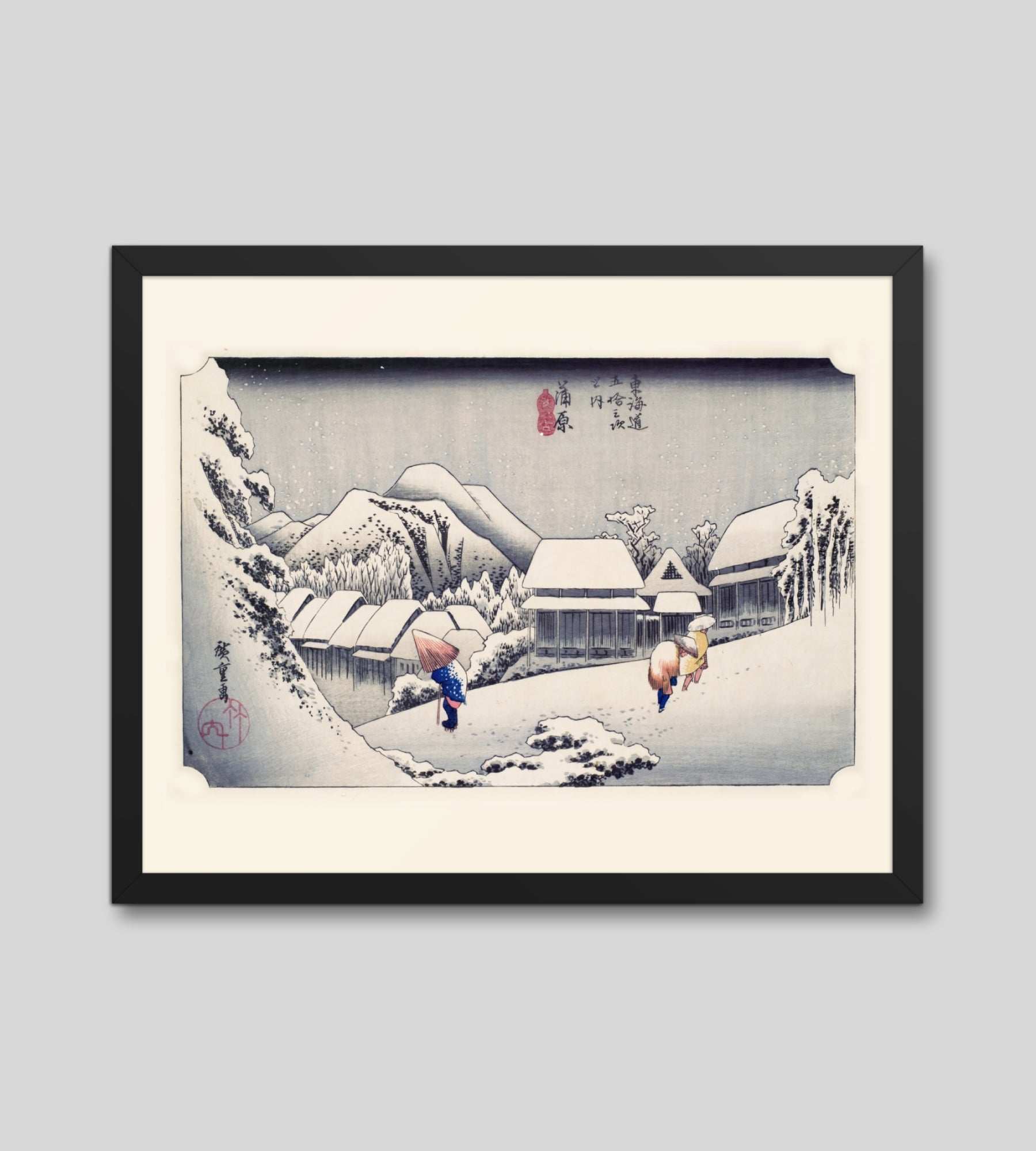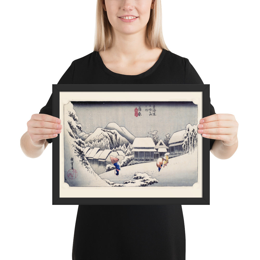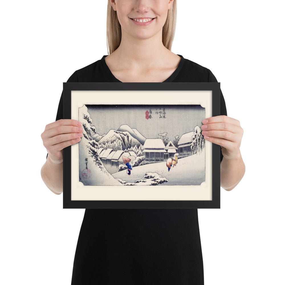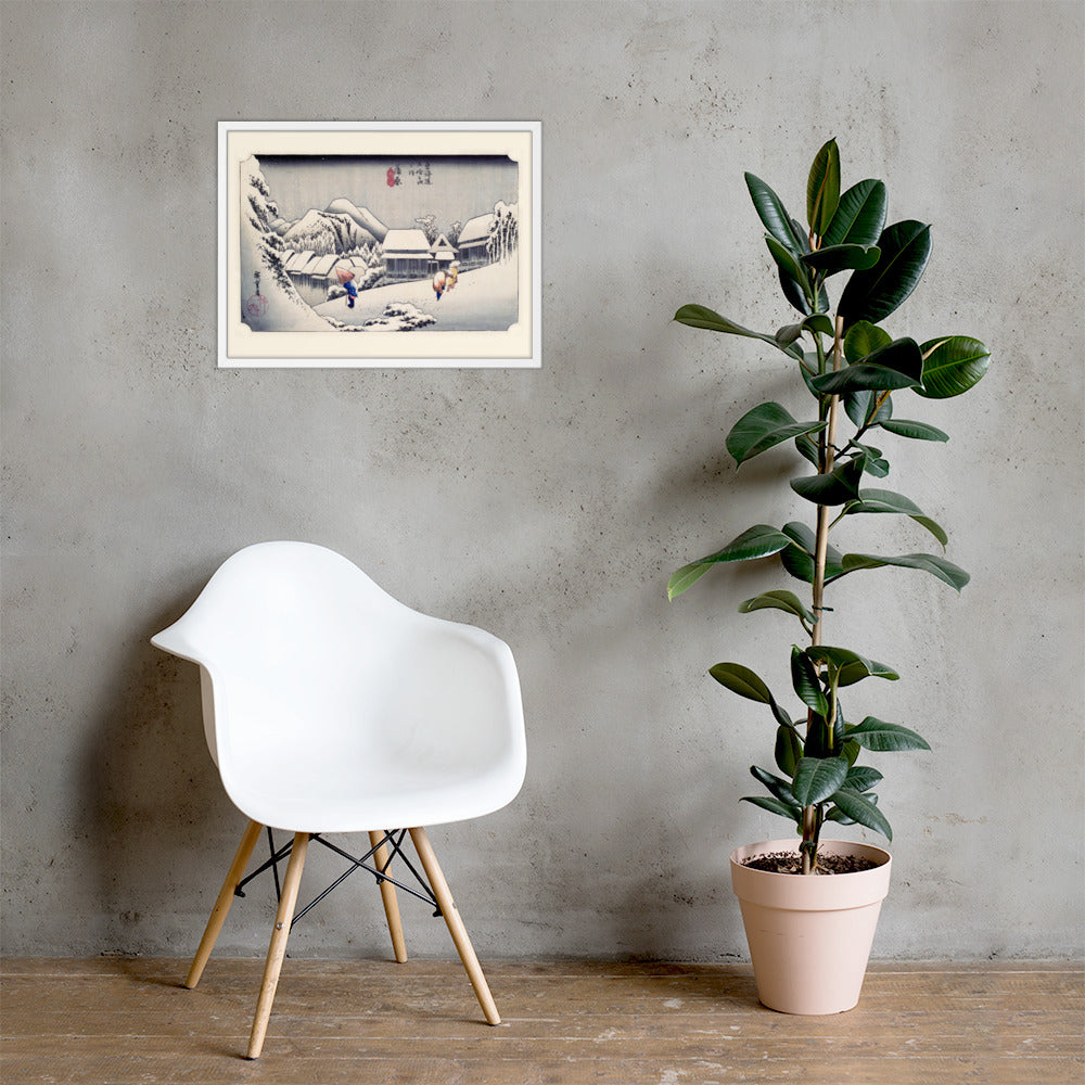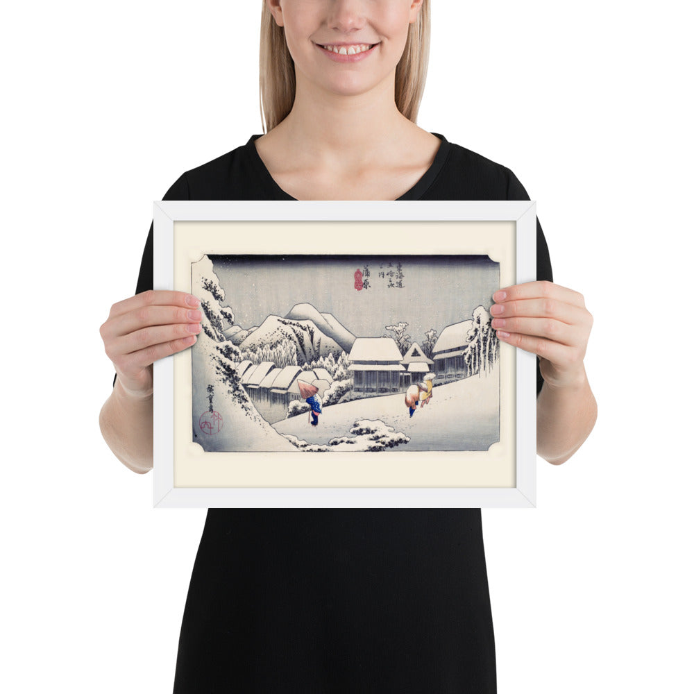 Experience the quiet poetry of winter through Evening Snow at Kanbara by Utagawa Hiroshige—an evocative piece from the celebrated tradition of Japanese Woodblock Prints (Ukiyo-e). This framed wall art captures a snow-laden village nestled in the mountains, where three figures walk solemnly beneath umbrellas, their footprints trailing through a soft blanket of snow. Hiroshige’s masterful use of negative space and gentle gradients conveys not just a landscape, but a mood: peaceful, introspective, and timeless.