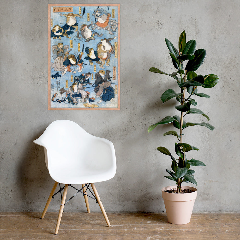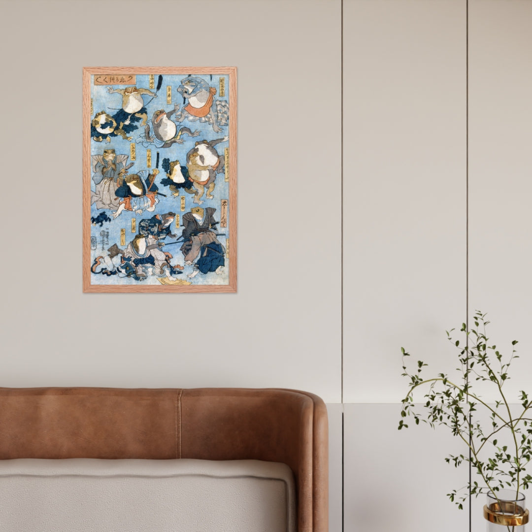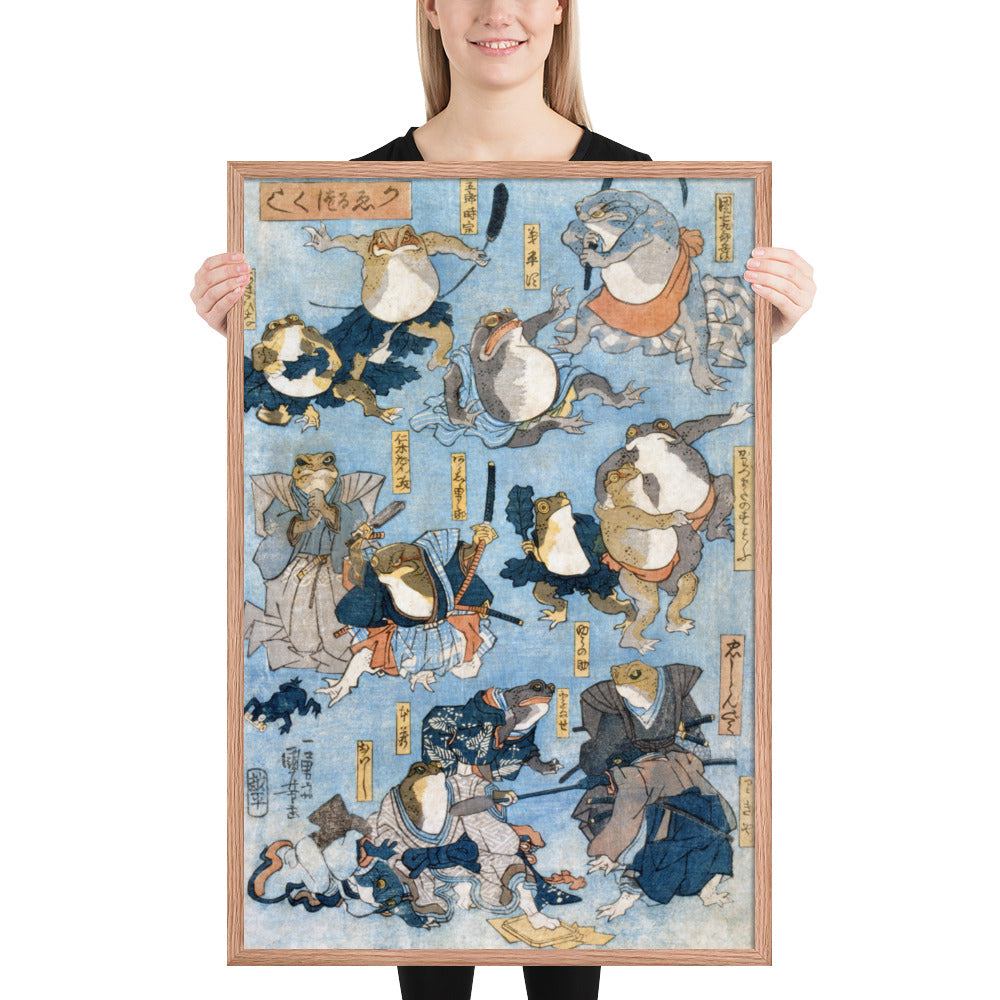 Step into a world of whimsy and theatrical flair with Famous Heroes of the Kabuki Stage Played by Frogs by Utagawa Kuniyoshi—a playful yet masterfully composed piece from the tradition of Japanese Woodblock Prints (Ukiyo-e). This framed wall print reimagines legendary kabuki actors as anthropomorphic frogs, each dressed in elaborate traditional attire and captured mid-performance in dynamic, expressive poses.