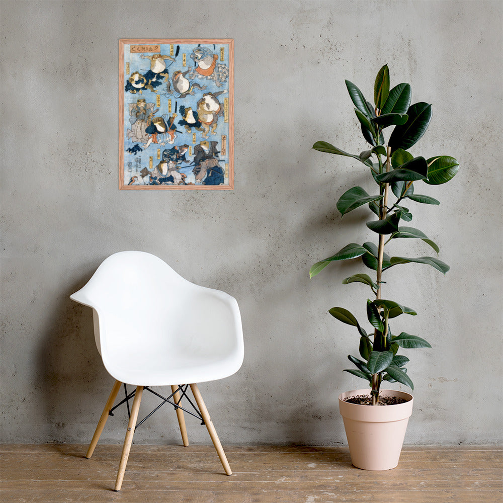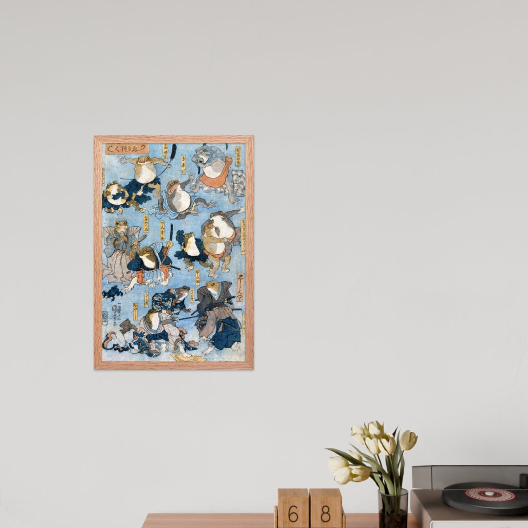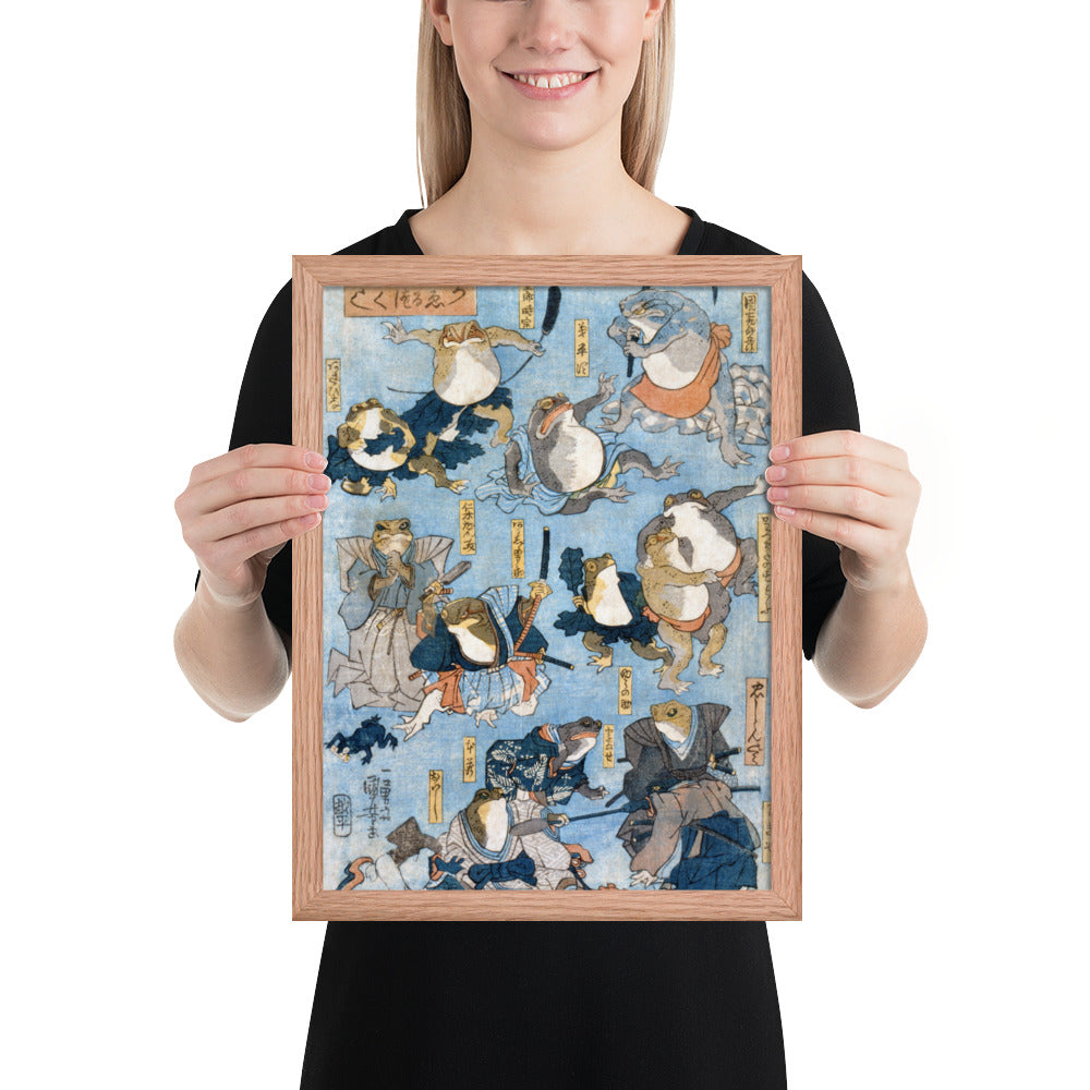 Step into a world of whimsy and theatrical flair with Famous Heroes of the Kabuki Stage Played by Frogs by Utagawa Kuniyoshi—a playful yet masterfully composed piece from the tradition of Japanese Woodblock Prints (Ukiyo-e). This framed wall print reimagines legendary kabuki actors as anthropomorphic frogs, each dressed in elaborate traditional attire and captured mid-performance in dynamic, expressive poses.