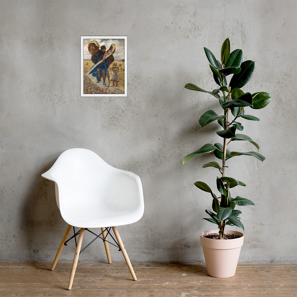 Following the Angel – Triptych (Central Part) by Jacek Malczewski is a masterful painting that intertwines symbolism, spirituality, and vivid realism. This work captures the timeless narrative of guidance and destiny, presenting an angelic figure alongside a child in a wheat field, embodying hope and protection.