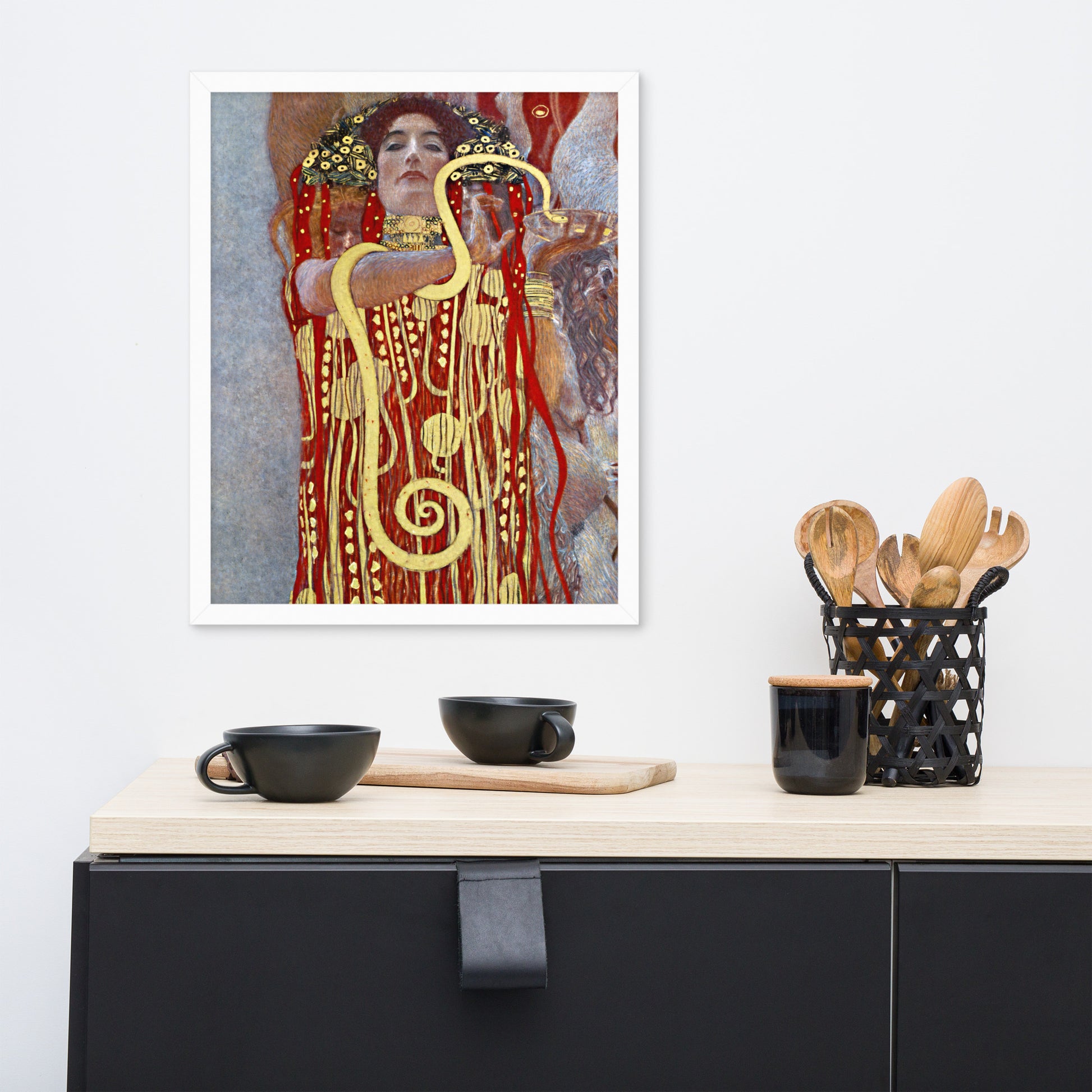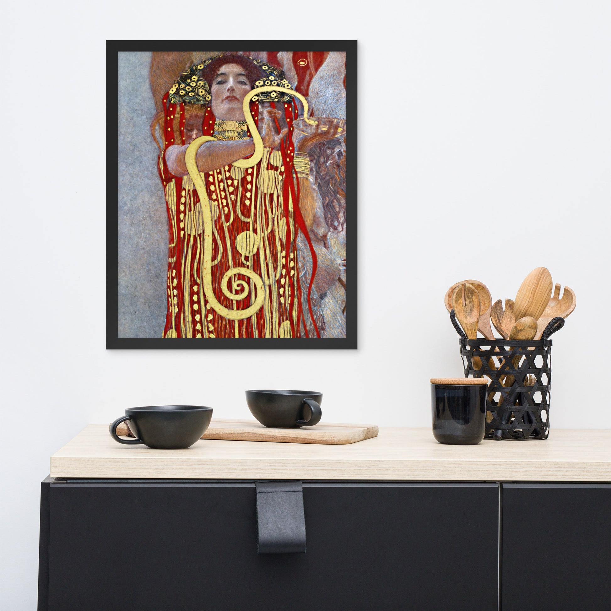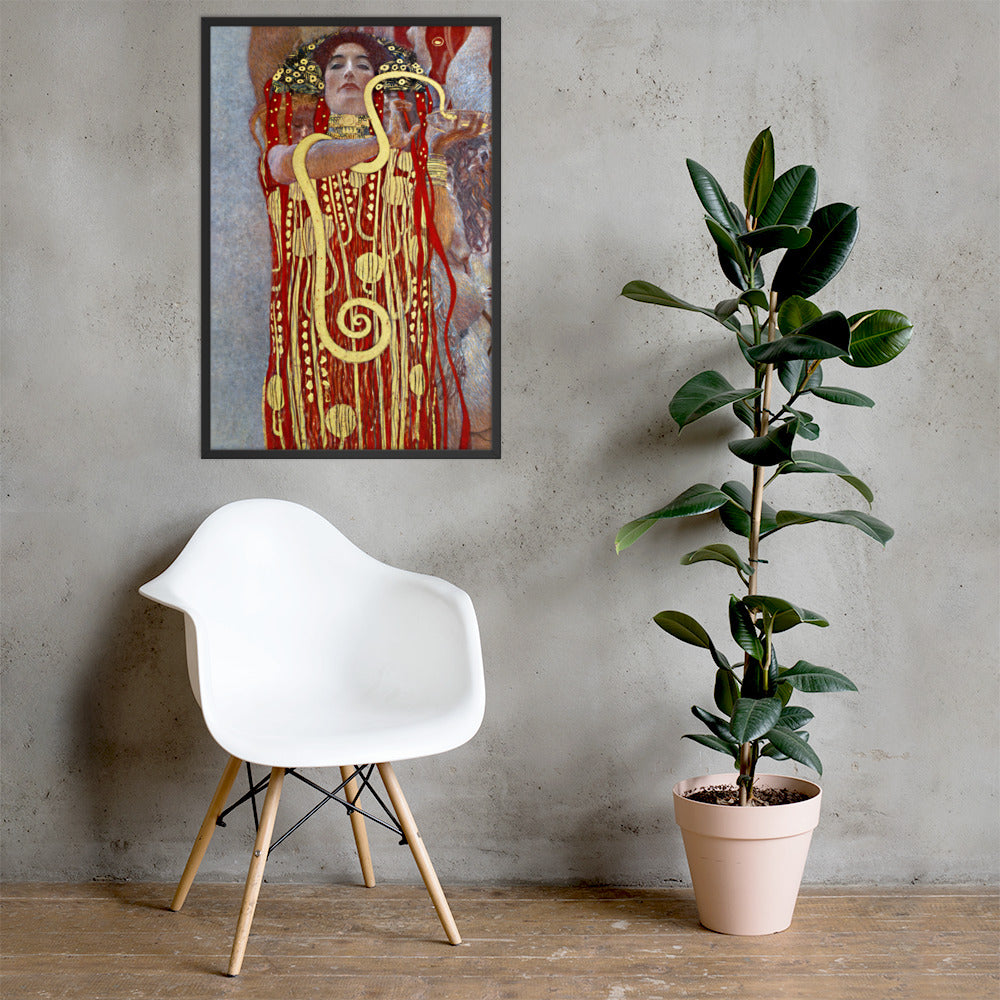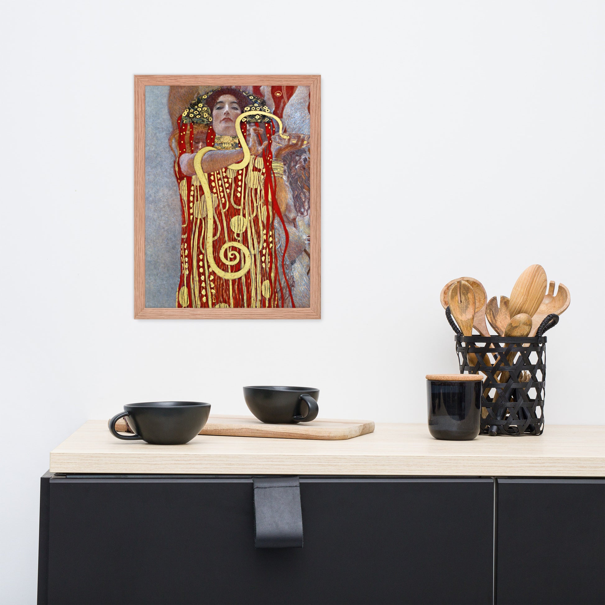 Elevate your space with Hygieia by Gustav Klimt, a striking Art Nouveau masterpiece that blends mysticism, femininity, and ornamental elegance. This framed wall print features the iconic figure of Hygieia—the Greek goddess of health—adorned in flowing red and gold robes, her arms raised in a gesture of power and grace. A golden serpent coils around her body, symbolizing healing and transformation, while circular and spiral motifs shimmer across her garments, echoing Klimt’s signature decorative style.