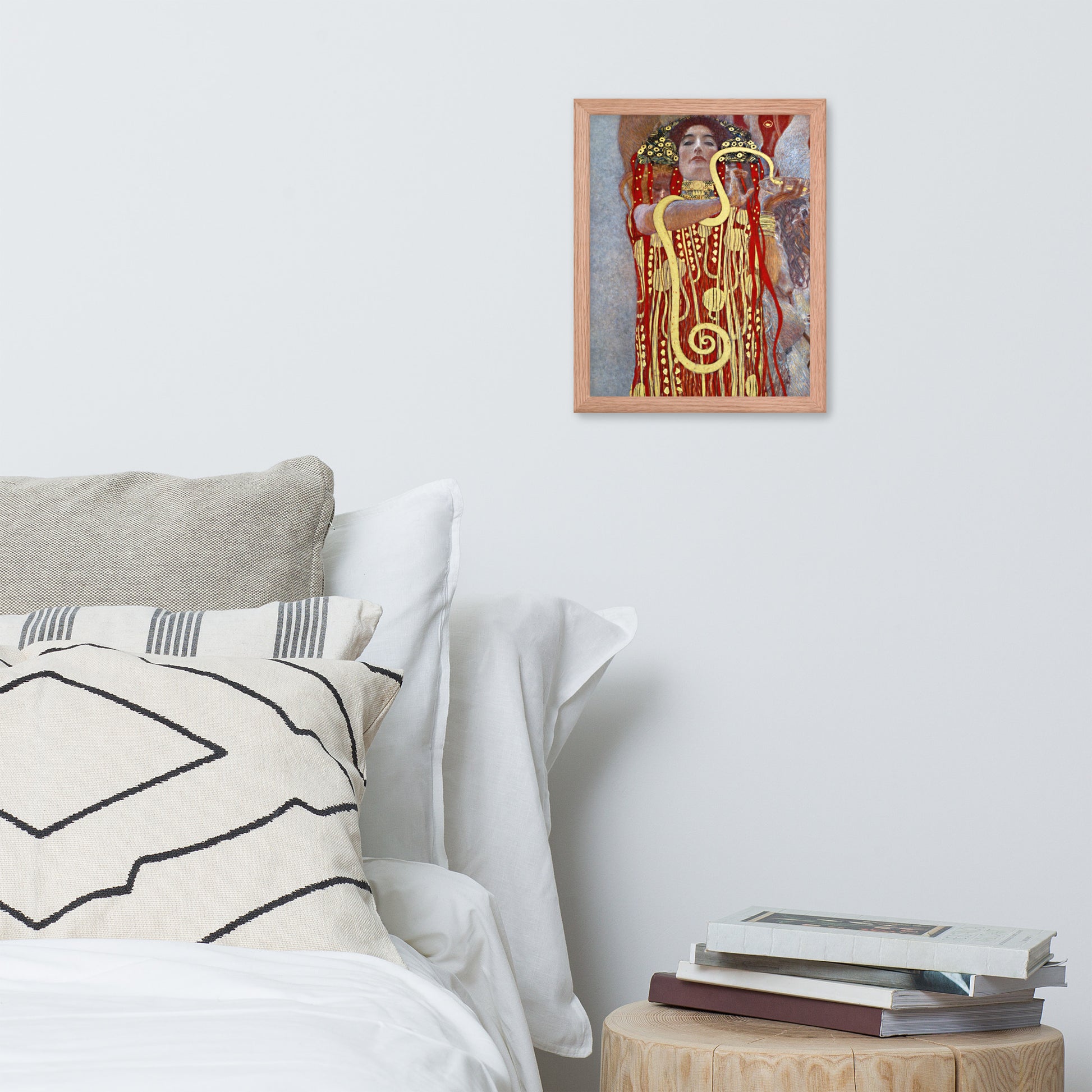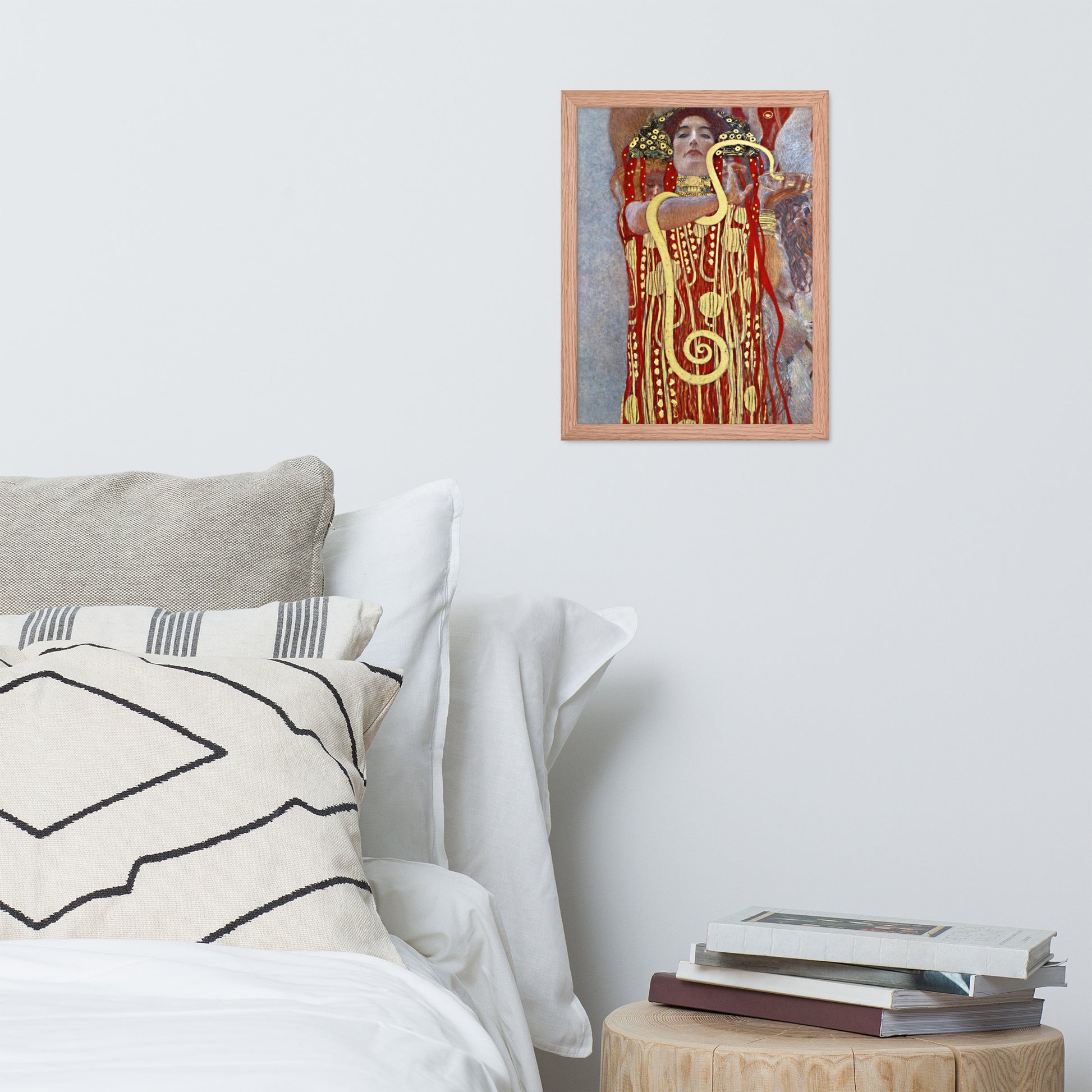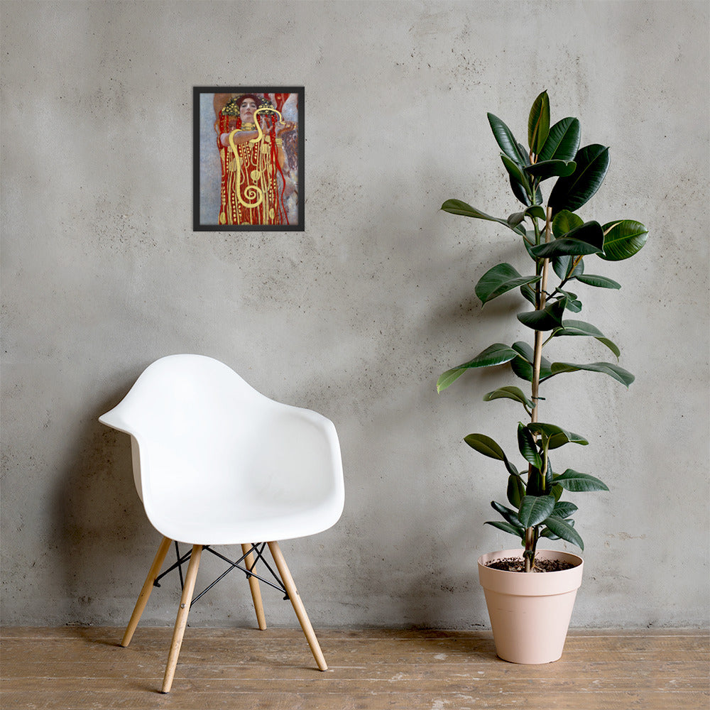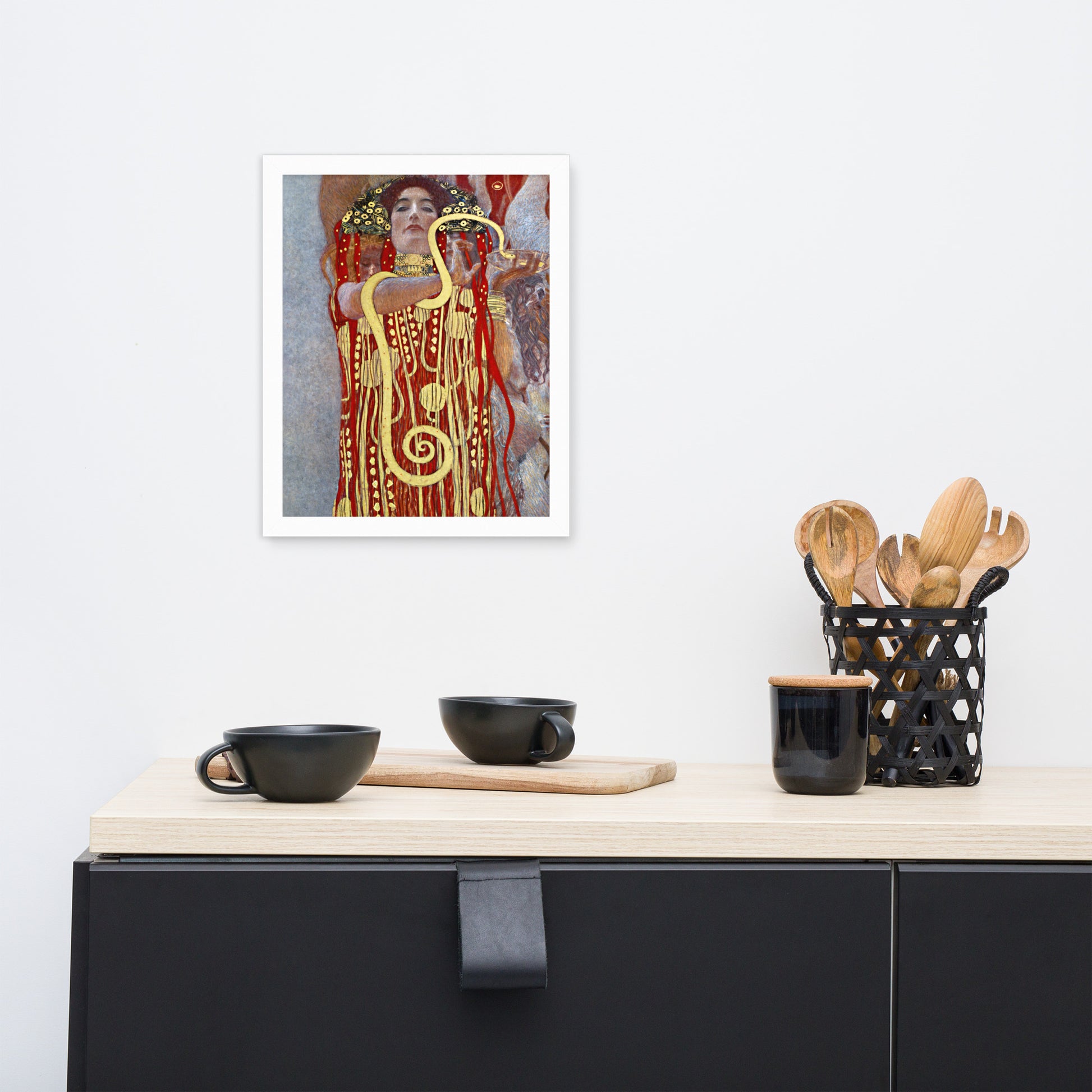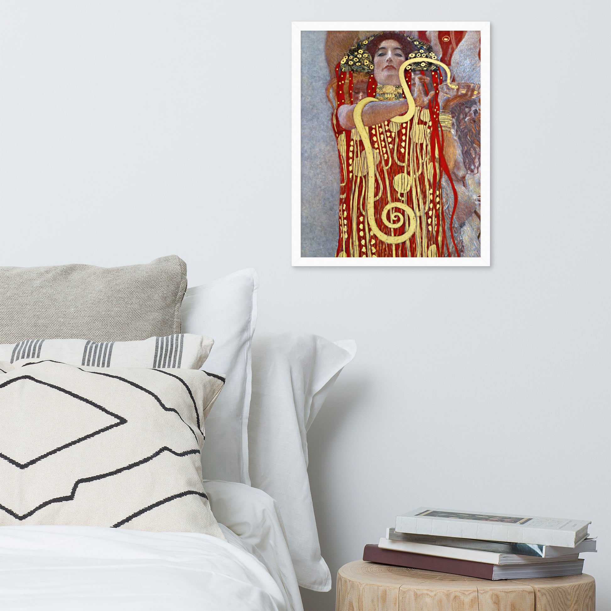 Elevate your space with Hygieia by Gustav Klimt, a striking Art Nouveau masterpiece that blends mysticism, femininity, and ornamental elegance. This framed wall print features the iconic figure of Hygieia—the Greek goddess of health—adorned in flowing red and gold robes, her arms raised in a gesture of power and grace. A golden serpent coils around her body, symbolizing healing and transformation, while circular and spiral motifs shimmer across her garments, echoing Klimt’s signature decorative style.