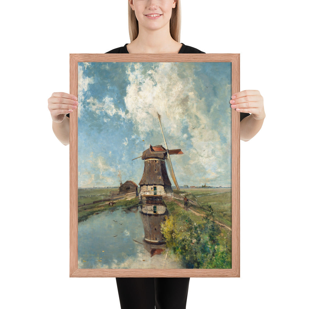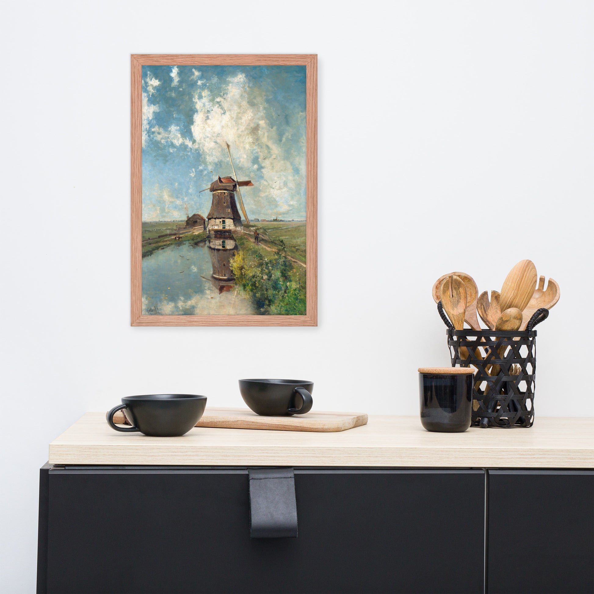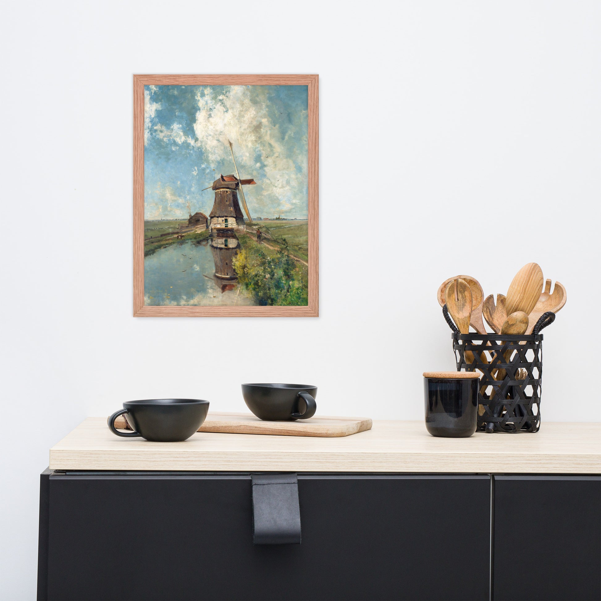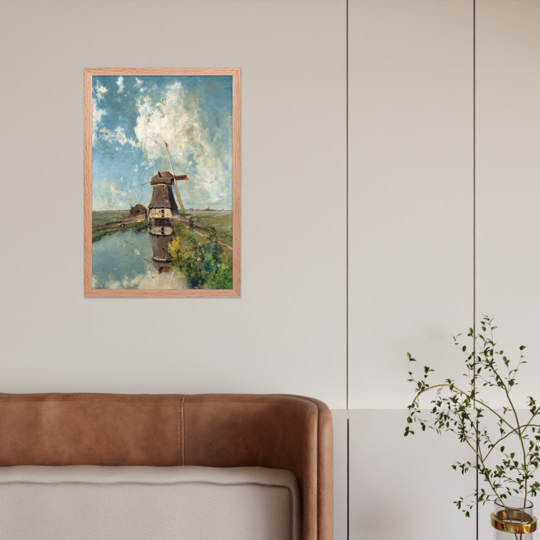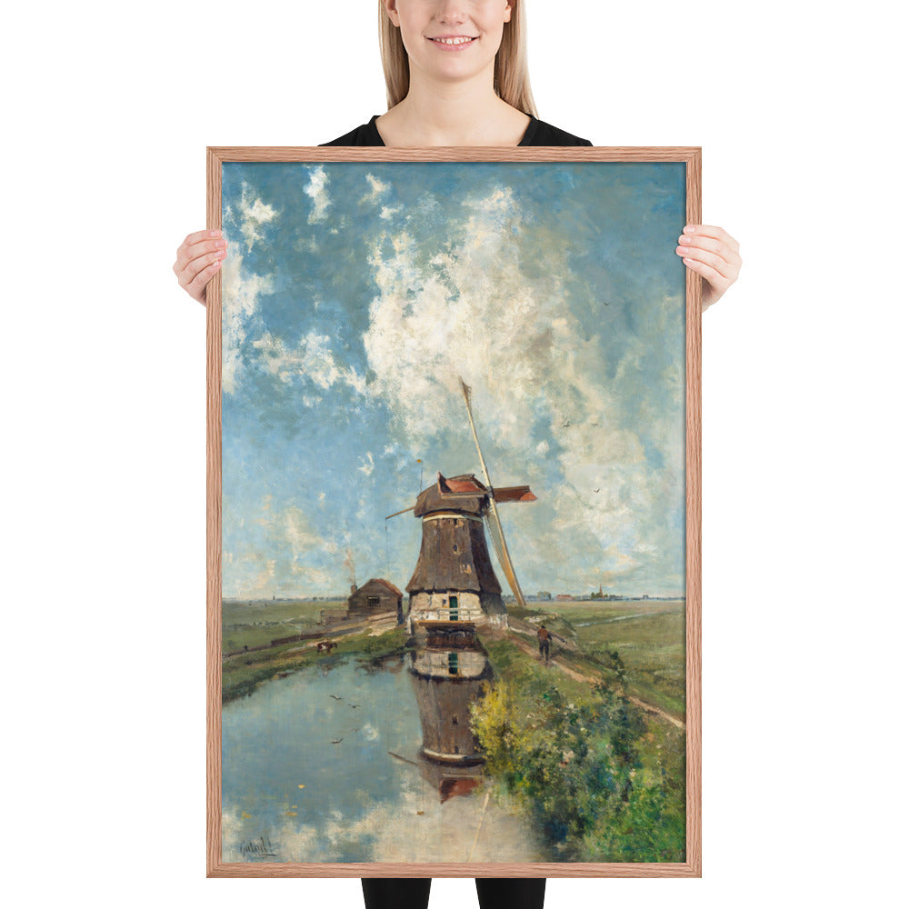 In the Month of July, by Paul Joseph Constantin Gabriël captures the quiet poetry of the Dutch countryside in midsummer. This framed wall print features a traditional windmill standing tall beside a tranquil canal, its reflection shimmering in the water below. A lone figure strolls along the grassy path, while soft clouds drift across a breezy sky—imbuing the scene with movement and serenity. The composition balances architectural charm with natural rhythm, making it a timeless piece for interiors that value warmth, heritage, and visual storytelling.