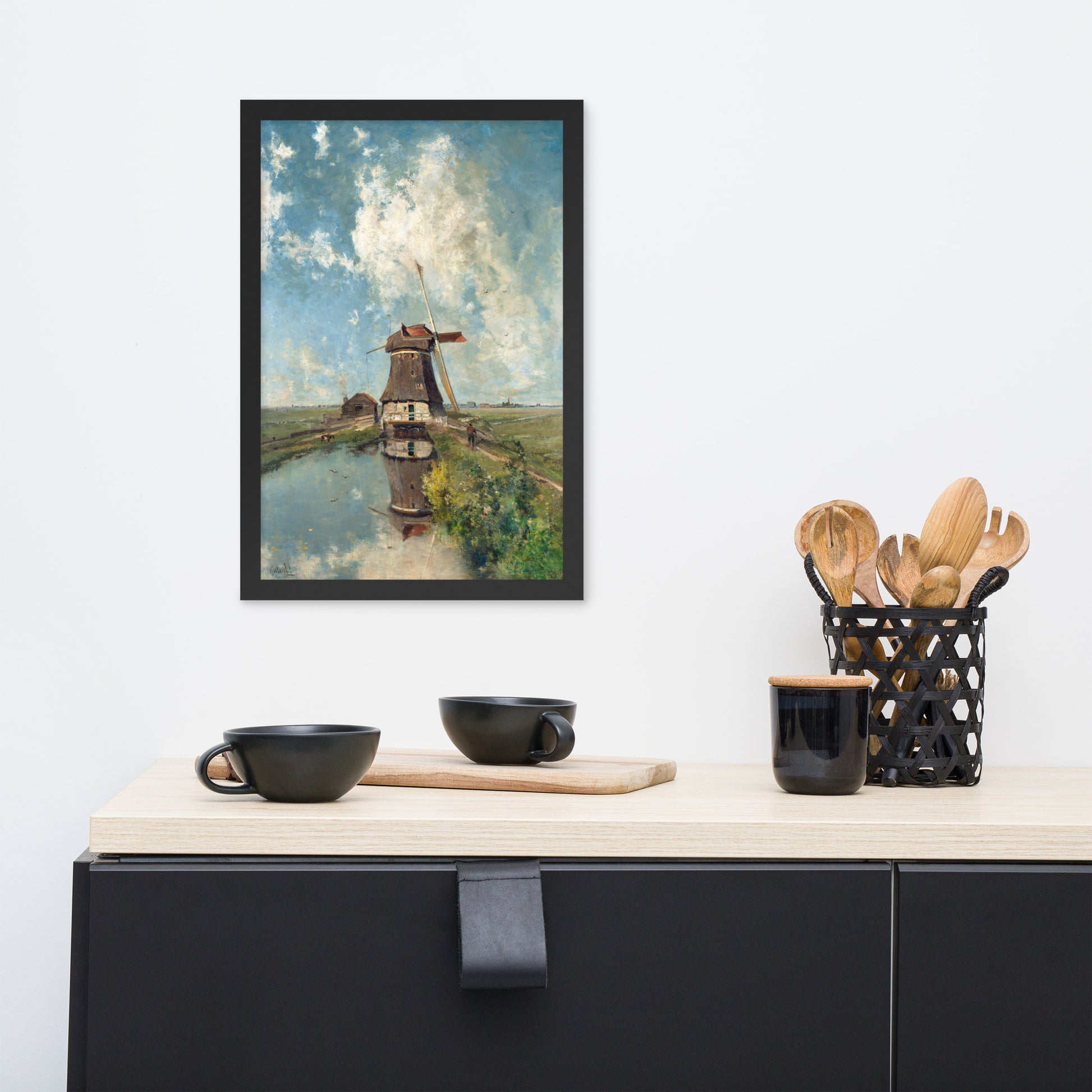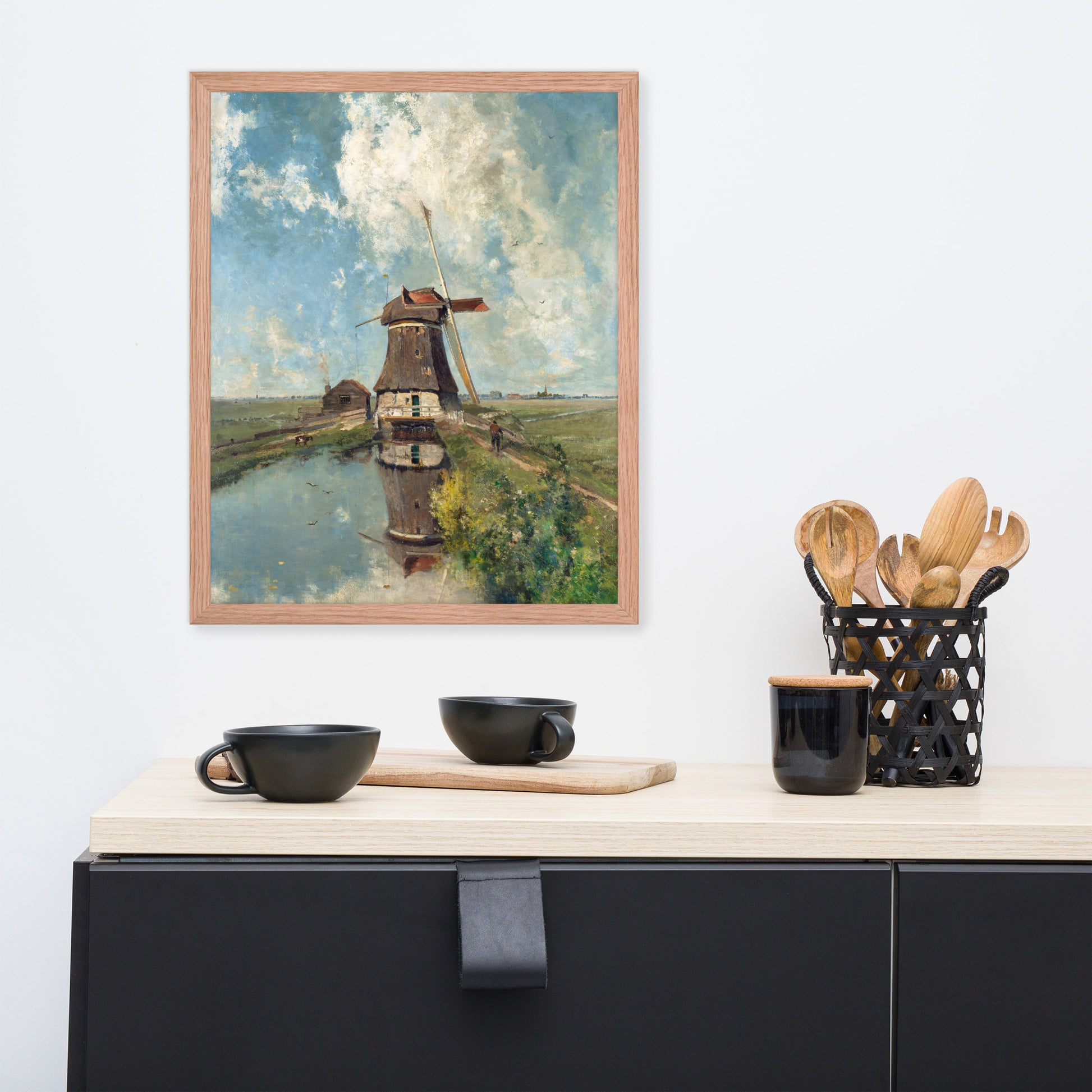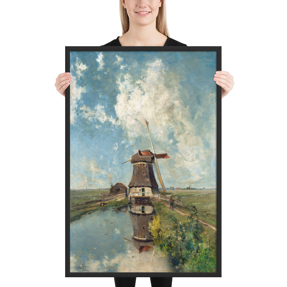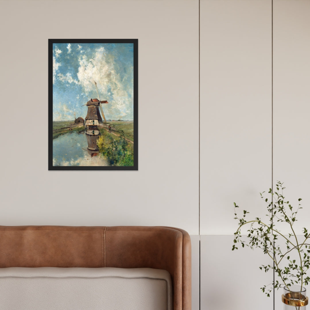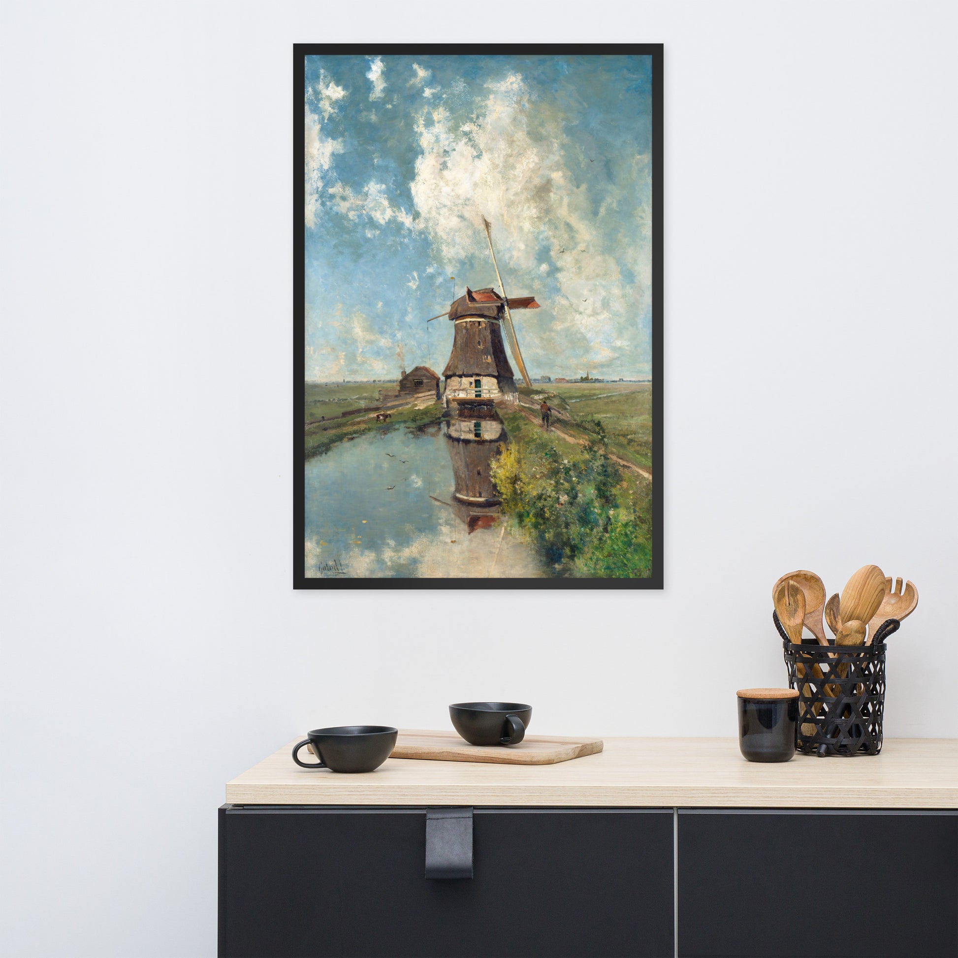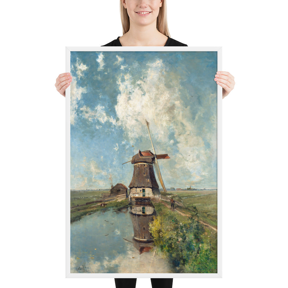 In the Month of July, by Paul Joseph Constantin Gabriël captures the quiet poetry of the Dutch countryside in midsummer. This framed wall print features a traditional windmill standing tall beside a tranquil canal, its reflection shimmering in the water below. A lone figure strolls along the grassy path, while soft clouds drift across a breezy sky—imbuing the scene with movement and serenity. The composition balances architectural charm with natural rhythm, making it a timeless piece for interiors that value warmth, heritage, and visual storytelling.