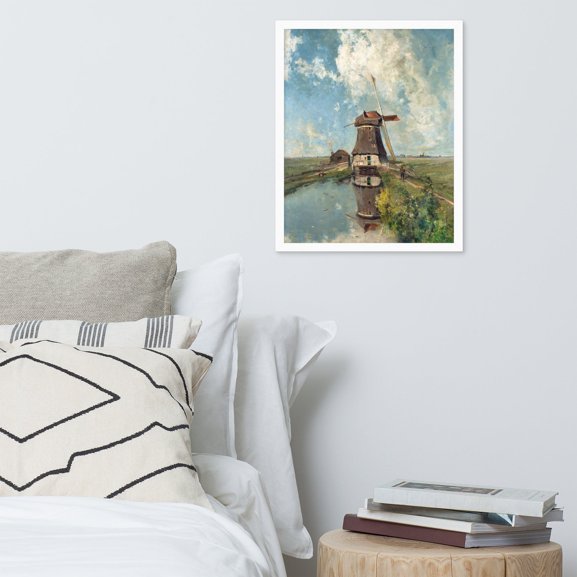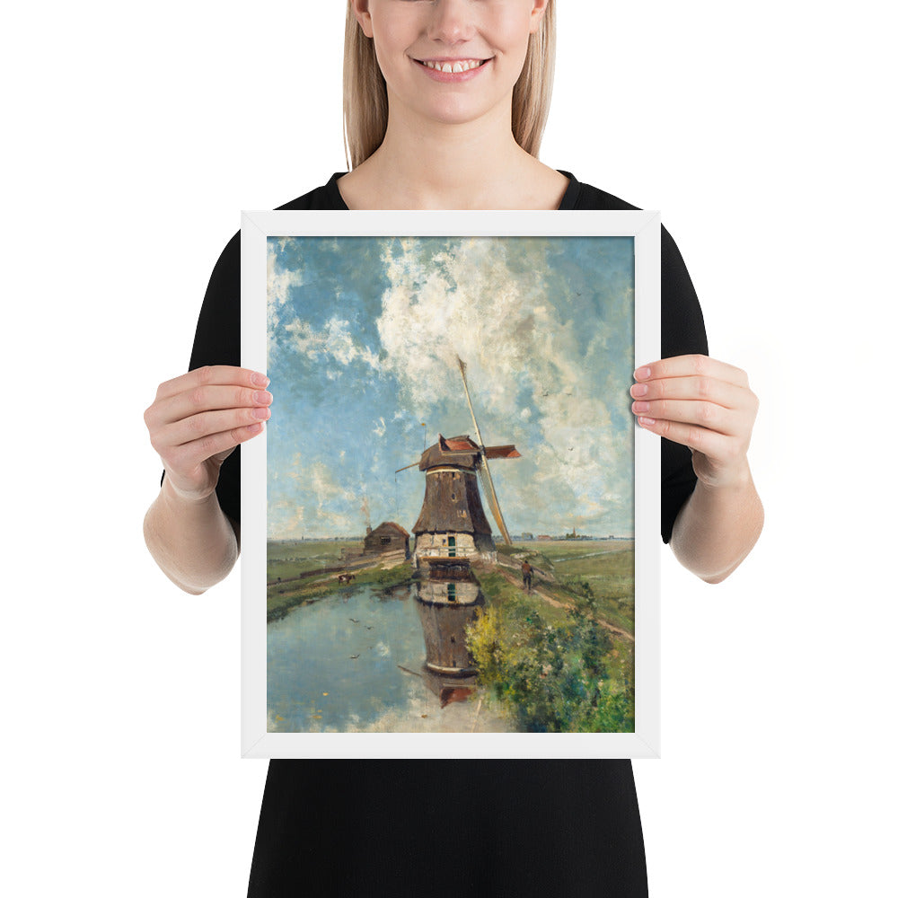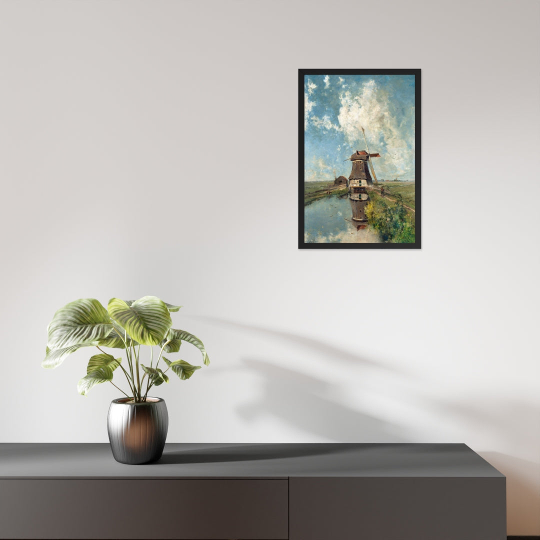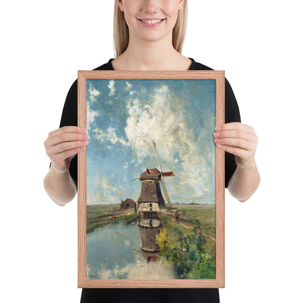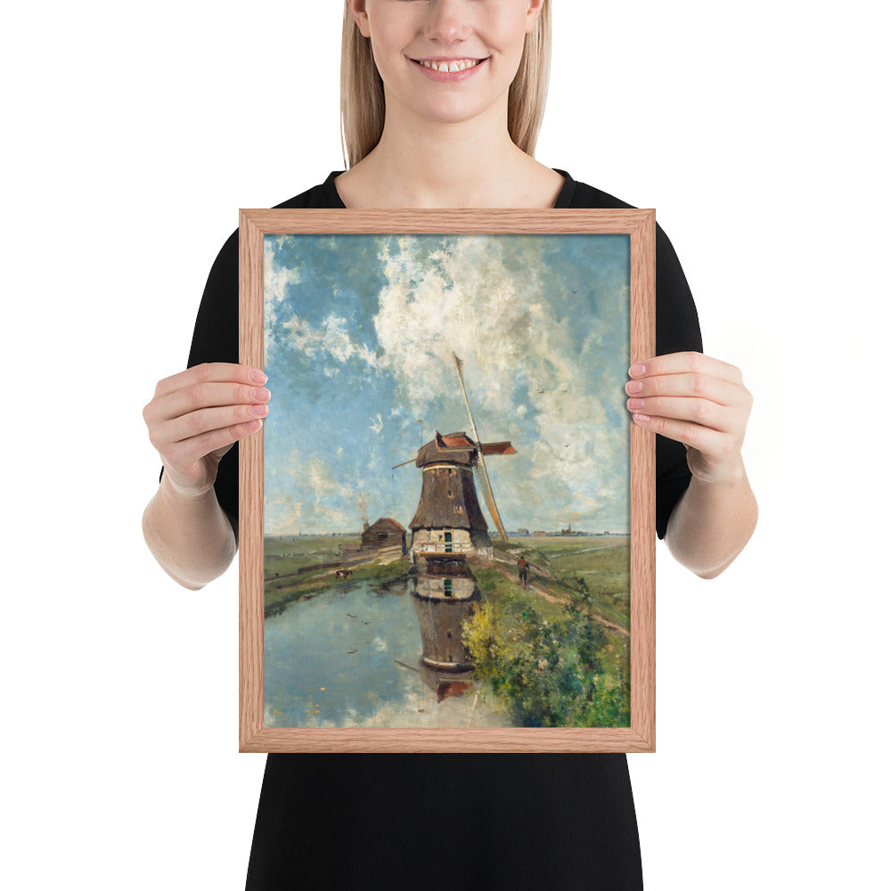 In the Month of July, by Paul Joseph Constantin Gabriël captures the quiet poetry of the Dutch countryside in midsummer. This framed wall print features a traditional windmill standing tall beside a tranquil canal, its reflection shimmering in the water below. A lone figure strolls along the grassy path, while soft clouds drift across a breezy sky—imbuing the scene with movement and serenity. The composition balances architectural charm with natural rhythm, making it a timeless piece for interiors that value warmth, heritage, and visual storytelling.
