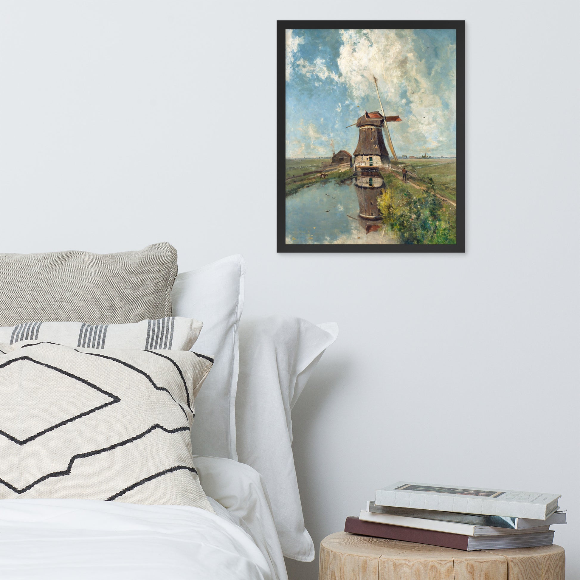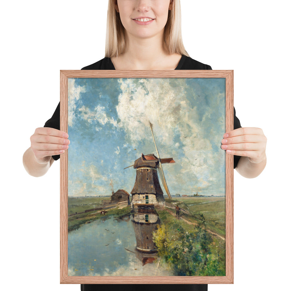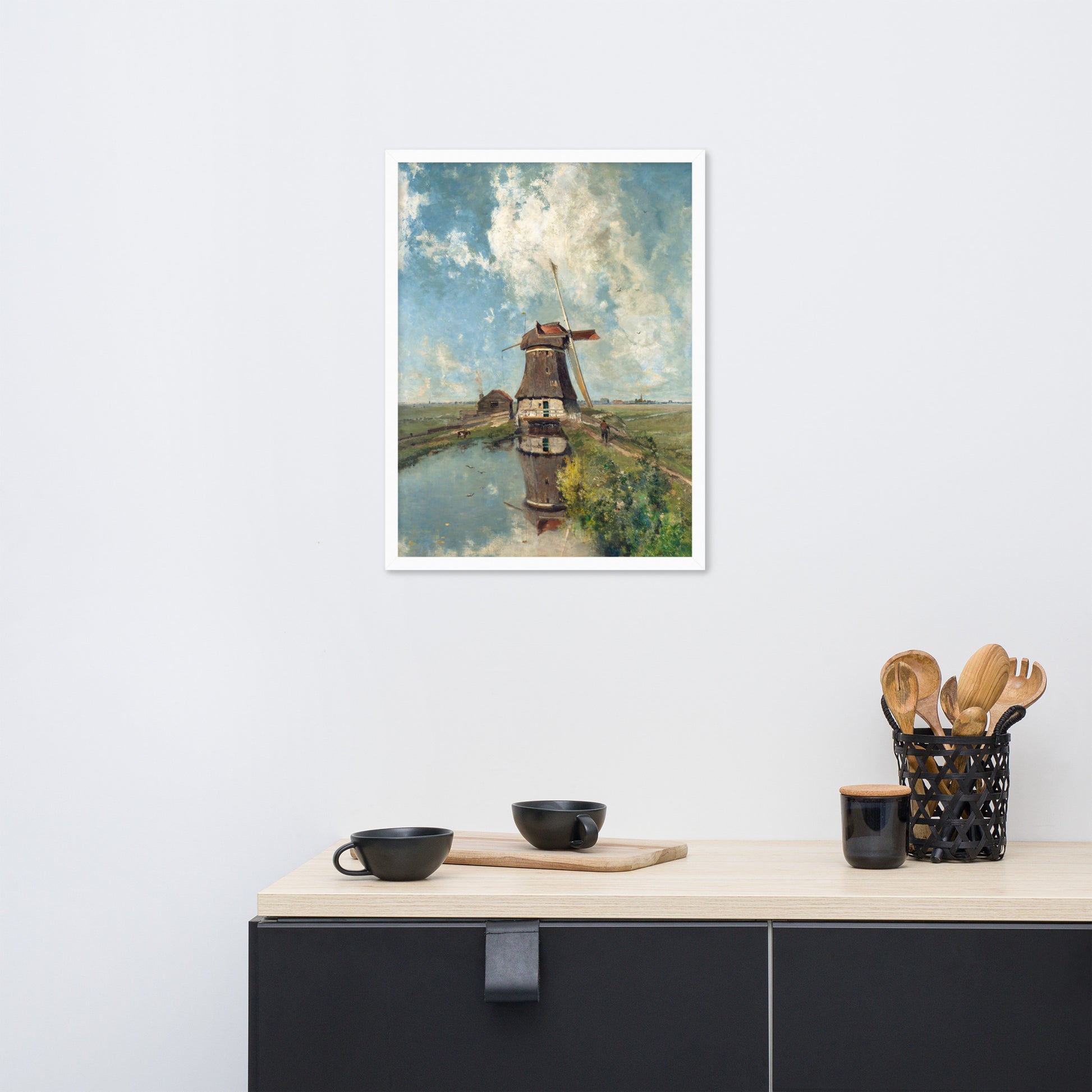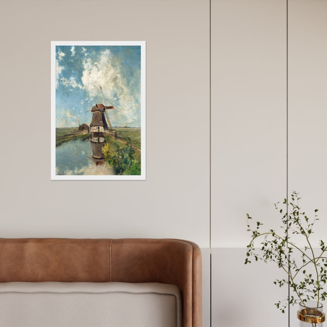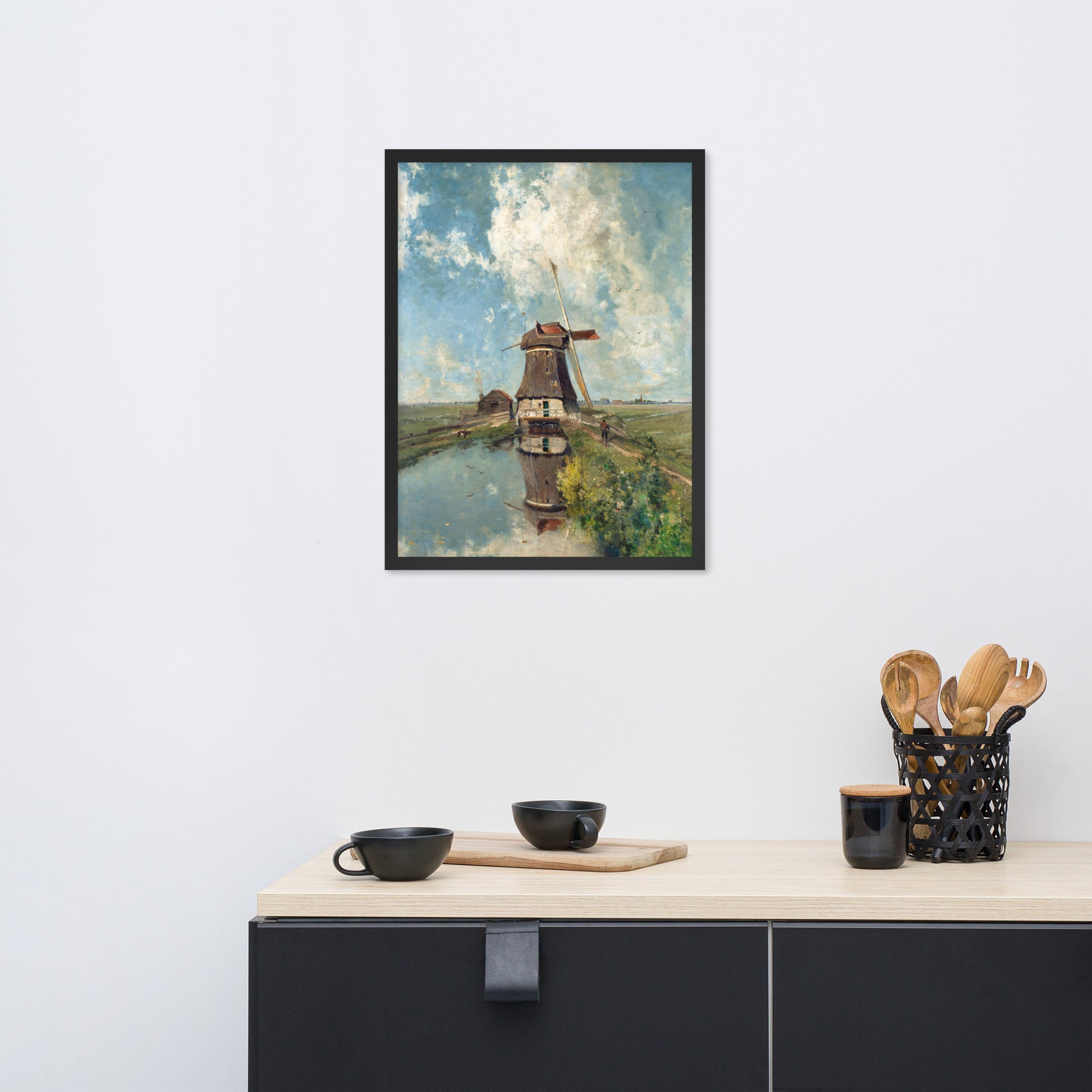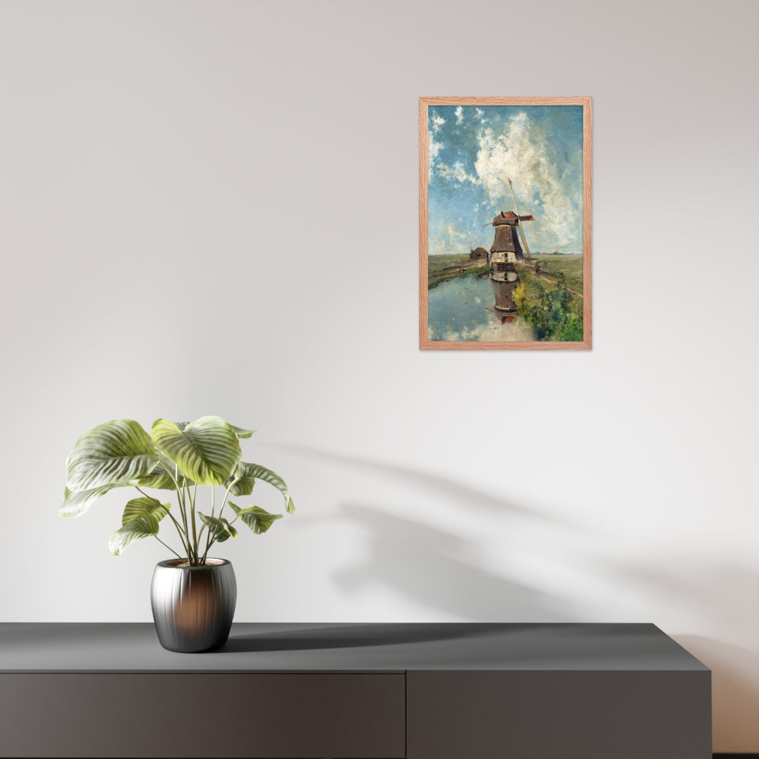 In the Month of July, by Paul Joseph Constantin Gabriël captures the quiet poetry of the Dutch countryside in midsummer. This framed wall print features a traditional windmill standing tall beside a tranquil canal, its reflection shimmering in the water below. A lone figure strolls along the grassy path, while soft clouds drift across a breezy sky—imbuing the scene with movement and serenity. The composition balances architectural charm with natural rhythm, making it a timeless piece for interiors that value warmth, heritage, and visual storytelling.