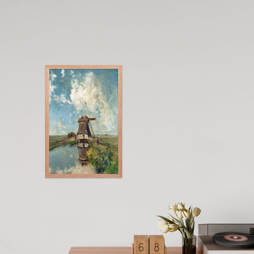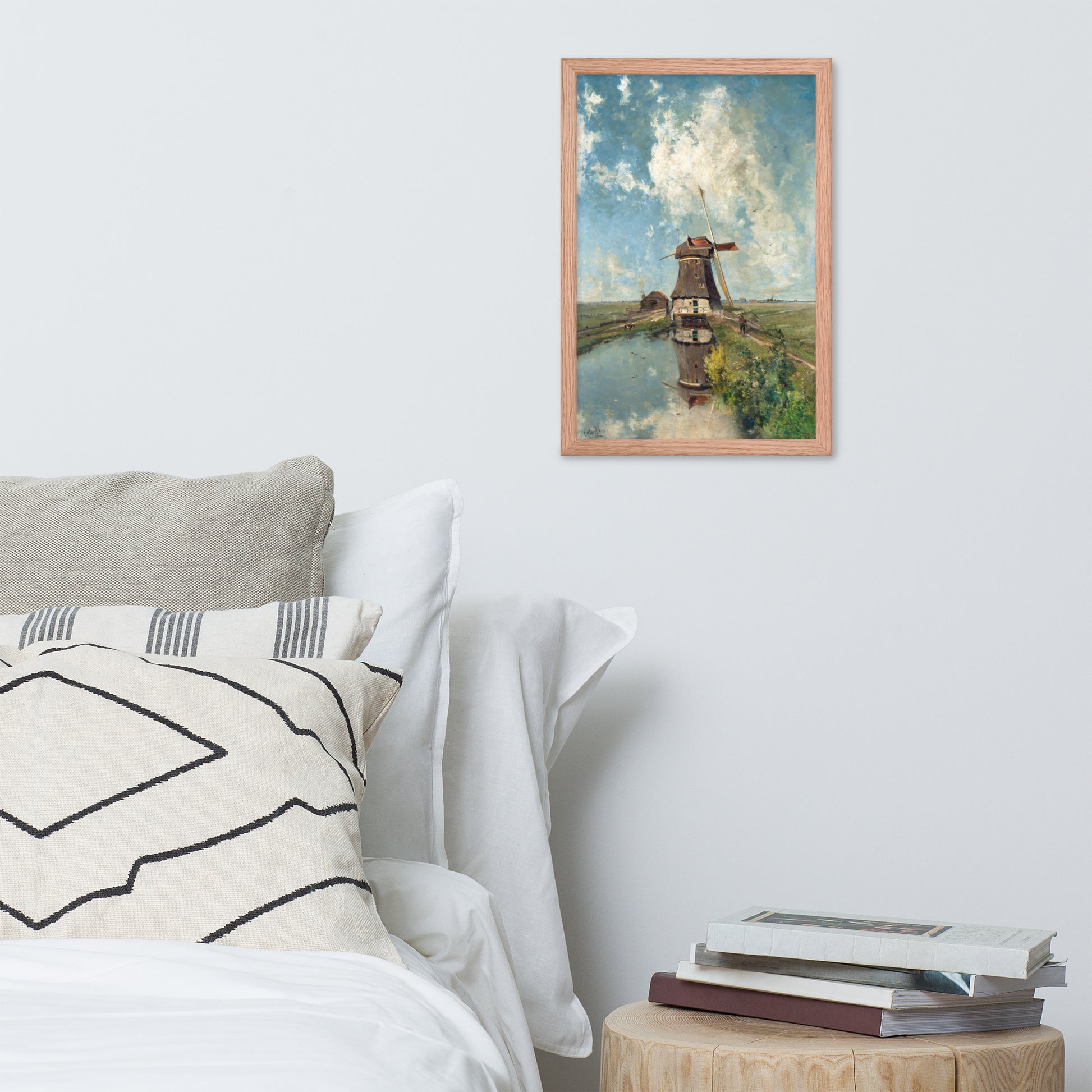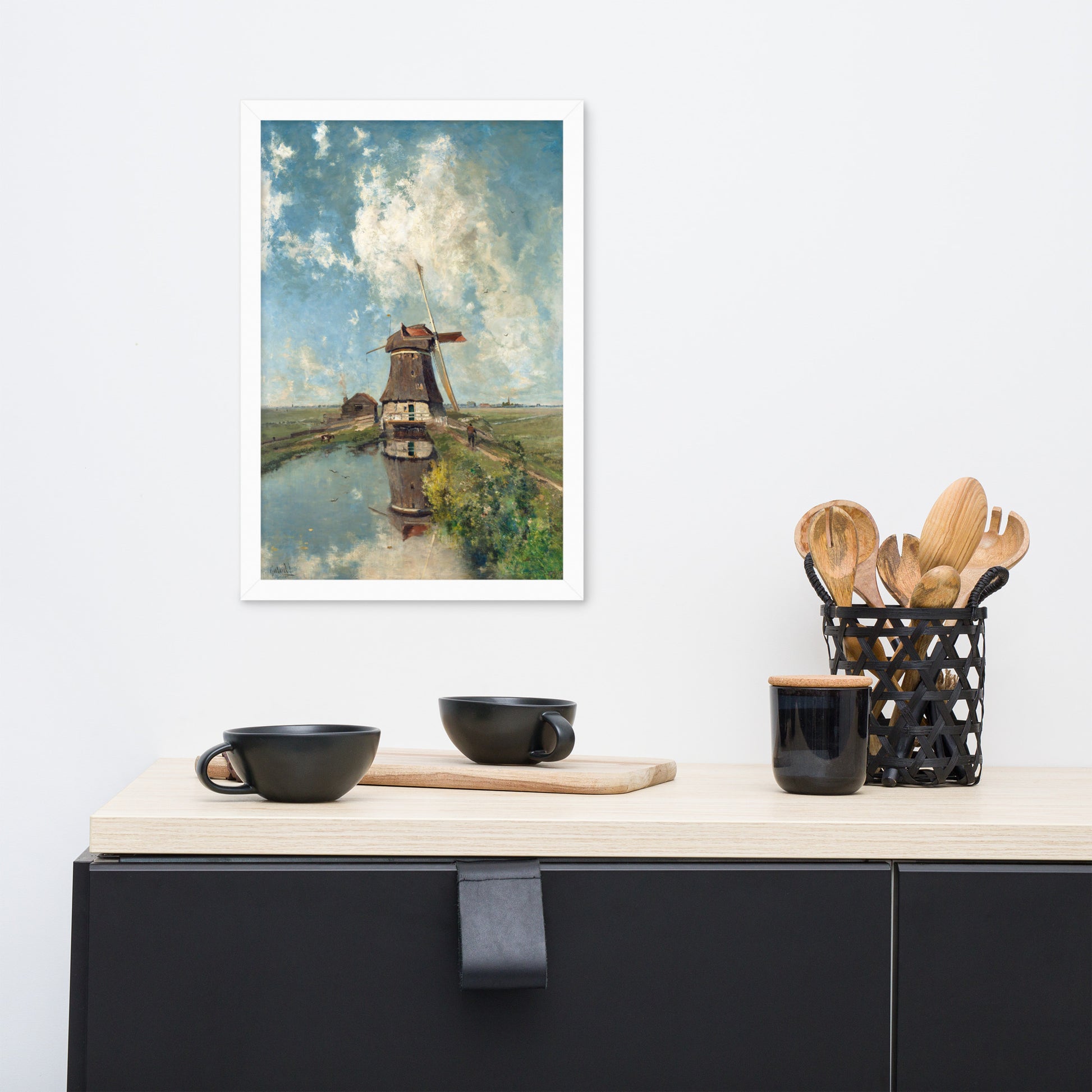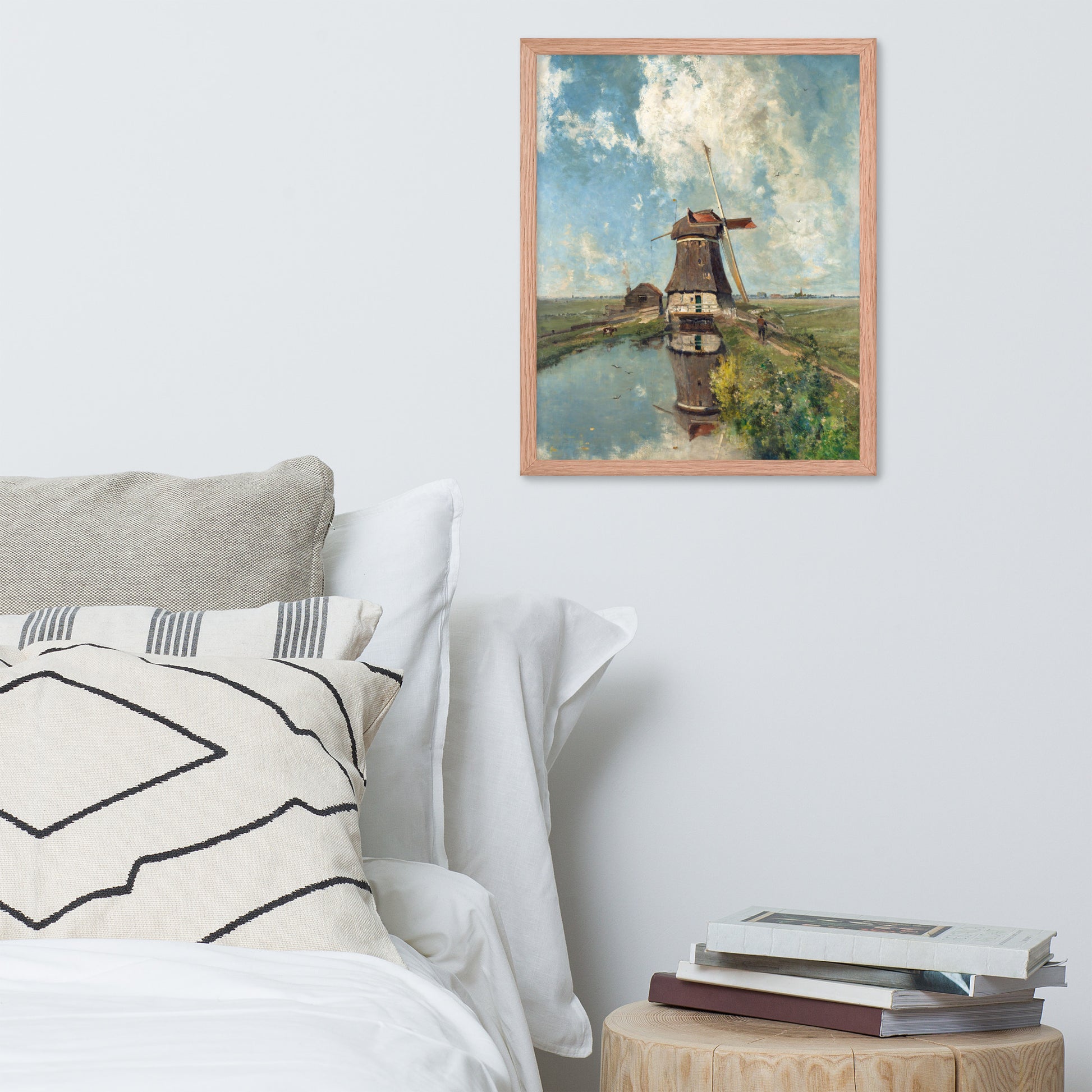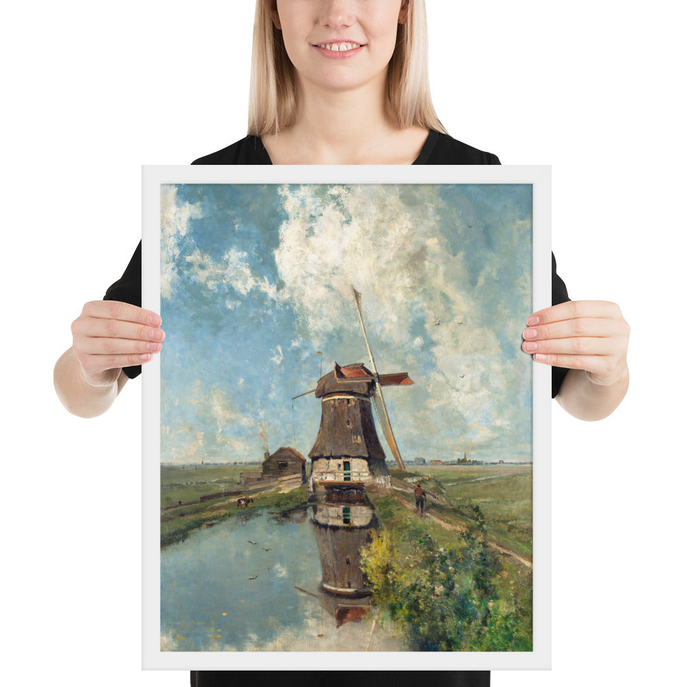 In the Month of July, by Paul Joseph Constantin Gabriël captures the quiet poetry of the Dutch countryside in midsummer. This framed wall print features a traditional windmill standing tall beside a tranquil canal, its reflection shimmering in the water below. A lone figure strolls along the grassy path, while soft clouds drift across a breezy sky—imbuing the scene with movement and serenity. The composition balances architectural charm with natural rhythm, making it a timeless piece for interiors that value warmth, heritage, and visual storytelling.