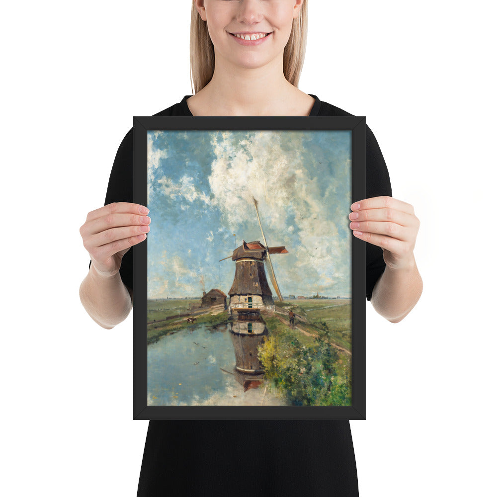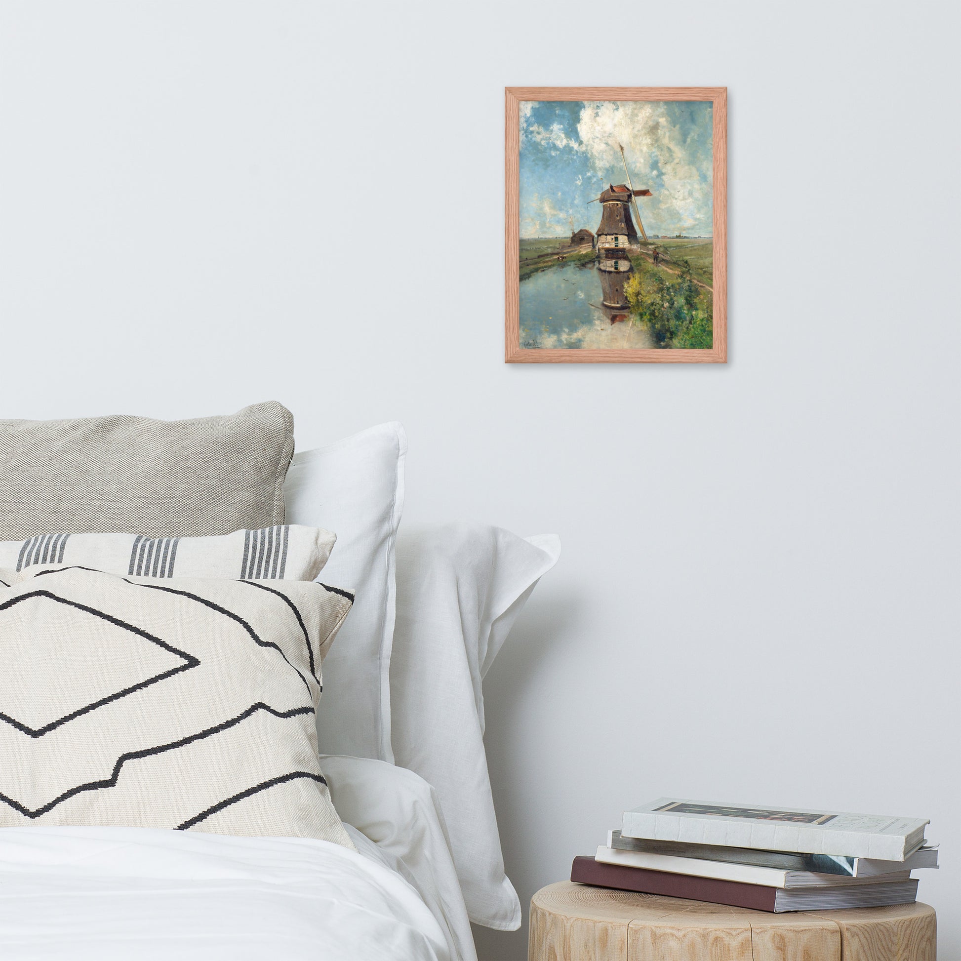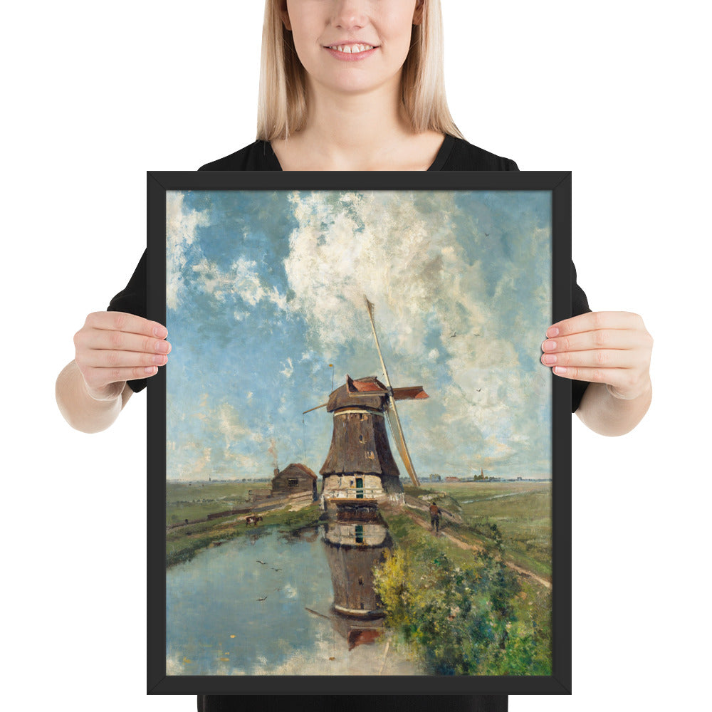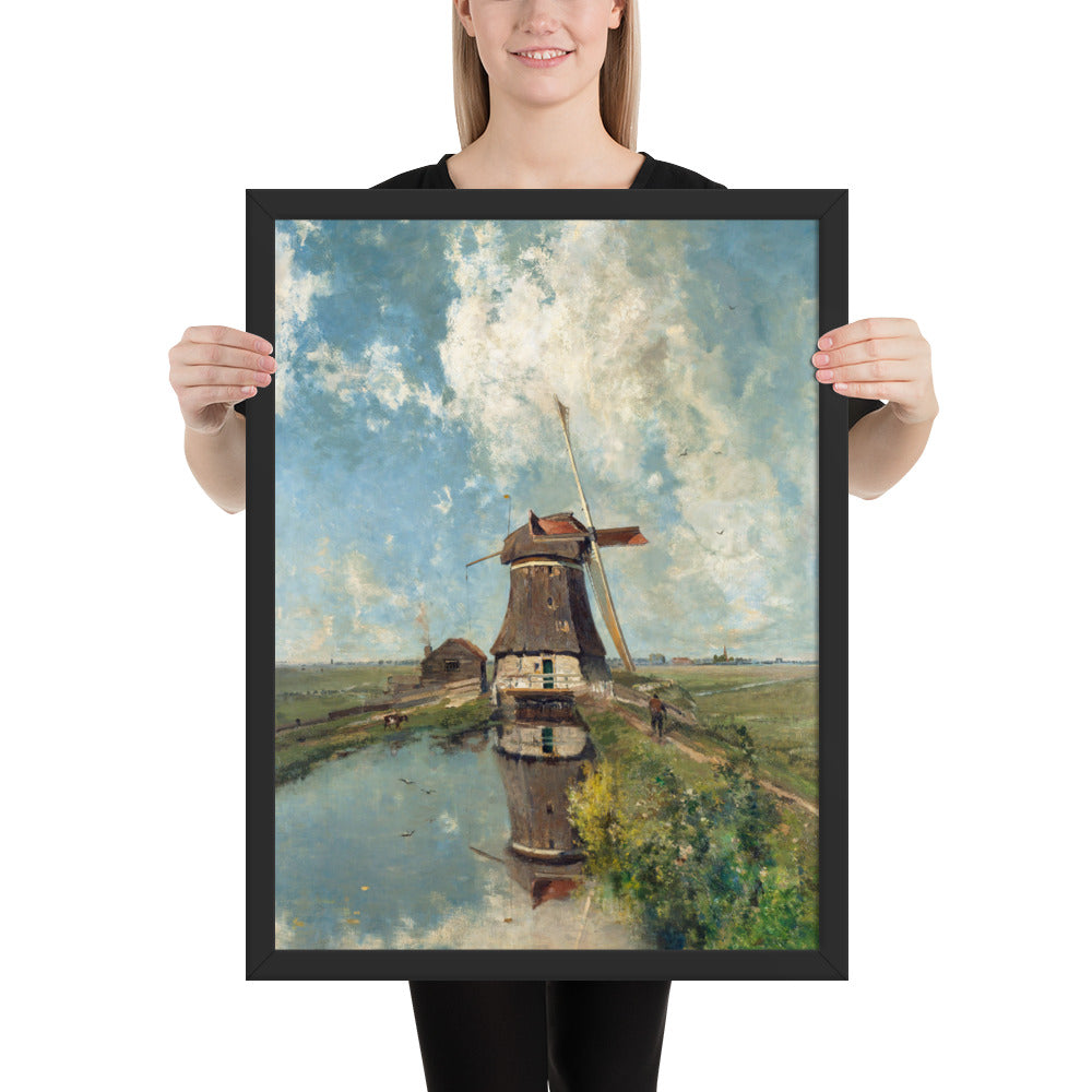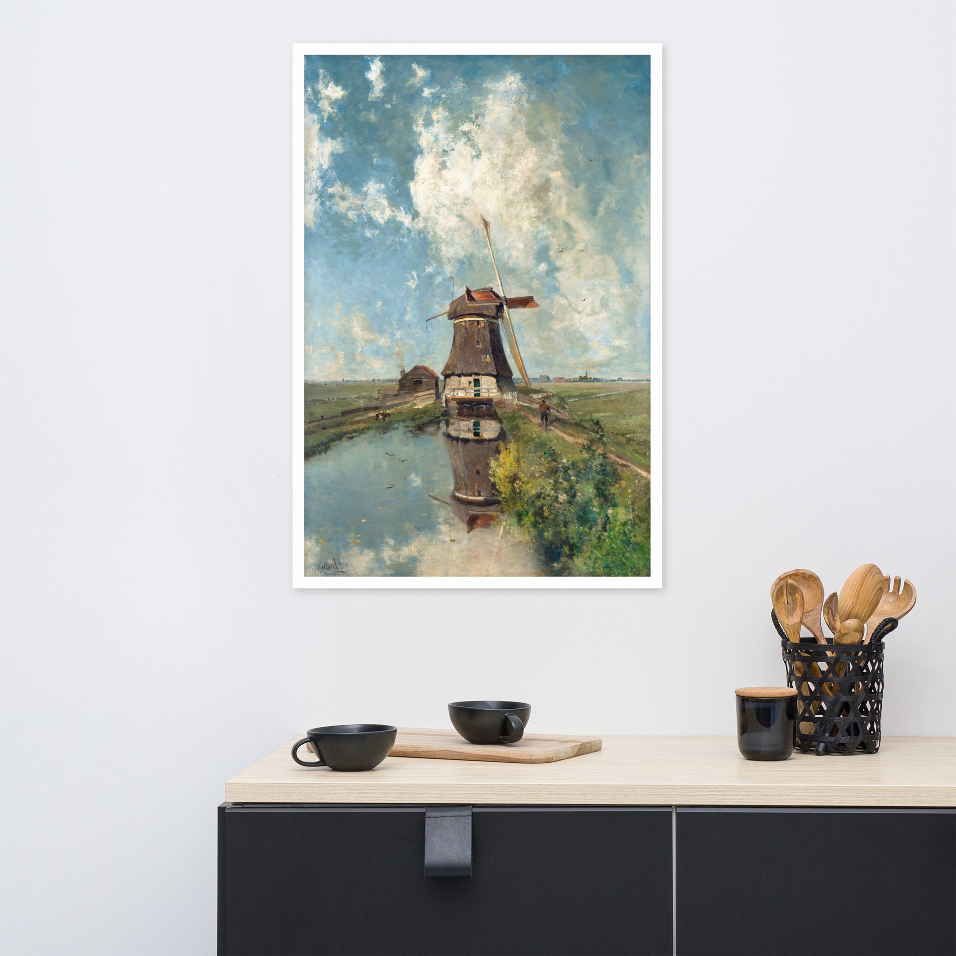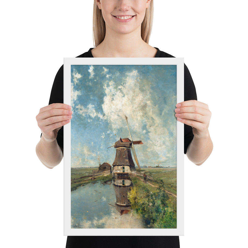 In the Month of July, by Paul Joseph Constantin Gabriël captures the quiet poetry of the Dutch countryside in midsummer. This framed wall print features a traditional windmill standing tall beside a tranquil canal, its reflection shimmering in the water below. A lone figure strolls along the grassy path, while soft clouds drift across a breezy sky—imbuing the scene with movement and serenity. The composition balances architectural charm with natural rhythm, making it a timeless piece for interiors that value warmth, heritage, and visual storytelling.