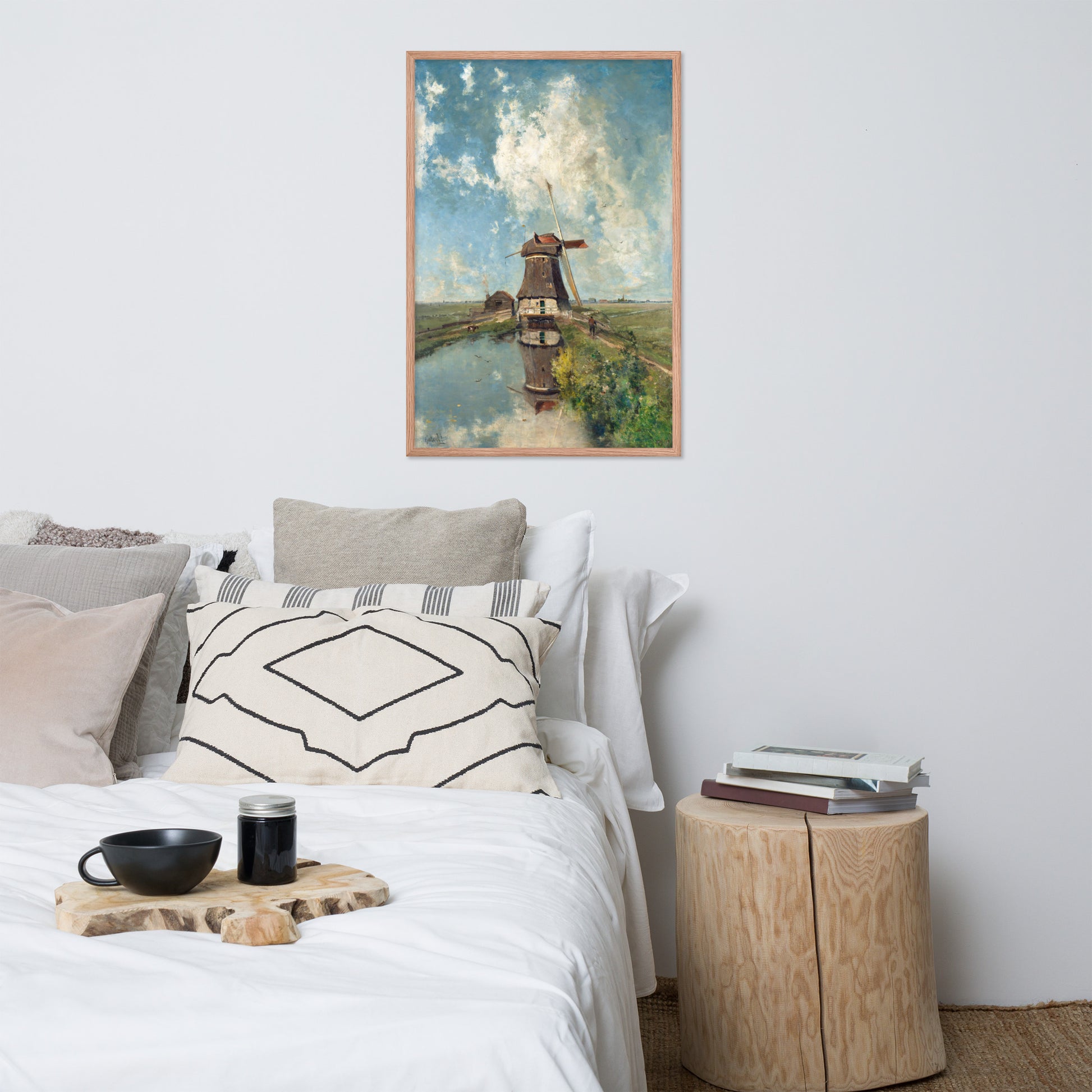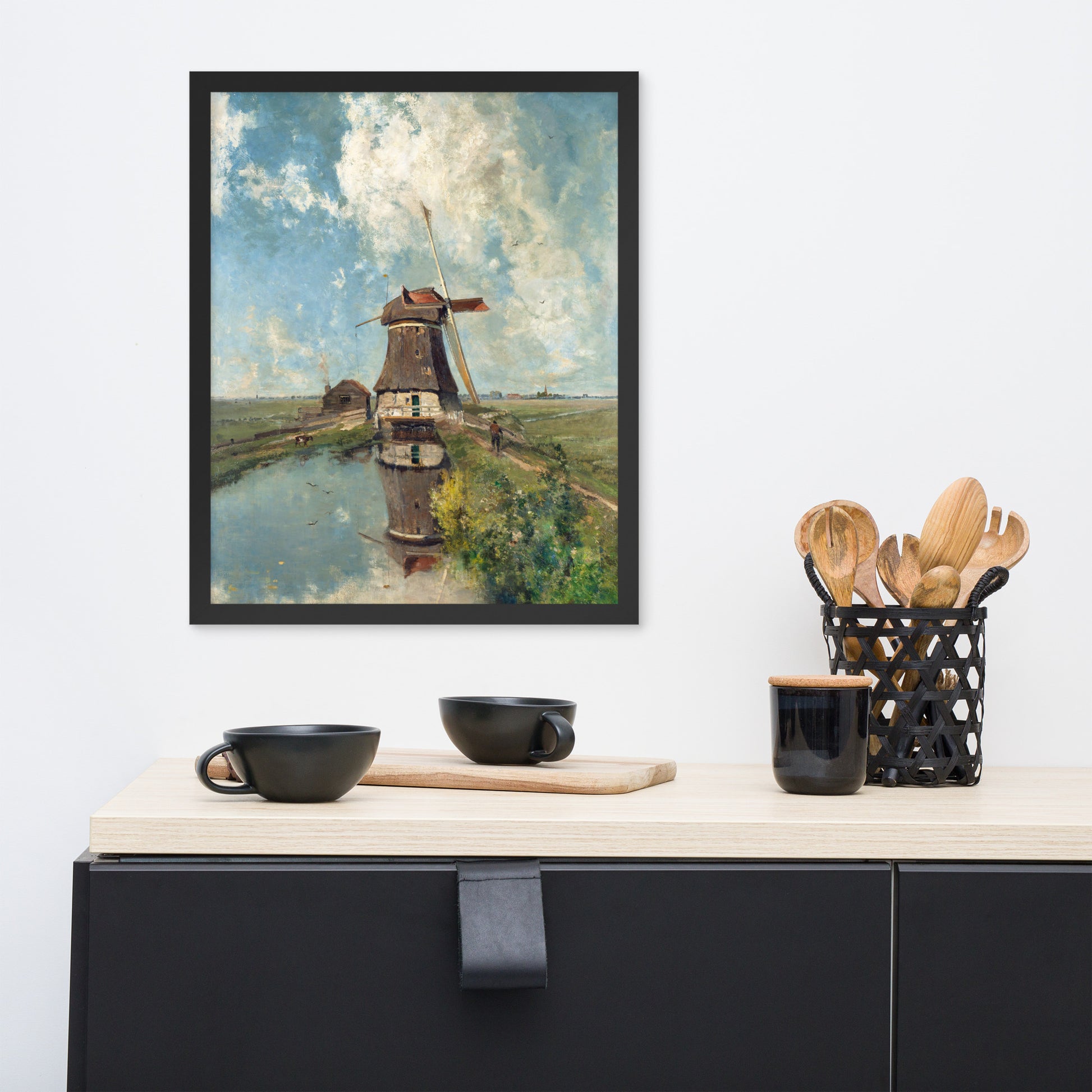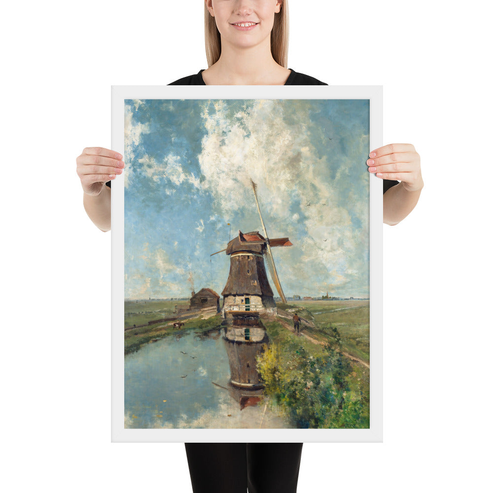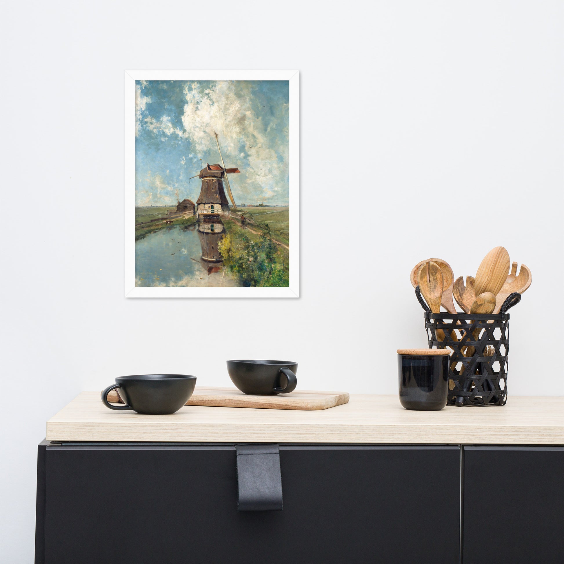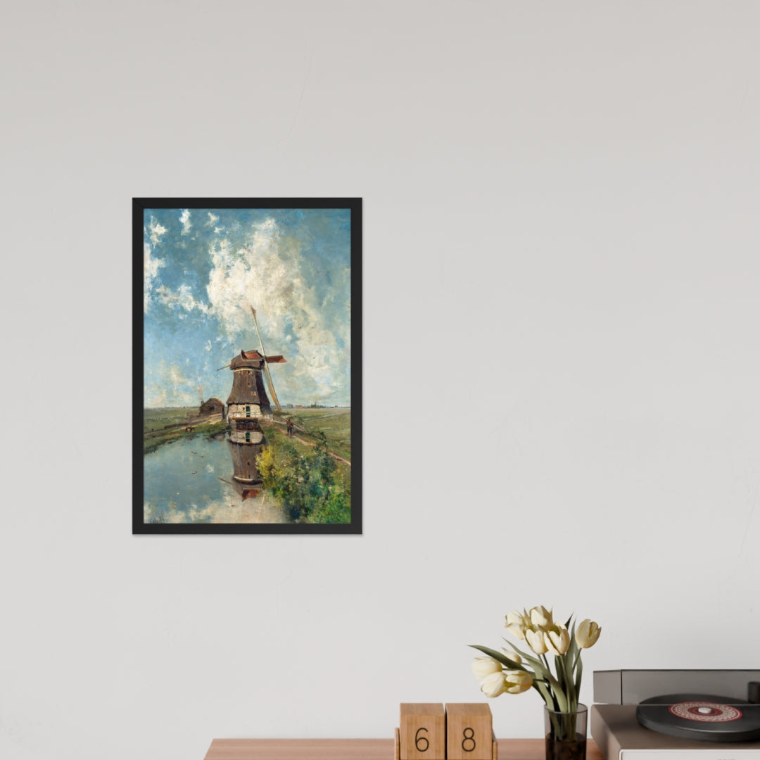 In the Month of July, by Paul Joseph Constantin Gabriël captures the quiet poetry of the Dutch countryside in midsummer. This framed wall print features a traditional windmill standing tall beside a tranquil canal, its reflection shimmering in the water below. A lone figure strolls along the grassy path, while soft clouds drift across a breezy sky—imbuing the scene with movement and serenity. The composition balances architectural charm with natural rhythm, making it a timeless piece for interiors that value warmth, heritage, and visual storytelling.