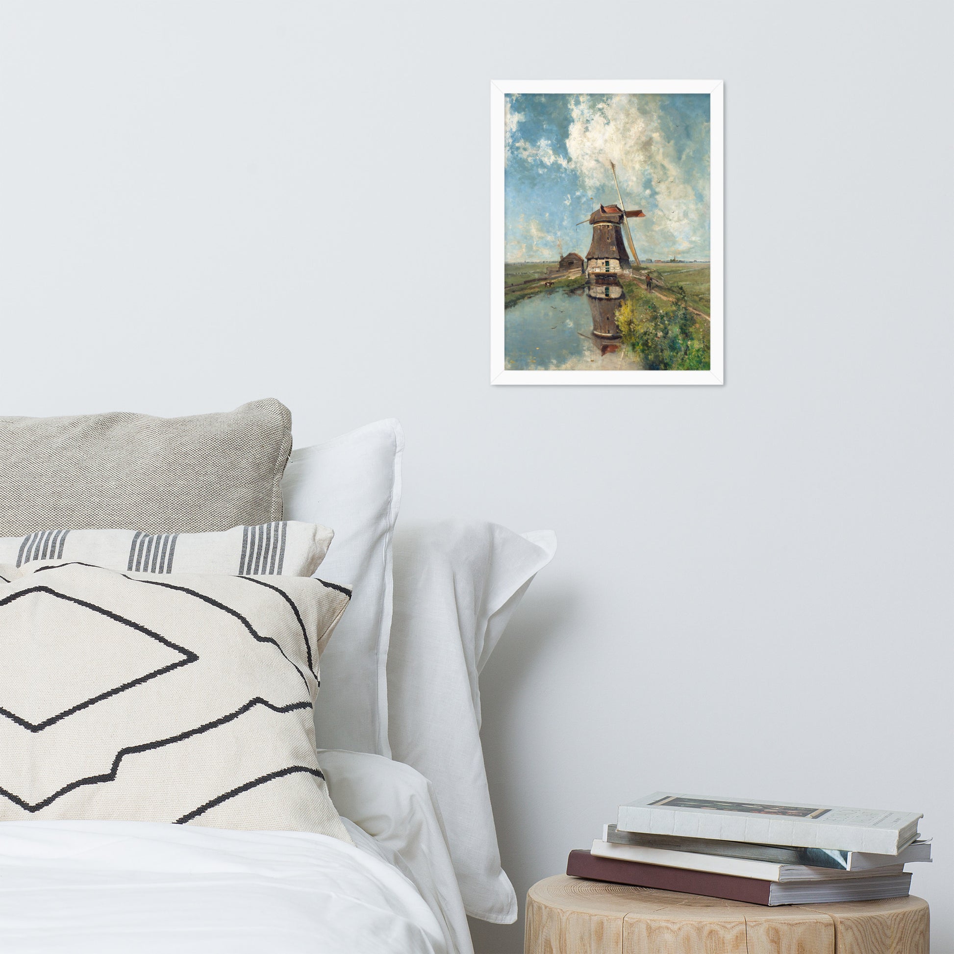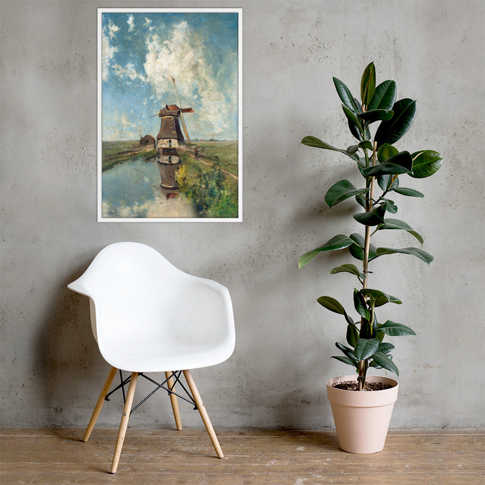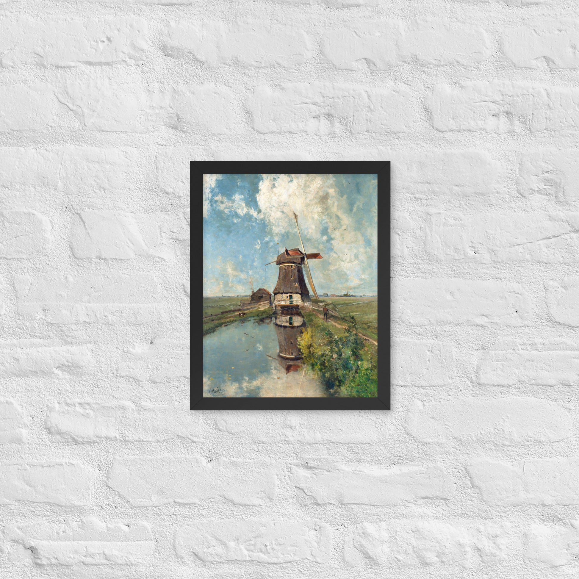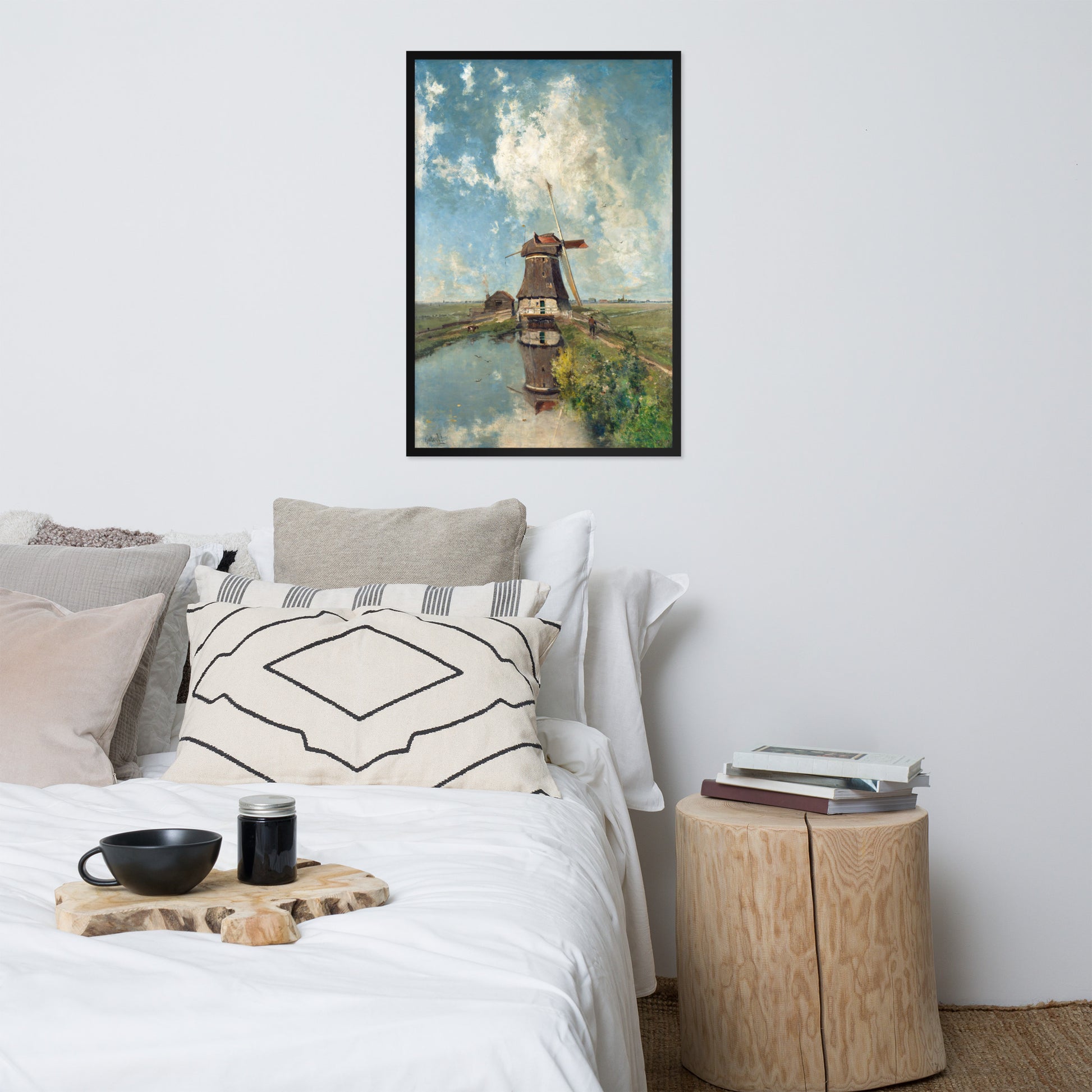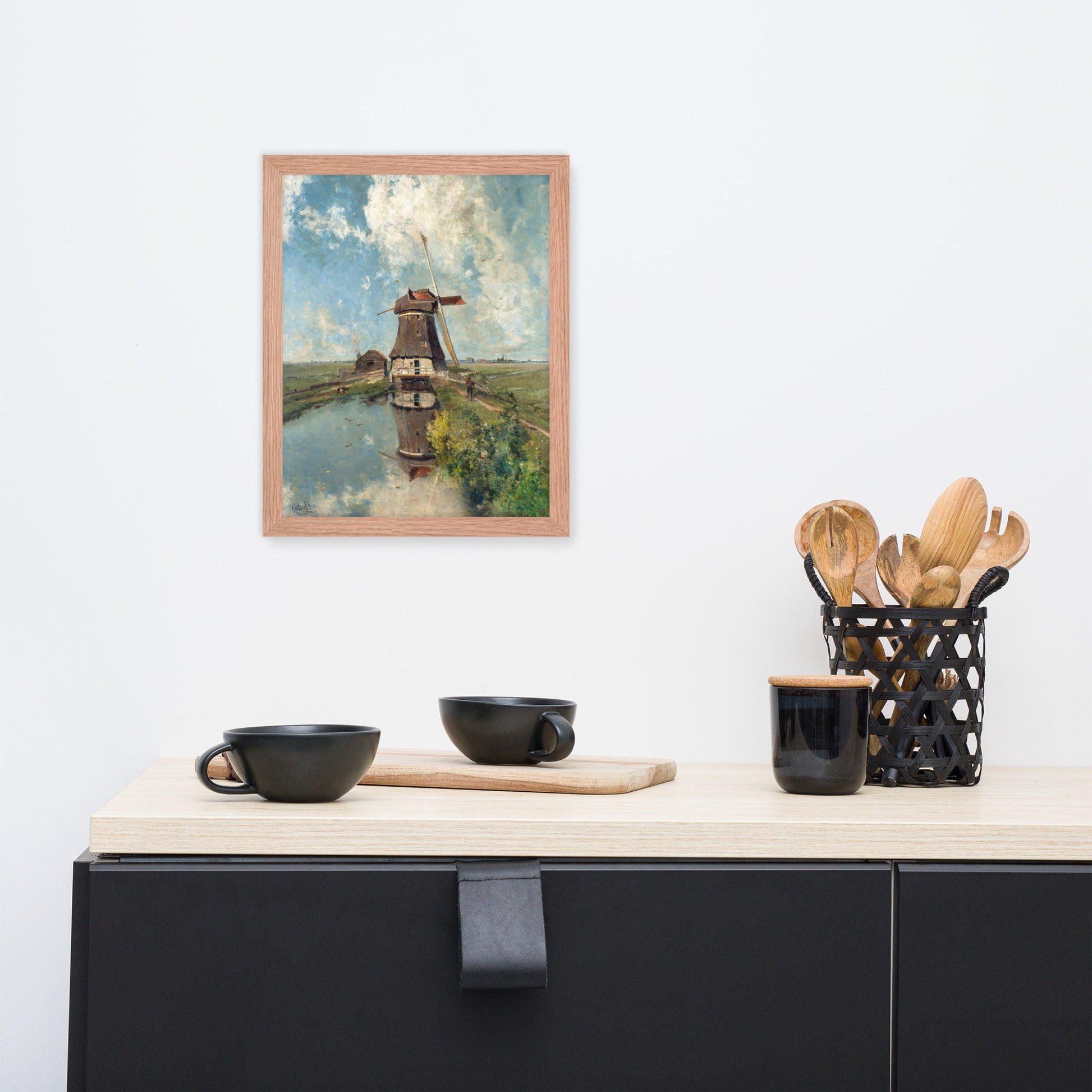In the Month of July, by Paul Joseph Constantin Gabriël captures the quiet poetry of the Dutch countryside in midsummer. This framed wall print features a traditional windmill standing tall beside a tranquil canal, its reflection shimmering in the water below. A lone figure strolls along the grassy path, while soft clouds drift across a breezy sky—imbuing the scene with movement and serenity. The composition balances architectural charm with natural rhythm, making it a timeless piece for interiors that value warmth, heritage, and visual storytelling.