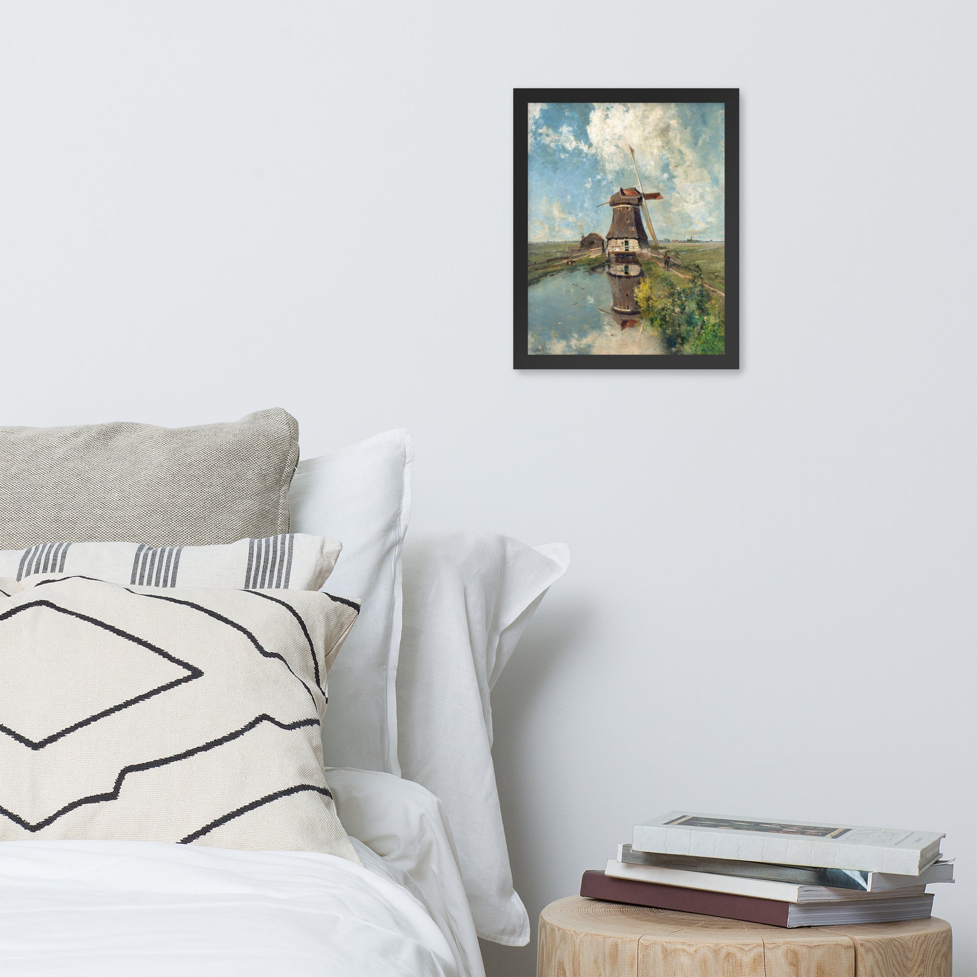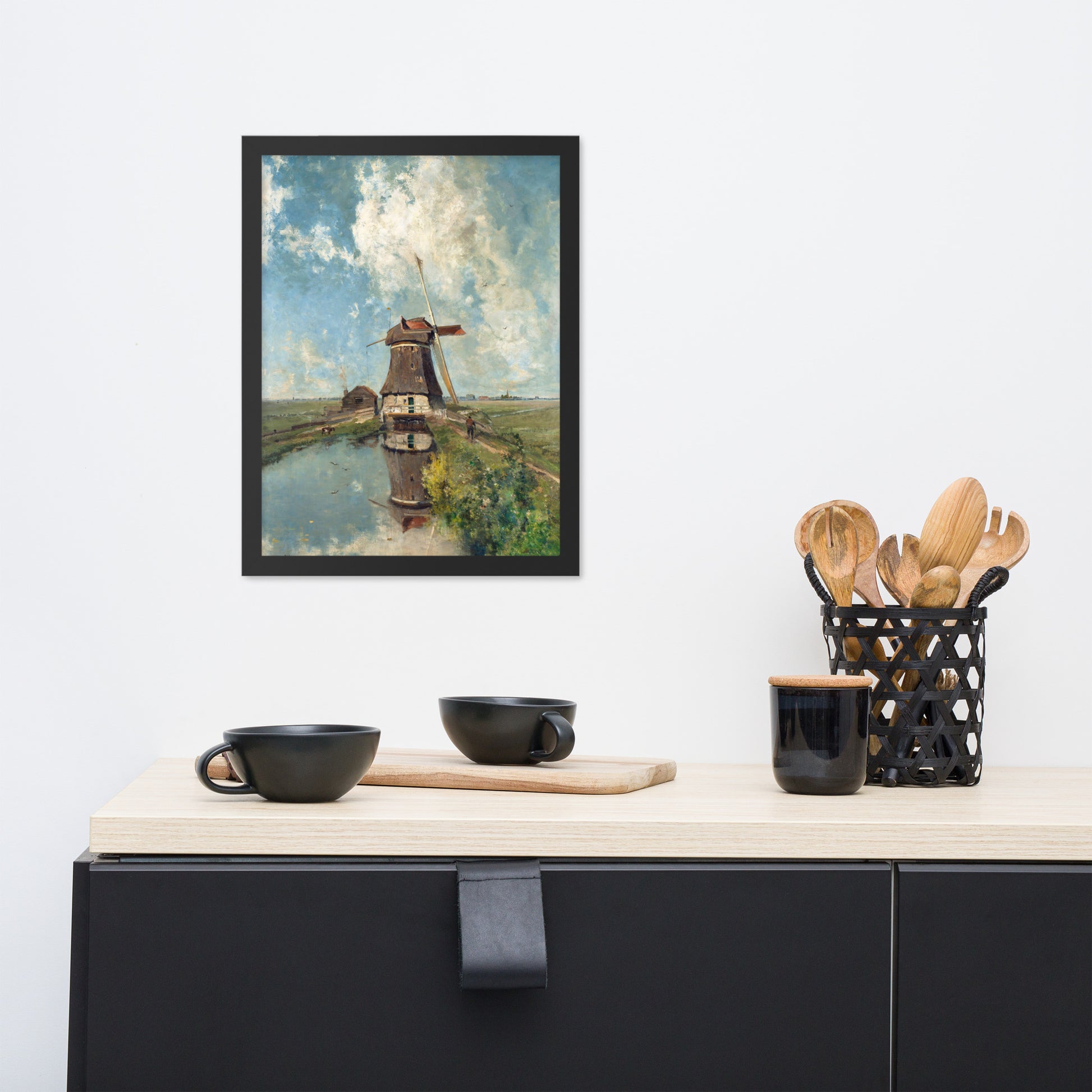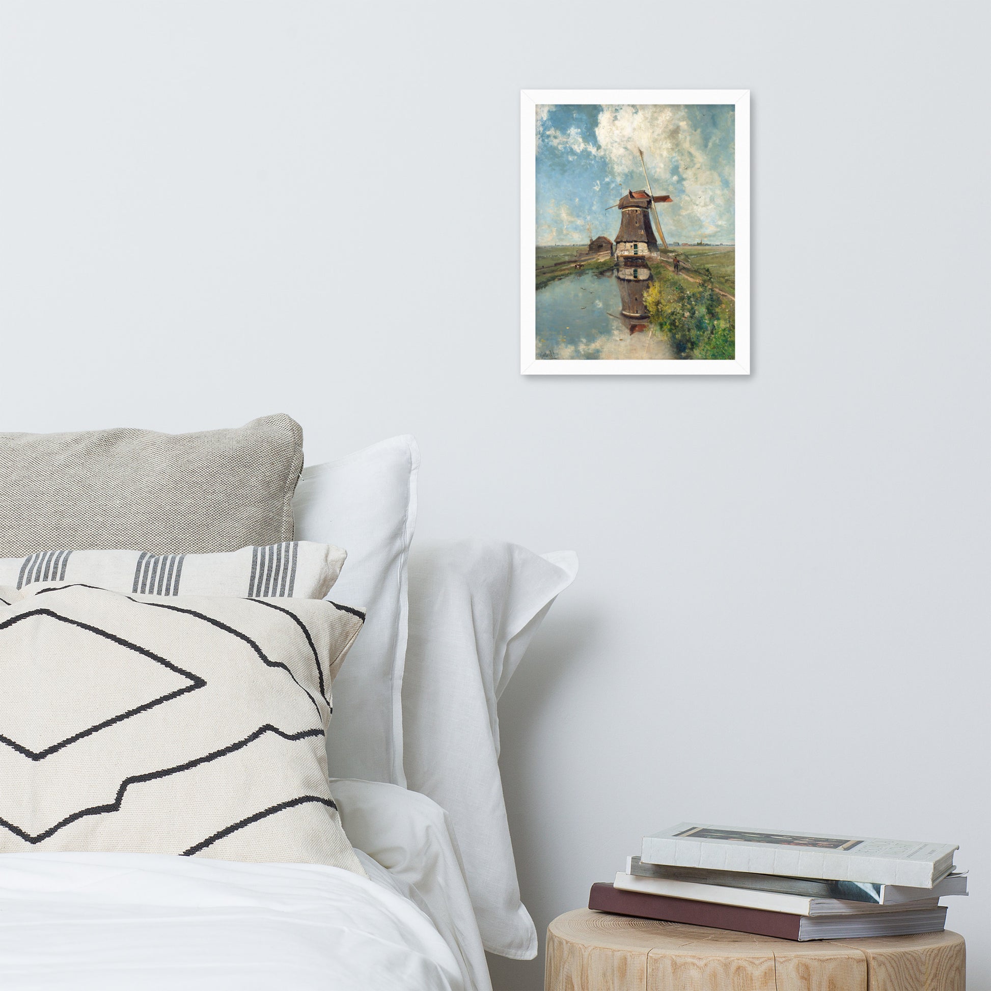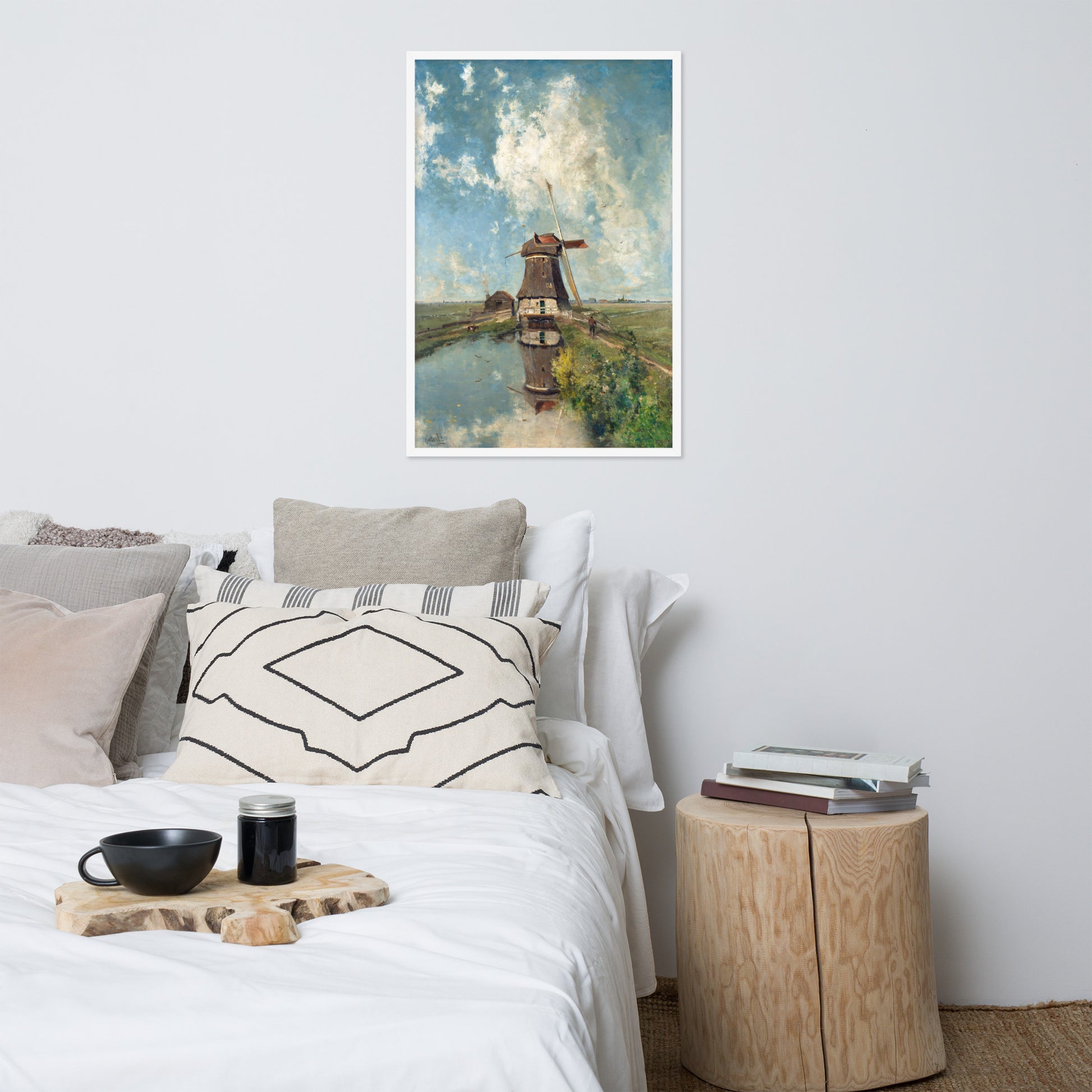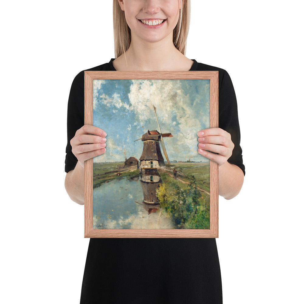 In the Month of July, by Paul Joseph Constantin Gabriël captures the quiet poetry of the Dutch countryside in midsummer. This framed wall print features a traditional windmill standing tall beside a tranquil canal, its reflection shimmering in the water below. A lone figure strolls along the grassy path, while soft clouds drift across a breezy sky—imbuing the scene with movement and serenity. The composition balances architectural charm with natural rhythm, making it a timeless piece for interiors that value warmth, heritage, and visual storytelling.