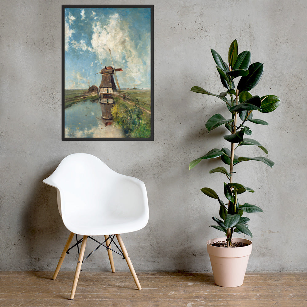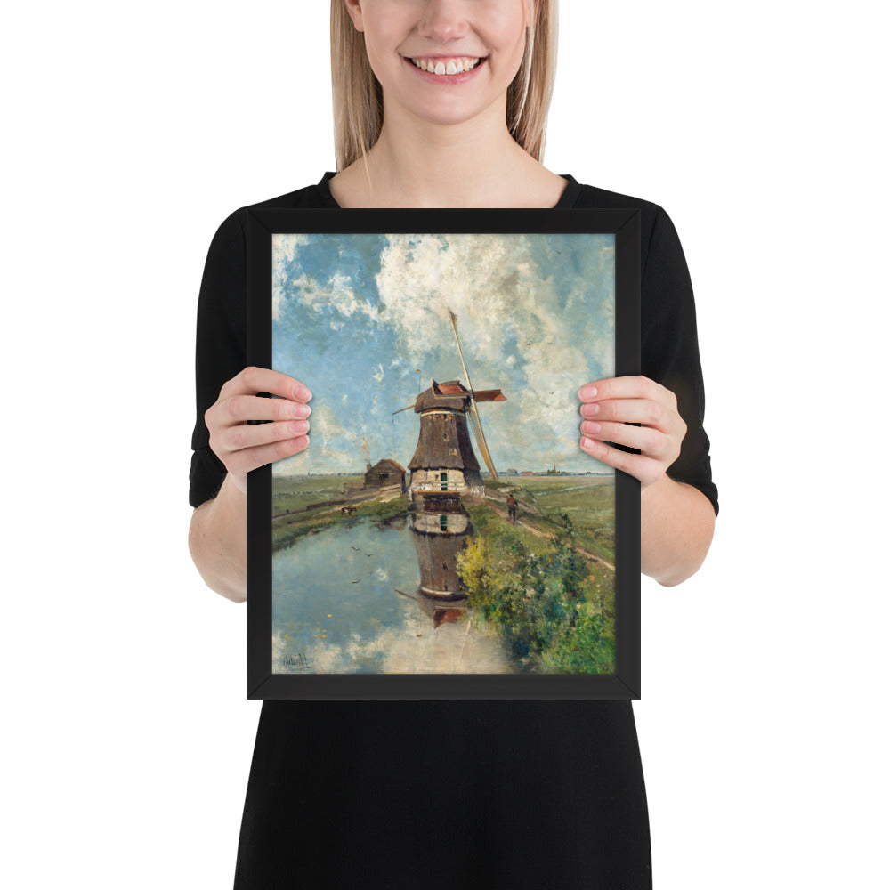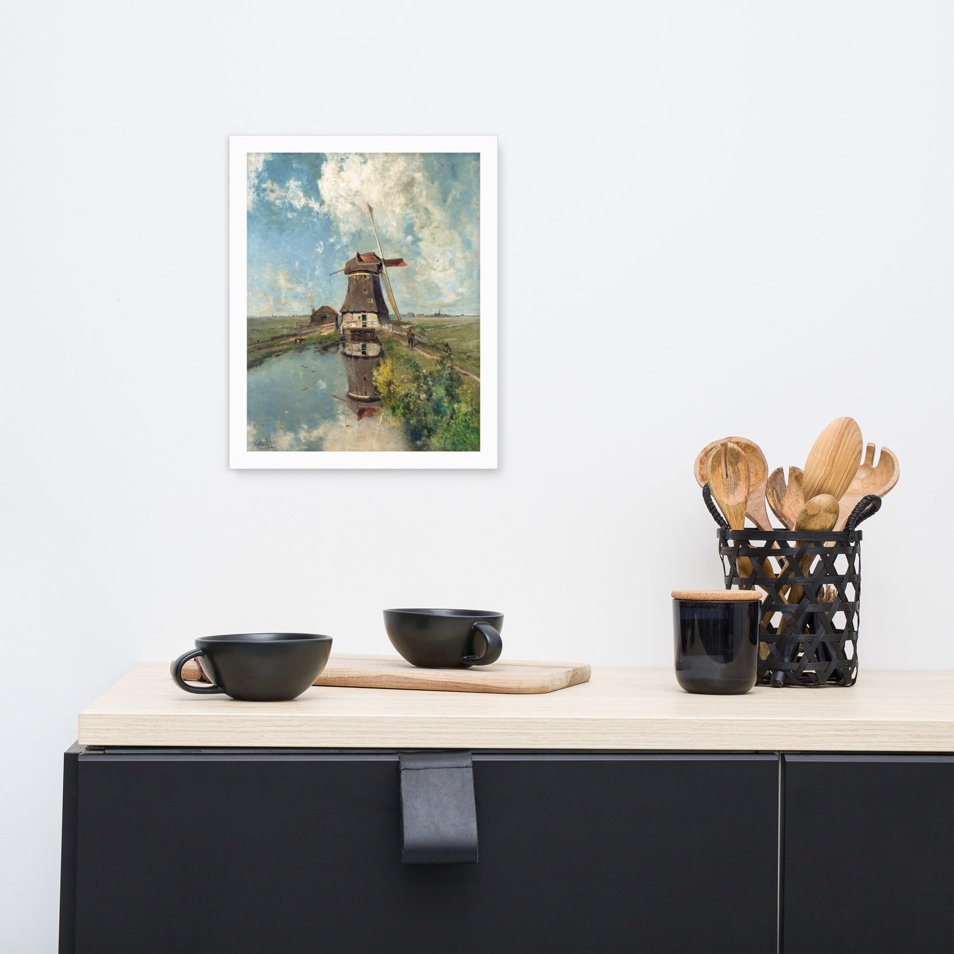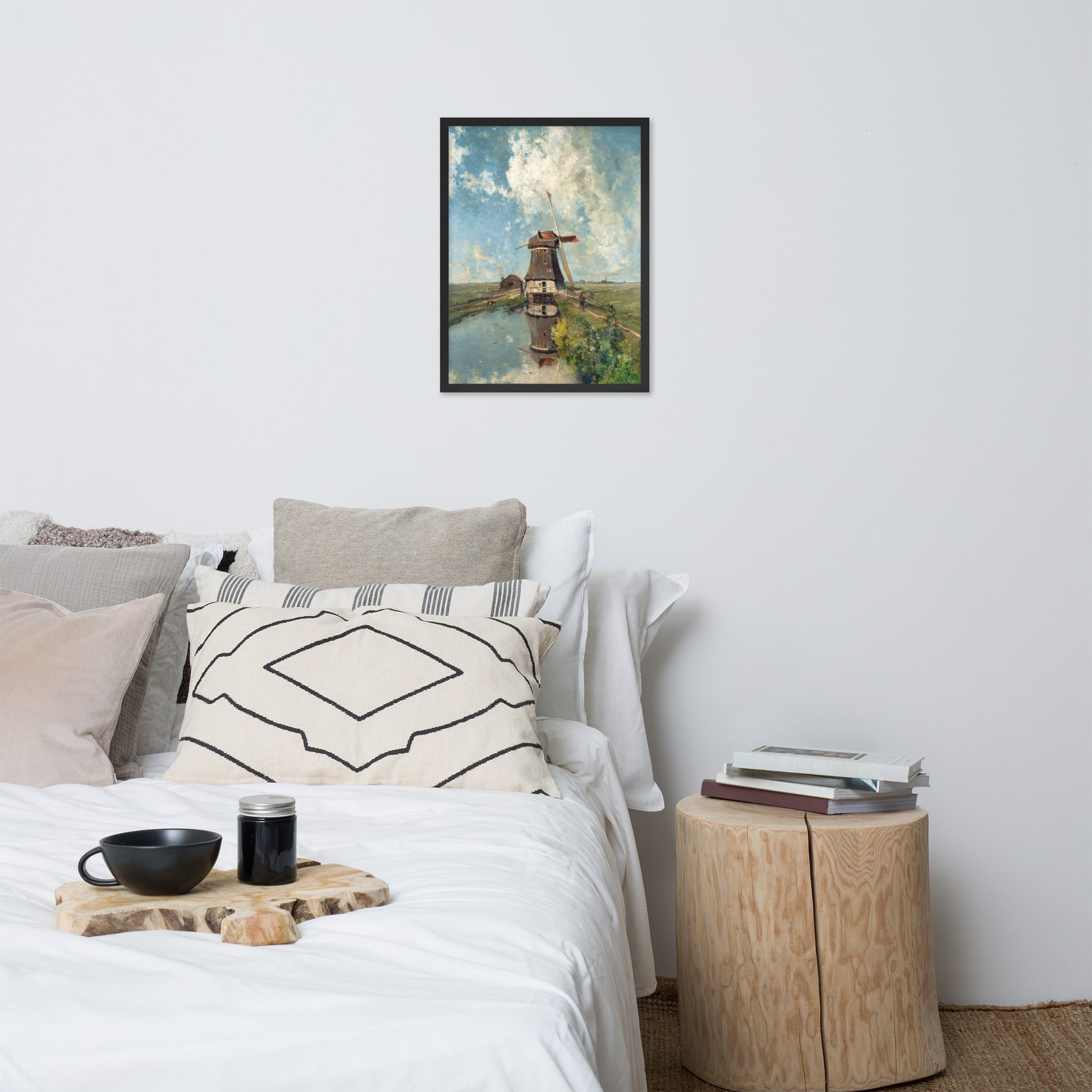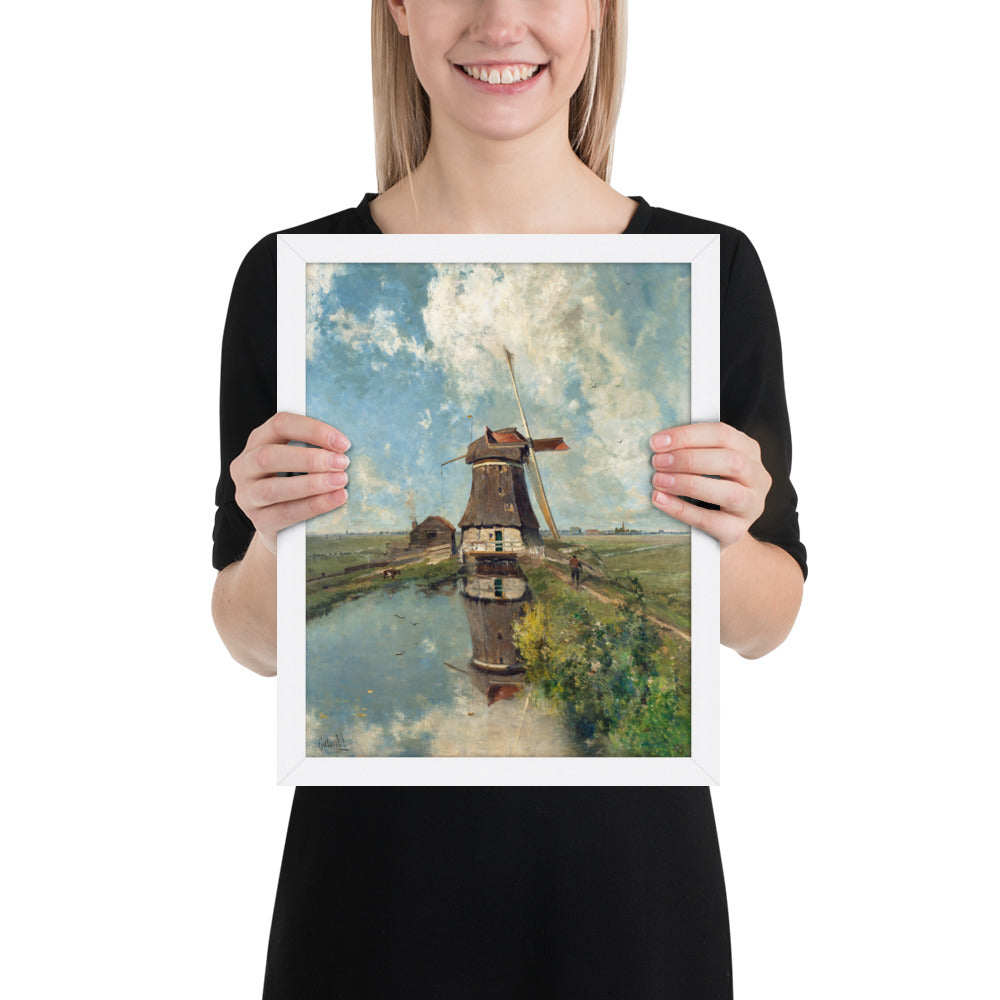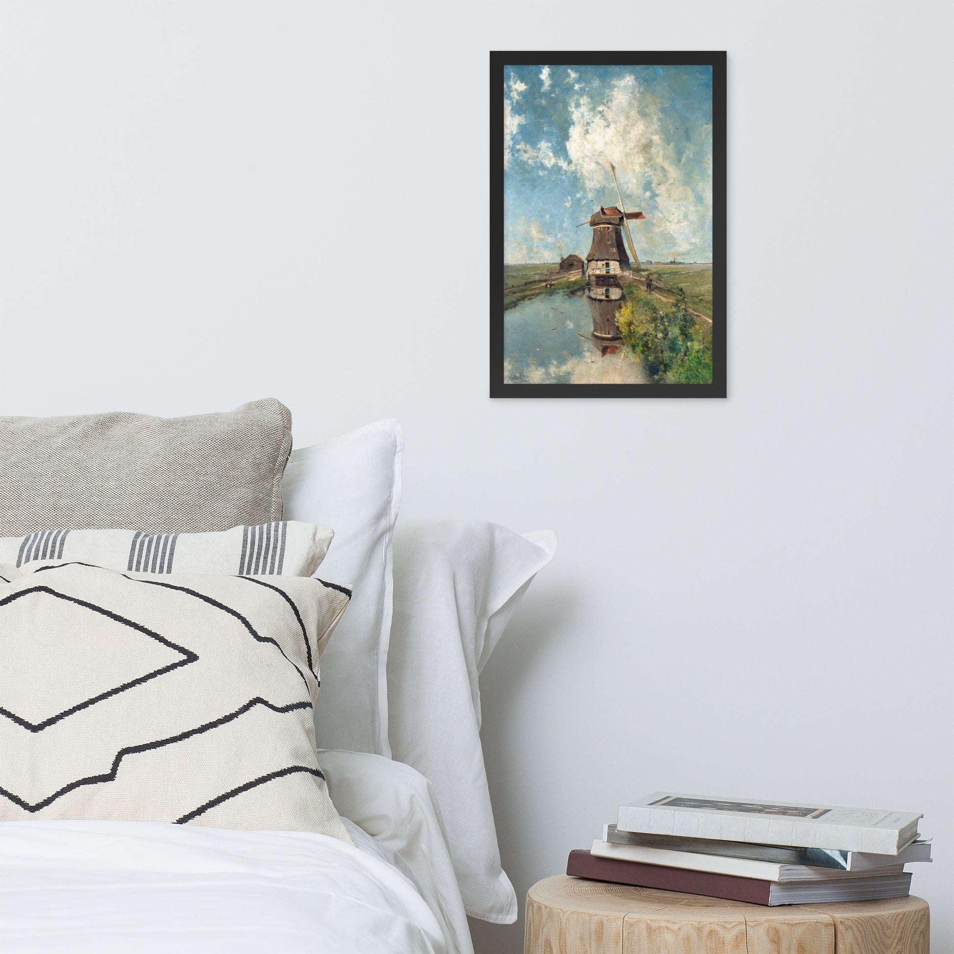 In the Month of July, by Paul Joseph Constantin Gabriël captures the quiet poetry of the Dutch countryside in midsummer. This framed wall print features a traditional windmill standing tall beside a tranquil canal, its reflection shimmering in the water below. A lone figure strolls along the grassy path, while soft clouds drift across a breezy sky—imbuing the scene with movement and serenity. The composition balances architectural charm with natural rhythm, making it a timeless piece for interiors that value warmth, heritage, and visual storytelling.