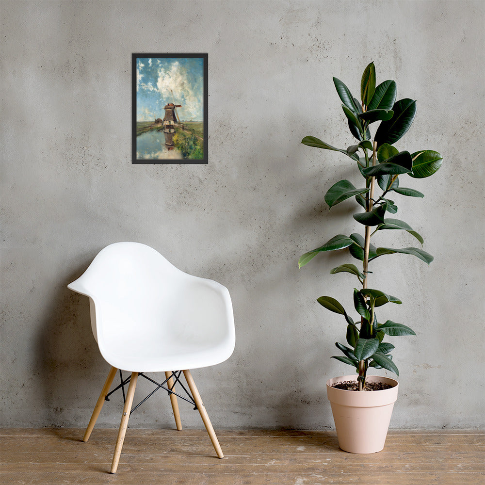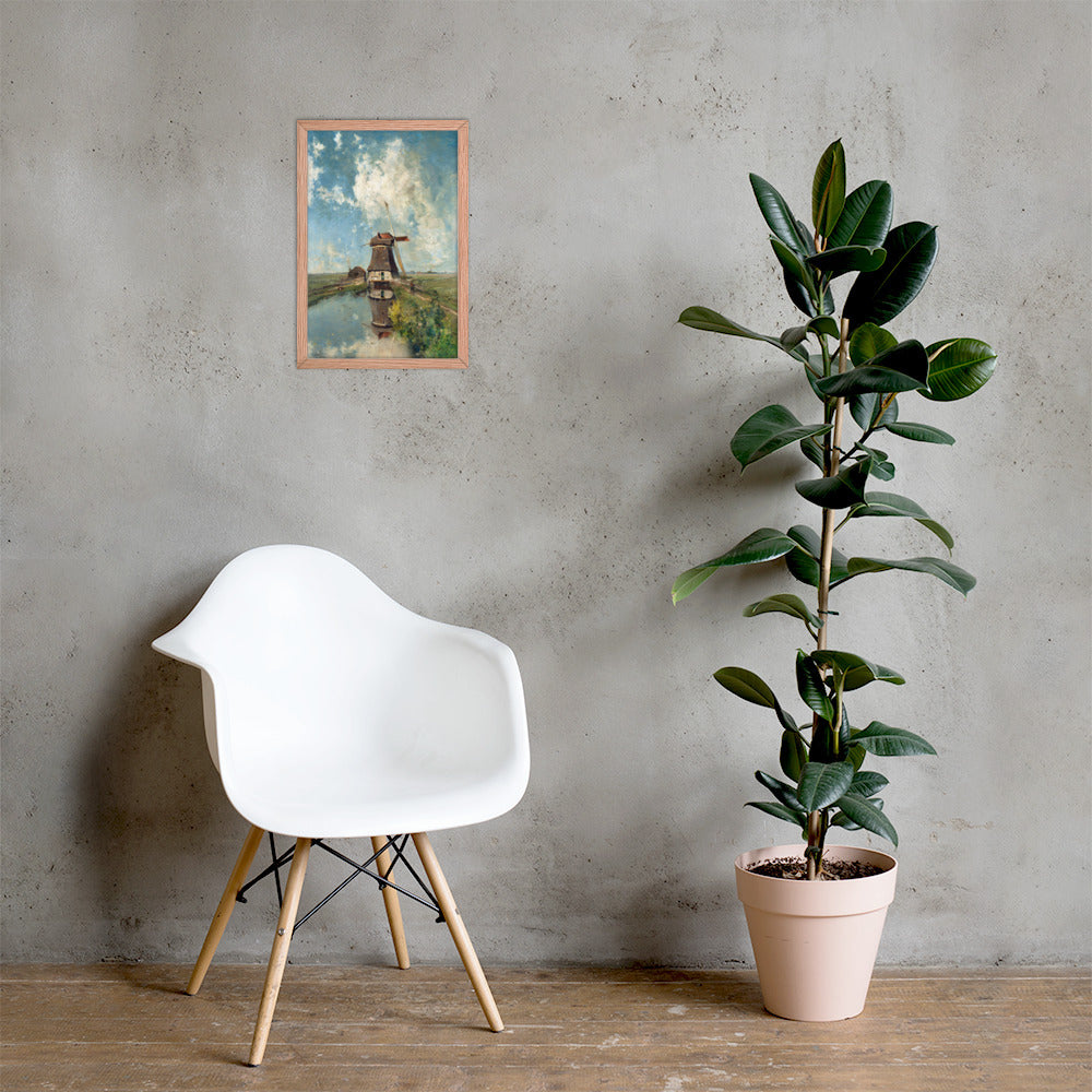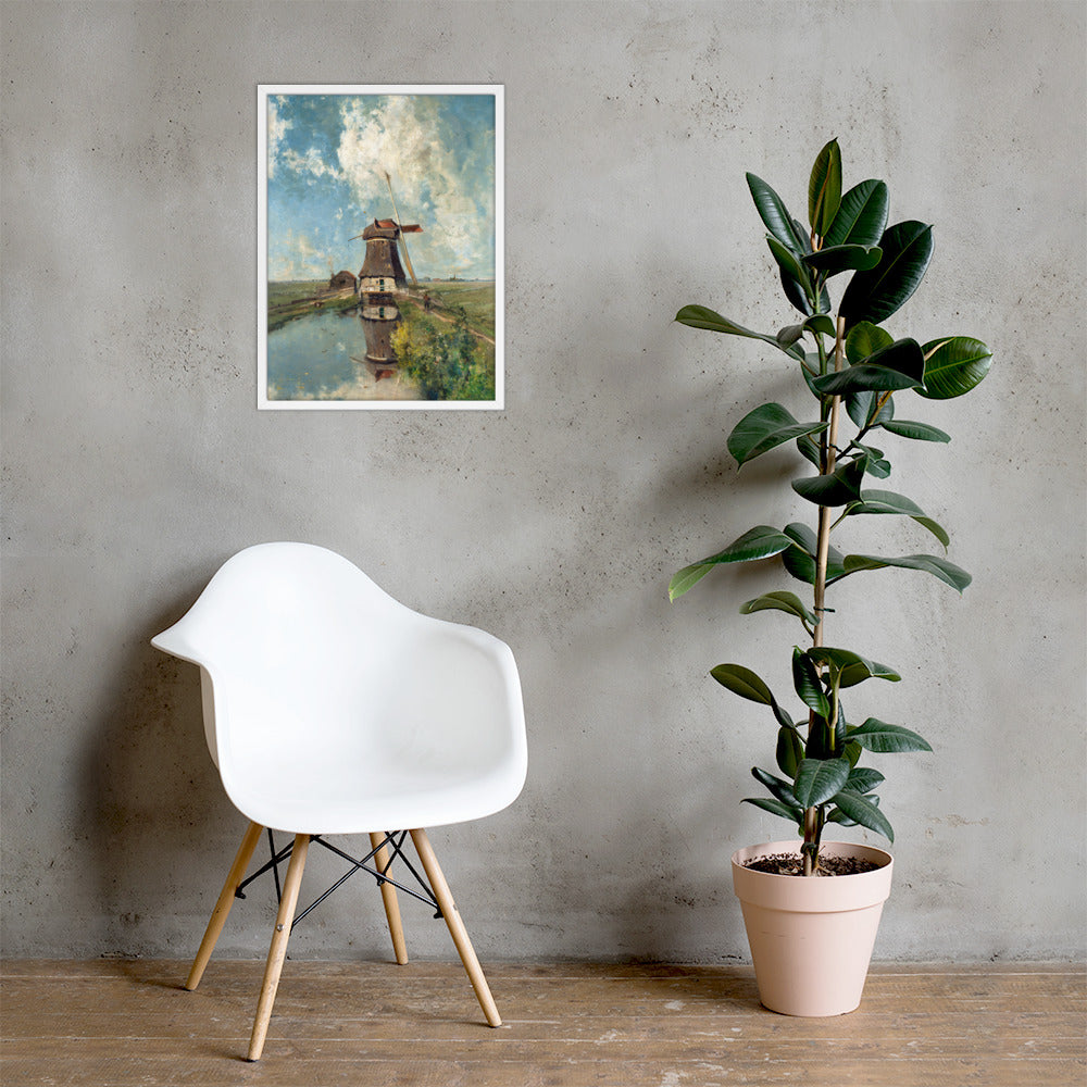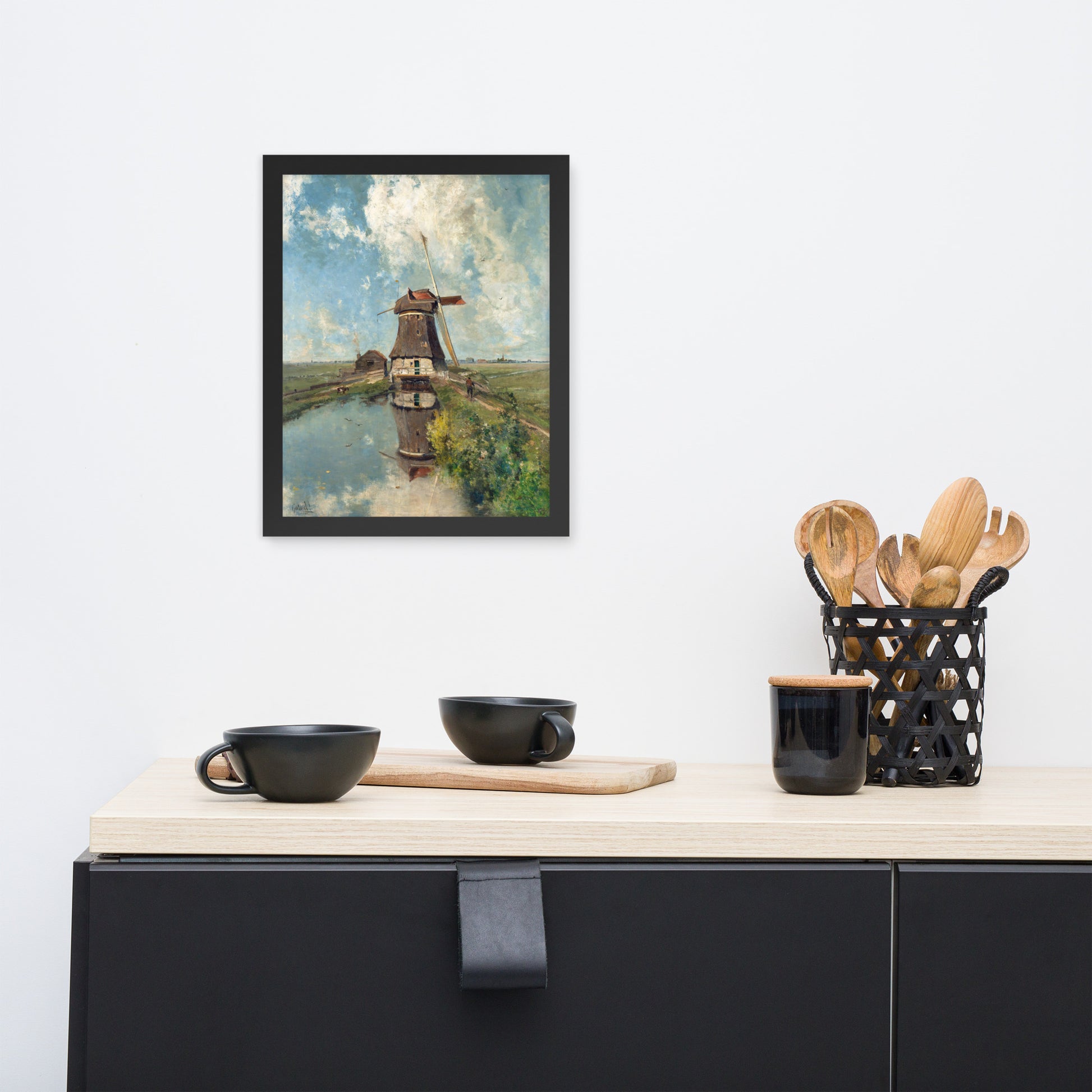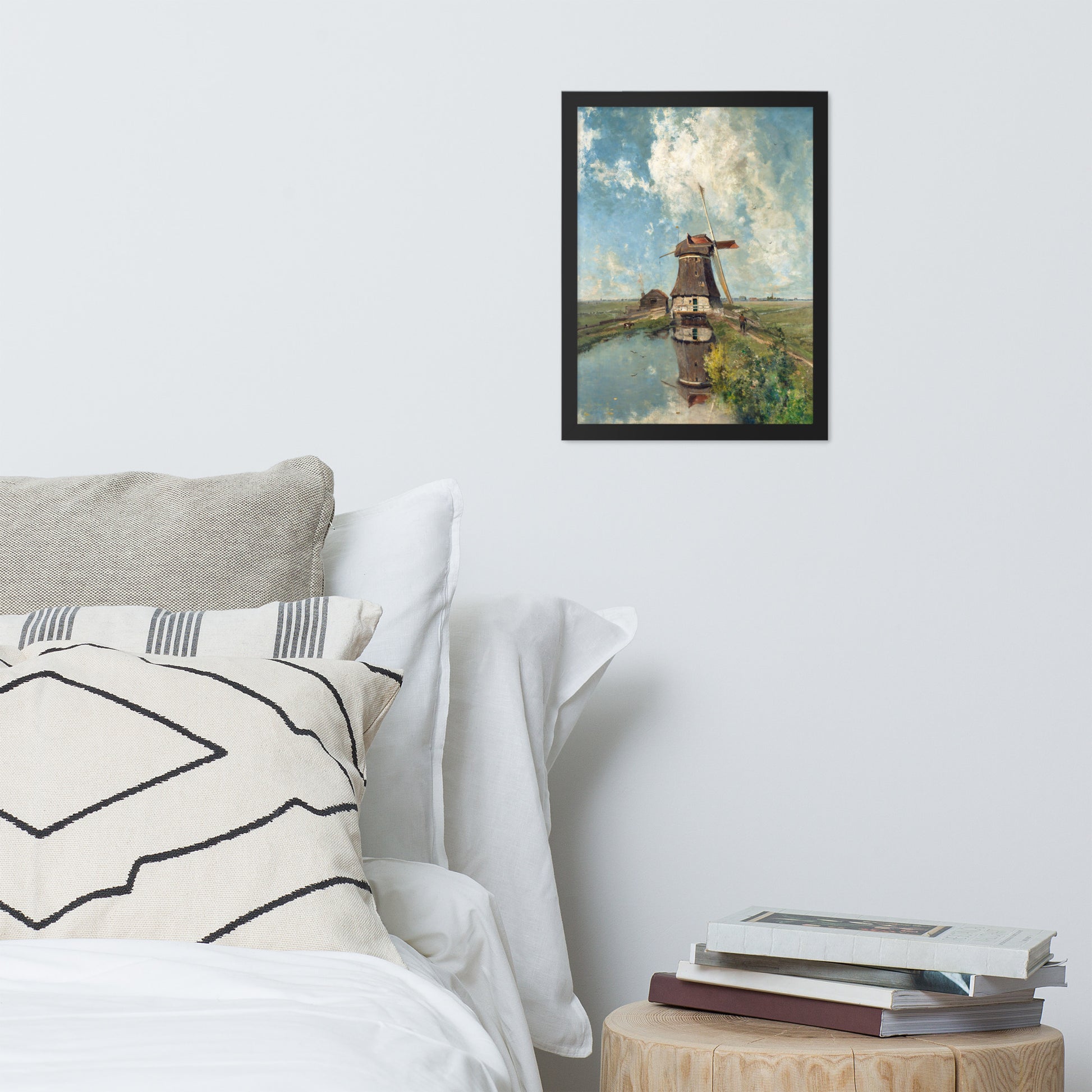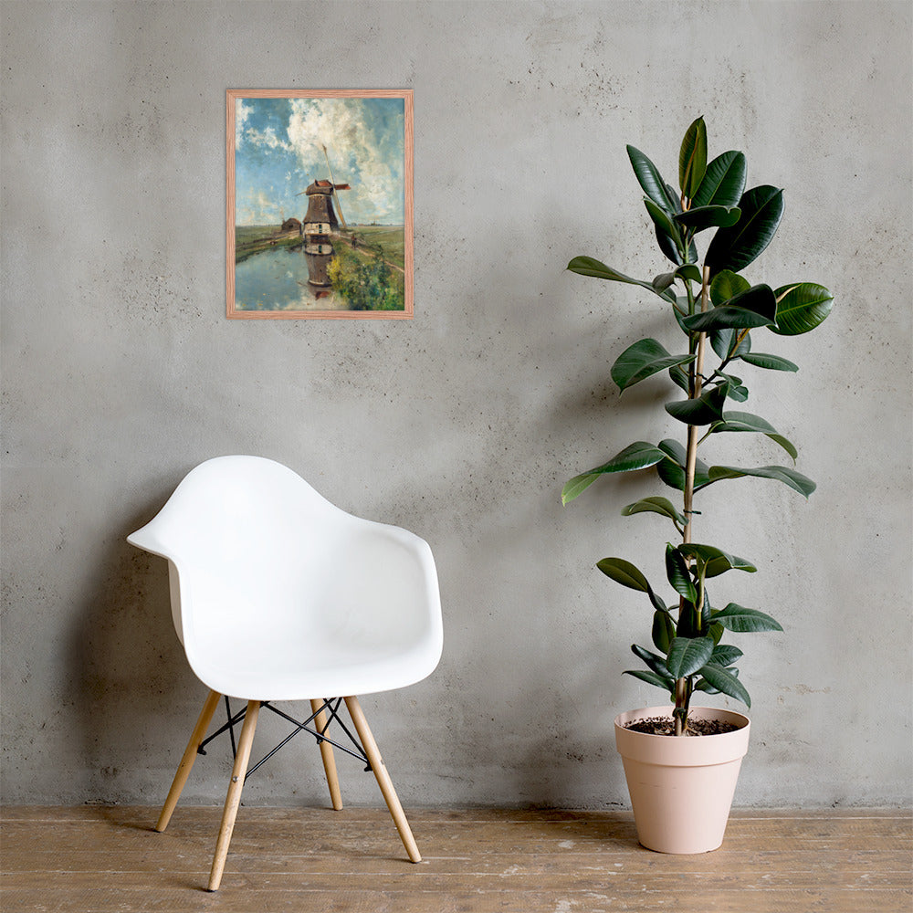 In the Month of July, by Paul Joseph Constantin Gabriël captures the quiet poetry of the Dutch countryside in midsummer. This framed wall print features a traditional windmill standing tall beside a tranquil canal, its reflection shimmering in the water below. A lone figure strolls along the grassy path, while soft clouds drift across a breezy sky—imbuing the scene with movement and serenity. The composition balances architectural charm with natural rhythm, making it a timeless piece for interiors that value warmth, heritage, and visual storytelling.