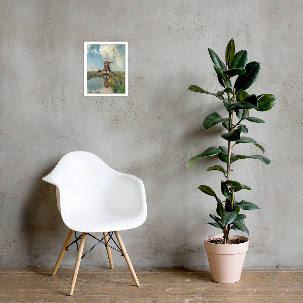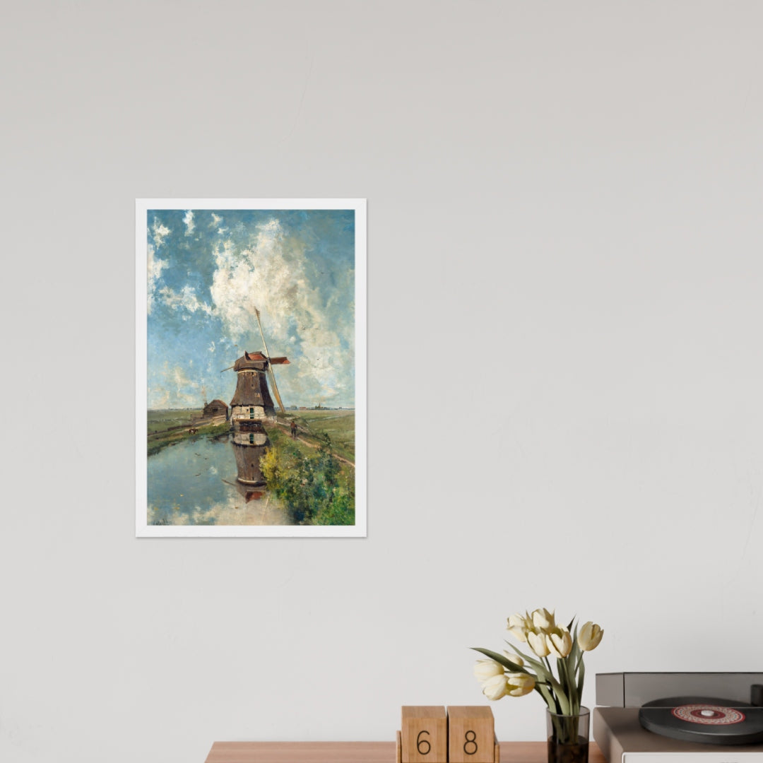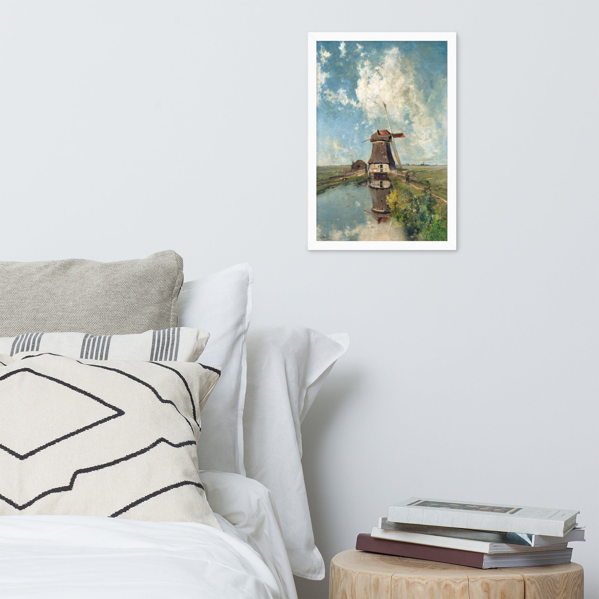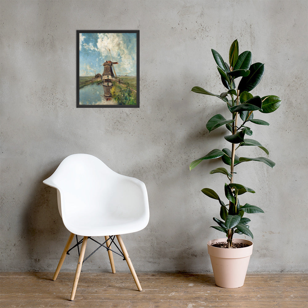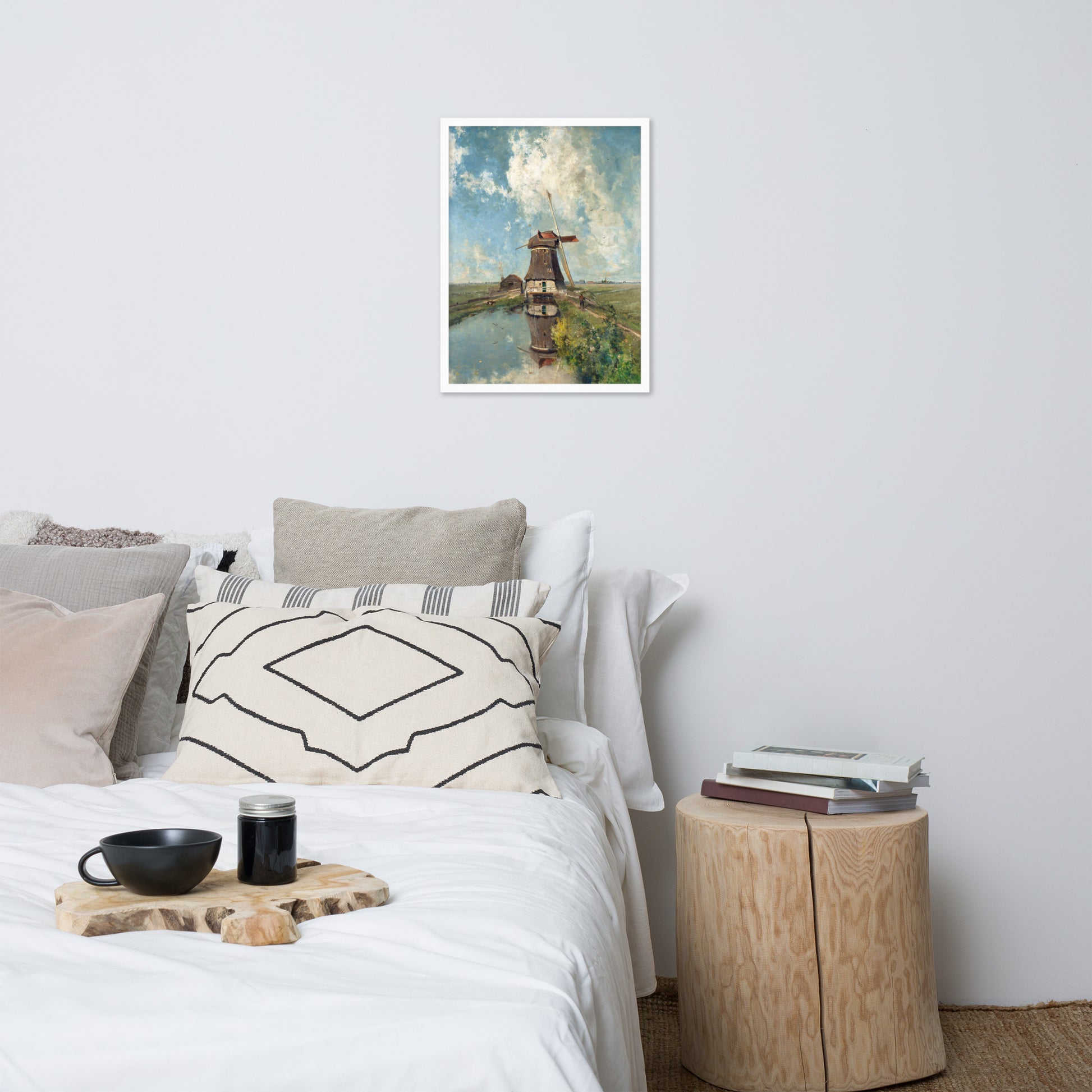 In the Month of July, by Paul Joseph Constantin Gabriël captures the quiet poetry of the Dutch countryside in midsummer. This framed wall print features a traditional windmill standing tall beside a tranquil canal, its reflection shimmering in the water below. A lone figure strolls along the grassy path, while soft clouds drift across a breezy sky—imbuing the scene with movement and serenity. The composition balances architectural charm with natural rhythm, making it a timeless piece for interiors that value warmth, heritage, and visual storytelling.