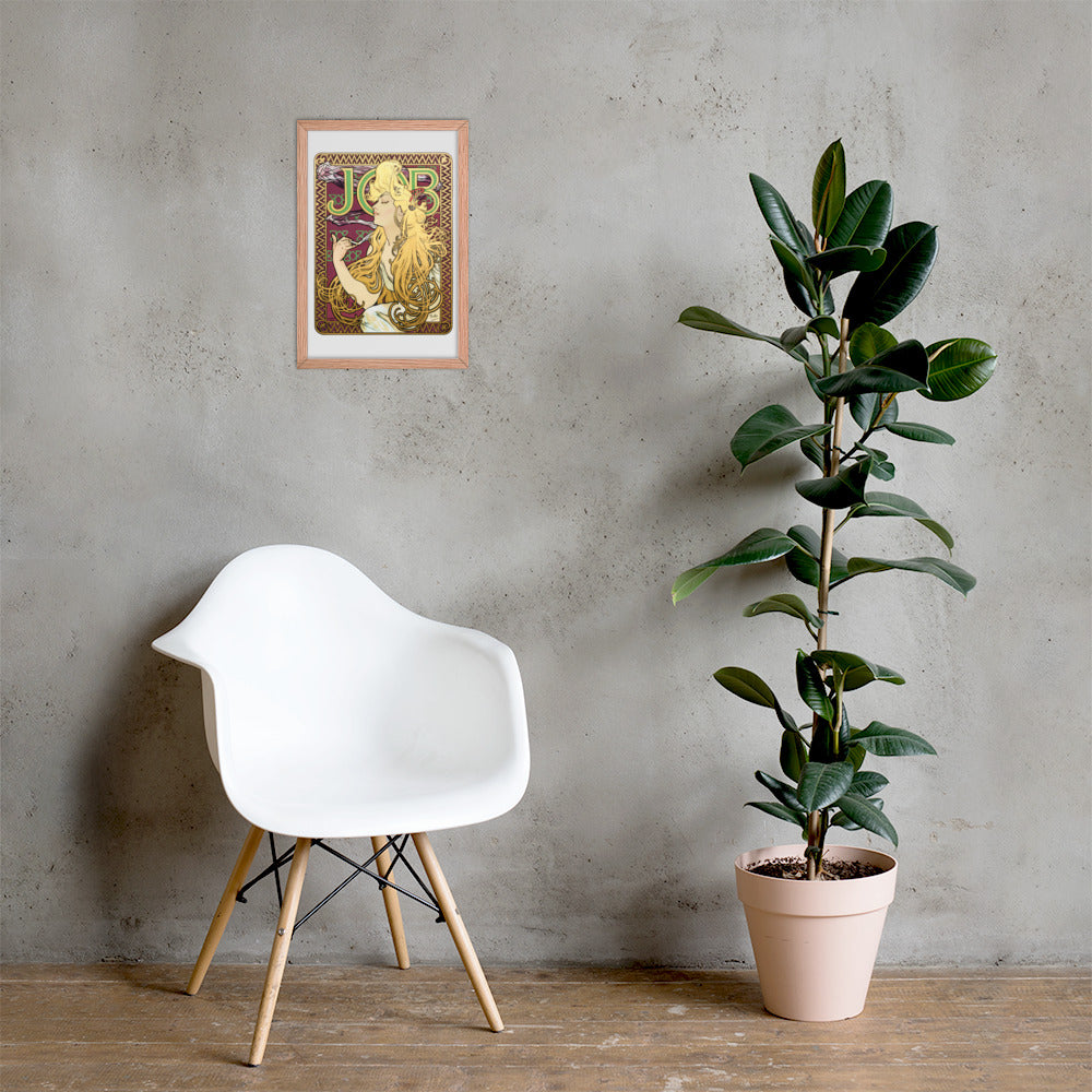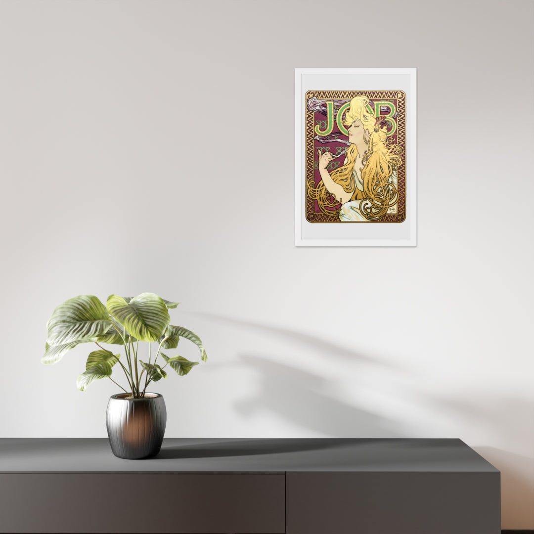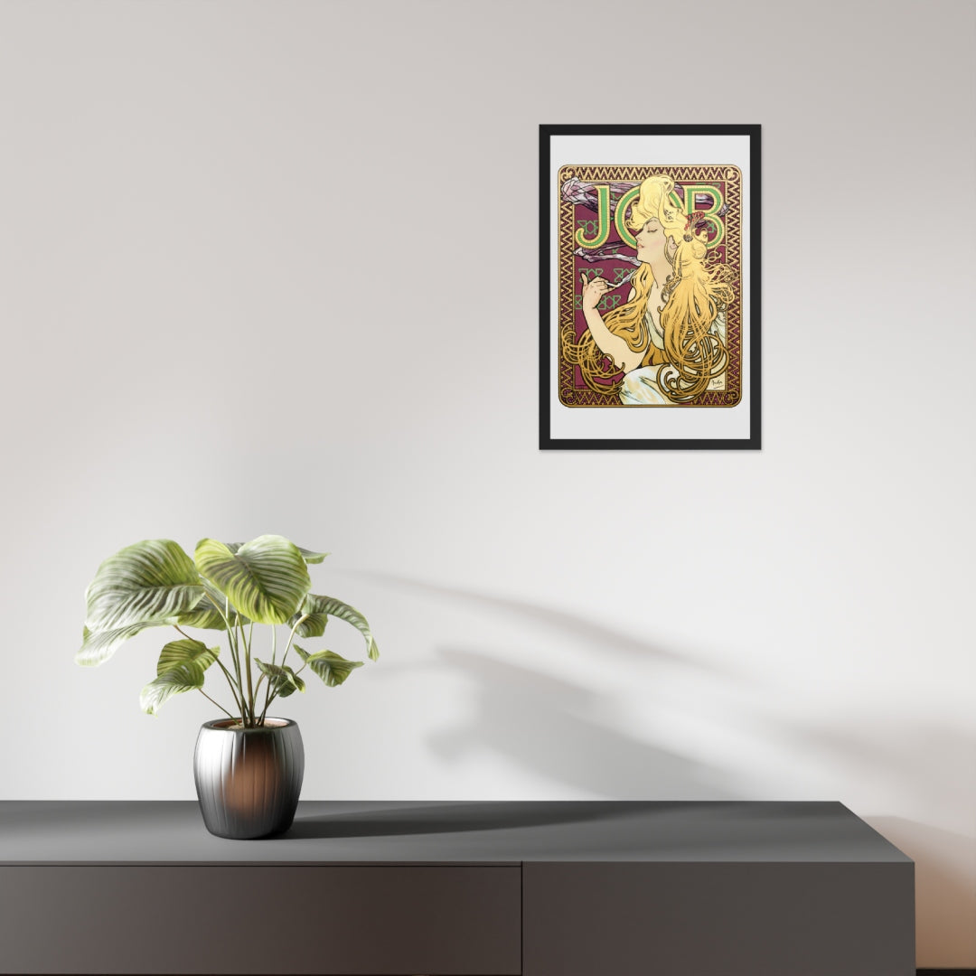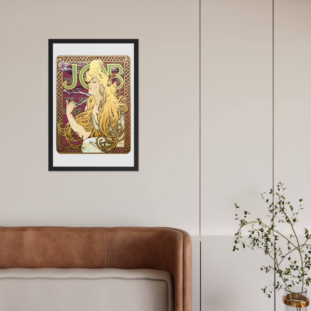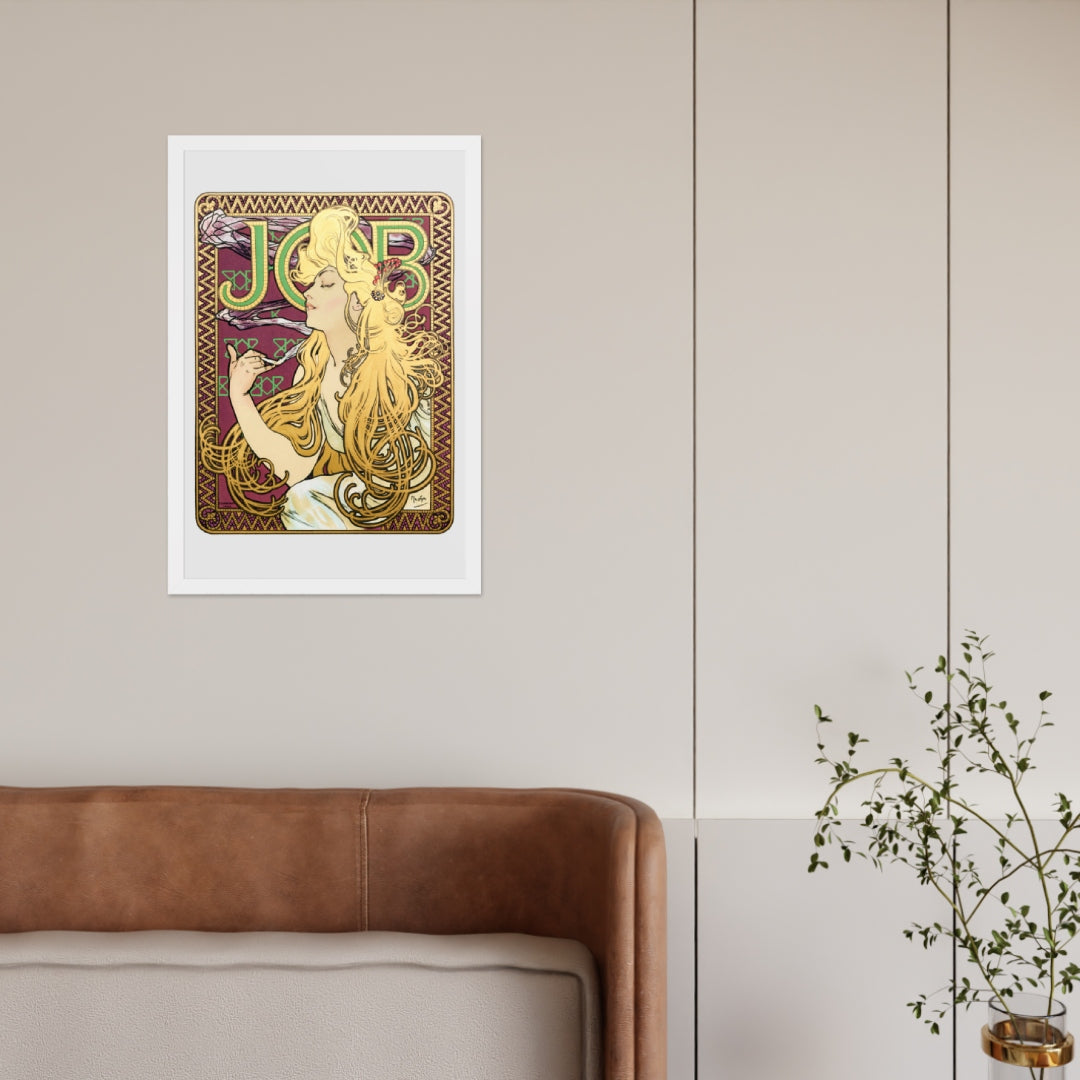 Immerse yourself in the golden decadence of Art Nouveau with Job by Alphonse Maria Mucha—a captivating framed wall print that celebrates elegance, indulgence, and ornamental design. This iconic illustration features a serene woman in profile, her long golden hair cascading in rhythmic waves as she holds a lit cigarette with effortless grace. Her closed eyes and tranquil expression evoke a moment of quiet luxury, while the curling smoke adds a sense of movement and mystique.