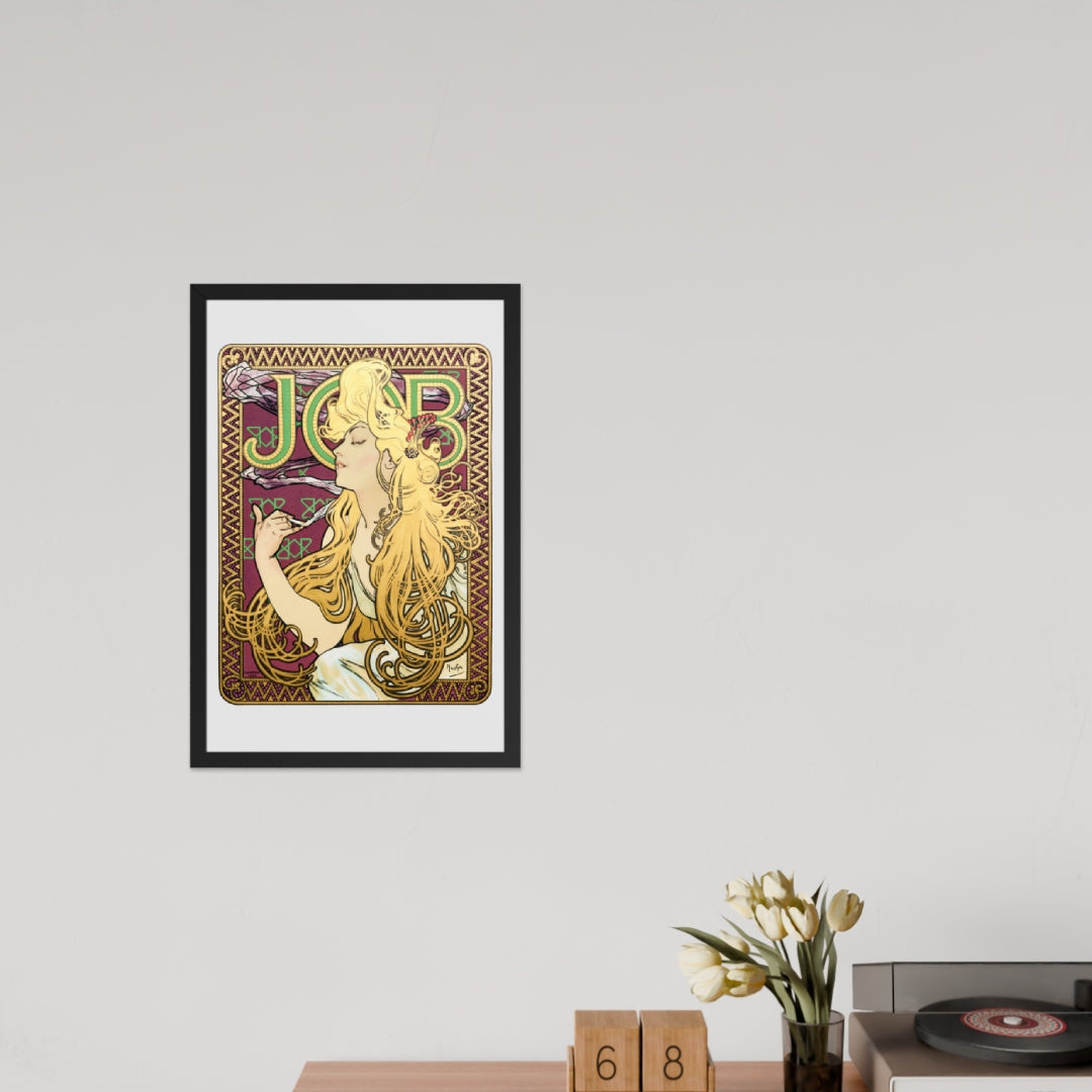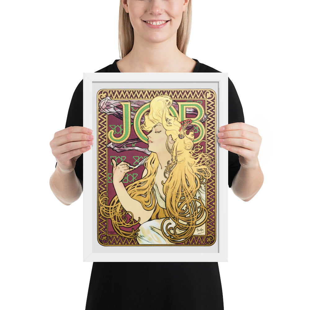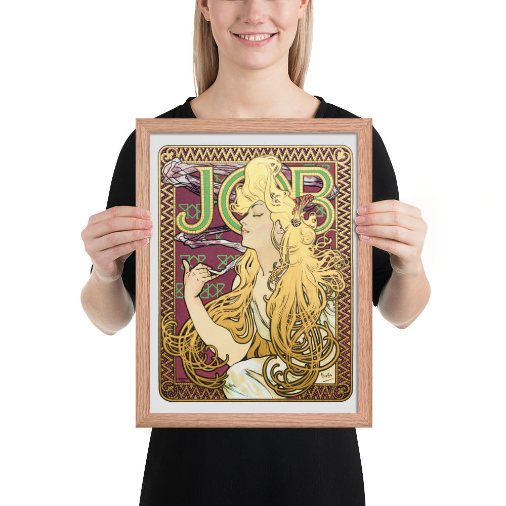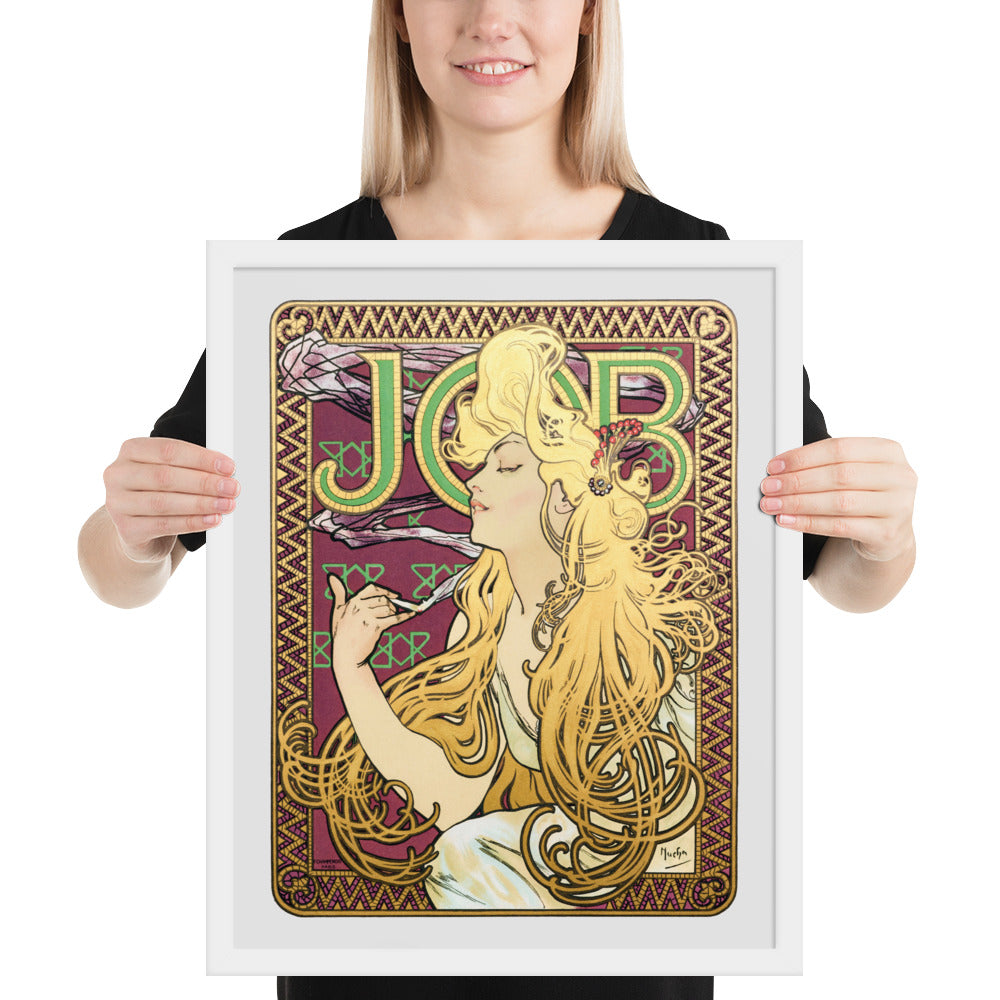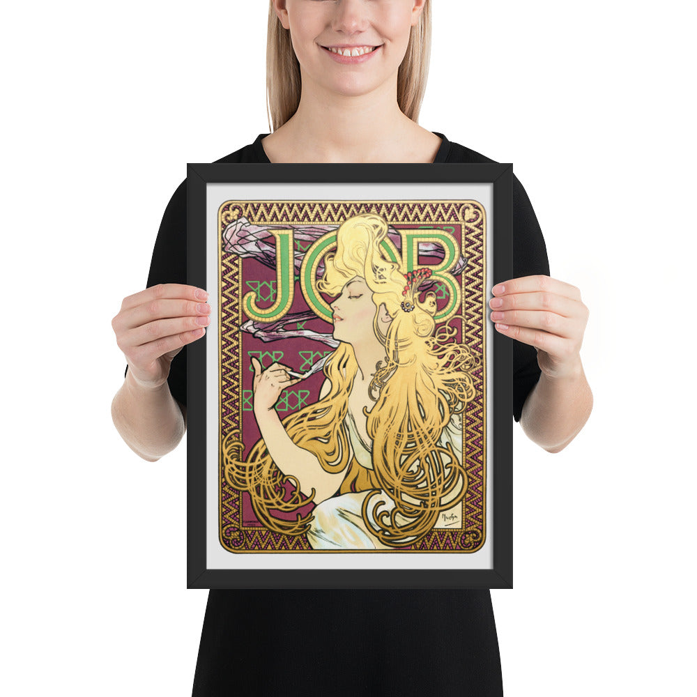 Immerse yourself in the golden decadence of Art Nouveau with Job by Alphonse Maria Mucha—a captivating framed wall print that celebrates elegance, indulgence, and ornamental design. This iconic illustration features a serene woman in profile, her long golden hair cascading in rhythmic waves as she holds a lit cigarette with effortless grace. Her closed eyes and tranquil expression evoke a moment of quiet luxury, while the curling smoke adds a sense of movement and mystique.