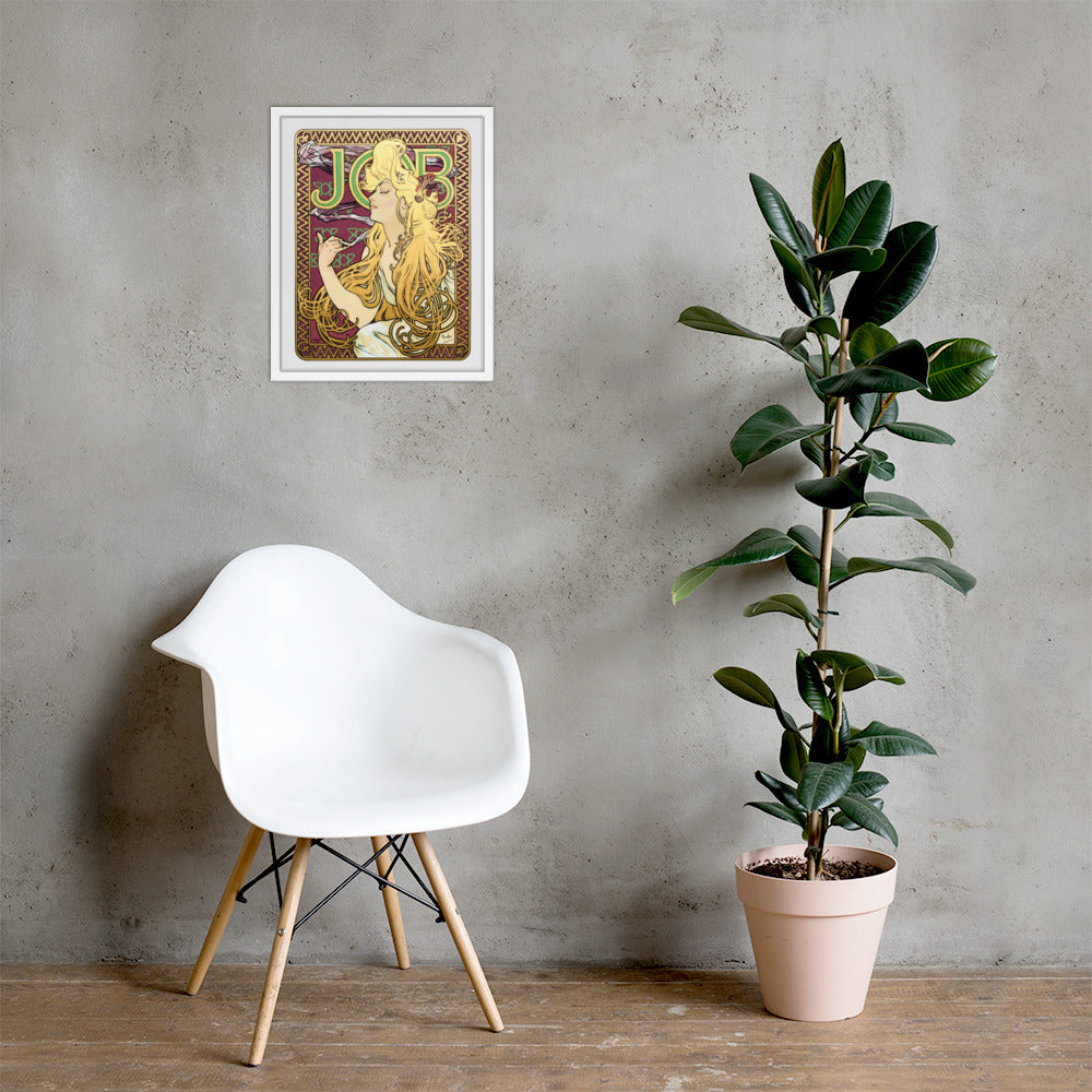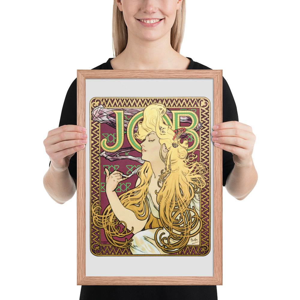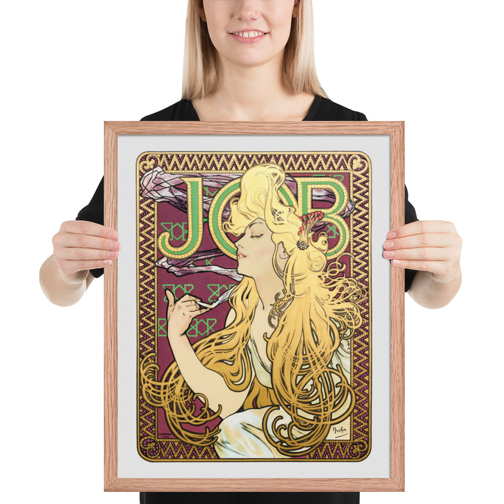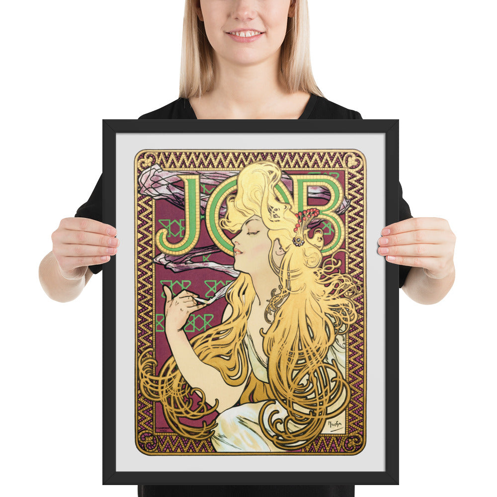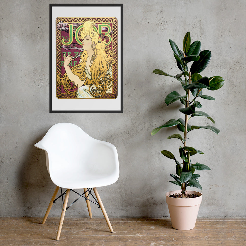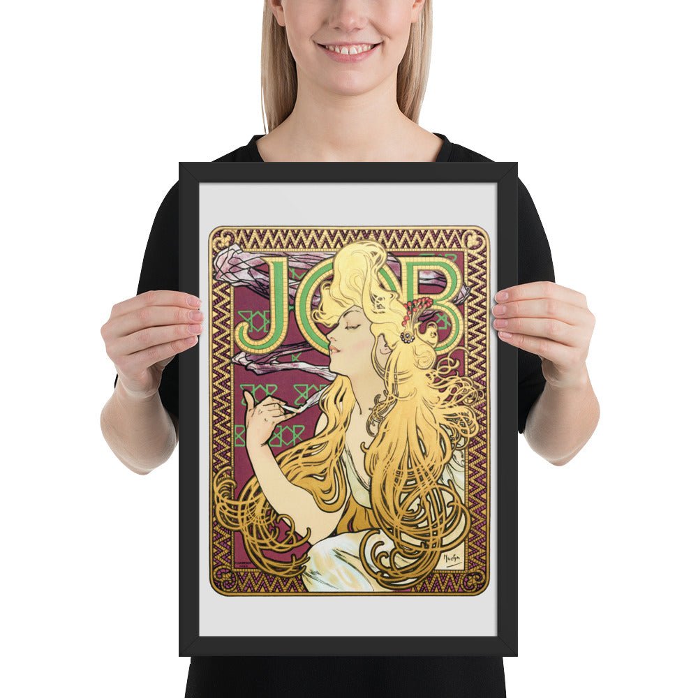 Immerse yourself in the golden decadence of Art Nouveau with Job by Alphonse Maria Mucha—a captivating framed wall print that celebrates elegance, indulgence, and ornamental design. This iconic illustration features a serene woman in profile, her long golden hair cascading in rhythmic waves as she holds a lit cigarette with effortless grace. Her closed eyes and tranquil expression evoke a moment of quiet luxury, while the curling smoke adds a sense of movement and mystique.