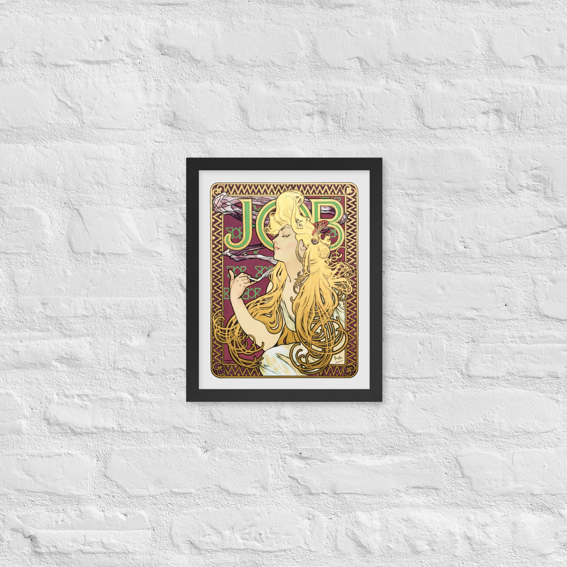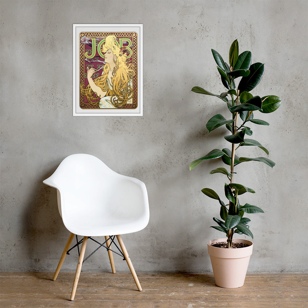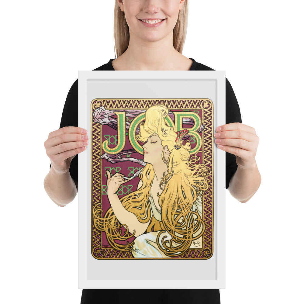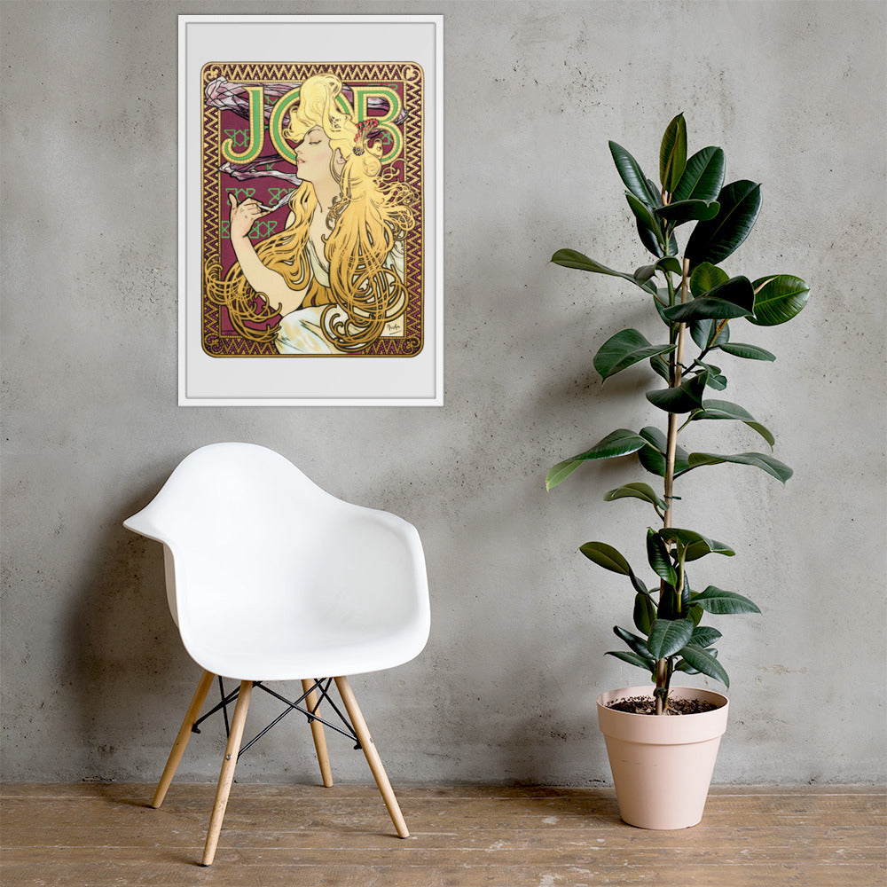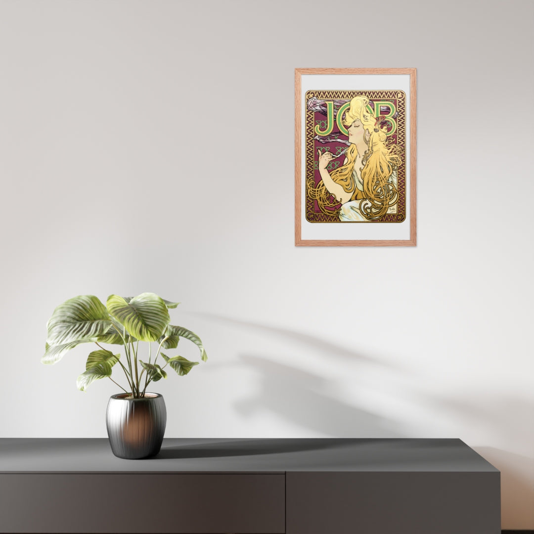Immerse yourself in the golden decadence of Art Nouveau with Job by Alphonse Maria Mucha—a captivating framed wall print that celebrates elegance, indulgence, and ornamental design. This iconic illustration features a serene woman in profile, her long golden hair cascading in rhythmic waves as she holds a lit cigarette with effortless grace. Her closed eyes and tranquil expression evoke a moment of quiet luxury, while the curling smoke adds a sense of movement and mystique.