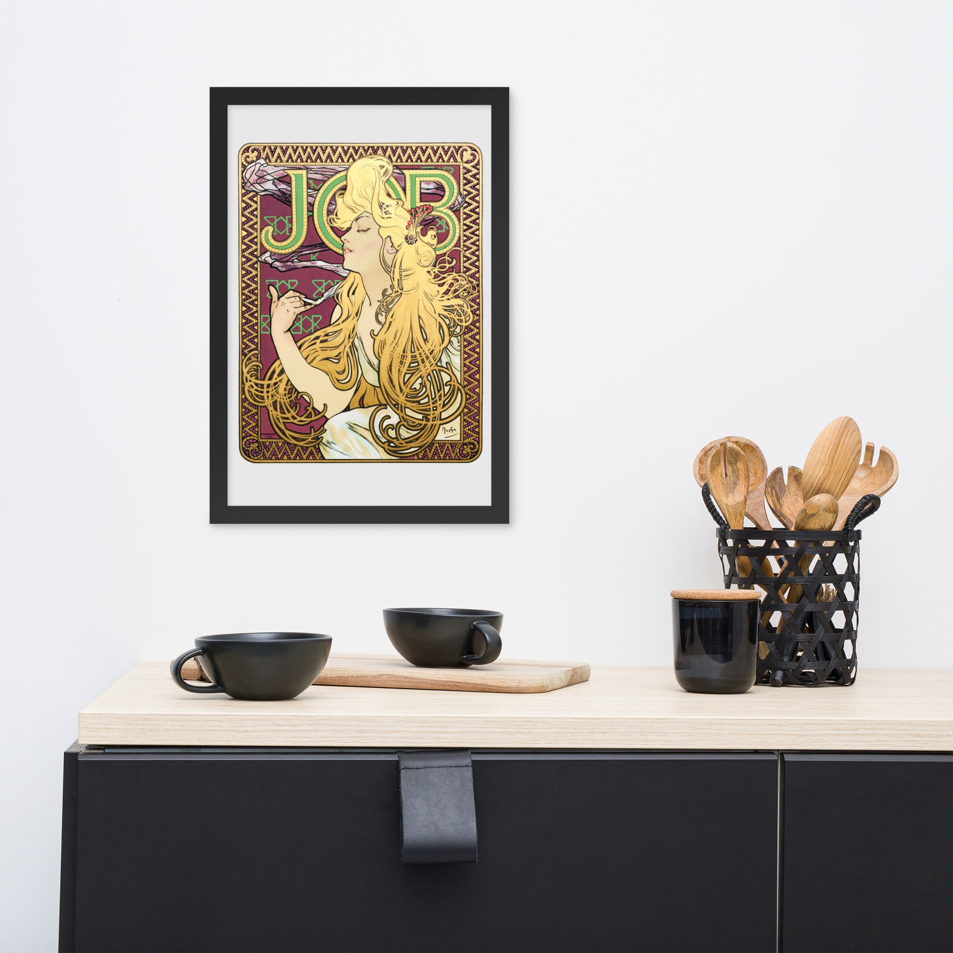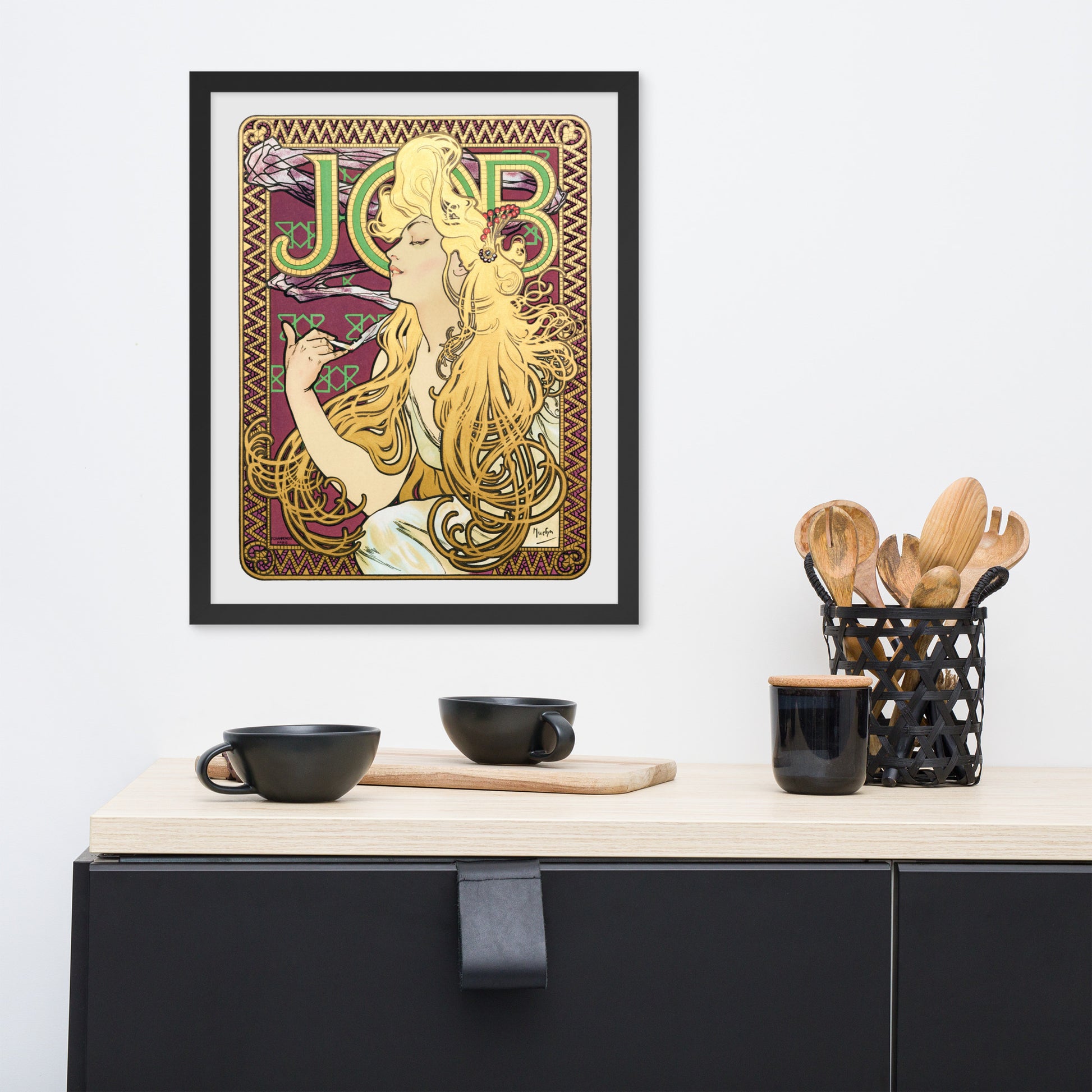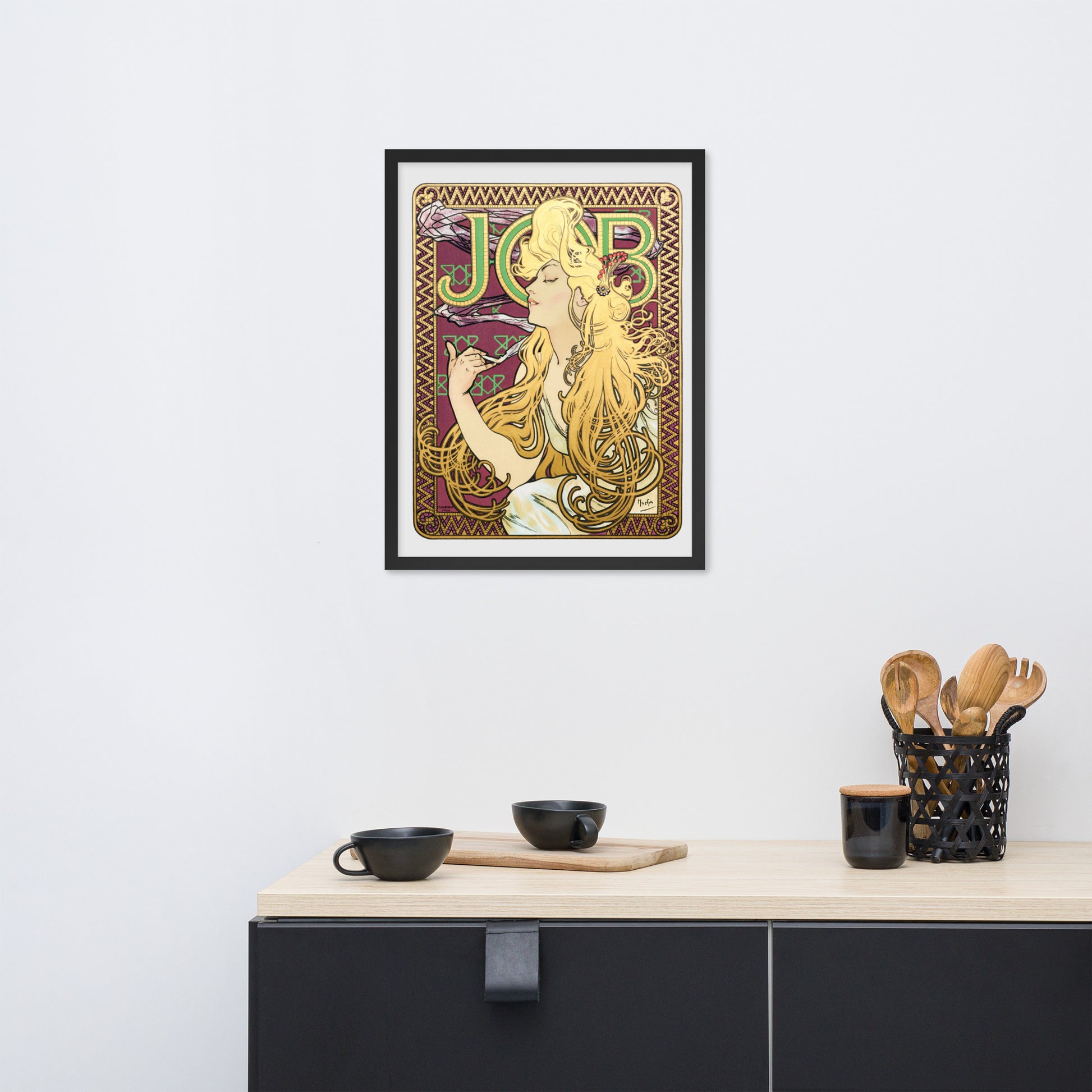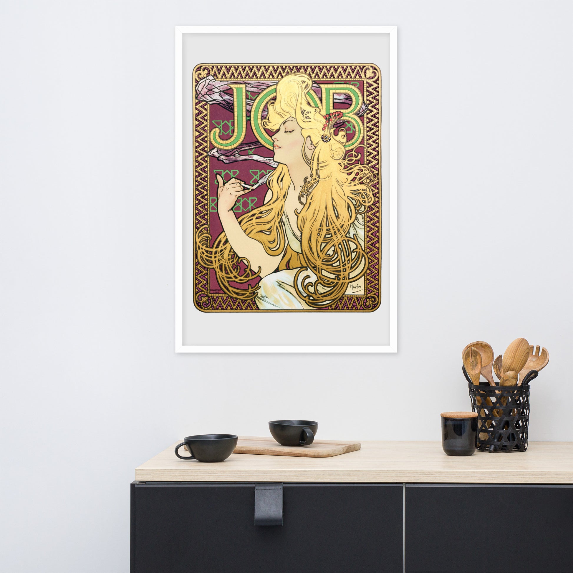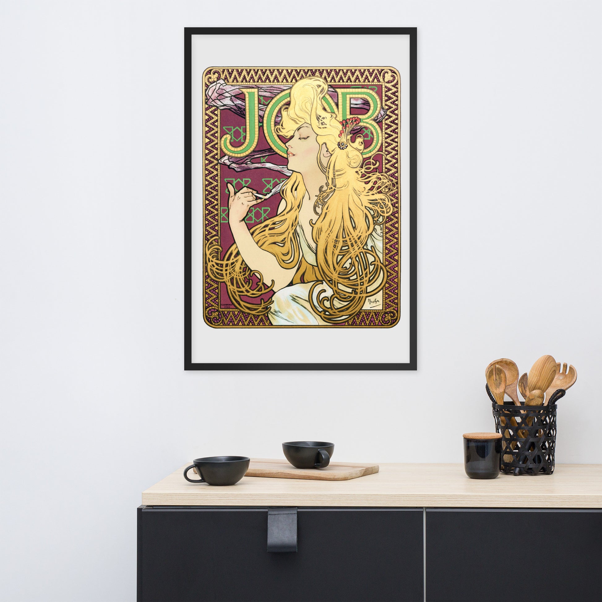 Immerse yourself in the golden decadence of Art Nouveau with Job by Alphonse Maria Mucha—a captivating framed wall print that celebrates elegance, indulgence, and ornamental design. This iconic illustration features a serene woman in profile, her long golden hair cascading in rhythmic waves as she holds a lit cigarette with effortless grace. Her closed eyes and tranquil expression evoke a moment of quiet luxury, while the curling smoke adds a sense of movement and mystique.