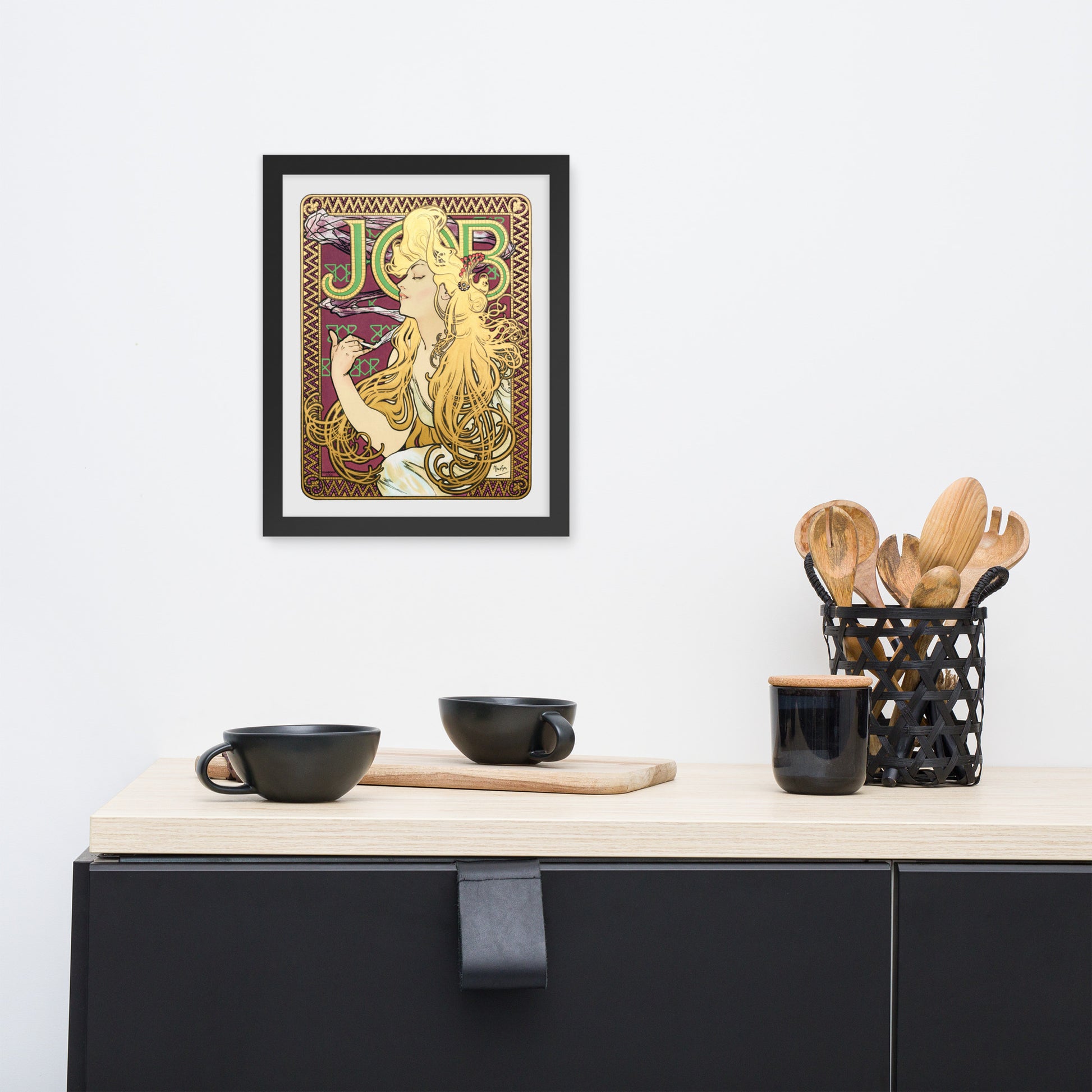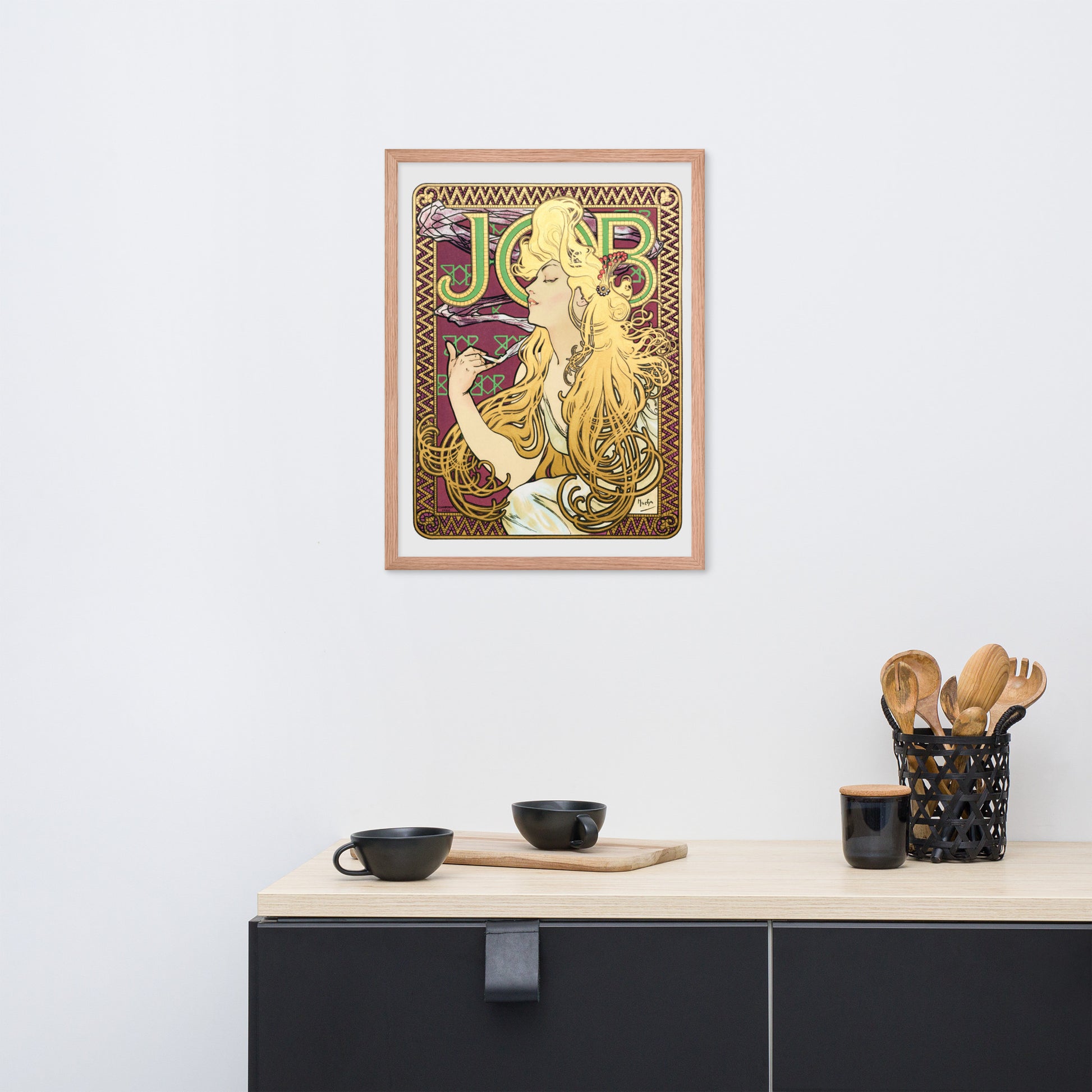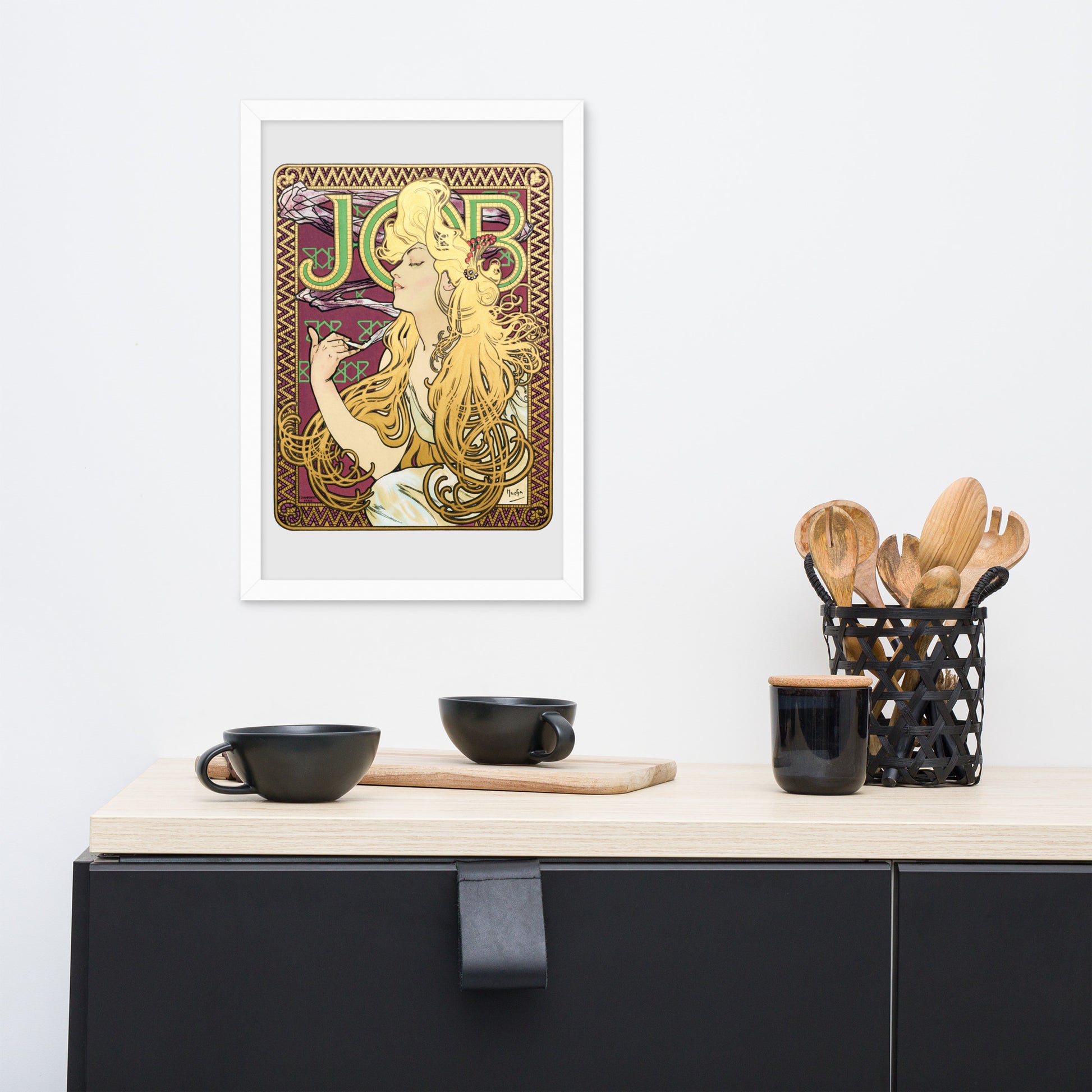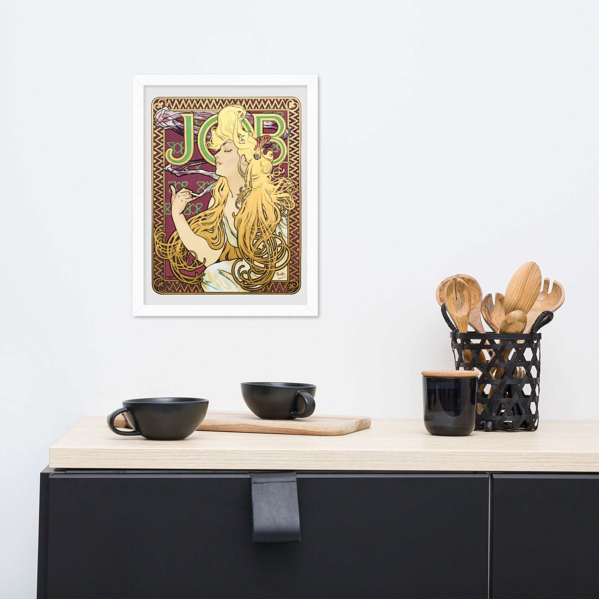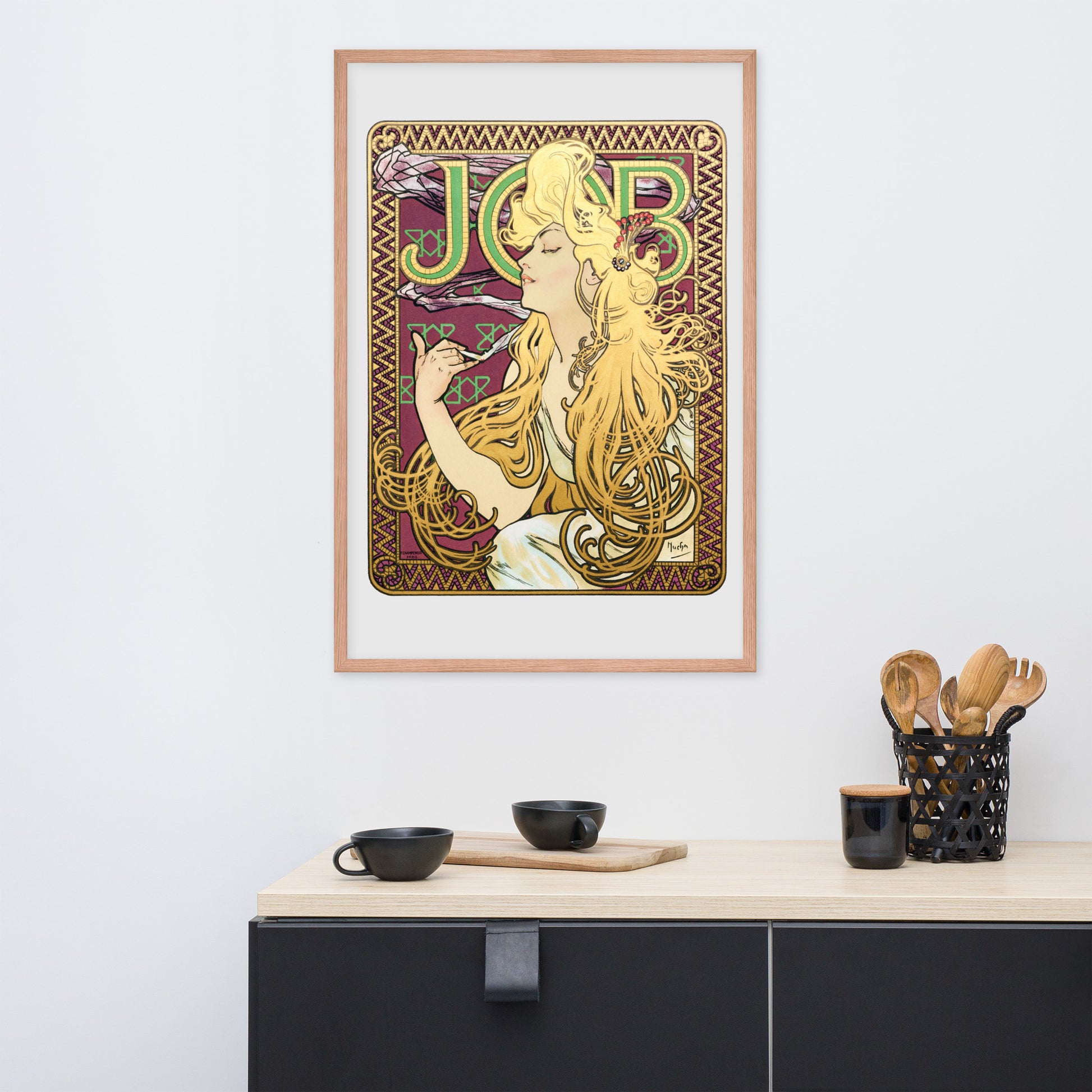 Immerse yourself in the golden decadence of Art Nouveau with Job by Alphonse Maria Mucha—a captivating framed wall print that celebrates elegance, indulgence, and ornamental design. This iconic illustration features a serene woman in profile, her long golden hair cascading in rhythmic waves as she holds a lit cigarette with effortless grace. Her closed eyes and tranquil expression evoke a moment of quiet luxury, while the curling smoke adds a sense of movement and mystique.