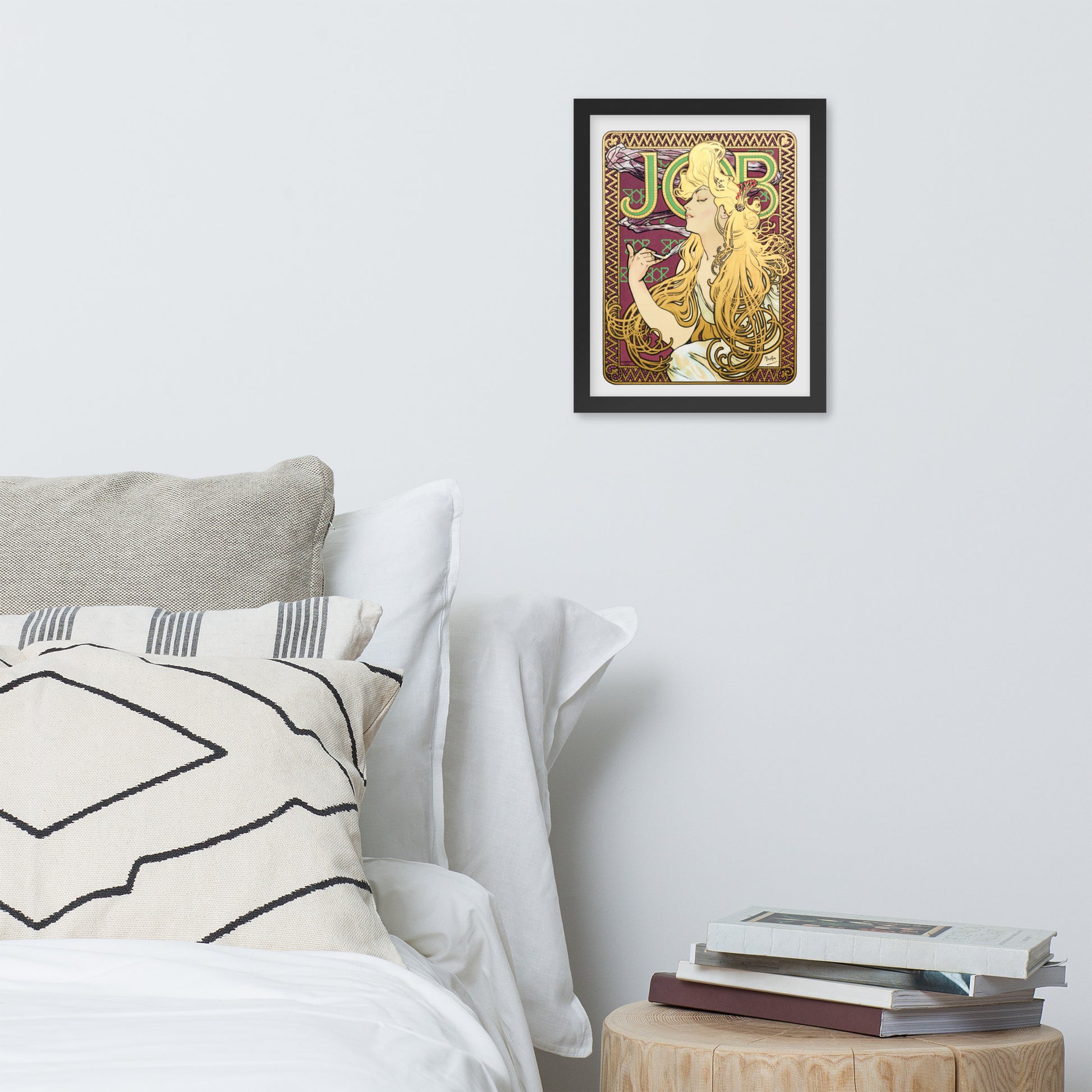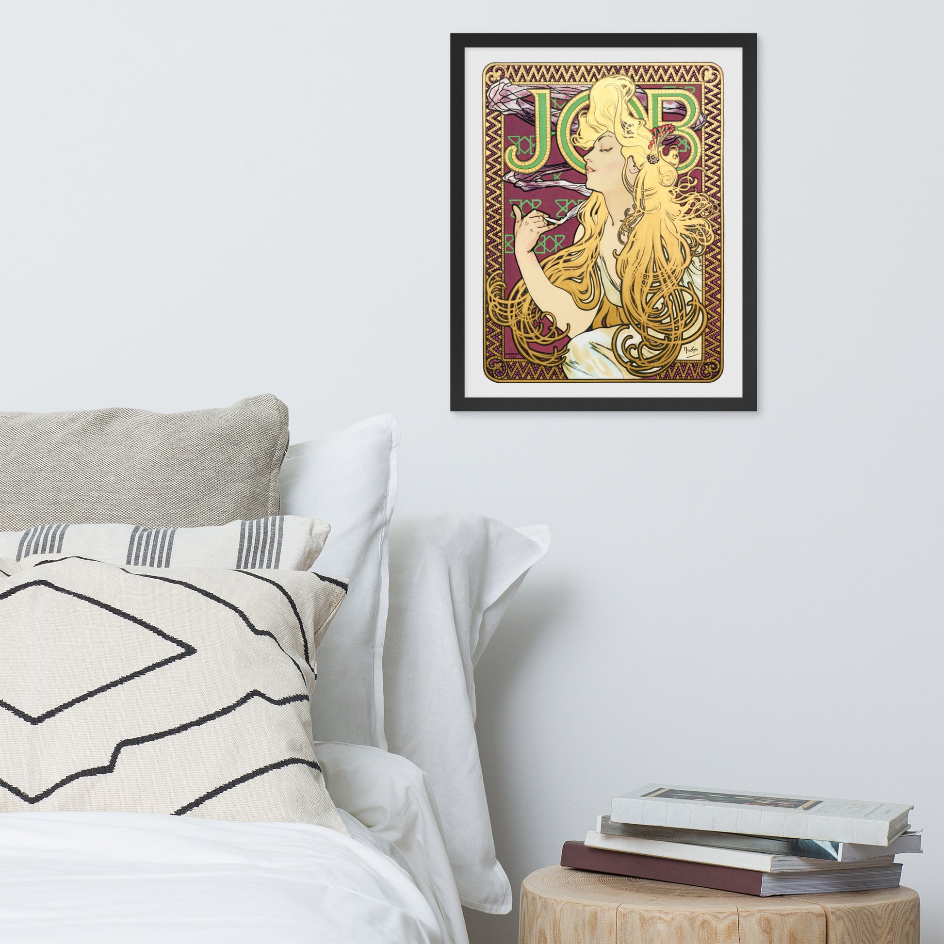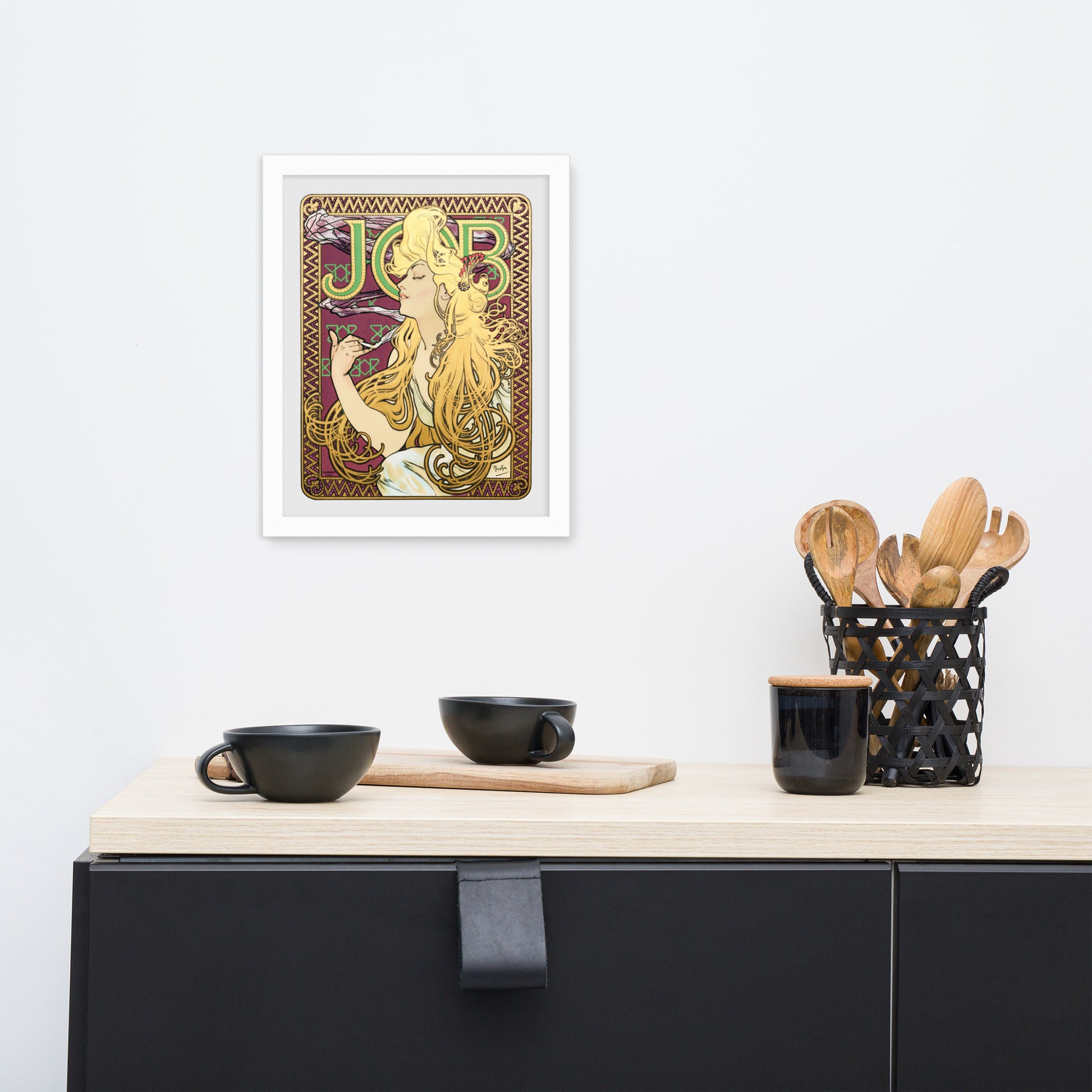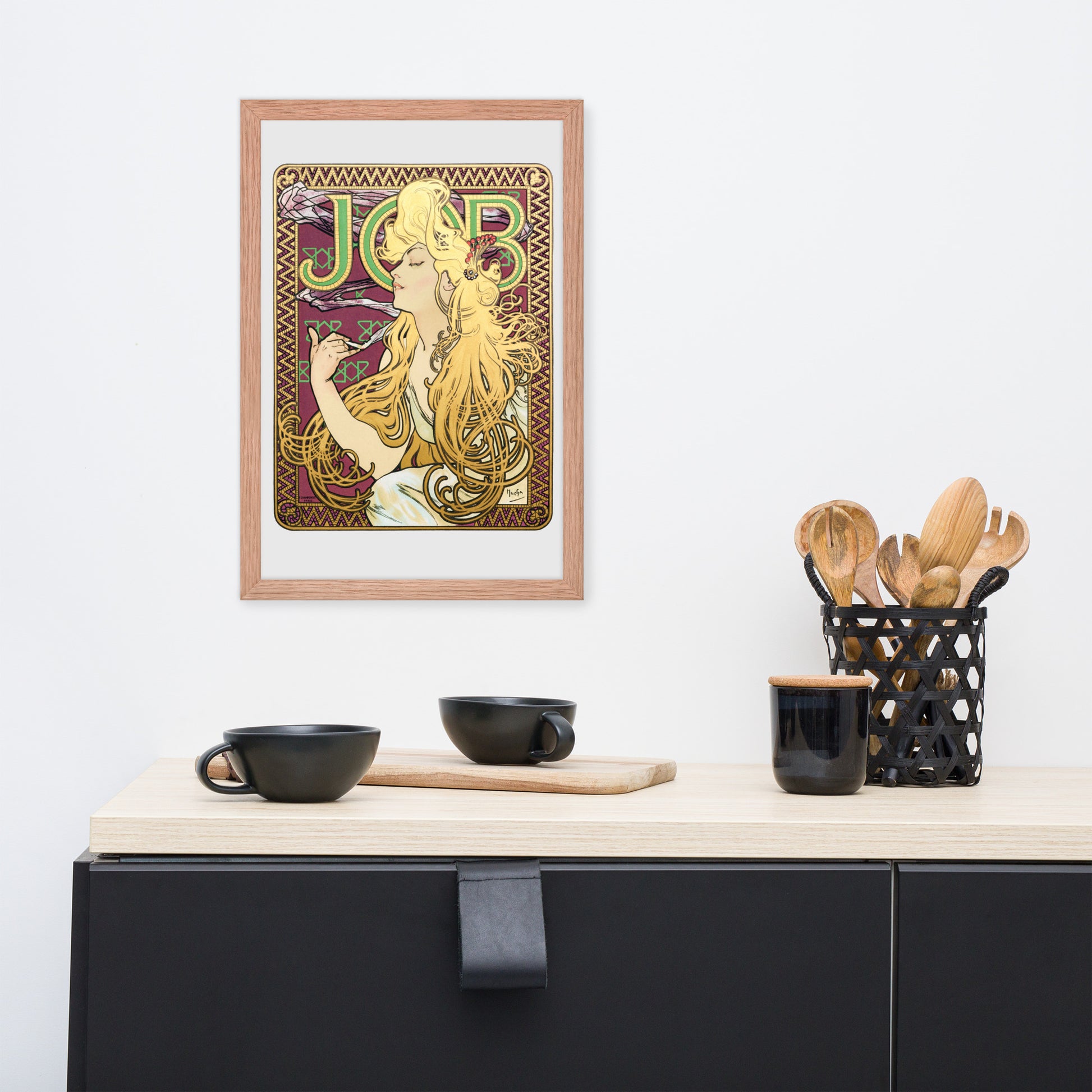 Immerse yourself in the golden decadence of Art Nouveau with Job by Alphonse Maria Mucha—a captivating framed wall print that celebrates elegance, indulgence, and ornamental design. This iconic illustration features a serene woman in profile, her long golden hair cascading in rhythmic waves as she holds a lit cigarette with effortless grace. Her closed eyes and tranquil expression evoke a moment of quiet luxury, while the curling smoke adds a sense of movement and mystique.
