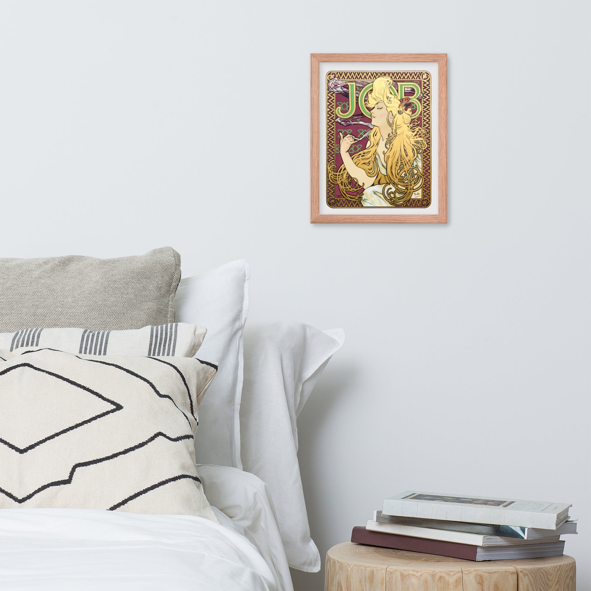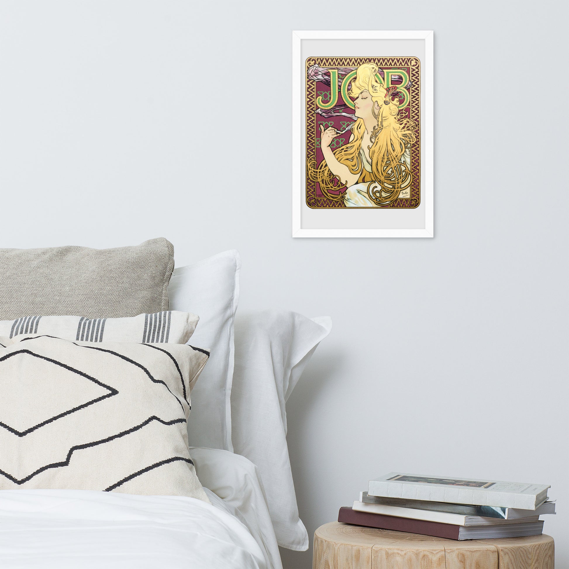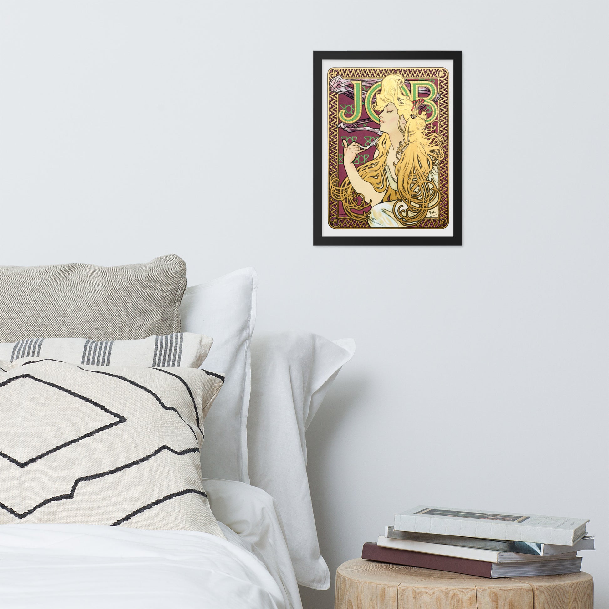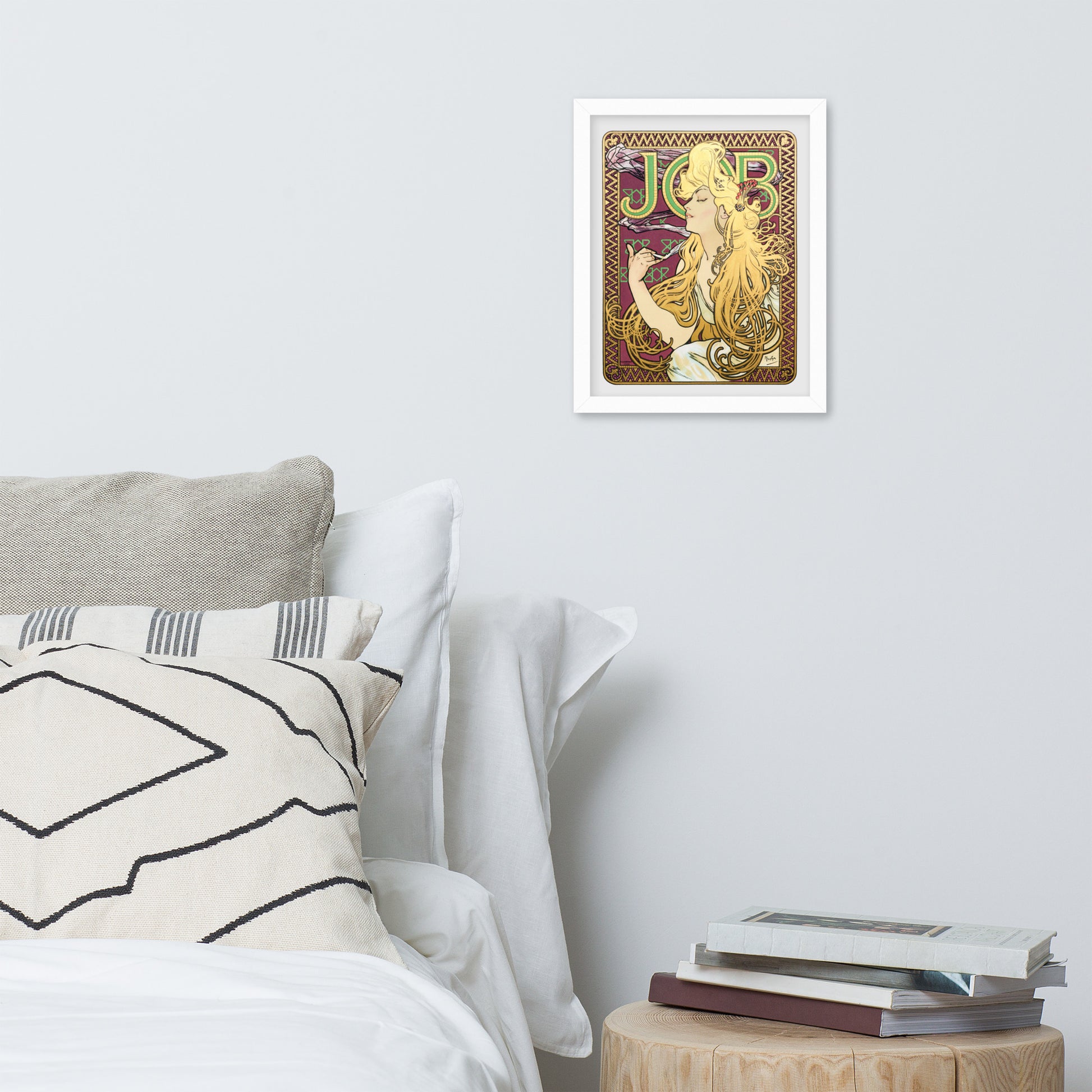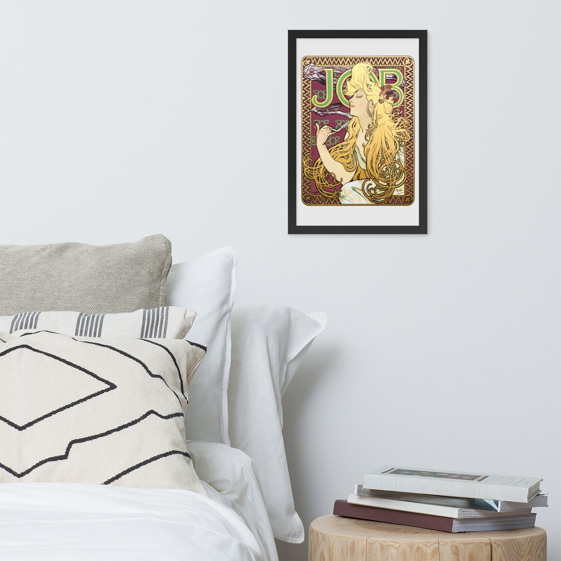 Immerse yourself in the golden decadence of Art Nouveau with Job by Alphonse Maria Mucha—a captivating framed wall print that celebrates elegance, indulgence, and ornamental design. This iconic illustration features a serene woman in profile, her long golden hair cascading in rhythmic waves as she holds a lit cigarette with effortless grace. Her closed eyes and tranquil expression evoke a moment of quiet luxury, while the curling smoke adds a sense of movement and mystique.