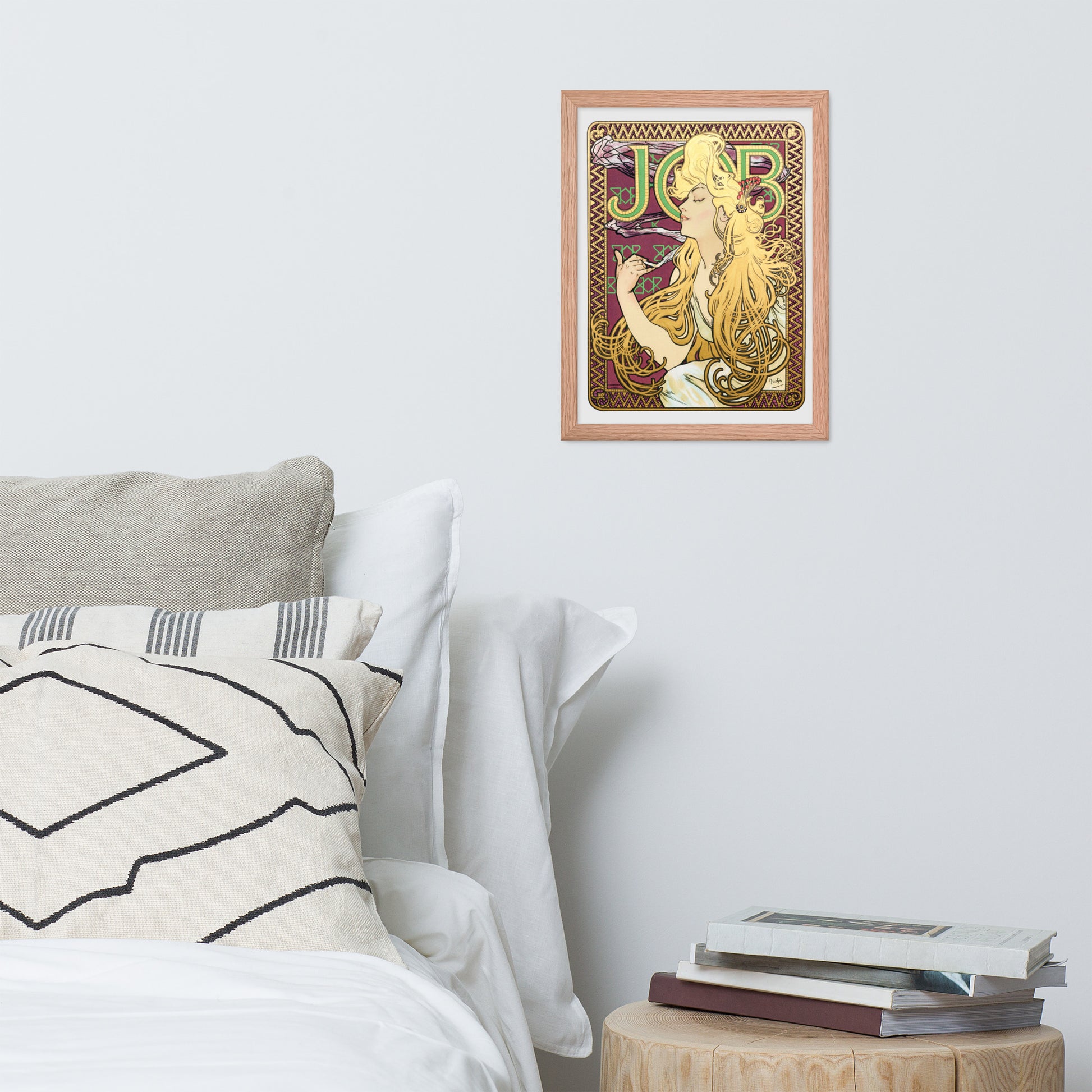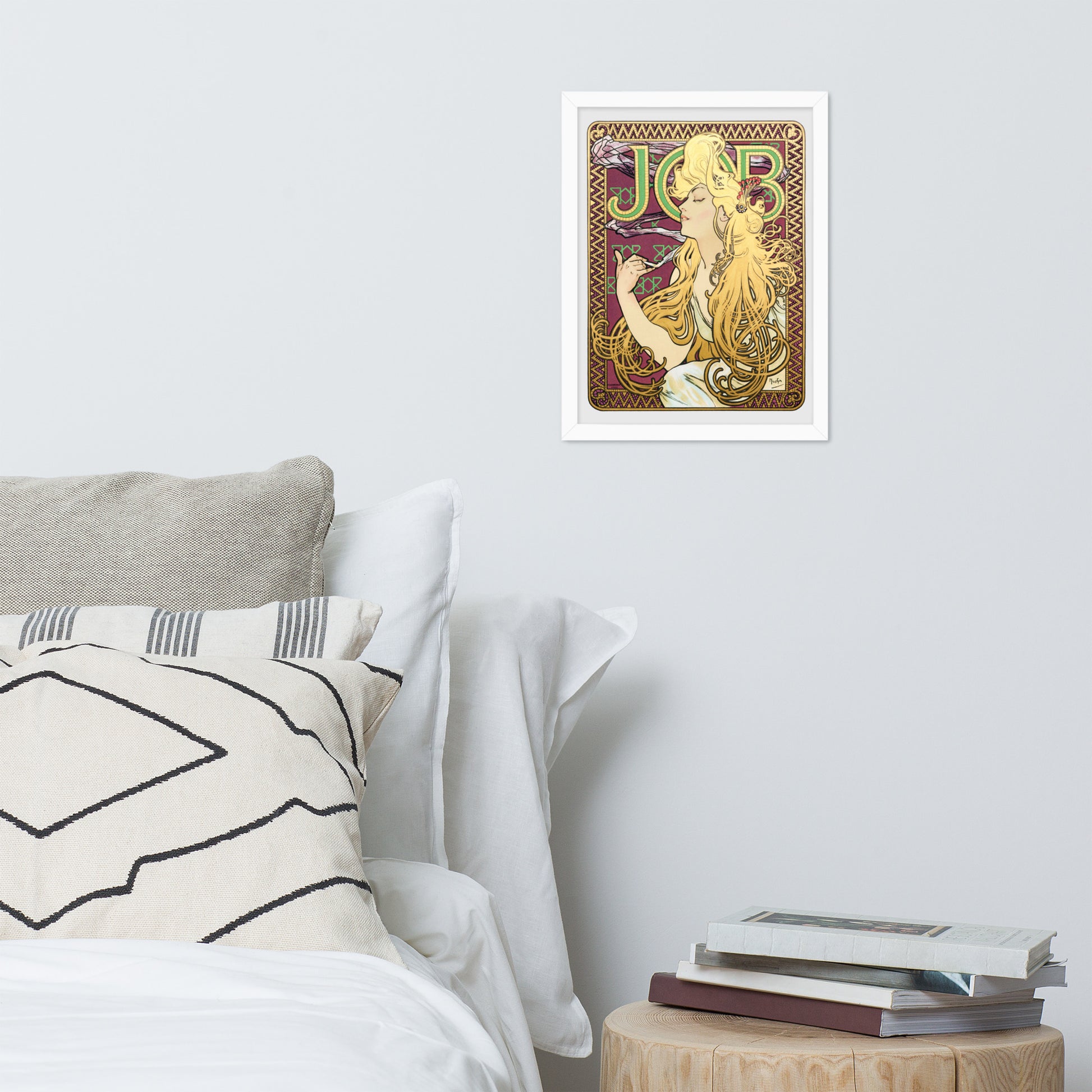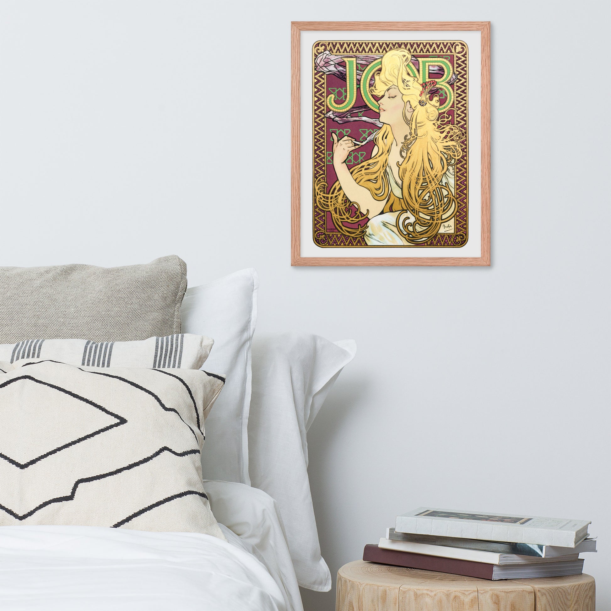 Behind her, a richly patterned backdrop unfolds in hues of purple, green, and gold, crowned by the bold “JOB” lettering—an homage to the vintage French advertisement for cigarette papers. Mucha’s signature style shines through in every detail: organic forms, flowing lines, and a harmonious interplay of color and texture. The composition is both sensual and symbolic, blending commercial art with timeless beauty.
