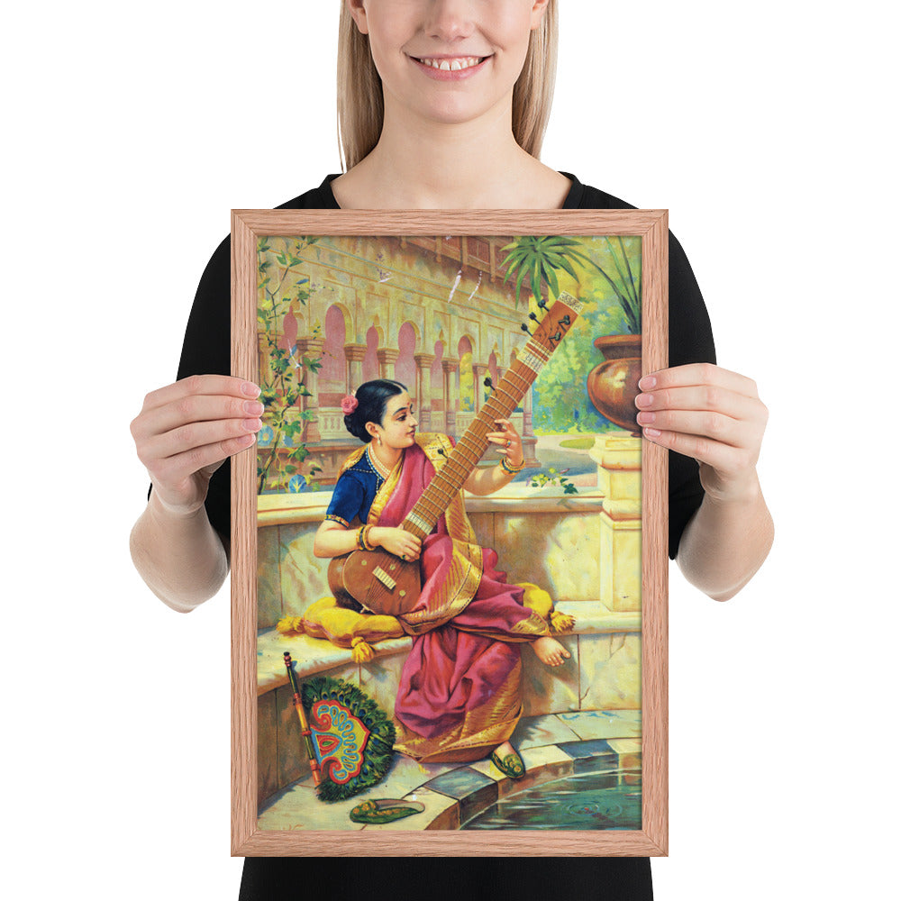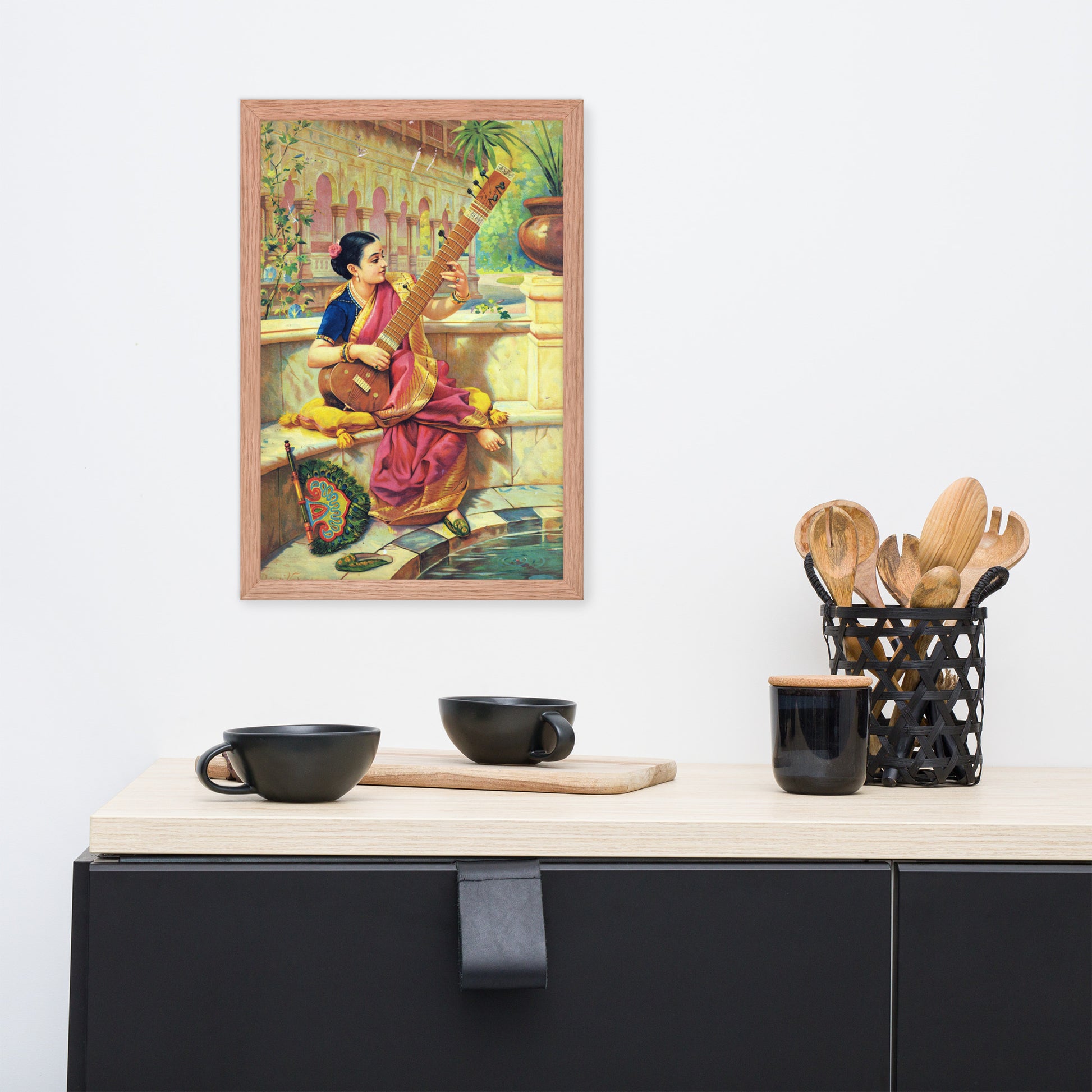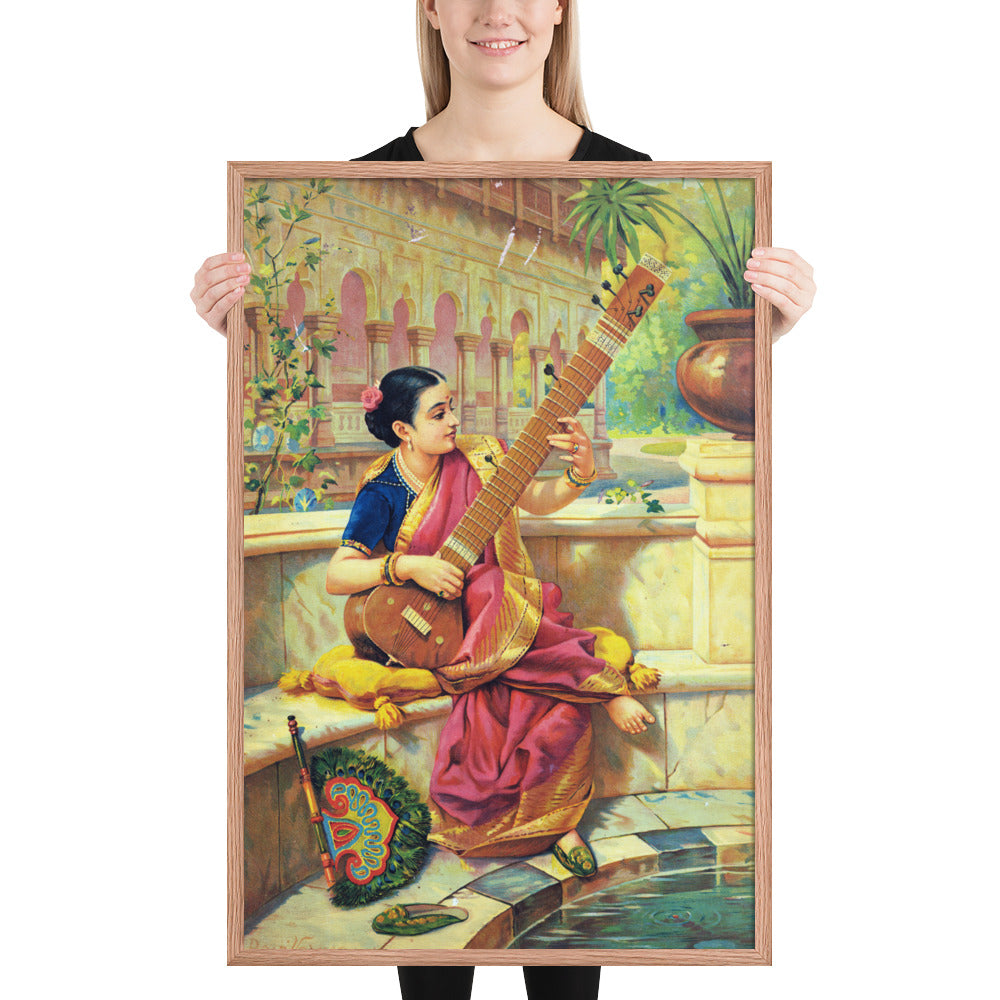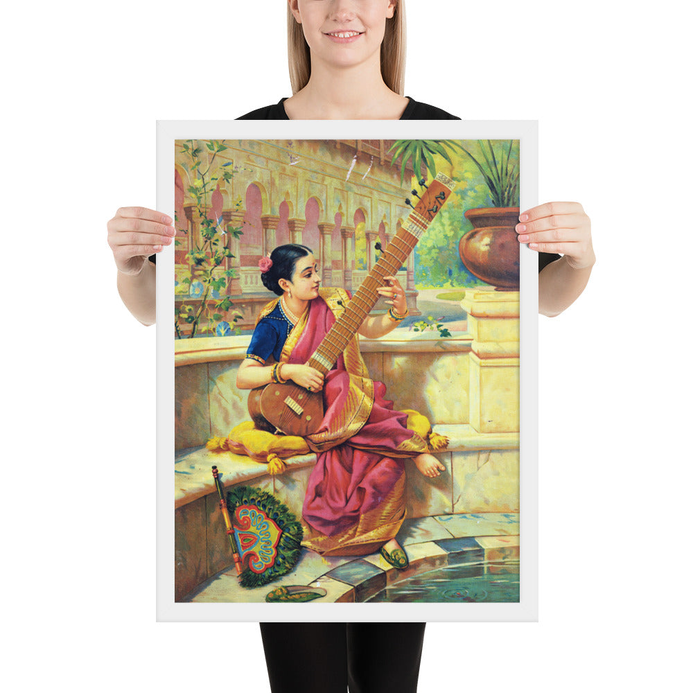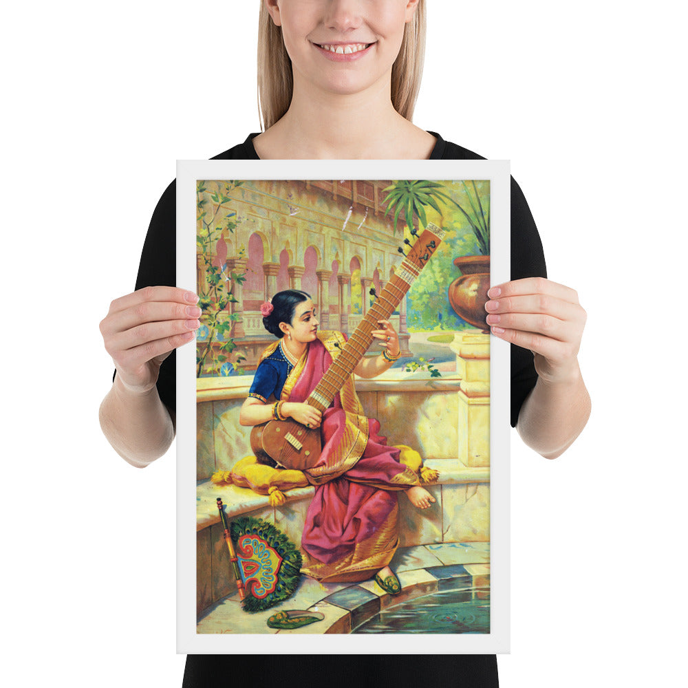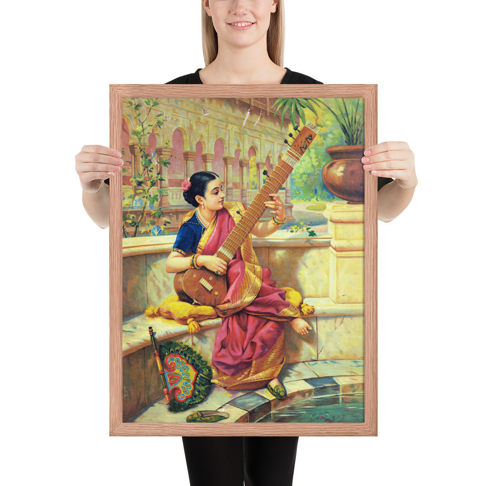 Immerse your space in timeless elegance with Kadambari by Raja Ravi Varma—a celebrated Indian masterpiece that captures the quiet grace of classical music and royal serenity. This framed wall print features a woman seated on marble steps, adorned in a richly detailed red and gold saree, playing a sitar with poised concentration. Her jewelry glimmers softly against the architectural backdrop of arched corridors, potted palms, and a tranquil water body that reflects the scene’s warmth and depth.