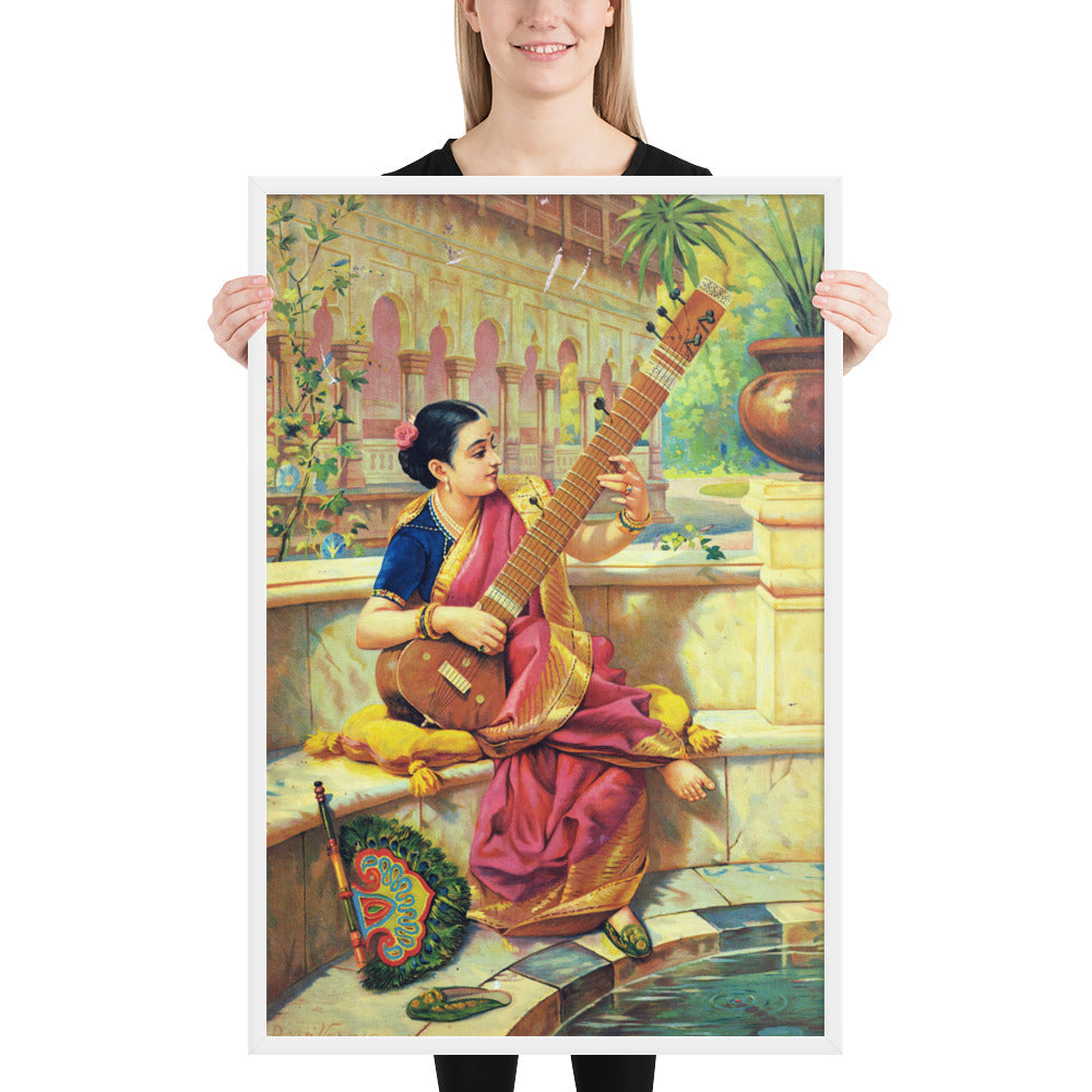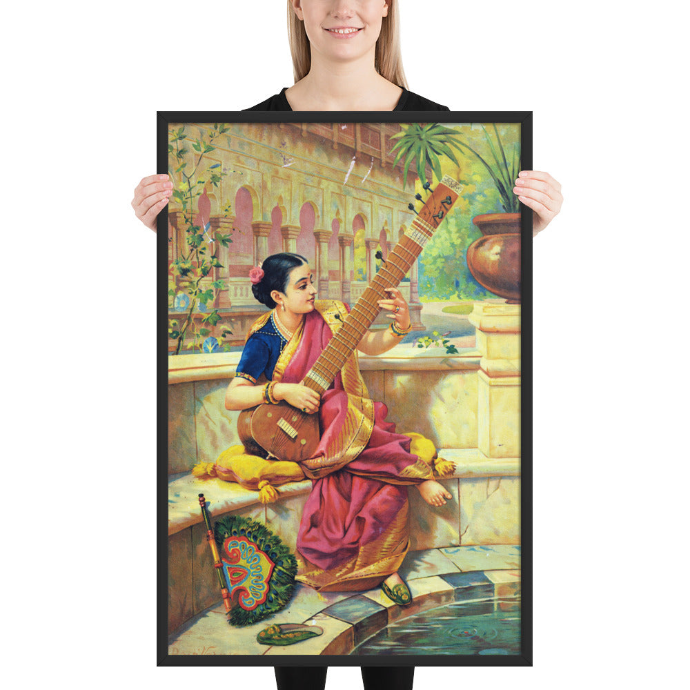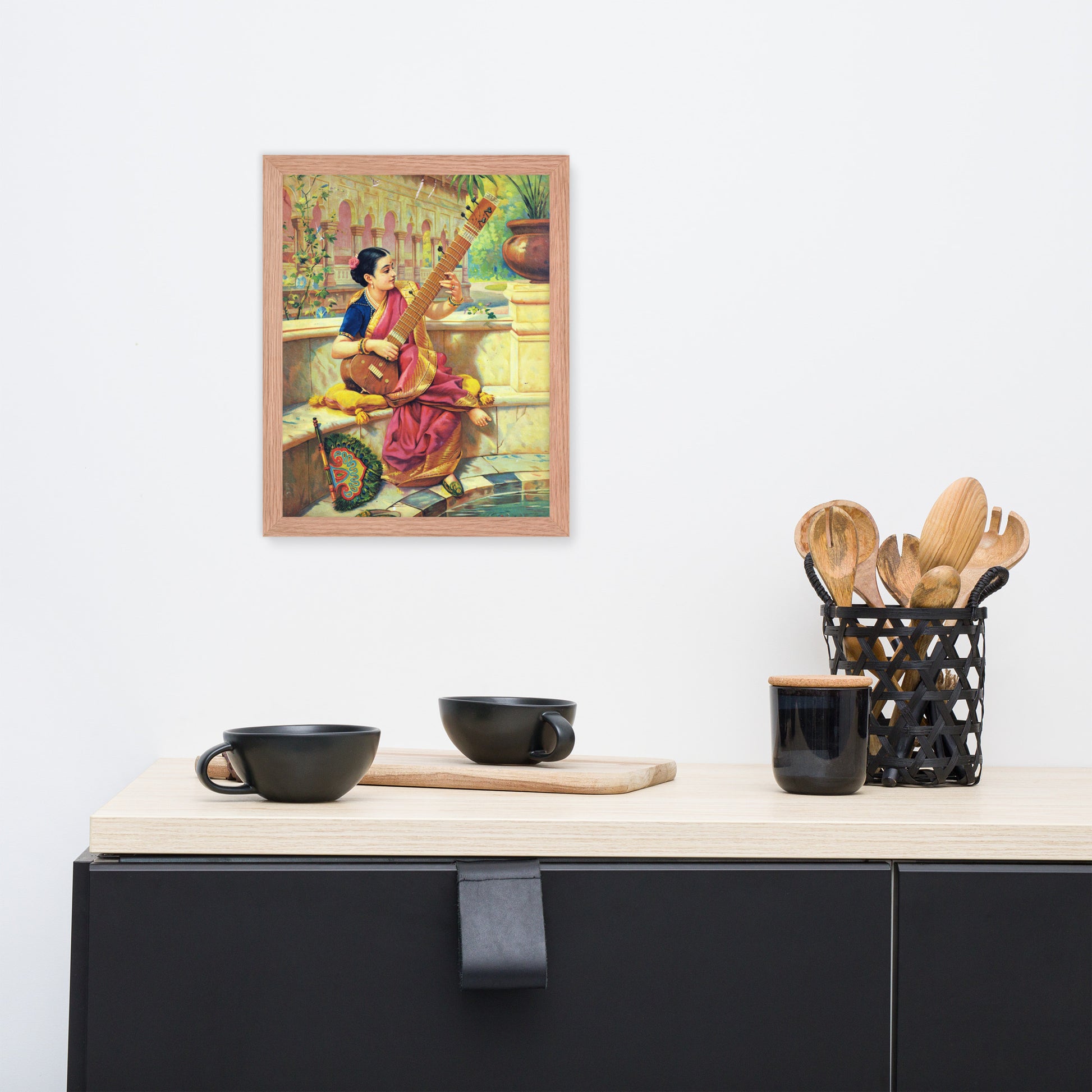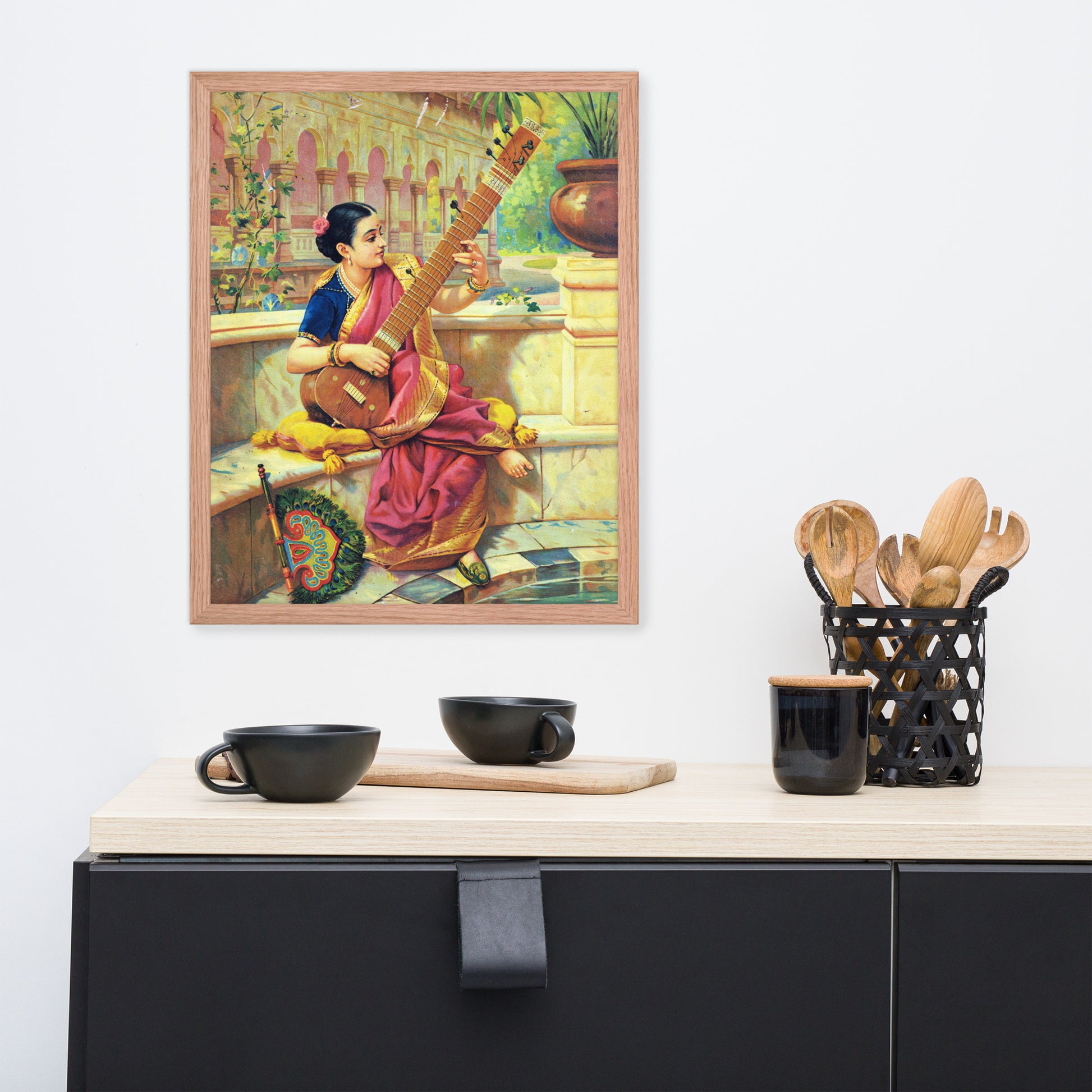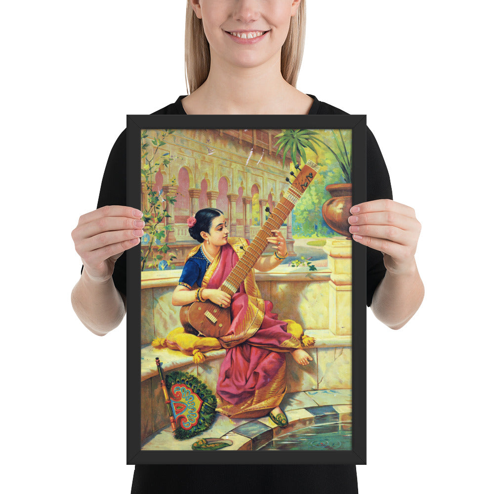 Immerse your space in timeless elegance with Kadambari by Raja Ravi Varma—a celebrated Indian masterpiece that captures the quiet grace of classical music and royal serenity. This framed wall print features a woman seated on marble steps, adorned in a richly detailed red and gold saree, playing a sitar with poised concentration. Her jewelry glimmers softly against the architectural backdrop of arched corridors, potted palms, and a tranquil water body that reflects the scene’s warmth and depth.